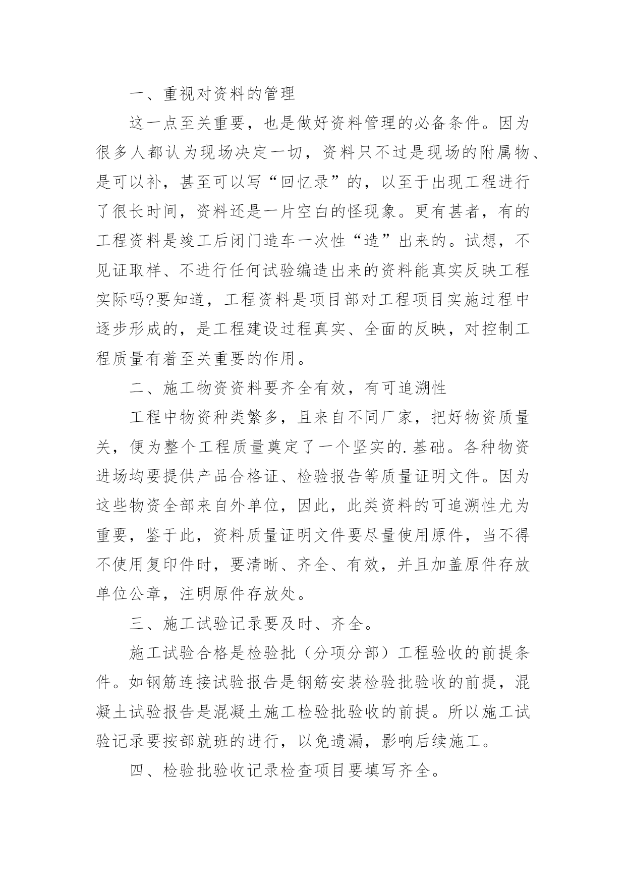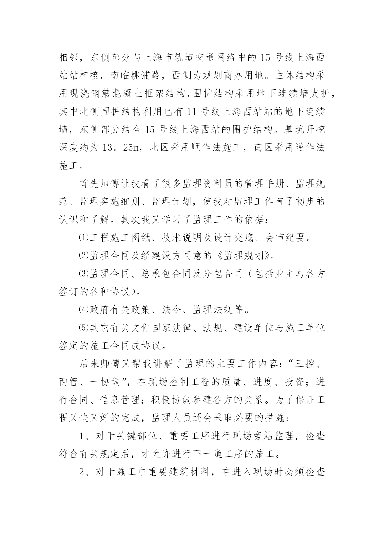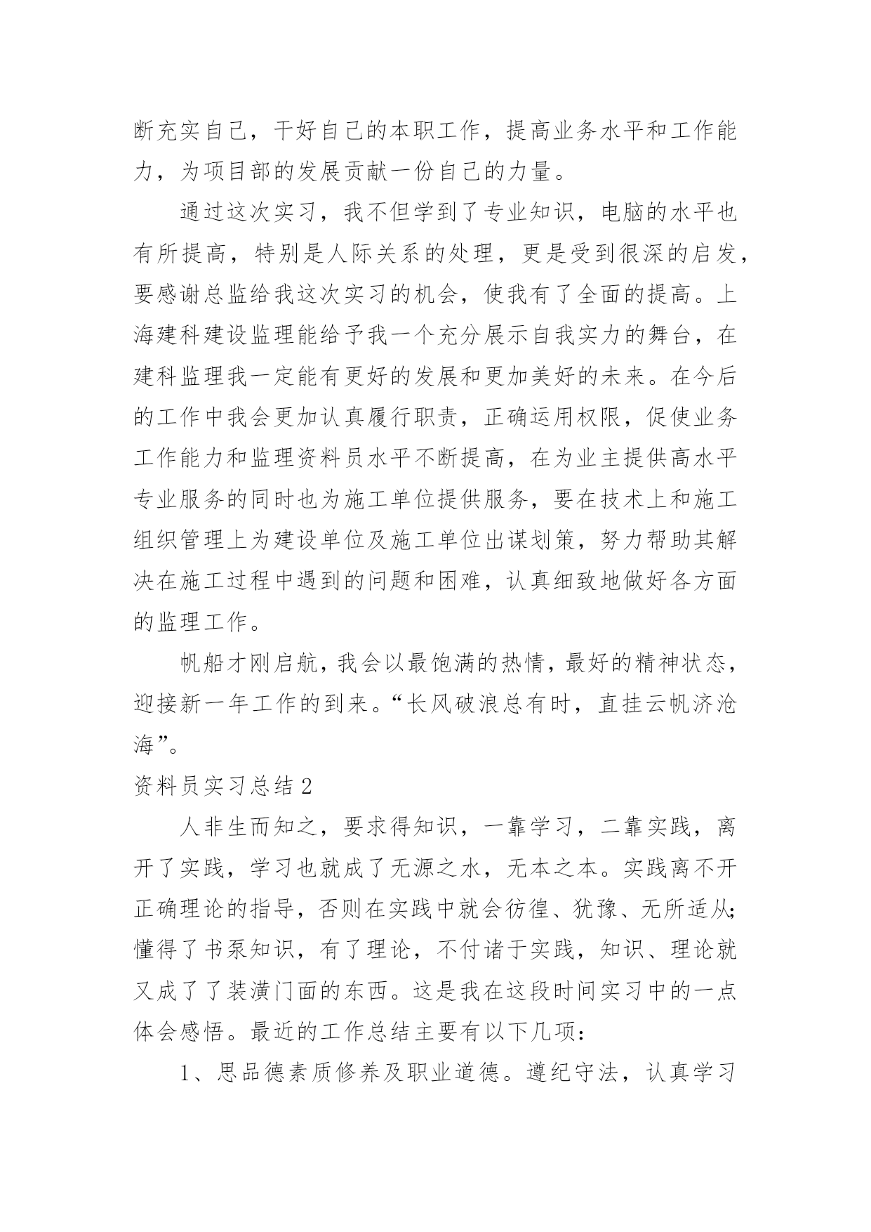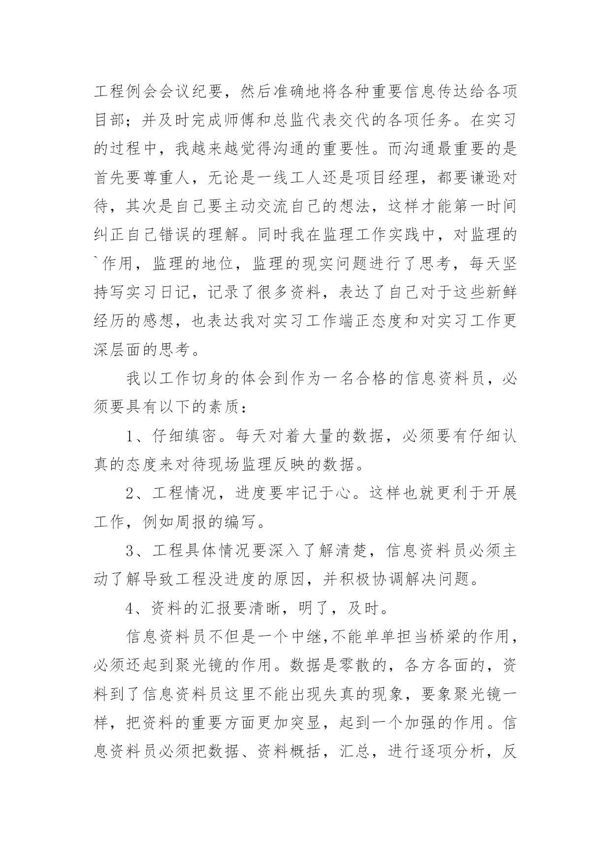 资料员实习总结资料员实习总结15篇(优秀)总结是指对某一阶段的工作、学习或思想中的经验或情况加以总结和概括的书面材料,它可以提升我们发现问题的能力,因此我们需要回头归纳,写一份总结了。那么你真的懂得怎么写总结吗?下面是小编帮大家整理的资料员实习总结,希望对大家有所帮助。资料员实习总结1人非生而知之,要求得知识,一靠学习,二靠实践,离开了实践,学习也就成了无源之水,无本之本。实践离不开正确理论的指导,否则在实践中就会彷徨、犹豫、无所适从;懂得了书本知识,有了理论,不付诸于实践,知识、理论就又成了装横门面的东西。这是我在两个半月实习中的一点体会感悟。现在将我在上海市建科建设监理咨询有限公司下的上海西站综合交通枢纽南广场及地下空间(一期)工程项目部实习做如下总结:在20xx年xx月xx日,我以实习生的身份来到该工程项目部。本工程主体建筑为一个局部含夹层的地下2层的结构,主要由交通换乘、公共配套服务和地下车库组成,基地面积约为13500,平面为一不规则四边形。本工程北侧与已经建成的上海市轨道交通11号线北段工程中的上海西站站相邻,东侧部分与上海市轨道交通网络中的15号线上海西站站相接,南临桃浦路,西侧为规划商办用地。主体结构采用现浇钢筋混凝土框架结构,围护结构采用地下连续墙支护,其中北侧围护结构利用已有11号线上海西站站的地下连续墙,东侧部分结合15号线上海西站的围护结构。基坑开挖深度约为13。25m,北区采用顺作法施工,南区采用逆作法施工。首先师傅让我看了很多监理资料员的管理手册、监理规范、监理实施细则、监理计划,使我对监理工作有了初步的认识和了解。其次我又学习了监理工作的依据:⑴工程施工图纸、技术说明及设计交底、会审纪要。⑵监理合同及经建设方同意的《监理规划》。⑶监理合同、总承包合同及分包合同(包括业主与各方签订的各种协议)。⑷政府有关政策、法令、监理法规等。⑸其它有关文件国家法律、法规、建设单位与施工单位签定的施工合同或协议。后来师傅又帮我讲解了监理的主要工作内容:“三控、两管、一协调”,在现场控制工程的质量、进度、投资;进行合同、信息管理;积极协调参建各方的关系。为了保证工程又快又好的完成,监理人员还会采取必要的措施:1、对于关键部位、重要工序进行现场旁站监理,检查符合有关规定后,才允许进行下一道工序的施工。2、对于施工中重要建筑材料,在进入现场时必须检查产品出厂合格证书,或者进行见证取样,送到有相关资质的检测单位进行检验。3、做好监理日志,详细记录每一天工程所发生的事情,以防工程出现质量问题,从而能够有依可查。在实习期间,师傅对于我的疑惑不解总是耐心讲解,并带领我进行监理资料员的实际操作。在这两个半月的实习中,我学到了很多课本之外的知识,明白了在课本上永远无法理解的东西,有了很大的进步。在大学里,我的专业是市政工程技术,所涉及的对于资料方面的知识较少。虽然我考取了资料员证书,但还没有运用到实践中,对于理论上的知识知道的也只有皮毛。刚接触资料员的时候,现场项目总监代表、师傅给予我大力的支持和帮助,教我学习了很多岗位知识。而我自己通过翻阅以前的资料、仔细阅读监理规范、阅读公司的质量、环境和职业健康安全方面的指导书、通过询问总监代表、专业监理工程师和师傅来学习监理的岗位知识,了解监理工作。在实习前我就具备一定的电脑应用功底,而现场文字资料的编辑对电脑编辑及文学功底又有更高的要求,我通过互联网查询、向总监代表、师傅请教,对自己的知识进行补充。例如最初写会议纪要时,即使会议上所说的话全部记录,但是对施工现场不了解,还是不能够写出一份合格到位的会议纪要,直到经过了一个多月的学习与锻炼,到现在已能独立编写大部分文字资料。我的主要工作就是及时接收业主、总包、分包及相关单位有关部门下发的各种文件、资料,并进行登记、存档,写工程例会会议纪要,然后准确地将各种重要信息传达给各项目部;并及时完成师傅和总监代表交代的各项任务。在实习的过程中,我越来越觉得沟通的重要性。而沟通最重要的是首先要尊重人,无论是一线工人还是项目经理,都要谦逊对待,其次是自己要主动交流自己的想法,这样才能第一时间纠正自己错误的理解。同时我在监理工作实践中,对监理的`作用,监理的地位,监理的现实问题进行了思考,每天坚持写实习日记,记录了很多资料,表达了自己对于这些新鲜经历的感想,也表达我对实习工作端正态度和对实习工作更深层面的思考。我以工作切身的体会到作为一名合格的信息资料员,必须要具有以下的素质:1、仔细缜密。每天对着大量的数据,必须要有仔细认真的态度来对待现场监理反映的数据。2、工程情况,进度要牢记于心。这样也就更利于开展工作,例如周报的编写。3、工程具体情况要深入了解清楚,信息资料员必须主动了解导致工程没进度的原因,并积极协调解决问题。4、资料的汇报要清晰,明了,及时。