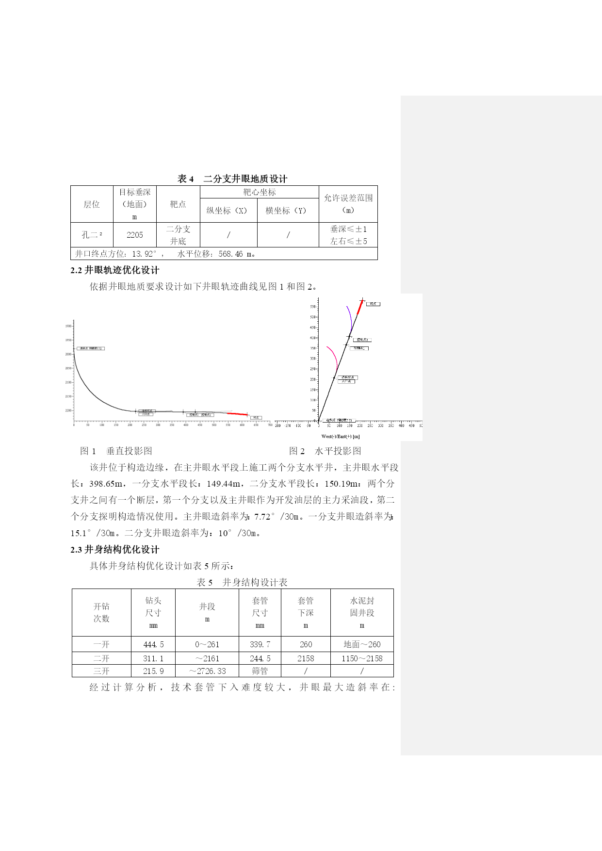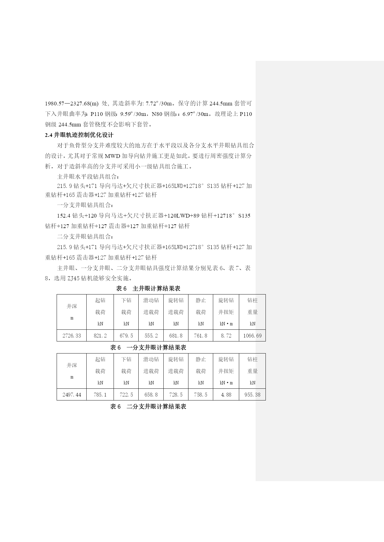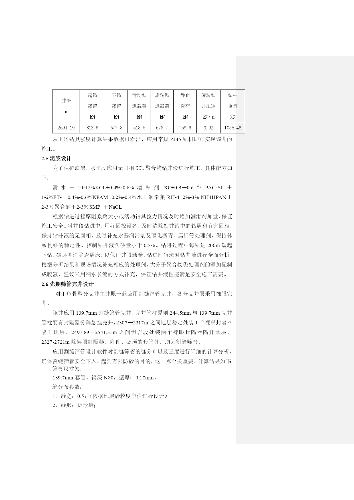 大港油田鱼骨型分支水平井设计技术研究(完整版)(文档可以直接使用,也可根据实际需要修改使用,可编辑欢迎下载)大港油田鱼骨型分支水平井设计技术研究徐学军张恒岳发辉于成水摘要:鱼骨型分支井是一种利用钻井技术提高油井单井采收率的好技术,在油田内开展该项技术的研究工作意义较大。大港油田在这方面还是一个空白,本文围绕大港油田成功设计实施的一口新钻鱼骨型分支井家H2井为例,从井眼轨迹优化、井身结构设计、钻具组合设计、泥浆的设计等关键设计要素出发,综合阐述了成功设计一口鱼骨型分支井的技术要点以及保证措施。主题词:鱼骨型分支井优化设计井身结构钻具组合泥浆从全球施工分支井总数比例来看,1-3级分支井总数占到总数的88%,国外目前正在大量应用鱼骨型分支井技术。从钻井技术来看,可以在任何油藏钻成多分支井,但从完井角度考虑,多分支井在较稳定的岩层中更为合适。其完井方式大多还是采用了裸眼完成或割缝衬管完成,下套管射孔完成的很少。在确定采用那一级别的完井系统时,要根据油气层的性质而定,决不是级别越高越好;相反,采油修井应简化要求,尽可能采用较低的级别,以减少施工的风险及完井费用。大港油田濒临渤海,具有丰富的陆上以及沿海开发油气藏资源,可开发的含油面积广阔,最近,滩海及浅海面积为500km2区域的勘探。落实总资源量为:13053×104t。其中关家堡构造有11个圈闭,面积29.9km2,落实资源量为:3984×104t,探明储量455×104t。经过油田公司对庄海4x1井、庄海8井的钻探和论证,在关家堡庄海4x1井断块预计布置120口井位,能够形成88.3×104t的年产能力。急需先进有效的工艺技术进行开发,大港油田是一个老油田,整装区块较少,开发应用鱼骨型分支井,可以有效地连接各个死油区域以及大块单一层状油藏,所以,研究鱼骨型分支水平井设计技术意义较大。1.设计应用鱼骨型分支井的难点国外普遍认为鱼骨型分支井适用条件以及关键技术有如下:鱼骨型分支井适用条件如下:1、油藏构造明确,距油水界面有一定距离;2、序号等不符合要求油层单层厚度不能过小。国外施工鱼骨型分支井关键技术有:1、应用顶驱钻机,能够实现倒划眼,保证井眼清洁;2、技术套管下在油层顶界4m;3、采用旋转导向技术,施工周期短,避免井眼坍塌。4、上部井眼为水基泥浆,钻水平段时应用油基泥浆,减少摩擦阻力。5、应用蠕动筛管或割缝筛管实现适当防砂。6、使用高强度钻杆。所以,针对鱼骨型分支井的关键技术,我们怎样应用现有技术成功完成一口鱼骨型分支井设计工作存在困难较多,主要有以下几方面问题需要解决:1、根据地质要求,如何设计出切实可行的剖面;2、在没有顶驱以及旋转导向钻具的情况下,如何设计钻具组合保证各个分支成功实施。3、钻具在油藏中,钻进时间较长,如何设计低摩阻以及保护油层的钻井液体系。4、为了保证安全施工各个分支井眼,从工艺角度考虑,技术套管下深的设计。5、分支井钻完后,为了保证长期生产,采用何种油层完井工艺措施,需要深入探讨。2.鱼骨型分支井设计技术措施下面以实施家H2鱼骨型分支井为例,介绍设计鱼骨型分支井具体措施。2.1该井设计基础数据1、地质构造分层家H2井地质构造分层如表1所示:表1家H2井地质构造分层地质分层井深m复杂情况提示平原组250防塌明化镇组1255防塌馆陶组1515防掉、卡沙河街组1875防卡孔一段2075防喷漏、防石膏侵孔二段2215.2防喷漏(目标油层顶深2327.68m,底深2726.33m)2、靶点设计要求主井眼地质设计见表2,一分支井眼地质设计见表3、二分支井眼地质设计见表4。表2主井眼地质设计层位目标垂深(地面)m靶点靶心坐标允许误差范围(m)纵坐标(X)横坐标(Y)孔二22203.2入口点4234320.0020502860.00垂深≤±1左右≤±5孔二22205.2控制点14234479.8120502918.54垂深≤±1左右≤±5孔二22205.2控制点24234520.6120502933.49垂深≤±1左右≤±5孔二22215.2终点4234694.0020502997.00垂深≤±1左右≤±5井口至入口点方位:20.12°,水平位移:220.03m;井口至控制点1方位:20.12°,水平位移:390.23m;井口至控制点2方位:20.12°,水平位移:433.68m;井口至终点方位:20.12°,水平位移:618.33m。表3一分支井眼地质设计层位目标垂深(地面)m靶点靶心坐标允许误差范围(m)纵坐标(X)横坐标(Y)孔二22208一分支井底//垂深≤±1左右≤±5井口至井底方位:6.51°,水平位移:360.40m。表4二分支井眼地质