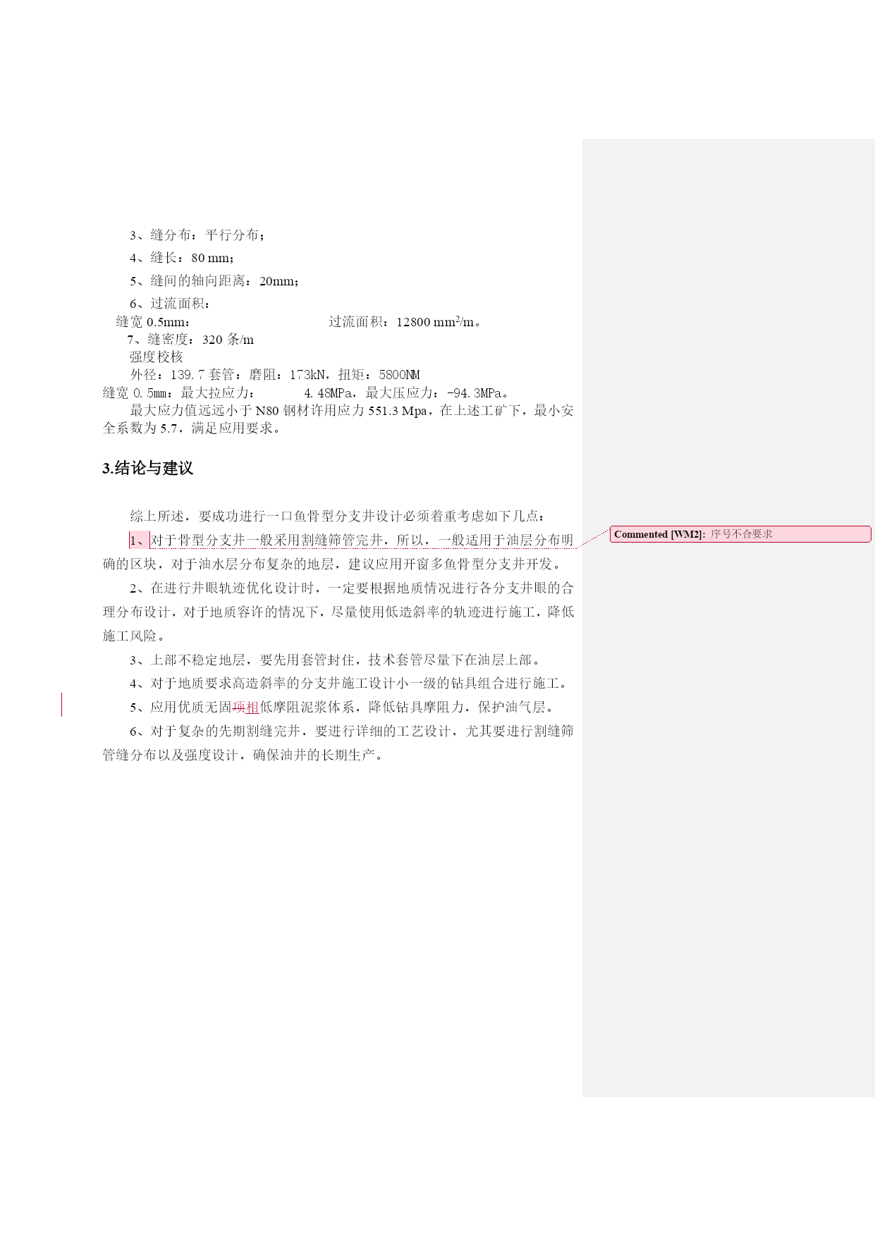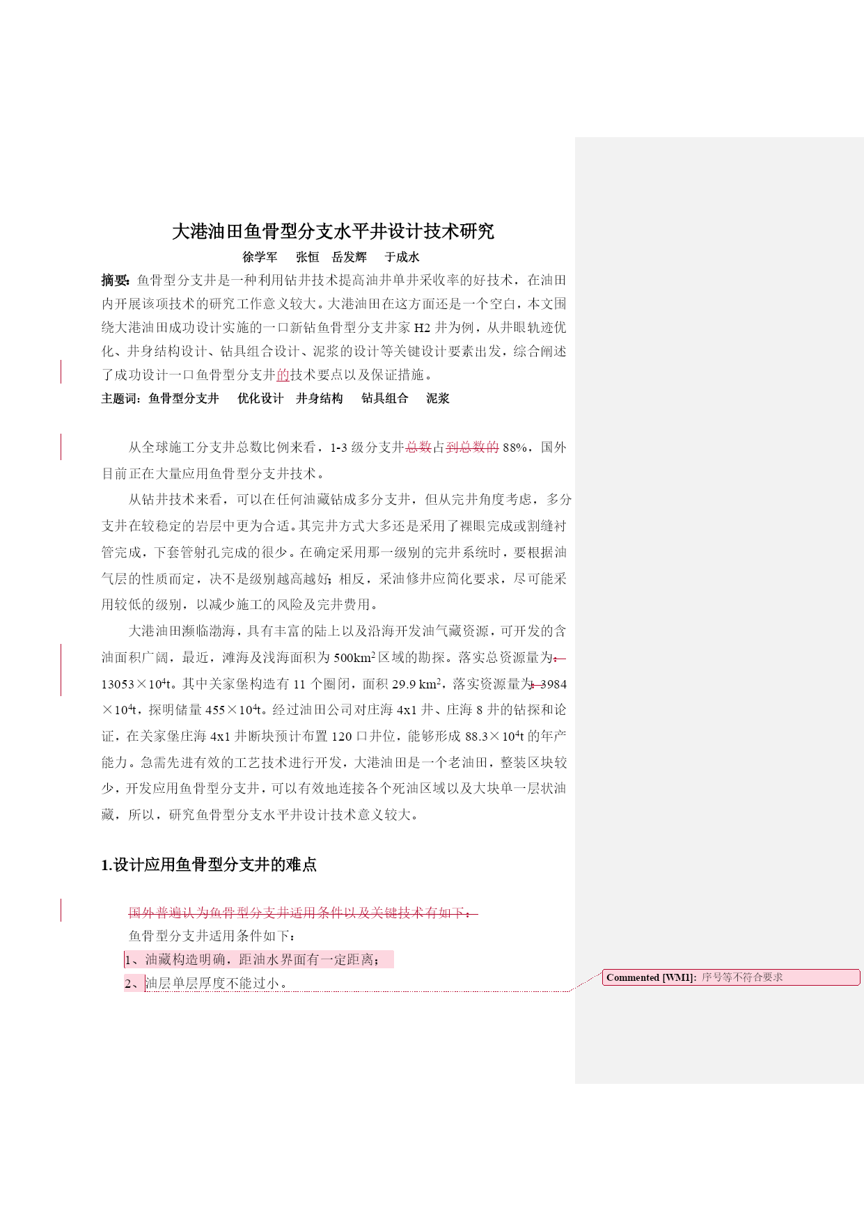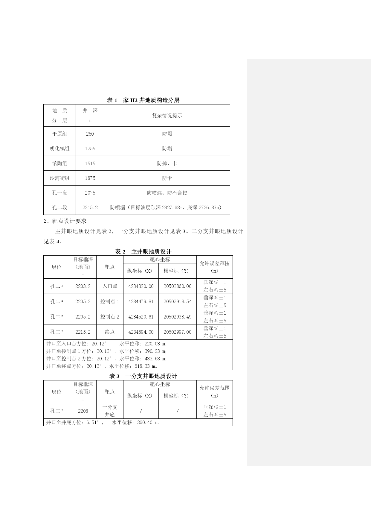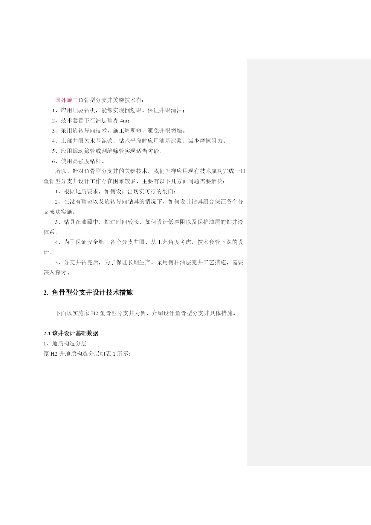 大港油田鱼骨型分支水平井设计技术研究(完整版)(文档可以直接使用,也可根据实际需要修改使用,可编辑欢迎下载)大港油田鱼骨型分支水平井设计技术研究徐学军张恒岳发辉于成水摘要:鱼骨型分支井是一种利用钻井技术提高油井单井采收率的好技术,在油田内开展该项技术的研究工作意义较大。大港油田在这方面还是一个空白,本文围绕大港油田成功设计实施的一口新钻鱼骨型分支井家H2井为例,从井眼轨迹优化、井身结构设计、钻具组合设计、泥浆的设计等关键设计要素出发,综合阐述了成功设计一口鱼骨型分支井的技术要点以及保证措施。主题词:鱼骨型分支井优化设计井身结构钻具组合泥浆从全球施工分支井总数比例来看,1-3级分支井总数占到总数的88%,国外目前正在大量应用鱼骨型分支井技术。从钻井技术来看,可以在任何油藏钻成多分支井,但从完井角度考虑,多分支井在较稳定的岩层中更为合适。其完井方式大多还是采用了裸眼完成或割缝衬管完成,下套管射孔完成的很少。在确定采用那一级别的完井系统时,要根据油气层的性质而定,决不是级别越高越好;相反,采油修井应简化要求,尽可能采用较低的级别,以减少施工的风险及完井费用。大港油田濒临渤海,具有丰富的陆上以及沿海开发油气藏资源,可开发的含油面积广阔,最近,滩海及浅海面积为500km2区域的勘探。落实总资源量为:13053×104t。其中关家堡构造有11个圈闭,面积29.9km2,落实资源量为:3984×104t,探明储量455×104t。经过油田公司对庄海4x1井、庄海8井的钻探和论证,在关家堡庄海4x1井断块预计布置120口井位,能够形成88.3×104t的年产能力。急需先进有效的工艺技术进行开发,大港油田是一个老油田,整装区块较少,开发应用鱼骨型分支井,可以有效地连接各个死油区域以及大块单一层状油藏,所以,研究鱼骨型分支水平井设计技术意义较大。1.设计应用鱼骨型分支井的难点国外普遍认为鱼骨型分支井适用条件以及关键技术有如下:鱼骨型分支井适用条件如下:1、油藏构造明确,距油水界面有一定距离;2、序号等不符合要求油层单层厚度不能过小。国外施工鱼骨型分支井关键技术有:1、应用顶驱钻机,能够实现倒划眼,保证井眼清洁;2、技术套管下在油层顶界4m;3、采用旋转导向技术,施工周期短,避免井眼坍塌。4、上部井眼为水基泥浆,钻水平段时应用油基泥浆,减少摩擦阻力。5、应用蠕动筛管或割缝筛管实现适当防砂。6、使用高强度钻杆。所以,针对鱼骨型分支井的关键技术,我们怎样应用现有技术成功完成一口鱼骨型分支井设计工作存在困难较多,主要有以下几方面问题需要解决:1、根据地质要求,如何设计出切实可行的剖面;2、在没有顶驱以及旋转导向钻具的情况下,如何设计钻具组合保证各个分支成功实施。3、钻具在油藏中,钻进时间较长,如何设计低摩阻以及保护油层的钻井液体系。4、为了保证安全施工各个分支井眼,从工艺角度考虑,技术套管下深的设计。5、分支井钻完后,为了保证长期生产,采用何种油层完井工艺措施,需要深入探讨。2.鱼骨型分支井设计技术措施下面以实施家H2鱼骨型分支井为例,介绍设计鱼骨型分支井具体措施。2.1该井设计基础数据1、地质构造分层家H2井地质构造分层如表1所示:表1家H2井地质构造分层地质分层井深m复杂情况提示平原组250防塌明化镇组1255防塌馆陶组1515防掉、卡沙河街组1875防卡孔一段2075防喷漏、防石膏侵孔二段2215.2防喷漏(目标油层顶深2327.68m,底深2726.33m)2、靶点设计要求主井眼地质设计见表2,一分支井眼地质设计见表3、二分支井眼地质设计见表4。表2主井眼地质设计层位目标垂深(地面)m靶点靶心坐标允许误差范围(m)纵坐标(X)横坐标(Y)孔二22203.2入口点4234320.0020502860.00垂深≤±1左右≤±5孔二22205.2控制点14234479.8120502918.54垂深≤±1左右≤±5孔二22205.2控制点24234520.6120502933.49垂深≤±1左右≤±5孔二22215.2终点4234694.0020502997.00垂深≤±1左右≤±5井口至入口点方位:20.12°,水平位移:220.03m;井口至控制点1方位:20.12°,水平位移:390.23m;井口至控制点2方位:20.12°,水平位移:433.68m;井口至终点方位:20.12°,水平位移:618.33m。表3一分支井眼地质设计层位目标垂深(地面)m靶点靶心坐标允许误差范围(m)纵坐标(X)横坐标(Y)孔二22208一分支井底//垂深≤±1左右≤±5井口至井底方位:6.51°,水平位移:360.40m。表4二分支井眼地质