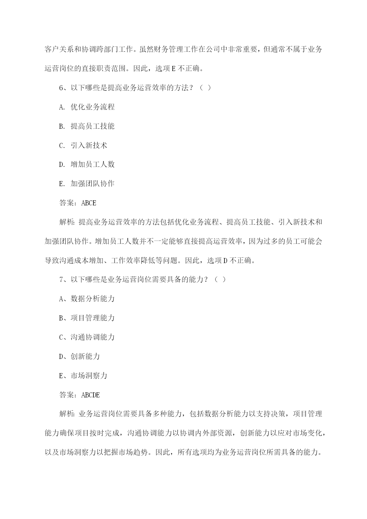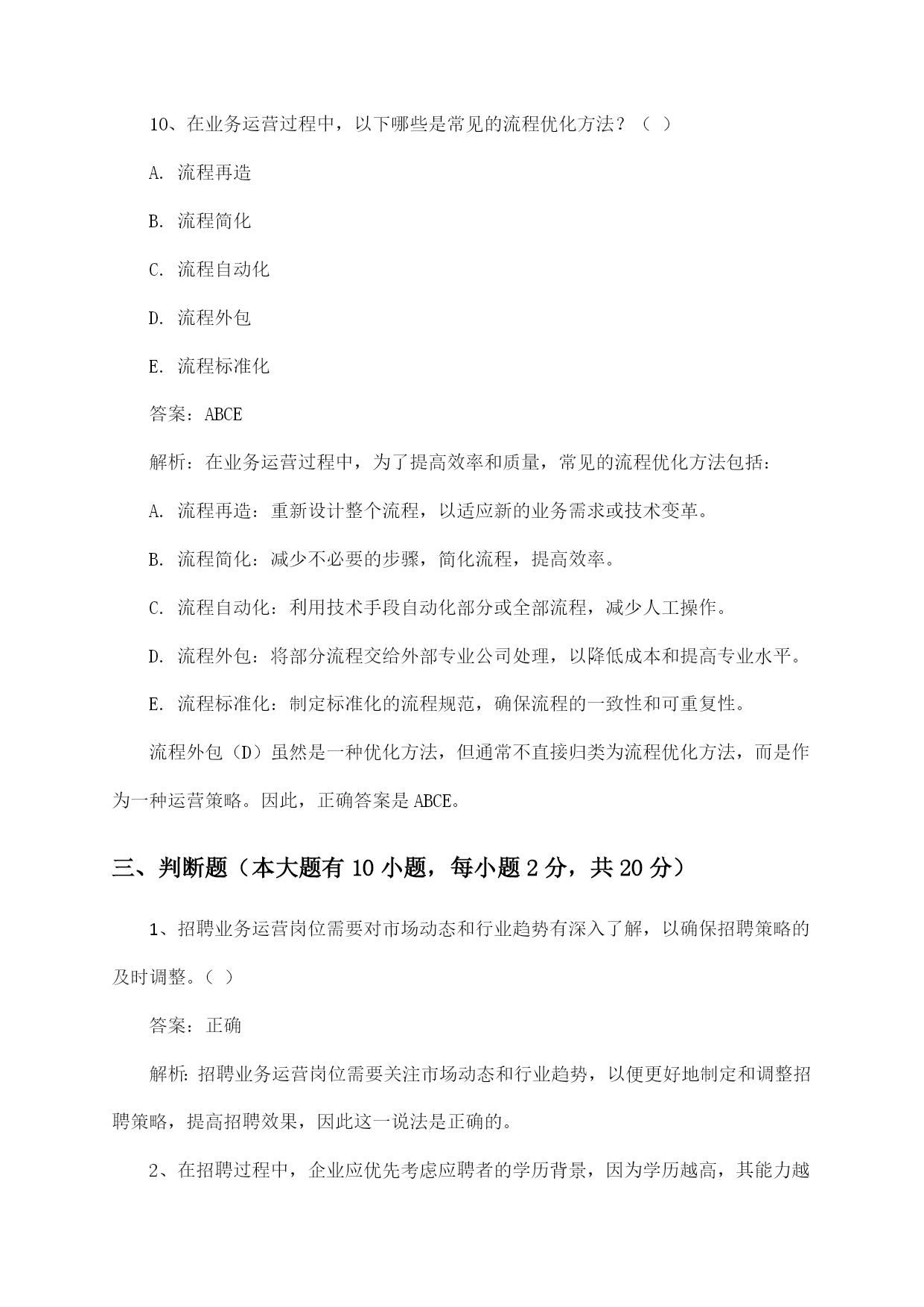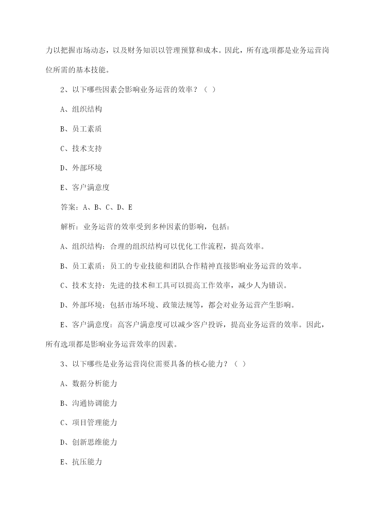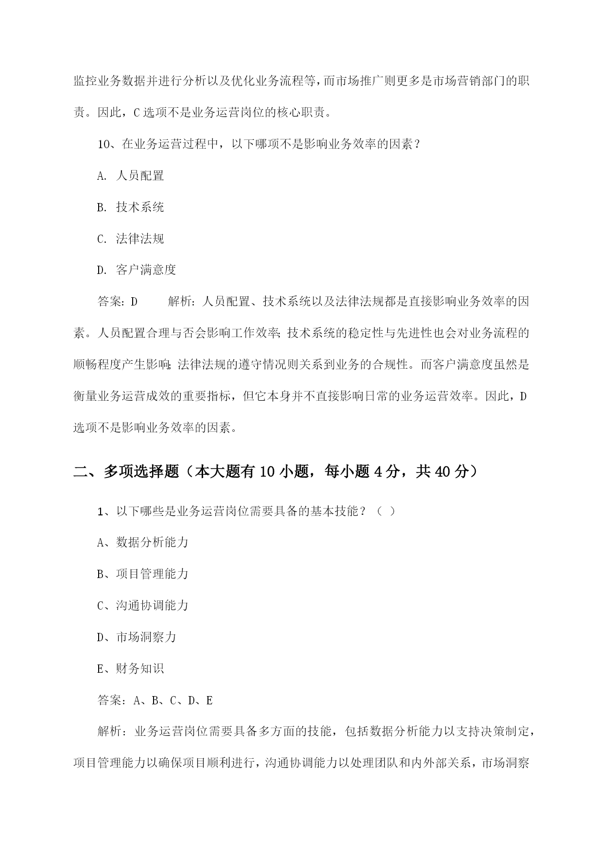 招聘业务运营岗位笔试题与参考答案(某世界500强集团)一、单项选择题(本大题有10小题,每小题2分,共20分)1、以下哪个选项不是业务运营岗位需要具备的基本技能?A、数据分析能力B、项目管理能力C、财务核算能力D、编程能力答案:D解析:编程能力通常不是业务运营岗位的基本技能要求。业务运营岗位更侧重于对业务流程的理解和管理,数据分析、项目管理和财务核算能力则是更关键的技能。编程能力通常属于技术或开发岗位的要求。2、业务运营岗位在工作中,以下哪种行为最有利于提升团队协作效率?A、独自完成所有工作,避免依赖他人B、充分授权给团队成员,自己只负责监督C、定期召开团队会议,及时沟通工作进展和问题D、对团队成员的工作结果不做任何反馈答案:C解析:定期召开团队会议,及时沟通工作进展和问题,有助于团队成员之间保持信息同步,增强团队凝聚力,提高协作效率。独自完成所有工作可能会导致信息不畅,授权过度可能导致监督不足,而不做反馈则可能导致团队成员无法了解自己的工作表现和改进方向。3、以下哪个选项不属于业务运营岗位的核心职能?A.数据分析B.客户关系管理C.财务预算D.市场调研答案:D解析:业务运营岗位的核心职能通常包括数据分析、客户关系管理和财务预算等。市场调研虽然对业务运营有辅助作用,但并不是业务运营岗位的核心职能。业务运营更侧重于内部管理和优化,而市场调研更多属于市场部门的职责。4、在业务运营过程中,以下哪种方法有助于提高工作效率?A.频繁召开会议B.预先制定详细的计划C.过度依赖加班D.缺乏明确的目标答案:B解析:预先制定详细的计划有助于业务运营岗位的工作人员明确工作目标、任务分配和时间安排,从而提高工作效率。频繁召开会议可能会浪费时间,过度依赖加班会影响员工的工作和生活平衡,缺乏明确的目标会导致工作缺乏方向。因此,选项B是最佳答案。5、以下哪项不是业务运营岗位所需具备的基本技能?A.数据分析能力B.项目管理能力C.财务知识D.美术设计能力答案:D解析:业务运营岗位主要涉及业务流程、数据分析、项目管理等方面,美术设计能力虽然有助于提升产品的视觉效果,但并非业务运营岗位的必备技能。因此,D选项为正确答案。6、以下关于业务运营岗位工作流程的说法,错误的是?A.制定业务策略B.监控业务指标C.开展市场调研D.负责公司内部事务答案:D解析:业务运营岗位的主要职责是围绕公司业务展开,包括制定业务策略、监控业务指标、开展市场调研等。负责公司内部事务属于行政管理工作,与业务运营岗位的职责不符。因此,D选项为正确答案。7、以下哪个选项不是业务运营岗位的关键职责?A、市场分析B、客户关系管理C、财务管理D、产品开发答案:D解析:业务运营岗位主要负责公司业务的日常运营和管理,包括市场分析、客户关系管理和财务管理等。产品开发通常是产品经理或研发团队的职责,虽然业务运营岗位可能需要与产品开发团队紧密合作,但产品开发本身不是业务运营岗位的直接职责。因此,选项D是正确的。8、在业务运营过程中,以下哪个工具或方法通常用于跟踪和分析业务数据?A、Excel表格B、客户关系管理系统(CRM)C、电子邮件D、社交媒体答案:B解析:在业务运营过程中,客户关系管理系统(CRM)是常用的工具之一,它可以帮助企业跟踪和管理客户信息、销售数据、市场活动等,从而分析业务表现和趋势。虽然Excel表格也是常用的数据分析工具,但CRM系统更专注于客户关系和销售数据的整合与分析。电子邮件和社交媒体虽然也有数据记录和分析的作用,但不是专门用于业务运营数据跟踪和分析的工具。因此,选项B是正确的。9、以下哪项不是业务运营岗位的核心职责?A.制定和执行业务策略B.监控业务数据并进行分析C.负责公司产品的市场推广D.维护客户关系答案:C解析:维护客户关系虽然也是业务运营的一部分,但它更偏向于客户服务或客户关系管理的职责。业务运营岗位的核心职责通常包括制定和执行业务策略、监控业务数据并进行分析以及优化业务流程等,而市场推广则更多是市场营销部门的职责。因此,C选项不是业务运营岗位的核心职责。10、在业务运营过程中,以下哪项不是影响业务效率的因素?A.人员配置B.技术系统C.法律法规D.客户满意度答案:D解析:人员配置、技术系统以及法律法规都是直接影响业务效率的因素。人员配置合理与否会影响工作效率;技术系统的稳定性与先进性也会对业务流程的顺畅程度产生影响;法律法规的遵守情况则关系到业务的合规性。而客户满意度虽然是衡量业务运营成效的重要指标,但它本身并不直接影响日常的业务运营效率。因此,D选项不是影响业务效率的因素。二、多项选择题(本大题有10小题,每小题4分,共40分)1