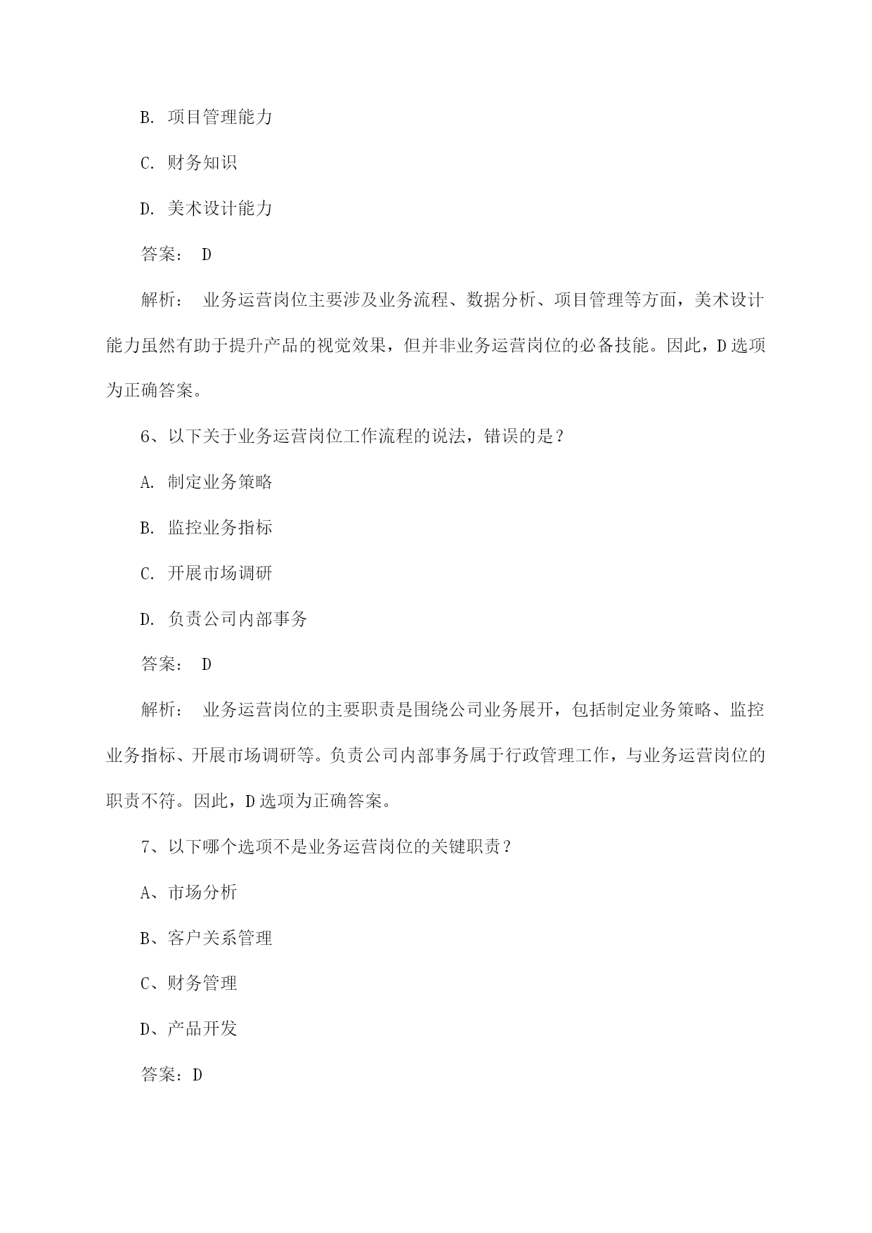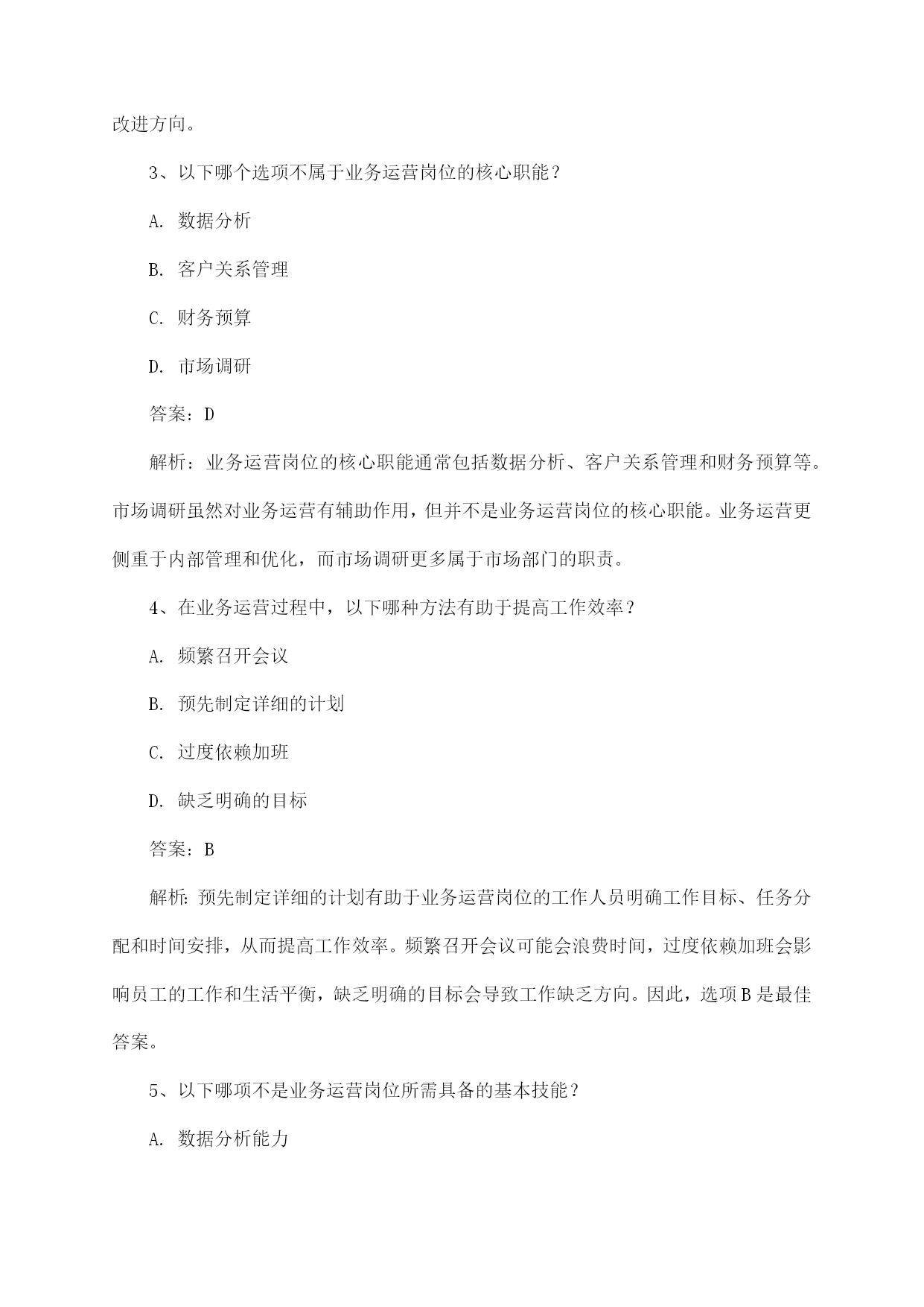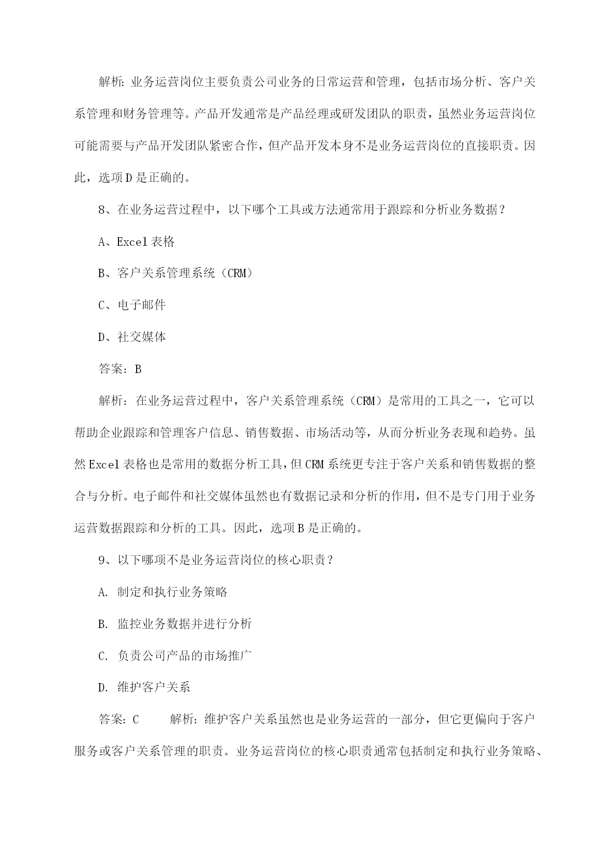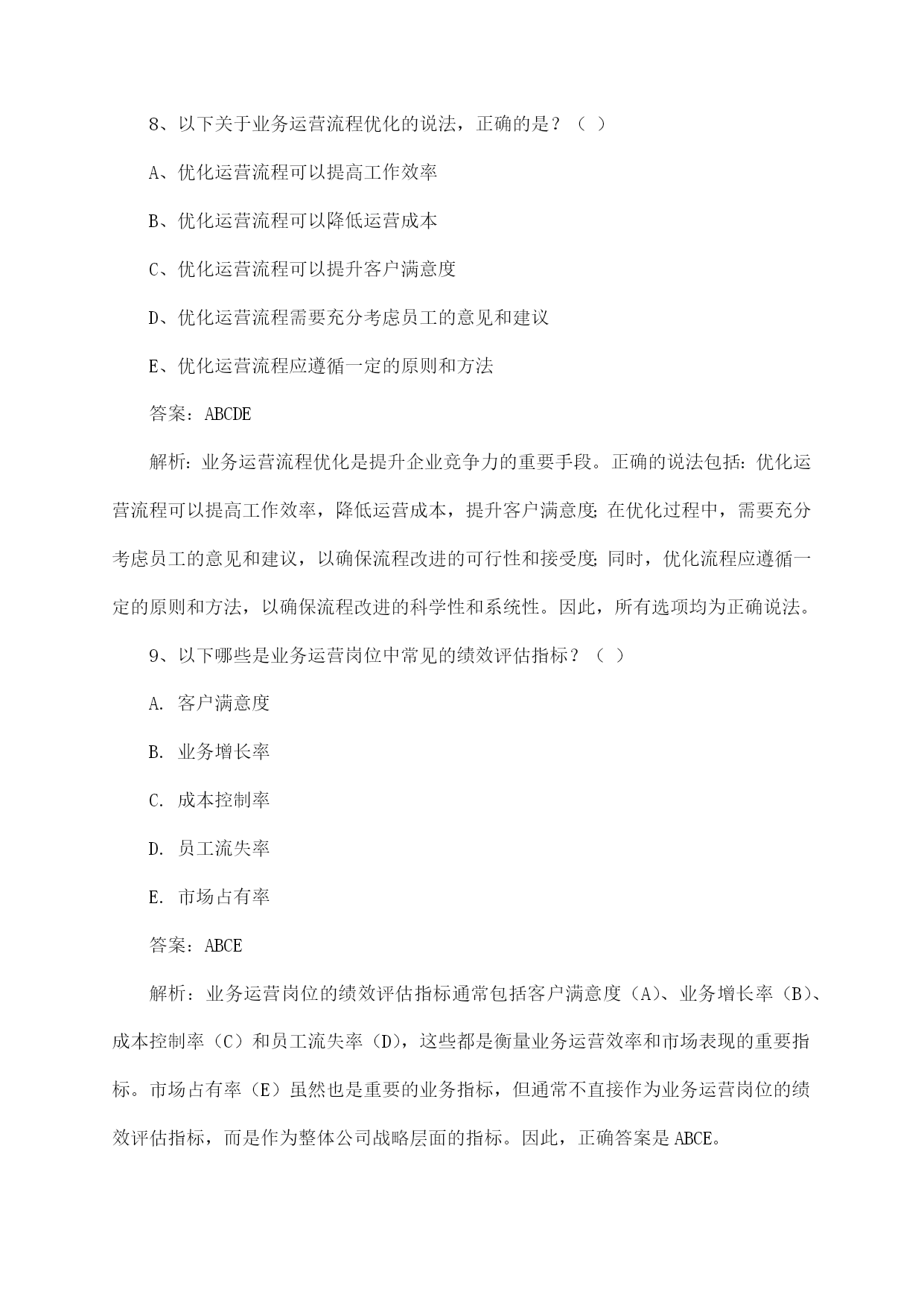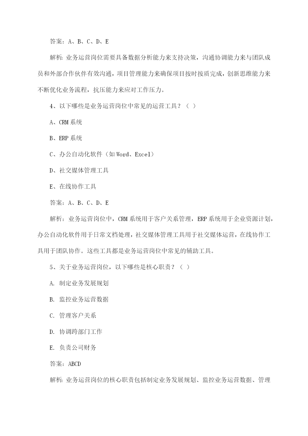 招聘业务运营岗位笔试题与参考答案(某世界500强集团)一、单项选择题(本大题有10小题,每小题2分,共20分)1、以下哪个选项不是业务运营岗位需要具备的基本技能?A、数据分析能力B、项目管理能力C、财务核算能力D、编程能力答案:D解析:编程能力通常不是业务运营岗位的基本技能要求。业务运营岗位更侧重于对业务流程的理解和管理,数据分析、项目管理和财务核算能力则是更关键的技能。编程能力通常属于技术或开发岗位的要求。2、业务运营岗位在工作中,以下哪种行为最有利于提升团队协作效率?A、独自完成所有工作,避免依赖他人B、充分授权给团队成员,自己只负责监督C、定期召开团队会议,及时沟通工作进展和问题D、对团队成员的工作结果不做任何反馈答案:C解析:定期召开团队会议,及时沟通工作进展和问题,有助于团队成员之间保持信息同步,增强团队凝聚力,提高协作效率。独自完成所有工作可能会导致信息不畅,授权过度可能导致监督不足,而不做反馈则可能导致团队成员无法了解自己的工作表现和改进方向。3、以下哪个选项不属于业务运营岗位的核心职能?A.数据分析B.客户关系管理C.财务预算D.市场调研答案:D解析:业务运营岗位的核心职能通常包括数据分析、客户关系管理和财务预算等。市场调研虽然对业务运营有辅助作用,但并不是业务运营岗位的核心职能。业务运营更侧重于内部管理和优化,而市场调研更多属于市场部门的职责。4、在业务运营过程中,以下哪种方法有助于提高工作效率?A.频繁召开会议B.预先制定详细的计划C.过度依赖加班D.缺乏明确的目标答案:B解析:预先制定详细的计划有助于业务运营岗位的工作人员明确工作目标、任务分配和时间安排,从而提高工作效率。频繁召开会议可能会浪费时间,过度依赖加班会影响员工的工作和生活平衡,缺乏明确的目标会导致工作缺乏方向。因此,选项B是最佳答案。5、以下哪项不是业务运营岗位所需具备的基本技能?A.数据分析能力B.项目管理能力C.财务知识D.美术设计能力答案:D解析:业务运营岗位主要涉及业务流程、数据分析、项目管理等方面,美术设计能力虽然有助于提升产品的视觉效果,但并非业务运营岗位的必备技能。因此,D选项为正确答案。6、以下关于业务运营岗位工作流程的说法,错误的是?A.制定业务策略B.监控业务指标C.开展市场调研D.负责公司内部事务答案:D解析:业务运营岗位的主要职责是围绕公司业务展开,包括制定业务策略、监控业务指标、开展市场调研等。负责公司内部事务属于行政管理工作,与业务运营岗位的职责不符。因此,D选项为正确答案。7、以下哪个选项不是业务运营岗位的关键职责?A、市场分析B、客户关系管理C、财务管理D、产品开发答案:D解析:业务运营岗位主要负责公司业务的日常运营和管理,包括市场分析、客户关系管理和财务管理等。产品开发通常是产品经理或研发团队的职责,虽然业务运营岗位可能需要与产品开发团队紧密合作,但产品开发本身不是业务运营岗位的直接职责。因此,选项D是正确的。8、在业务运营过程中,以下哪个工具或方法通常用于跟踪和分析业务数据?A、Excel表格B、客户关系管理系统(CRM)C、电子邮件D、社交媒体答案:B解析:在业务运营过程中,客户关系管理系统(CRM)是常用的工具之一,它可以帮助企业跟踪和管理客户信息、销售数据、市场活动等,从而分析业务表现和趋势。虽然Excel表格也是常用的数据分析工具,但CRM系统更专注于客户关系和销售数据的整合与分析。电子邮件和社交媒体虽然也有数据记录和分析的作用,但不是专门用于业务运营数据跟踪和分析的工具。因此,选项B是正确的。9、以下哪项不是业务运营岗位的核心职责?A.制定和执行业务策略B.监控业务数据并进行分析C.负责公司产品的市场推广D.维护客户关系答案:C解析:维护客户关系虽然也是业务运营的一部分,但它更偏向于客户服务或客户关系管理的职责。业务运营岗位的核心职责通常包括制定和执行业务策略、监控业务数据并进行分析以及优化业务流程等,而市场推广则更多是市场营销部门的职责。因此,C选项不是业务运营岗位的核心职责。10、在业务运营过程中,以下哪项不是影响业务效率的因素?A.人员配置B.技术系统C.法律法规D.客户满意度答案:D解析:人员配置、技术系统以及法律法规都是直接影响业务效率的因素。人员配置合理与否会影响工作效率;技术系统的稳定性与先进性也会对业务流程的顺畅程度产生影响;法律法规的遵守情况则关系到业务的合规性。而客户满意度虽然是衡量业务运营成效的重要指标,但它本身并不直接影响日常的业务运营效率。因此,D选项不是影响业务效率的因素。二、多项选择题(本大题有10小题,每小题4分,共40分)1