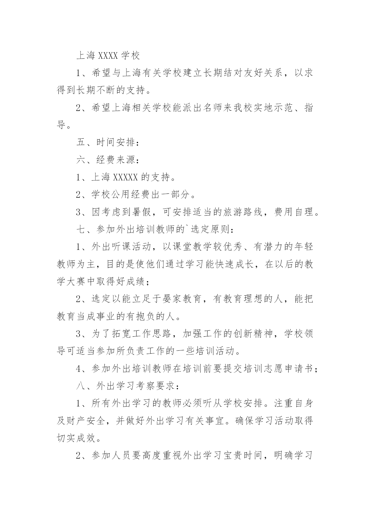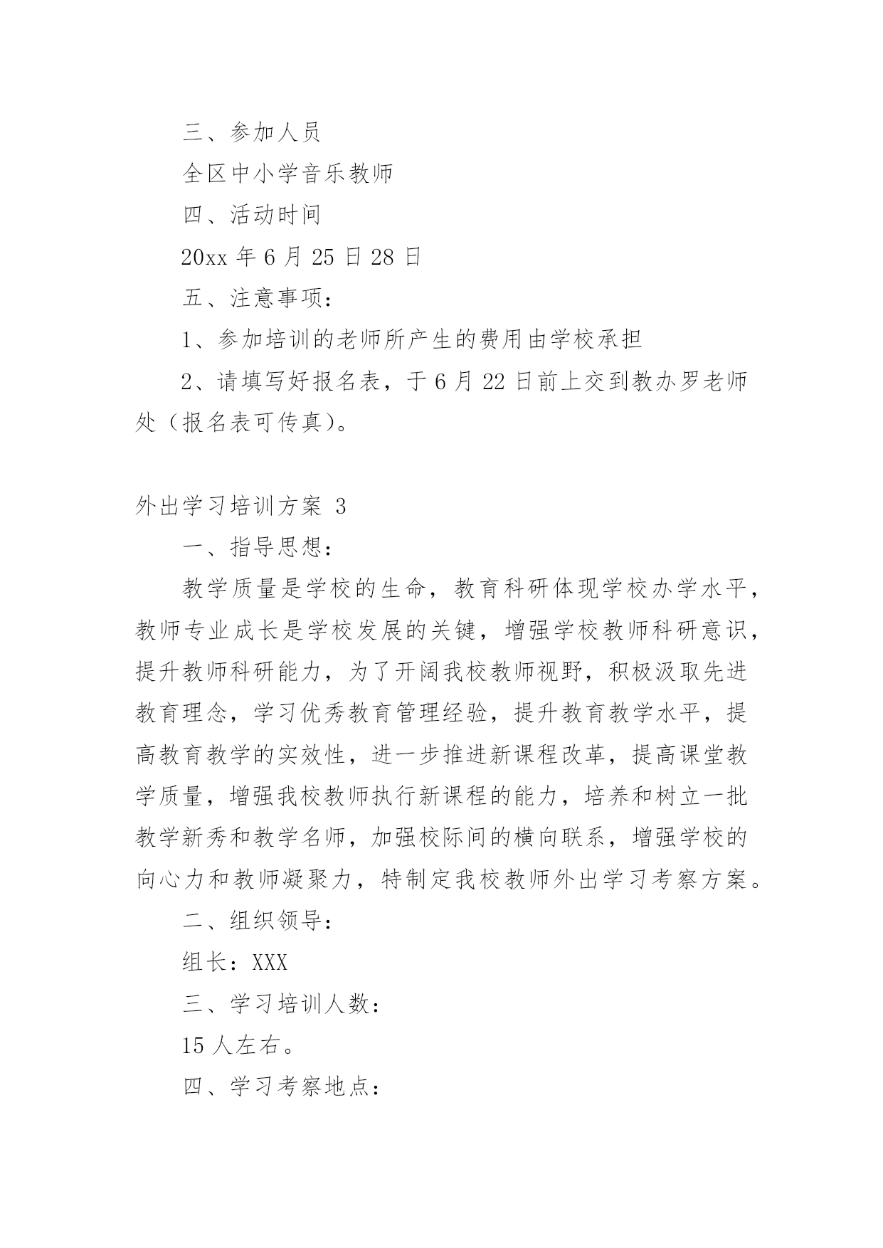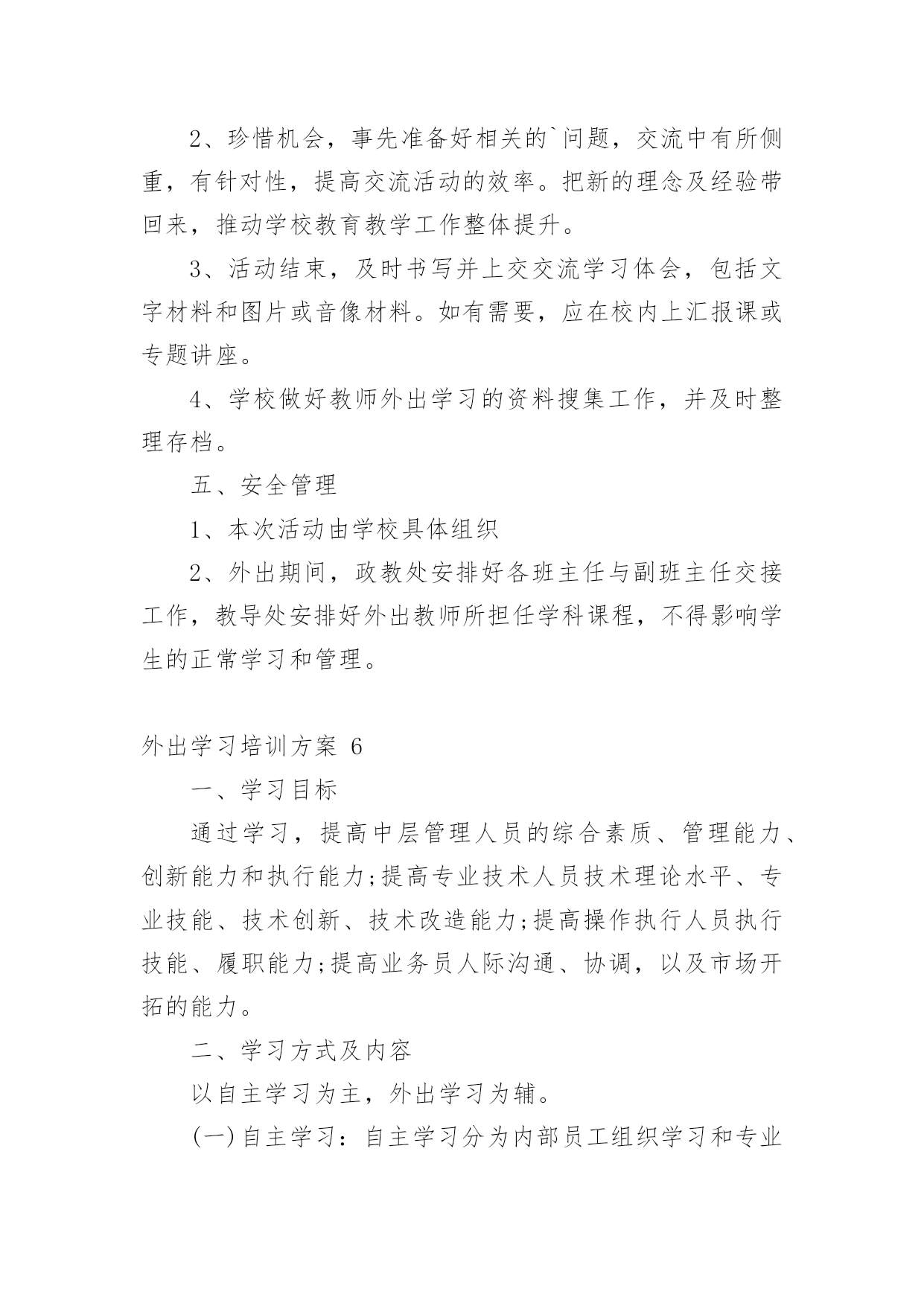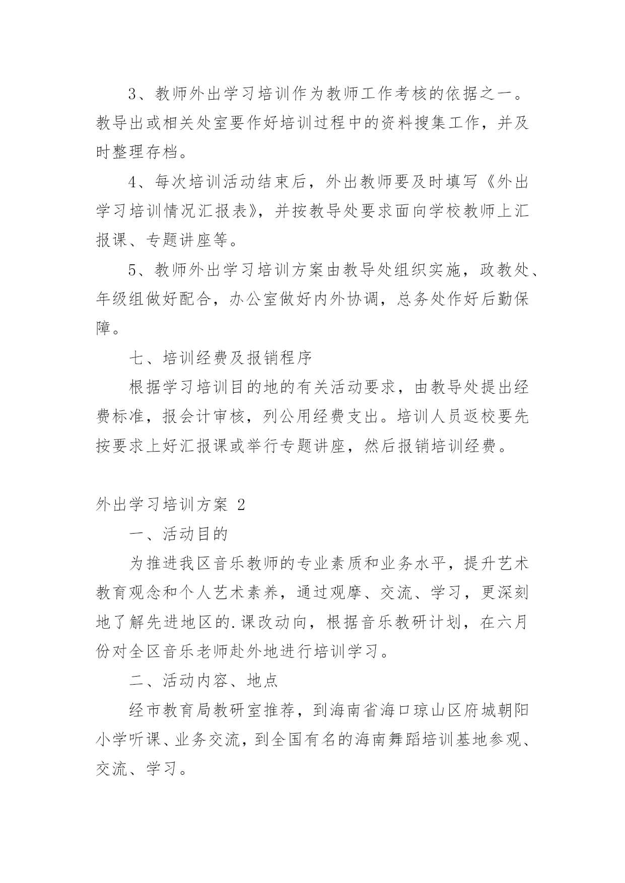 外出学习培训方案外出学习培训方案(通用10篇)为了确保事情或工作有序有效开展,我们需要提前开始方案制定工作,方案一般包括指导思想、主要目标、工作重点、实施步骤、政策措施、具体要求等项目。那么优秀的方案是什么样的呢?以下是小编收集整理的外出学习培训方案,欢迎阅读与收藏。外出学习培训方案1为了开阔员工视野,进一步推进酒店发展,提高酒店质量,增强人员的管理和服务能力,培养和树立一批教学新秀和教学名师,制定本校教师外出学习培训方案。一、指导思想以邓小平理论和“三个代表”重要思想为指导,深入学习和实践科学发展观,以培养学习型、科研型教师为目的,以提高教师队伍的专业素质和业务能力为重点,通过有计划地选派教师外出学习培训,让广大教师学习借鉴,开阔视野,陶冶情操。二、领导小组组长:副组长:成员:三、培训内容1、各级各类名校在课程改革、课堂教学、班级管理、校本教研等方面的成熟经验和做法。2、各级各类教育行政部门、教育机构组织的学术交流、校际交流、业务培训、课题研究等。四、培训模式1、外出对象:名师、各级各类骨干教师、学科带头人、各级竞讲优胜者、学校优秀教师、优秀班主任、师德标兵、教学常规标兵、课题研究组成员以及突出贡献者优先外出。2、培训模式:每学期派出12批次,10人次左右,人选由教导处组织上报学校行政会审核同意。五、培训要求1、参加人员要高度重视外出学习培训活动,明确学习培训目的。通过学习培训,把新的教育教学理念、新课程改革及课程教学经验带回来,推动学校教育教学工作整体提升。2、带着问题交流学习。参与学习培训的教师要带着问题与培训学校的名师相互交流,积极参加各项教研活动,力争通过学习培训,解决本人在教育教学中遇到的'某一方面或某一个问题。3、严守工作纪律。外出学习培训期间,各教师要严格遵守组织单位的作息时间,规章制度,树立良好的教师形象。六、培训管理1、严格管理。在教师选派,行程安排方面要详细部署,统筹规划,确保学习培训活动取得切实成效。2、外出学习培训期间,教导处、年级组要安排好外出学习教师所带课程,不得影响学生的日常学习。3、教师外出学习培训作为教师工作考核的依据之一。教导出或相关处室要作好培训过程中的资料搜集工作,并及时整理存档。4、每次培训活动结束后,外出教师要及时填写《外出学习培训情况汇报表》,并按教导处要求面向学校教师上汇报课、专题讲座等。5、教师外出学习培训方案由教导处组织实施,政教处、年级组做好配合,办公室做好内外协调,总务处作好后勤保障。七、培训经费及报销程序根据学习培训目的地的有关活动要求,由教导处提出经费标准,报会计审核,列公用经费支出。培训人员返校要先按要求上好汇报课或举行专题讲座,然后报销培训经费。外出学习培训方案2一、活动目的为推进我区音乐教师的专业素质和业务水平,提升艺术教育观念和个人艺术素养,通过观摩、交流、学习,更深刻地了解先进地区的.课改动向,根据音乐教研计划,在六月份对全区音乐老师赴外地进行培训学习。二、活动内容、地点经市教育局教研室推荐,到海南省海口琼山区府城朝阳小学听课、业务交流,到全国有名的海南舞蹈培训基地参观、交流、学习。三、参加人员全区中小学音乐教师四、活动时间20xx年6月25日28日五、注意事项:1、参加培训的老师所产生的费用由学校承担2、请填写好报名表,于6月22日前上交到教办罗老师处(报名表可传真)。外出学习培训方案3一、指导思想:教学质量是学校的生命,教育科研体现学校办学水平,教师专业成长是学校发展的关键,增强学校教师科研意识,提升教师科研能力,为了开阔我校教师视野,积极汲取先进教育理念,学习优秀教育管理经验,提升教育教学水平,提高教育教学的实效性,进一步推进新课程改革,提高课堂教学质量,增强我校教师执行新课程的能力,培养和树立一批教学新秀和教学名师,加强校际间的横向联系,增强学校的向心力和教师凝聚力,特制定我校教师外出学习考察方案。二、组织领导:组长:XXX三、学习培训人数:15人左右。四、学习考察地点:上海XXXX学校1、希望与上海有关学校建立长期结对友好关系,以求得到长期不断的支持。2、希望上海相关学校能派出名师来我校实地示范、指导。五、时间安排:六、经费来源:1、上海XXXXX的支持。2、学校公用经费出一部分。3、因考虑到暑假,可安排适当的旅游路线,费用自理。七、参加外出培训教师的`选定原则:1、外出听课活动,以课堂教学较优秀、有潜力的年轻教师为主,目的是使他们通过学习能快速成长,在以后的教学大赛中取得好成绩;2、选定以能立足于晏家教育,有教育理想的人,能把教育当成事业的有抱负的人。3、为了拓宽工作思路,加强工作的创新精神,学校领导可适当参加所负责工作的一些培训活动。4、参加外出培训教师在培训前要提交培训志愿申请书;八、外出学习考察要求:1、所有外出学习的教师必须听从学校