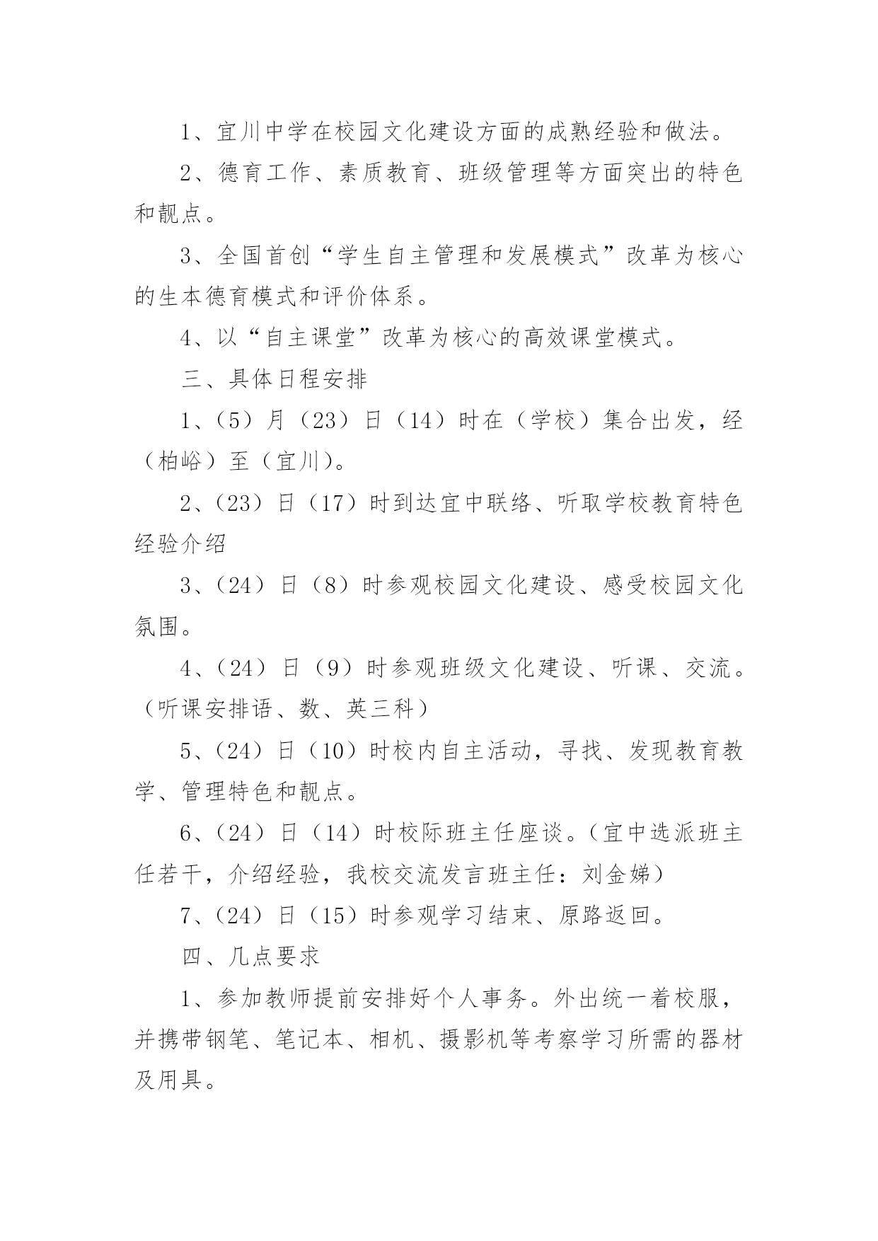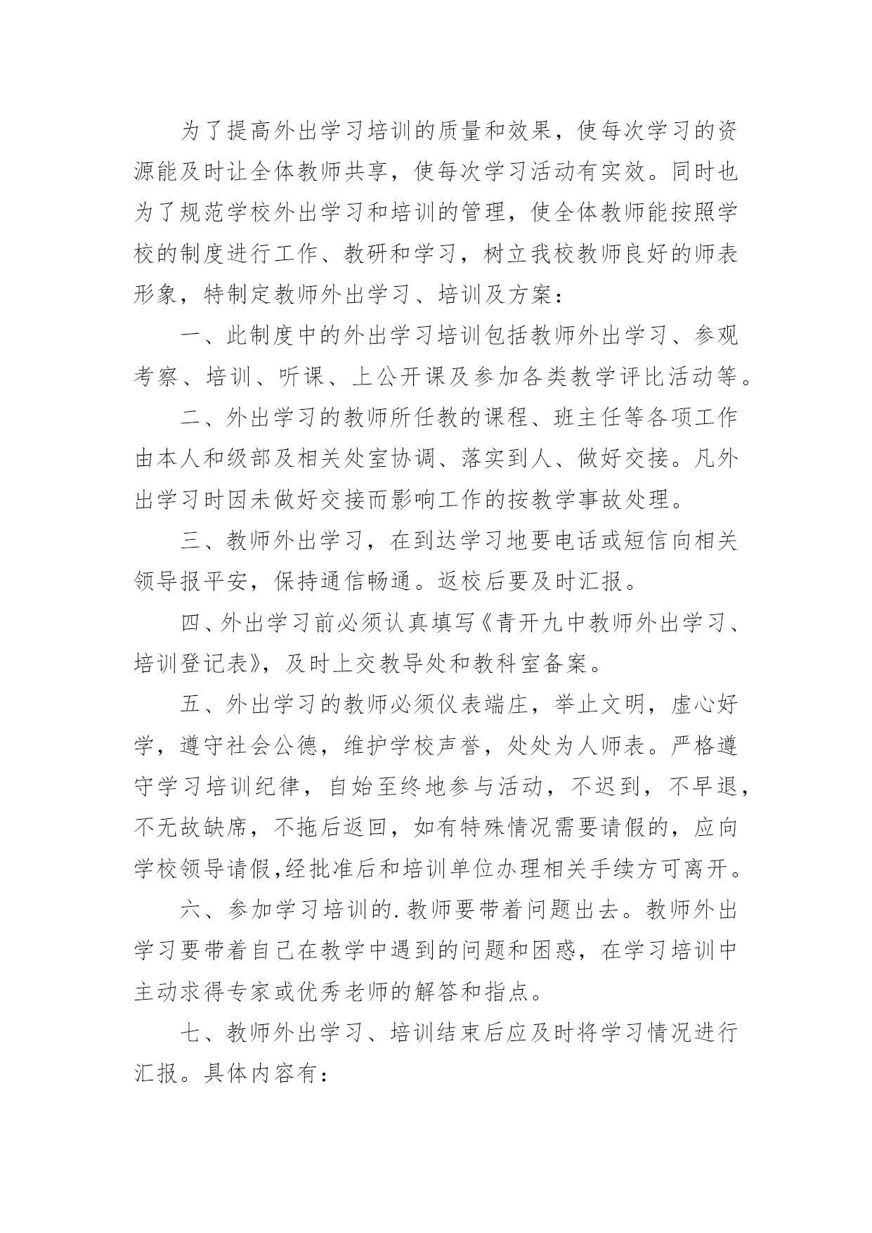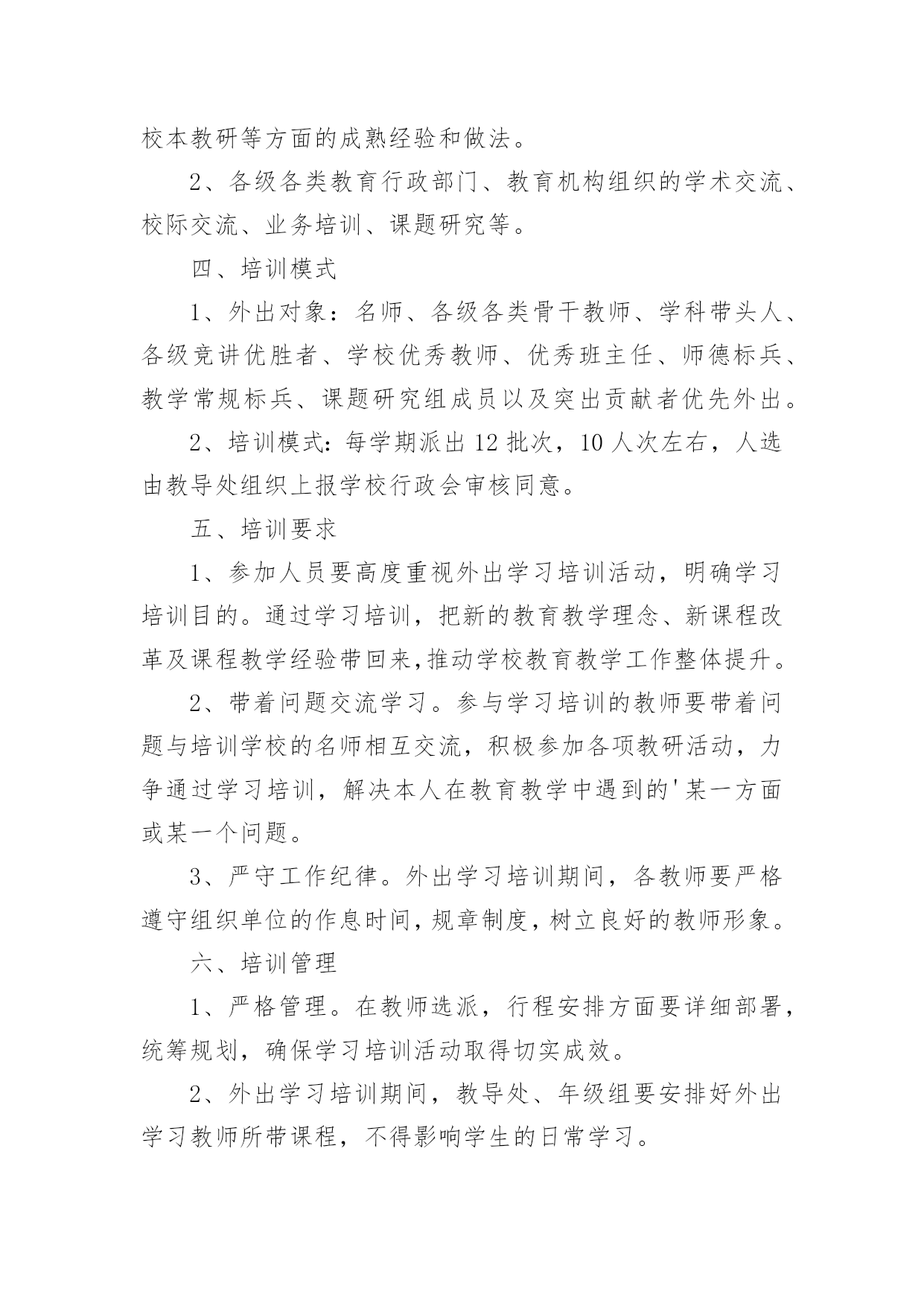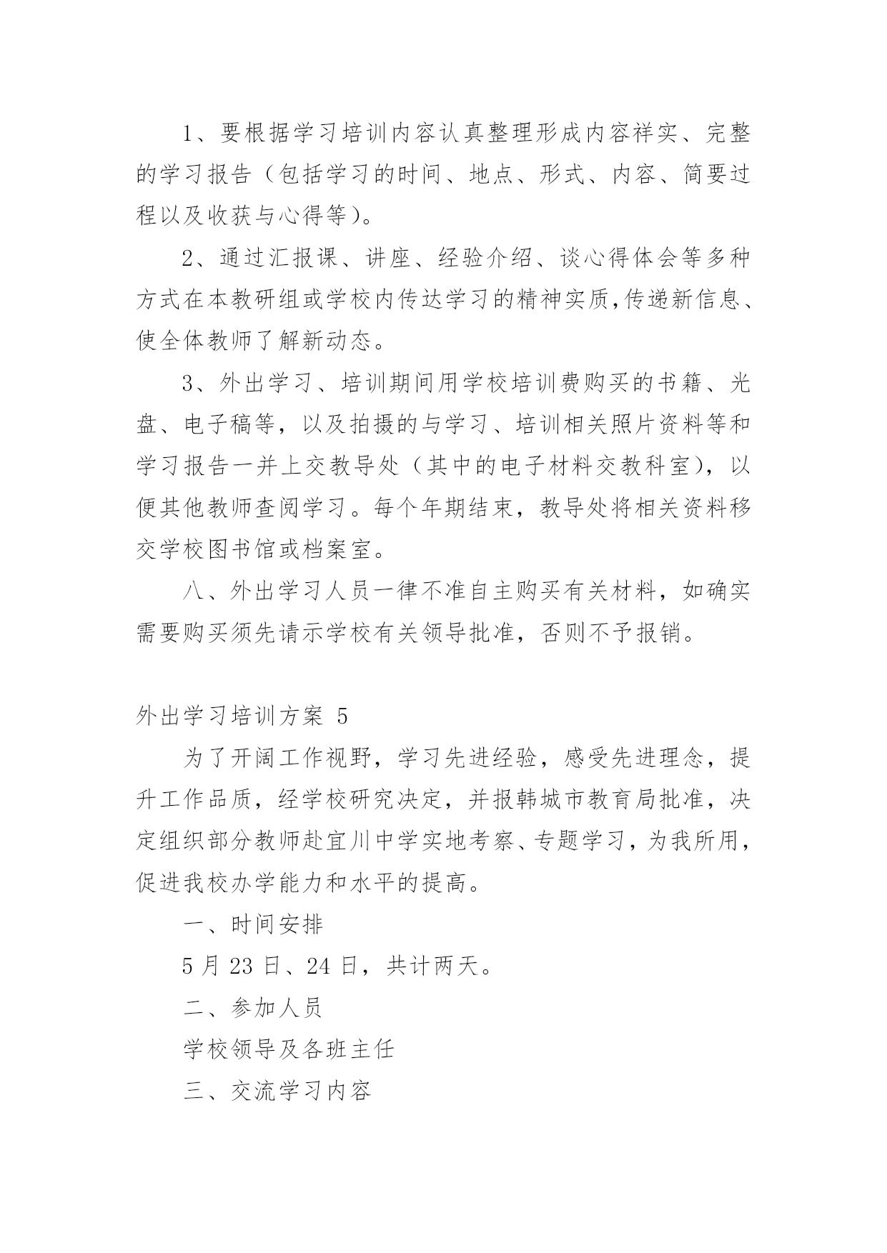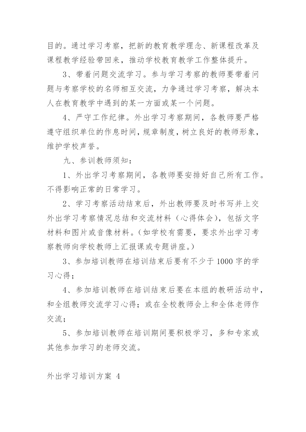 外出学习培训方案外出学习培训方案(通用10篇)为了确保事情或工作有序有效开展,我们需要提前开始方案制定工作,方案一般包括指导思想、主要目标、工作重点、实施步骤、政策措施、具体要求等项目。那么优秀的方案是什么样的呢?以下是小编收集整理的外出学习培训方案,欢迎阅读与收藏。外出学习培训方案1为了开阔员工视野,进一步推进酒店发展,提高酒店质量,增强人员的管理和服务能力,培养和树立一批教学新秀和教学名师,制定本校教师外出学习培训方案。一、指导思想以邓小平理论和“三个代表”重要思想为指导,深入学习和实践科学发展观,以培养学习型、科研型教师为目的,以提高教师队伍的专业素质和业务能力为重点,通过有计划地选派教师外出学习培训,让广大教师学习借鉴,开阔视野,陶冶情操。二、领导小组组长:副组长:成员:三、培训内容1、各级各类名校在课程改革、课堂教学、班级管理、校本教研等方面的成熟经验和做法。2、各级各类教育行政部门、教育机构组织的学术交流、校际交流、业务培训、课题研究等。四、培训模式1、外出对象:名师、各级各类骨干教师、学科带头人、各级竞讲优胜者、学校优秀教师、优秀班主任、师德标兵、教学常规标兵、课题研究组成员以及突出贡献者优先外出。2、培训模式:每学期派出12批次,10人次左右,人选由教导处组织上报学校行政会审核同意。五、培训要求1、参加人员要高度重视外出学习培训活动,明确学习培训目的。通过学习培训,把新的教育教学理念、新课程改革及课程教学经验带回来,推动学校教育教学工作整体提升。2、带着问题交流学习。参与学习培训的教师要带着问题与培训学校的名师相互交流,积极参加各项教研活动,力争通过学习培训,解决本人在教育教学中遇到的'某一方面或某一个问题。3、严守工作纪律。外出学习培训期间,各教师要严格遵守组织单位的作息时间,规章制度,树立良好的教师形象。六、培训管理1、严格管理。在教师选派,行程安排方面要详细部署,统筹规划,确保学习培训活动取得切实成效。2、外出学习培训期间,教导处、年级组要安排好外出学习教师所带课程,不得影响学生的日常学习。3、教师外出学习培训作为教师工作考核的依据之一。教导出或相关处室要作好培训过程中的资料搜集工作,并及时整理存档。4、每次培训活动结束后,外出教师要及时填写《外出学习培训情况汇报表》,并按教导处要求面向学校教师上汇报课、专题讲座等。5、教师外出学习培训方案由教导处组织实施,政教处、年级组做好配合,办公室做好内外协调,总务处作好后勤保障。七、培训经费及报销程序根据学习培训目的地的有关活动要求,由教导处提出经费标准,报会计审核,列公用经费支出。培训人员返校要先按要求上好汇报课或举行专题讲座,然后报销培训经费。外出学习培训方案2一、活动目的为推进我区音乐教师的专业素质和业务水平,提升艺术教育观念和个人艺术素养,通过观摩、交流、学习,更深刻地了解先进地区的.课改动向,根据音乐教研计划,在六月份对全区音乐老师赴外地进行培训学习。二、活动内容、地点经市教育局教研室推荐,到海南省海口琼山区府城朝阳小学听课、业务交流,到全国有名的海南舞蹈培训基地参观、交流、学习。三、参加人员全区中小学音乐教师四、活动时间20xx年6月25日28日五、注意事项:1、参加培训的老师所产生的费用由学校承担2、请填写好报名表,于6月22日前上交到教办罗老师处(报名表可传真)。外出学习培训方案3一、指导思想:教学质量是学校的生命,教育科研体现学校办学水平,教师专业成长是学校发展的关键,增强学校教师科研意识,提升教师科研能力,为了开阔我校教师视野,积极汲取先进教育理念,学习优秀教育管理经验,提升教育教学水平,提高教育教学的实效性,进一步推进新课程改革,提高课堂教学质量,增强我校教师执行新课程的能力,培养和树立一批教学新秀和教学名师,加强校际间的横向联系,增强学校的向心力和教师凝聚力,特制定我校教师外出学习考察方案。二、组织领导:组长:XXX三、学习培训人数:15人左右。四、学习考察地点:上海XXXX学校1、希望与上海有关学校建立长期结对友好关系,以求得到长期不断的支持。2、希望上海相关学校能派出名师来我校实地示范、指导。五、时间安排:六、经费来源:1、上海XXXXX的支持。2、学校公用经费出一部分。3、因考虑到暑假,可安排适当的旅游路线,费用自理。七、参加外出培训教师的`选定原则:1、外出听课活动,以课堂教学较优秀、有潜力的年轻教师为主,目的是使他们通过学习能快速成长,在以后的教学大赛中取得好成绩;2、选定以能立足于晏家教育,有教育理想的人,能把教育当成事业的有抱负的人。3、为了拓宽工作思路,加强工作的创新精神,学校领导可适当参加所负责工作的一些培训活动。4、参加外出培训教师在培训前要提交培训志愿申请书;八、外出学习考察要求:1、所有外出学习的教师必须听从学校