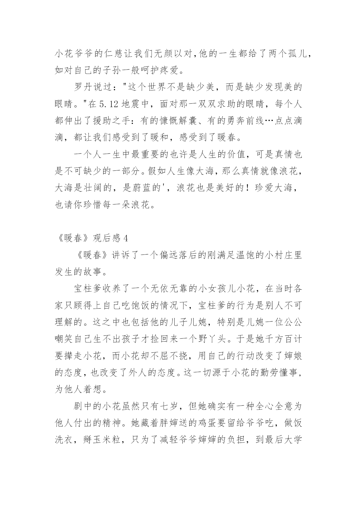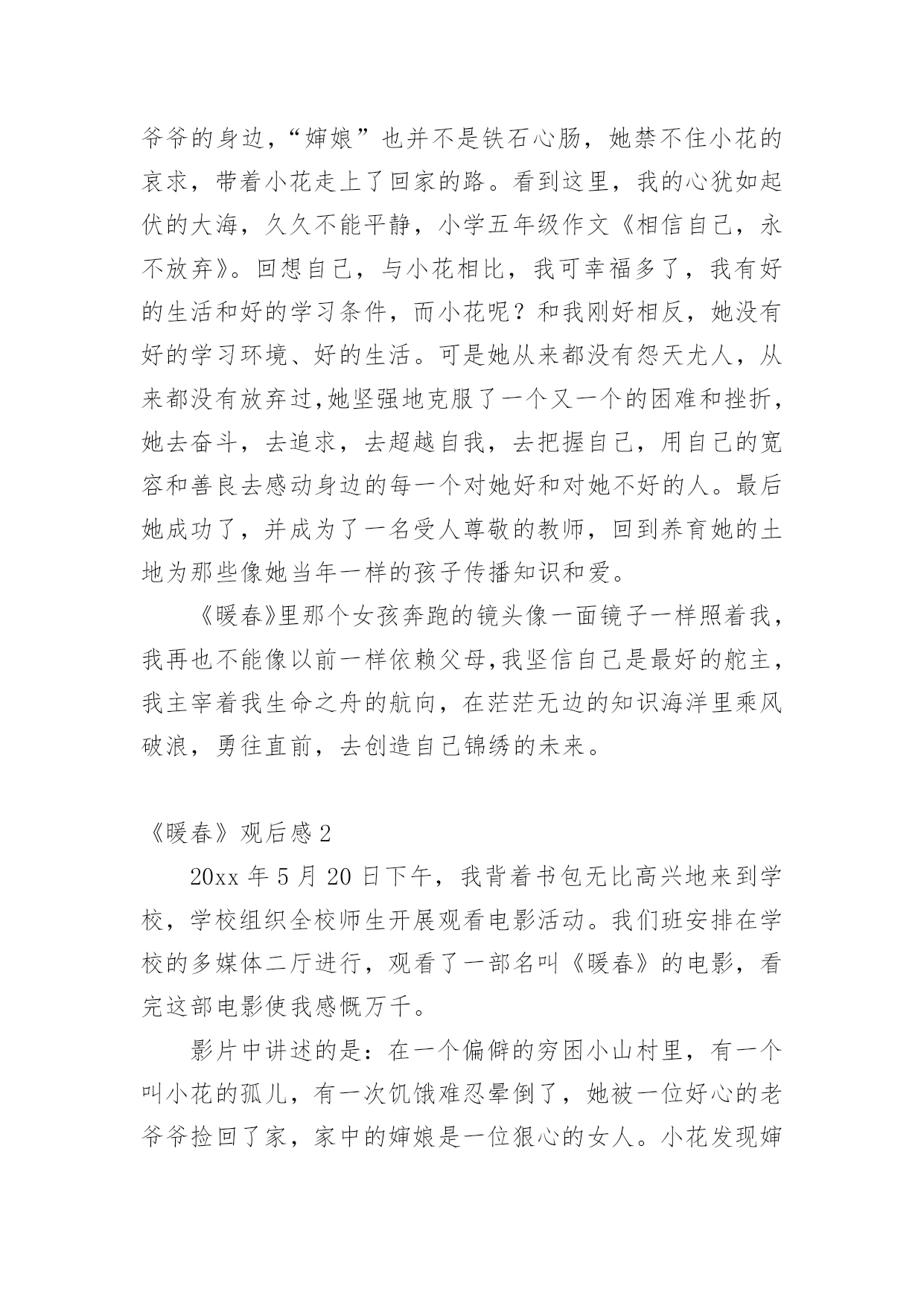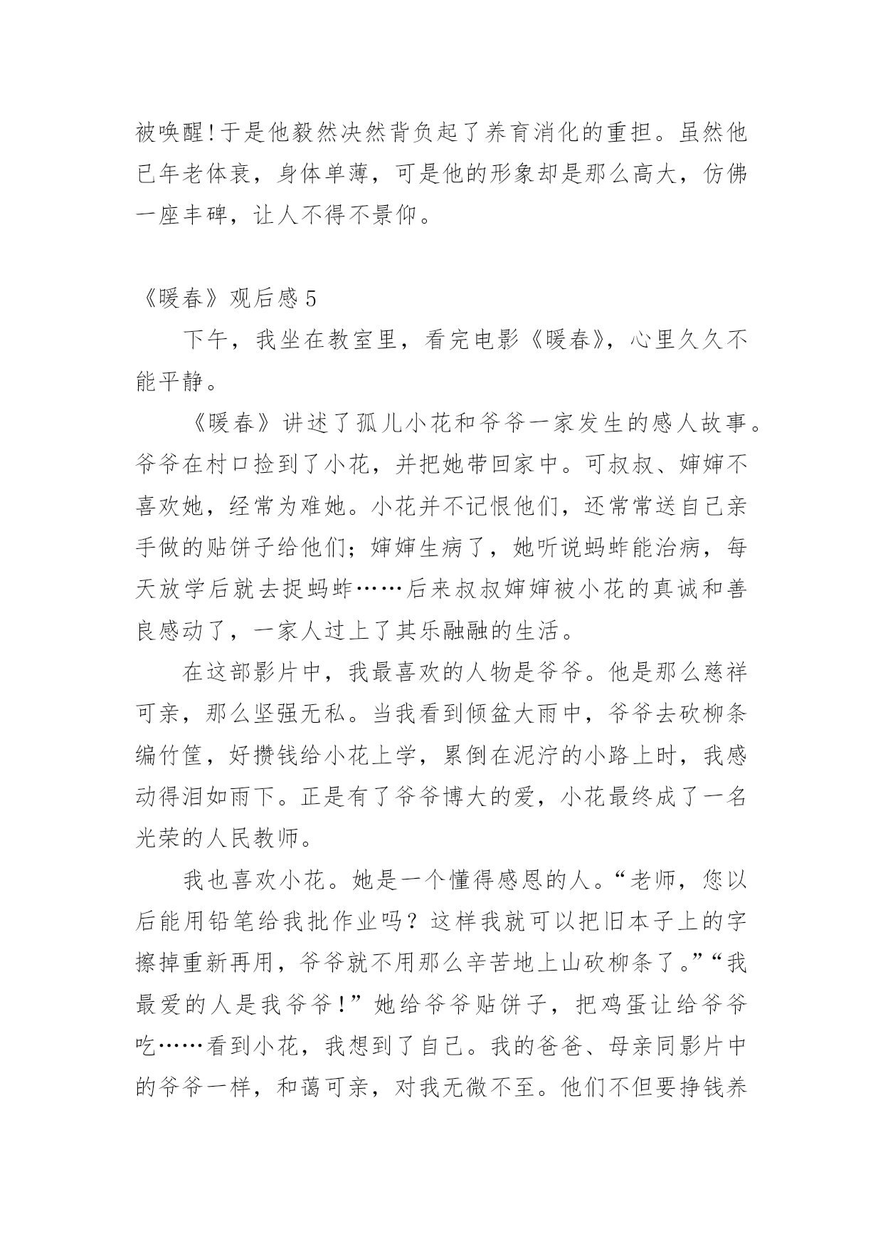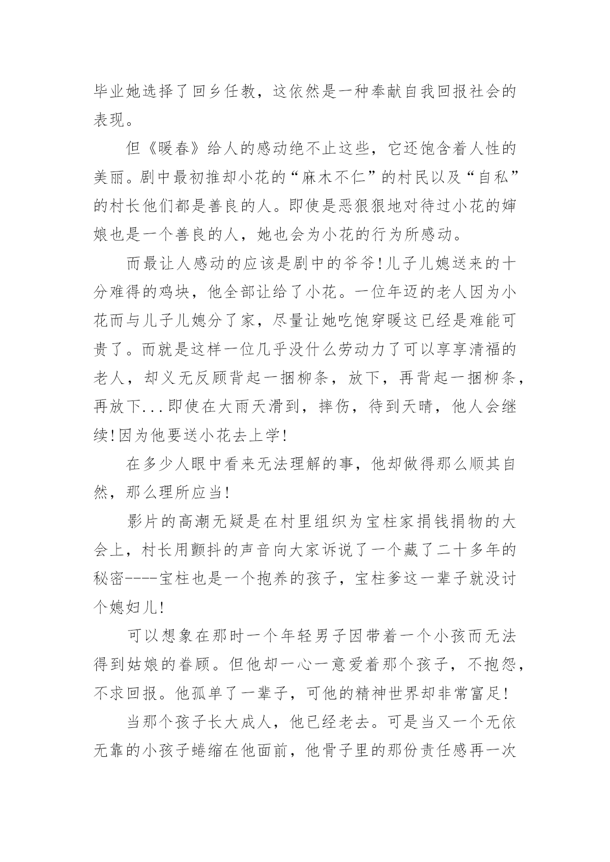 《暖春》观后感【推荐】《暖春》观后感认真看完一部作品以后,这次观看让你心中有什么感想呢?此时需要认真地做好记录,写写观后感了。那么你真的懂得怎么写观后感吗?以下是小编精心整理的《暖春》观后感,欢迎阅读与收藏。《暖春》观后感1山纵然高,也不及亲情高;海固然深,也不及亲情深,相信自己,永不放弃。那感人肺腑的亲情是我从《暖春》中这部电影中感受到的。星期五的早晨,在春风的吹拂下,老师的带领下,我们看了《暖春》这部电影,不知不觉我已泪流满面,伤心的泪水像断线的珠子一样不断往下涌……电影《暖春》讲述的是一个孤儿小花被一位善良的老人收养了,小花用她纯洁、真诚的亲情感染了她那一开始不愿意接受她的婶娘。那一幕幕感人至深的情景令我的心久久不能平静,我为主人公小花的悲惨遭遇感到伤心。我们在哭泣中回味着每一个镜头,这一幕又浮现在我的眼前……一个晴朗的早晨,小花的“婶娘”骗了单纯的小花跟她一起去收养的人家,到了目的地,当小花得知“婶娘”把她送给了别人,也不曾怨恨,只是苦苦哀求“婶娘”把她送回爷爷的身边,“婶娘”也并不是铁石心肠,她禁不住小花的哀求,带着小花走上了回家的路。看到这里,我的心犹如起伏的大海,久久不能平静,小学五年级作文《相信自己,永不放弃》。回想自己,与小花相比,我可幸福多了,我有好的生活和好的学习条件,而小花呢?和我刚好相反,她没有好的学习环境、好的生活。可是她从来都没有怨天尤人,从来都没有放弃过,她坚强地克服了一个又一个的困难和挫折,她去奋斗,去追求,去超越自我,去把握自己,用自己的宽容和善良去感动身边的每一个对她好和对她不好的人。最后她成功了,并成为了一名受人尊敬的教师,回到养育她的土地为那些像她当年一样的孩子传播知识和爱。《暖春》里那个女孩奔跑的镜头像一面镜子一样照着我,我再也不能像以前一样依赖父母,我坚信自己是最好的舵主,我主宰着我生命之舟的航向,在茫茫无边的知识海洋里乘风破浪,勇往直前,去创造自己锦绣的未来。《暖春》观后感220xx年5月20日下午,我背着书包无比高兴地来到学校,学校组织全校师生开展观看电影活动。我们班安排在学校的多媒体二厅进行,观看了一部名叫《暖春》的电影,看完这部电影使我感慨万千。影片中讲述的是:在一个偏僻的穷困小山村里,有一个叫小花的孤儿,有一次饥饿难忍晕倒了,她被一位好心的老爷爷捡回了家,家中的婶娘是一位狠心的女人。小花发现婶娘身体虚弱,又听到女人吃了蚂蚱可以生孩子,但婶娘的家庭穷困没有营养东西来补身子。小花急忙跑到山上捉蚂蚱,爬了东山爬西山,当满脸泥土的小花拿着装满蚂蚱的瓶子站在婶娘面前时,婶娘热泪盈眶,小花用自己的善良解冻了婶娘冰冷的心,终于把小花当亲生女儿看待。小花学习刻苦,成绩非常优秀,最后考上了理想的大学。但老爷爷家庭贫寒,供不起小花上大学,村里组织了一次捐学费大会,有鸡蛋、粮食、大枣、零钱……终于圆了小花的大学梦。小花大学毕业后,依然返回家乡当了一位乡村教师。这部电影有很多情节令我难忘。“老师,你以后能用铅笔给我们改作业吗?”小花望着老师的脸说到。懂事的小花知道爷爷的辛苦,她为了不给爷爷带来经济负担,请求老师用铅笔改作业,当本子用完后用橡皮檫干净,一个本子便可重复使用。看到这儿时,我不由得惭愧的低下了头。我的生活条件比小花好的太多了,衣来伸手,饭来张口,我却不懂得珍惜,不懂得勤俭节约,经常大手大脚花钱,从未想到在外拼搏的爸妈,从不理解爸妈供养我的艰辛。我的作业本几乎都是剩好些张纸就扔了,写错一个字就撕了;每次妈妈拖着疲惫的身子回到家里,用心给我做好多很香的饭菜,端上餐桌吃饭时,我总是挑三拣四,这个菜不合口,那个饭不好吃。而小花小小年纪便懂得体贴爷爷,小小年纪帮爷爷扫地、做饭、洗衣服……想到这,我不由得流下了惭愧的眼泪。是啊!穷家孩子早当家,男儿理当更自强。我决定以后改掉身上这些毛病,像电影里的小花一样,做一个勤俭节约、自强自立、珍惜幸福、懂得感恩、热爱生活的好孩子。《暖春》观后感3一个人一生中最重要的也许是人生的价值,可是真情也是不可缺少的一部分。假如人生像大海,那么真情就像浪花,大海是壮阔的,是蔚蓝的,浪花也是美好的!珍爱大海,也请你珍惜每一朵浪花。"鸭鸭鸭鸭鸭鸭``````"在一座大山里,有一个漂亮的村庄,村里天天都会出现一个赶鸭子的身影——她就是小花,一个无父无母的女孩,可又有谁知道小花背后辛酸的故事。小花在很小的时候,就父母双亡,唯一的亲人奶奶也离她而去。她只好寄人篱下,在遭受那户人家的虐待之后,小花逃了出来,被一个叫"二狗"的村民救了。大家都不愿意领养她,最后一个老汉领养了她。老汉遭受了儿子与儿媳的反对,毅然把小花留了下来。小花的婶娘对她很坏。千方百计的要把小花送走,但小花一点也不记恨她。结局自然是美好的:小花如愿以偿地成了婶娘的孩子,乡亲们为小花一家捐钱捐粮,她考入了大学,成为