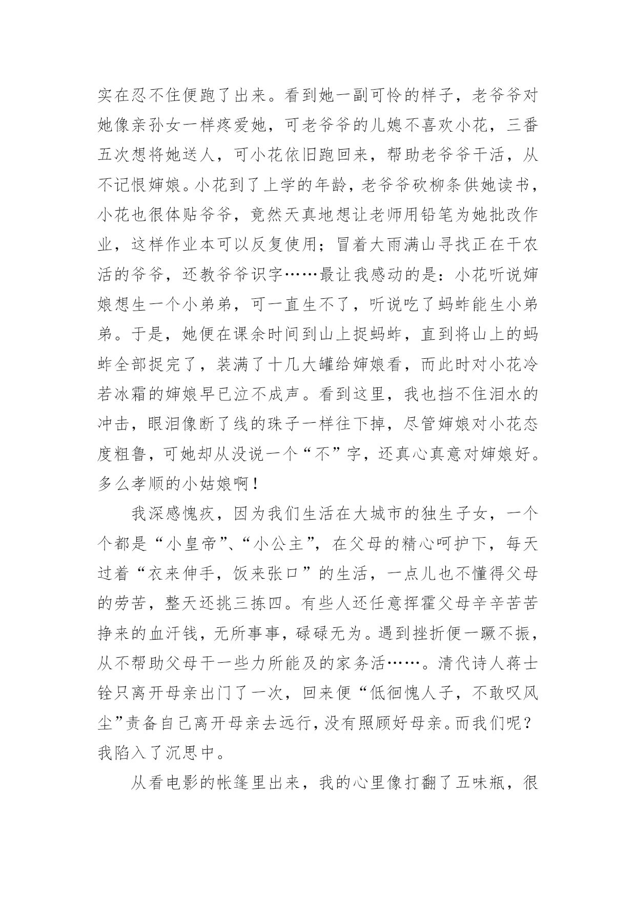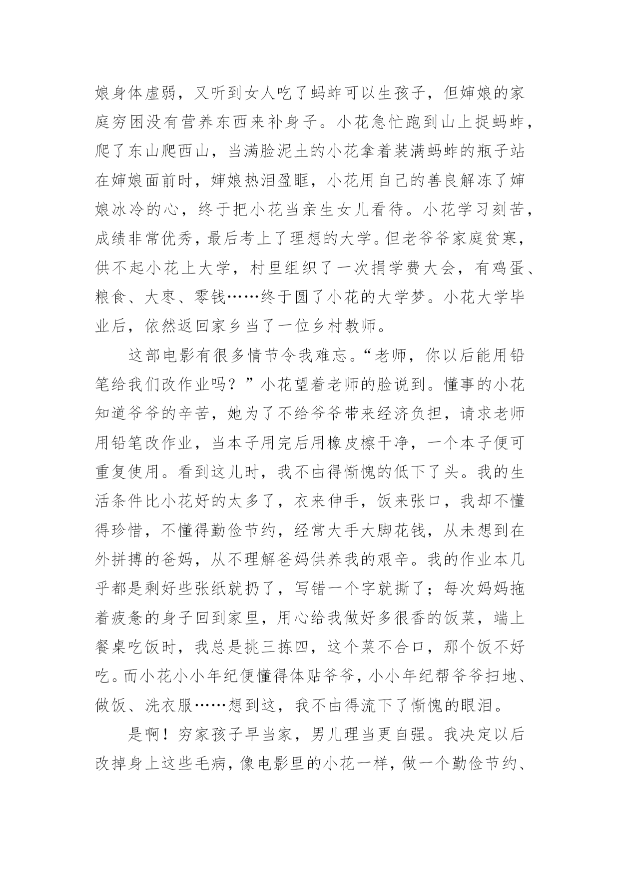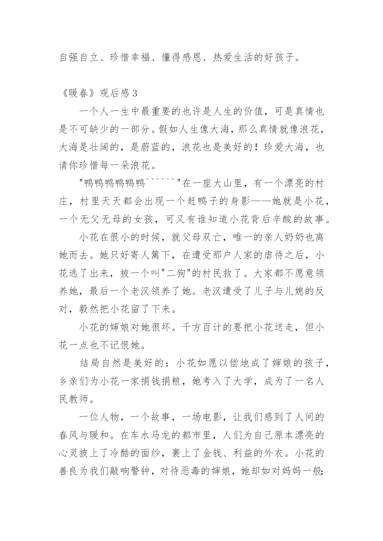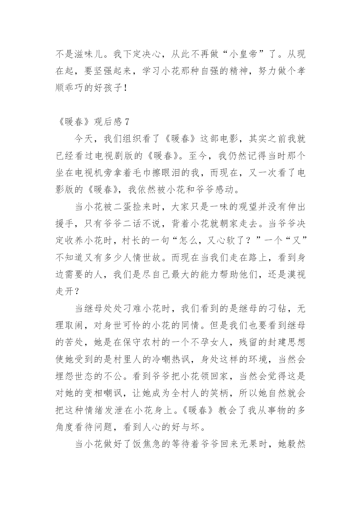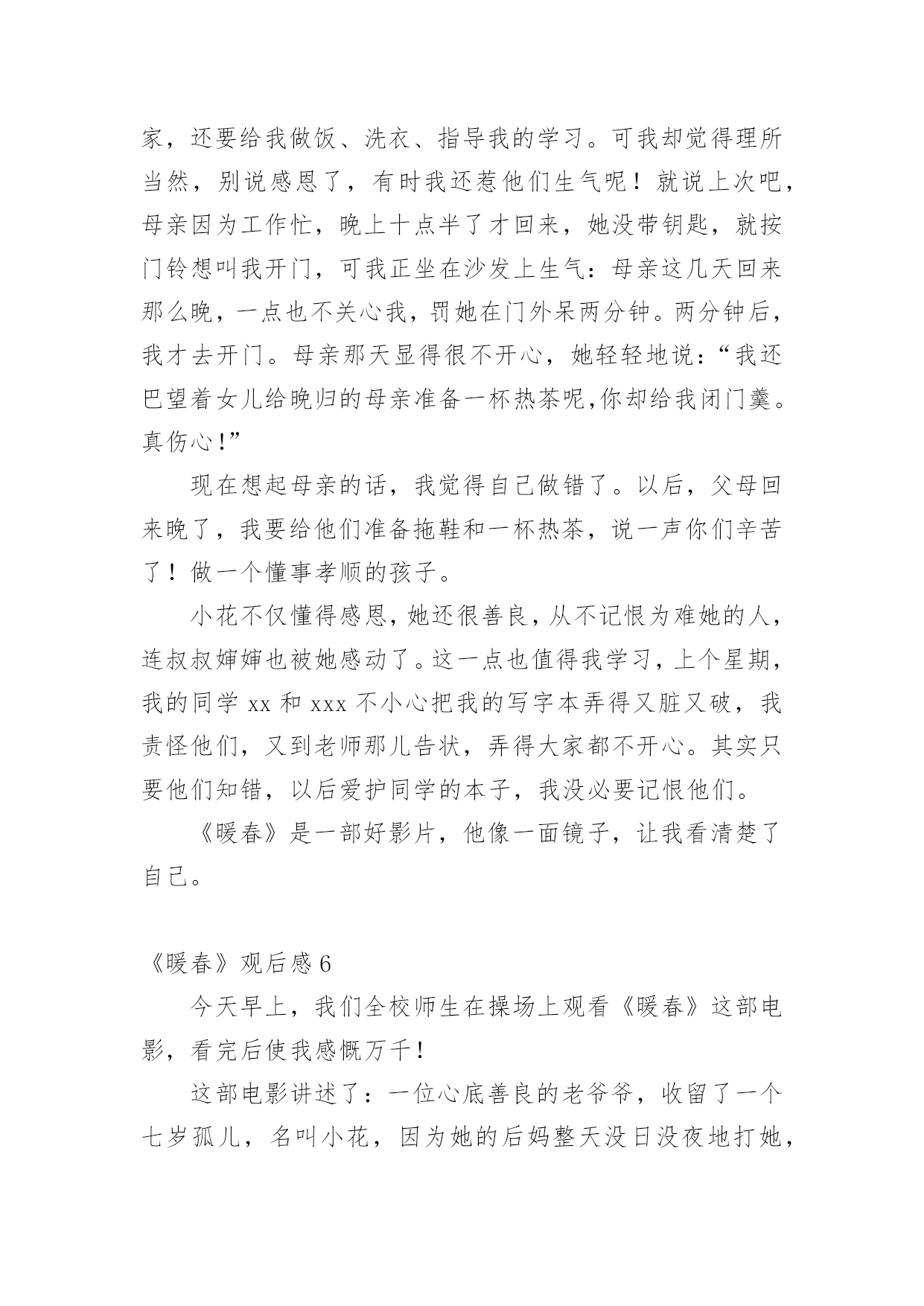 《暖春》观后感【推荐】《暖春》观后感认真看完一部作品以后,这次观看让你心中有什么感想呢?此时需要认真地做好记录,写写观后感了。那么你真的懂得怎么写观后感吗?以下是小编精心整理的《暖春》观后感,欢迎阅读与收藏。《暖春》观后感1山纵然高,也不及亲情高;海固然深,也不及亲情深,相信自己,永不放弃。那感人肺腑的亲情是我从《暖春》中这部电影中感受到的。星期五的早晨,在春风的吹拂下,老师的带领下,我们看了《暖春》这部电影,不知不觉我已泪流满面,伤心的泪水像断线的珠子一样不断往下涌……电影《暖春》讲述的是一个孤儿小花被一位善良的老人收养了,小花用她纯洁、真诚的亲情感染了她那一开始不愿意接受她的婶娘。那一幕幕感人至深的情景令我的心久久不能平静,我为主人公小花的悲惨遭遇感到伤心。我们在哭泣中回味着每一个镜头,这一幕又浮现在我的眼前……一个晴朗的早晨,小花的“婶娘”骗了单纯的小花跟她一起去收养的人家,到了目的地,当小花得知“婶娘”把她送给了别人,也不曾怨恨,只是苦苦哀求“婶娘”把她送回爷爷的身边,“婶娘”也并不是铁石心肠,她禁不住小花的哀求,带着小花走上了回家的路。看到这里,我的心犹如起伏的大海,久久不能平静,小学五年级作文《相信自己,永不放弃》。回想自己,与小花相比,我可幸福多了,我有好的生活和好的学习条件,而小花呢?和我刚好相反,她没有好的学习环境、好的生活。可是她从来都没有怨天尤人,从来都没有放弃过,她坚强地克服了一个又一个的困难和挫折,她去奋斗,去追求,去超越自我,去把握自己,用自己的宽容和善良去感动身边的每一个对她好和对她不好的人。最后她成功了,并成为了一名受人尊敬的教师,回到养育她的土地为那些像她当年一样的孩子传播知识和爱。《暖春》里那个女孩奔跑的镜头像一面镜子一样照着我,我再也不能像以前一样依赖父母,我坚信自己是最好的舵主,我主宰着我生命之舟的航向,在茫茫无边的知识海洋里乘风破浪,勇往直前,去创造自己锦绣的未来。《暖春》观后感220xx年5月20日下午,我背着书包无比高兴地来到学校,学校组织全校师生开展观看电影活动。我们班安排在学校的多媒体二厅进行,观看了一部名叫《暖春》的电影,看完这部电影使我感慨万千。影片中讲述的是:在一个偏僻的穷困小山村里,有一个叫小花的孤儿,有一次饥饿难忍晕倒了,她被一位好心的老爷爷捡回了家,家中的婶娘是一位狠心的女人。小花发现婶娘身体虚弱,又听到女人吃了蚂蚱可以生孩子,但婶娘的家庭穷困没有营养东西来补身子。小花急忙跑到山上捉蚂蚱,爬了东山爬西山,当满脸泥土的小花拿着装满蚂蚱的瓶子站在婶娘面前时,婶娘热泪盈眶,小花用自己的善良解冻了婶娘冰冷的心,终于把小花当亲生女儿看待。小花学习刻苦,成绩非常优秀,最后考上了理想的大学。但老爷爷家庭贫寒,供不起小花上大学,村里组织了一次捐学费大会,有鸡蛋、粮食、大枣、零钱……终于圆了小花的大学梦。小花大学毕业后,依然返回家乡当了一位乡村教师。这部电影有很多情节令我难忘。“老师,你以后能用铅笔给我们改作业吗?”小花望着老师的脸说到。懂事的小花知道爷爷的辛苦,她为了不给爷爷带来经济负担,请求老师用铅笔改作业,当本子用完后用橡皮檫干净,一个本子便可重复使用。看到这儿时,我不由得惭愧的低下了头。我的生活条件比小花好的太多了,衣来伸手,饭来张口,我却不懂得珍惜,不懂得勤俭节约,经常大手大脚花钱,从未想到在外拼搏的爸妈,从不理解爸妈供养我的艰辛。我的作业本几乎都是剩好些张纸就扔了,写错一个字就撕了;每次妈妈拖着疲惫的身子回到家里,用心给我做好多很香的饭菜,端上餐桌吃饭时,我总是挑三拣四,这个菜不合口,那个饭不好吃。而小花小小年纪便懂得体贴爷爷,小小年纪帮爷爷扫地、做饭、洗衣服……想到这,我不由得流下了惭愧的眼泪。是啊!穷家孩子早当家,男儿理当更自强。我决定以后改掉身上这些毛病,像电影里的小花一样,做一个勤俭节约、自强自立、珍惜幸福、懂得感恩、热爱生活的好孩子。《暖春》观后感3一个人一生中最重要的也许是人生的价值,可是真情也是不可缺少的一部分。假如人生像大海,那么真情就像浪花,大海是壮阔的,是蔚蓝的,浪花也是美好的!珍爱大海,也请你珍惜每一朵浪花。"鸭鸭鸭鸭鸭鸭``````"在一座大山里,有一个漂亮的村庄,村里天天都会出现一个赶鸭子的身影——她就是小花,一个无父无母的女孩,可又有谁知道小花背后辛酸的故事。小花在很小的时候,就父母双亡,唯一的亲人奶奶也离她而去。她只好寄人篱下,在遭受那户人家的虐待之后,小花逃了出来,被一个叫"二狗"的村民救了。大家都不愿意领养她,最后一个老汉领养了她。老汉遭受了儿子与儿媳的反对,毅然把小花留了下来。小花的婶娘对她很坏。千方百计的要把小花送走,但小花一点也不记恨她。结局自然是美好的:小花如愿以偿地成了婶娘的孩子,乡亲们为小花一家捐钱捐粮,她考入了大学,成为
