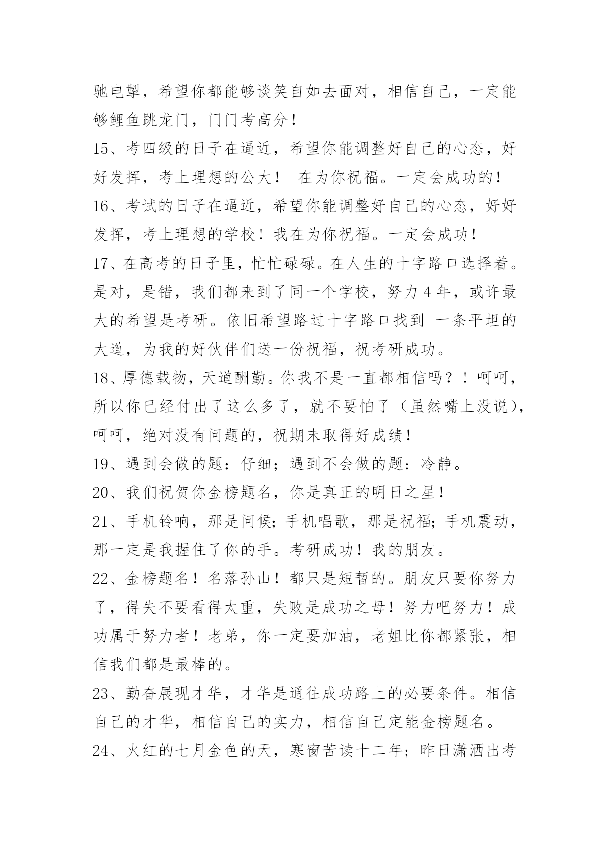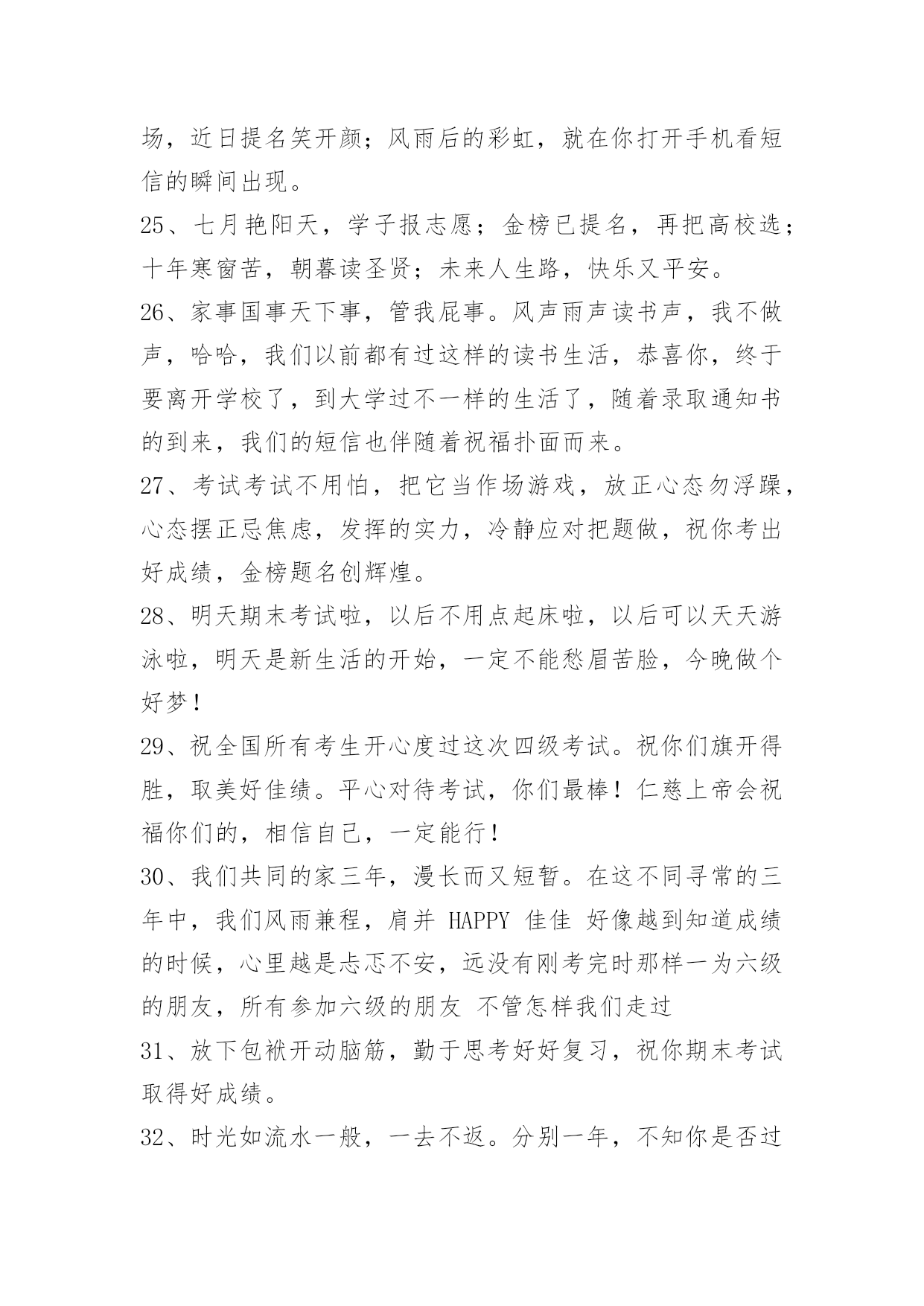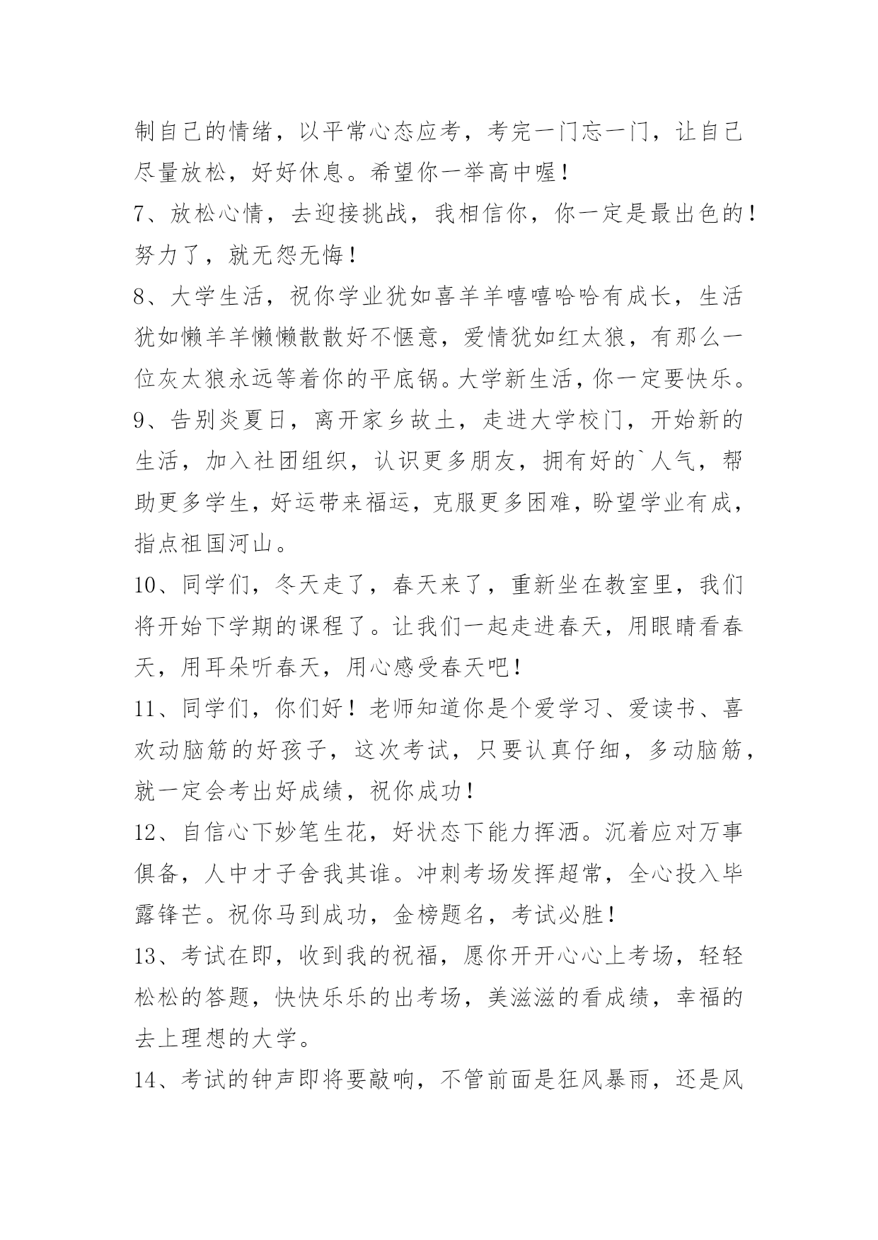 经典考试顺利祝福寄语经典考试顺利祝福寄语40句精选我知道你正在经历人生中的一次重要挑战,或许你有焦虑、有恐惧,也有激动,但我相信我的祝福能为你添一份信心、一份动力。愿你考试顺利!本文是小编为你整理的考试顺利祝福寄语,欢迎大家阅读。1、就要考试了,放开往日的学习中的紧张,用一颗平常心去简单应对,坚信你会考出自我理想的成绩的。愿好运一向陪伴着你!2、不去想最后得分成绩是怎样,要知道每天的努力也会有回报。我知道你一直有双隐形的翅膀,带你飞给你希望。愿朋友高考顺利,金榜题名!3、量变到质变,努力奠定基础;开花到结果,坚持终能收获;过程到成功,态度决定一切。高考到,饭吃好,觉睡好,才能考的更好4、仰望天空时,什么都比你高,你会自卑;俯视大地时,什么都比你低,你会自负;只有放宽视野,把天空和大地尽收眼底,才能在苍穹沃土之间找到你真正的位置。无须自卑,不要自负,坚持自信。5、人都是在跌倒与爬起之间学会坚强,都是在风雨与阳光之间走过成长的路。失败所能带给你的只应是一些教训,一些冷静的思考,而不该有绝望、颓废、不知所措。6、期中考试加油!亲爱的朋友,平和一下自己的心态,控制自己的情绪,以平常心态应考,考完一门忘一门,让自己尽量放松,好好休息。希望你一举高中喔!7、放松心情,去迎接挑战,我相信你,你一定是最出色的!努力了,就无怨无悔!8、大学生活,祝你学业犹如喜羊羊嘻嘻哈哈有成长,生活犹如懒羊羊懒懒散散好不惬意,爱情犹如红太狼,有那么一位灰太狼永远等着你的平底锅。大学新生活,你一定要快乐。9、告别炎夏日,离开家乡故土,走进大学校门,开始新的生活,加入社团组织,认识更多朋友,拥有好的`人气,帮助更多学生,好运带来福运,克服更多困难,盼望学业有成,指点祖国河山。10、同学们,冬天走了,春天来了,重新坐在教室里,我们将开始下学期的课程了。让我们一起走进春天,用眼睛看春天,用耳朵听春天,用心感受春天吧!11、同学们,你们好!老师知道你是个爱学习、爱读书、喜欢动脑筋的好孩子,这次考试,只要认真仔细,多动脑筋,就一定会考出好成绩,祝你成功!12、自信心下妙笔生花,好状态下能力挥洒。沉着应对万事俱备,人中才子舍我其谁。冲刺考场发挥超常,全心投入毕露锋芒。祝你马到成功,金榜题名,考试必胜!13、考试在即,收到我的祝福,愿你开开心心上考场,轻轻松松的答题,快快乐乐的出考场,美滋滋的看成绩,幸福的去上理想的大学。14、考试的钟声即将要敲响,不管前面是狂风暴雨,还是风驰电掣,希望你都能够谈笑自如去面对,相信自己,一定能够鲤鱼跳龙门,门门考高分!15、考四级的日子在逼近,希望你能调整好自己的心态,好好发挥,考上理想的公大!在为你祝福。一定会成功的!16、考试的日子在逼近,希望你能调整好自己的心态,好好发挥,考上理想的学校!我在为你祝福。一定会成功!17、在高考的日子里,忙忙碌碌。在人生的十字路口选择着。是对,是错,我们都来到了同一个学校,努力4年,或许最大的希望是考研。依旧希望路过十字路口找到一条平坦的大道,为我的好伙伴们送一份祝福,祝考研成功。18、厚德载物,天道酬勤。你我不是一直都相信吗?!呵呵,所以你已经付出了这么多了,就不要怕了(虽然嘴上没说),呵呵,绝对没有问题的,祝期末取得好成绩!19、遇到会做的题:仔细;遇到不会做的题:冷静。20、我们祝贺你金榜题名,你是真正的明日之星!21、手机铃响,那是问候;手机唱歌,那是祝福;手机震动,那一定是我握住了你的手。考研成功!我的朋友。22、金榜题名!名落孙山!都只是短暂的。朋友只要你努力了,得失不要看得太重,失败是成功之母!努力吧努力!成功属于努力者!老弟,你一定要加油,老姐比你都紧张,相信我们都是最棒的。23、勤奋展现才华,才华是通往成功路上的必要条件。相信自己的才华,相信自己的实力,相信自己定能金榜题名。24、火红的七月金色的天,寒窗苦读十二年;昨日潇洒出考场,近日提名笑开颜;风雨后的彩虹,就在你打开手机看短信的瞬间出现。25、七月艳阳天,学子报志愿;金榜已提名,再把高校选;十年寒窗苦,朝暮读圣贤;未来人生路,快乐又平安。26、家事国事天下事,管我屁事。风声雨声读书声,我不做声,哈哈,我们以前都有过这样的读书生活,恭喜你,终于要离开学校了,到大学过不一样的生活了,随着录取通知书的到来,我们的短信也伴随着祝福扑面而来。27、考试考试不用怕,把它当作场游戏,放正心态勿浮躁,心态摆正忌焦虑,发挥的实力,冷静应对把题做,祝你考出好成绩,金榜题名创辉煌。28、明天期末考试啦,以后不用点起床啦,以后可以天天游泳啦,明天是新生活的开始,一定不能愁眉苦脸,今晚做个好梦!29、祝全国所有考生开心度过这次四级考试。祝你们旗开得胜,取美好佳绩。平心对待考试,你们最棒!仁慈上帝会祝福你们的,相信自己,一定能行!30、我们共同的家三年,漫