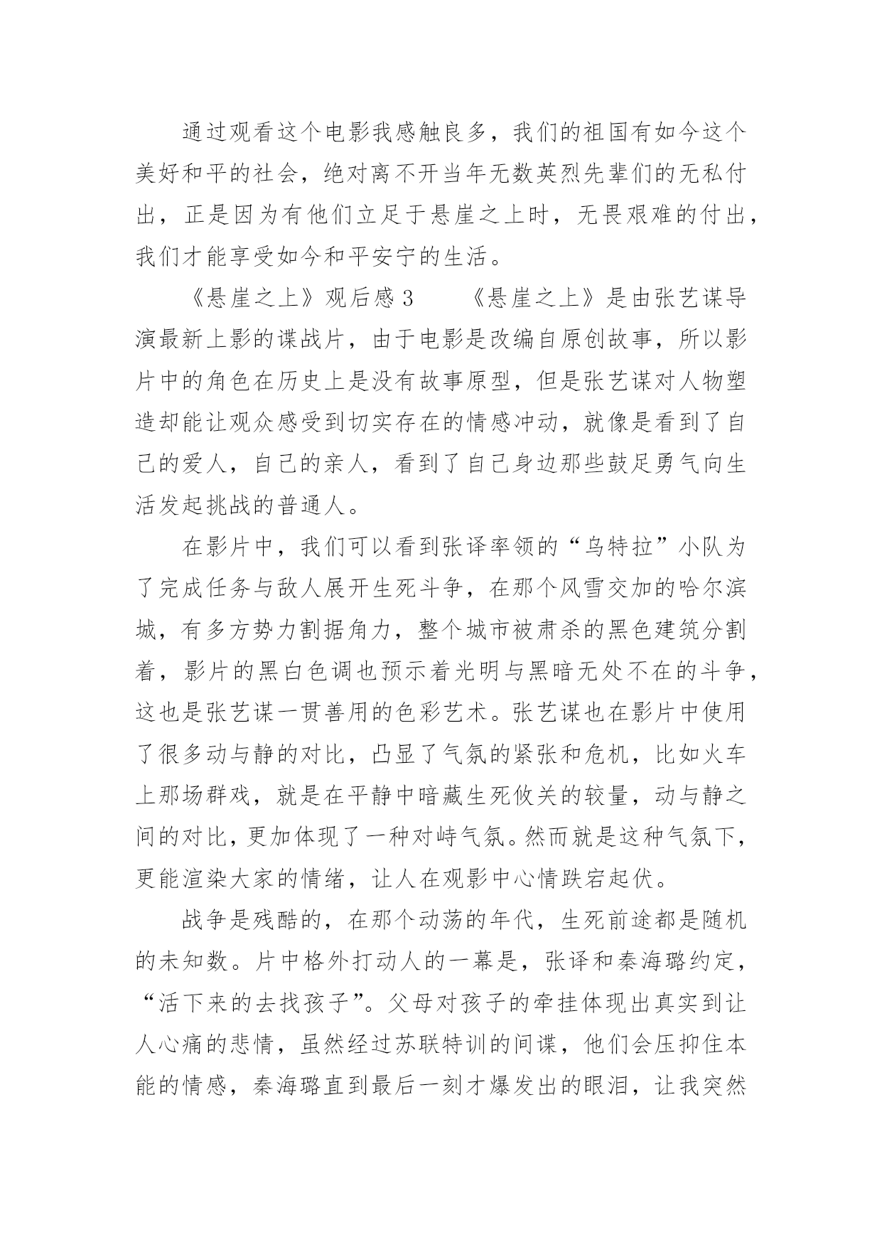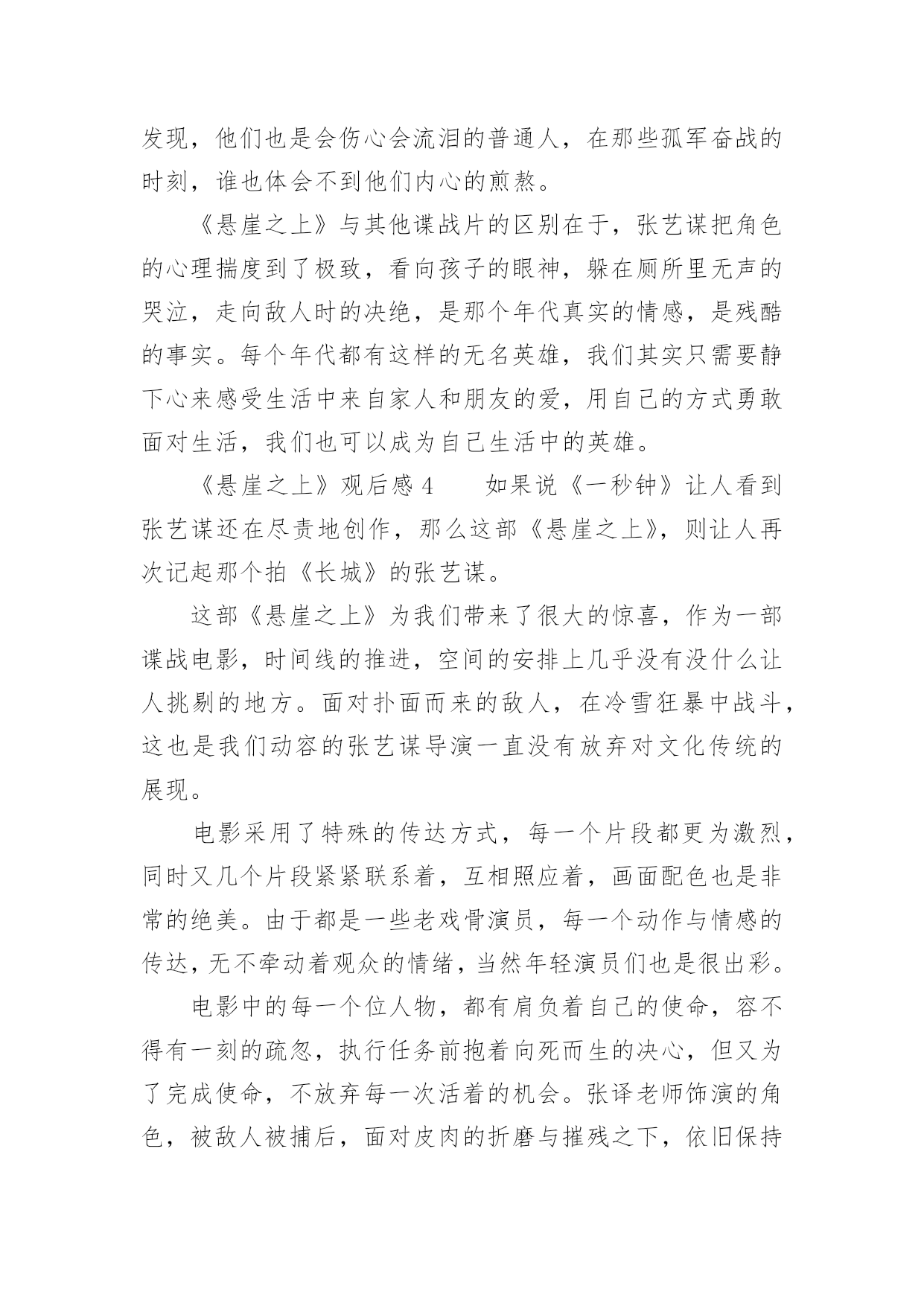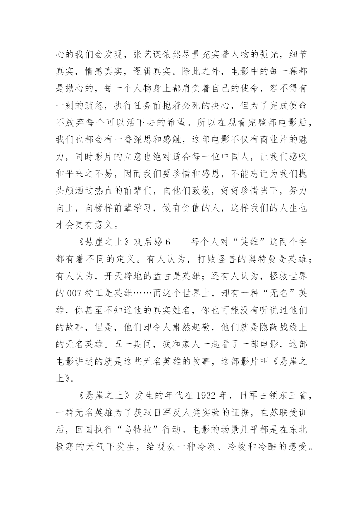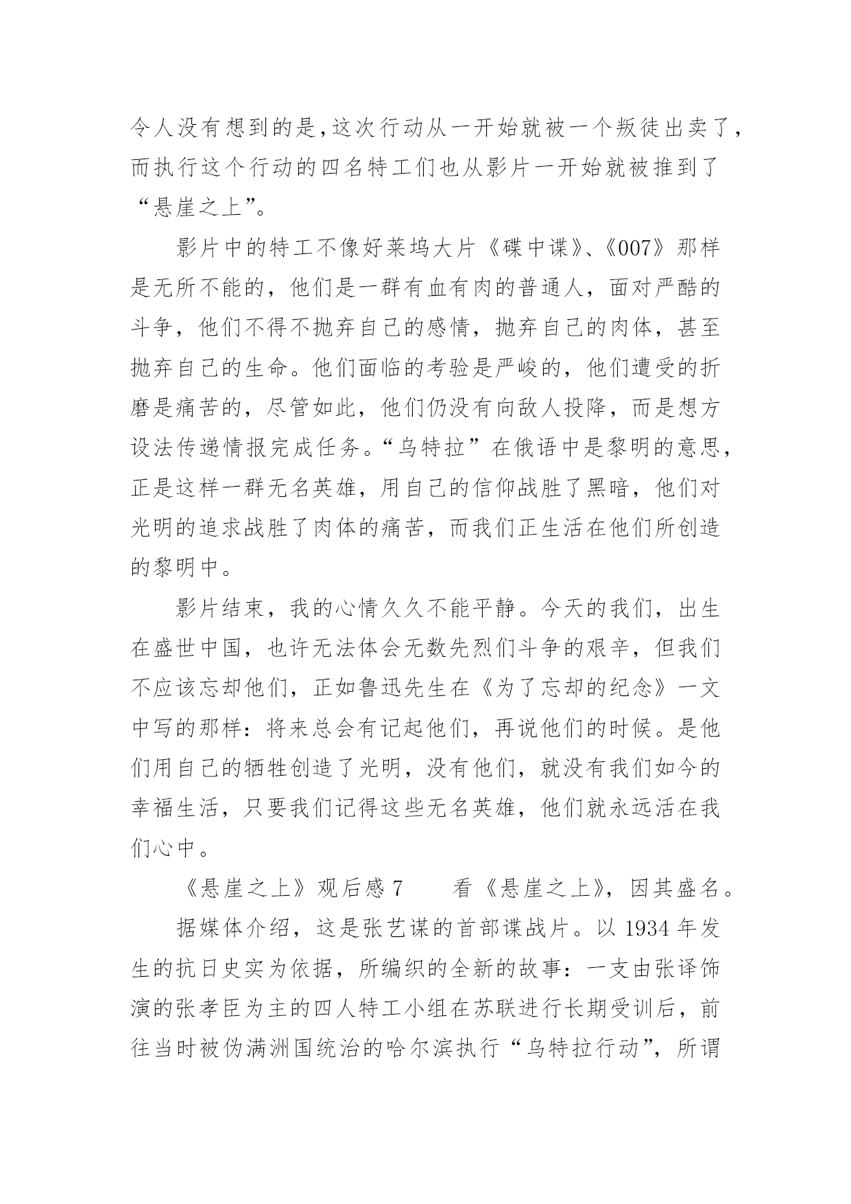 《悬崖之上》观后感《悬崖之上》优秀观后感(通用8篇)在看完一部作品以后,能够给我们不少启示,为此需要好好认真地写观后感。到底应如何写观后感呢?下面是小编为大家收集的《悬崖之上》优秀观后感(通用8篇),希望能够帮助到大家。《悬崖之上》观后感1《悬崖之上》是全勇先和导演张艺谋的首次合作,电影在东北雪乡官宣开机之时,网友便对电影的故事产生了极大好奇。作为一名“资深谍战片编剧”,全勇先此前已有许多优秀作品面世,此次现身金爵论坛,让人格外期待他的“爆料”。谈到谍战类型,全勇先表示“我写谍战戏最关注的是人,人物是最有魅力的。”全勇先常常把人物关系放在谍战氛围里去表现,他特别提到,把人写好才能更好地打动观众:“如果观众对这个人物建立了兴趣,建立了情感,这个人物的一举一动,一言一行所有行为都会牵动观众的情绪。这对我来说是一个法宝。”《悬崖之上》对人物的描绘是电影的一大看点,也是创作的难点。全勇先提到,《悬崖之上》和普通的谍战片还有一些区别,除了敌我阵营的明暗交锋,电影对人的复杂性、人在极端情况下的反应、绝境之中的遭遇等都有较深的刻画。而且电影中人物较多,这也无疑为剧本创作增加了难度。《悬崖之上》故事发生在上世纪三十年代,为获得日本展开反人类实验的证据,一场关系复杂又危机四伏的秘密行动在东北展开……这是张艺谋导演首度拍摄谍战题材电影。林海雪原的茫茫景致为这个充满暗斗和危机的故事平添一股肃杀神秘之感。在张艺谋的光影美学驱动下,令人更加期待电影更多的信息曝光。《悬崖之上》观后感2五一劳动节的到来让无数网友都兴奋不已,不仅有长达五天的放假休闲时间,还有数部经典好看的电影到来。在五一档的前一天,张艺谋导演的首部谍战大片《悬崖之上》正式上映了,我也在五一放假的第一天,就到电影院观看这部令人期待许久的谍战电影。作为著名导演,张艺谋给我们带来不知多少好看又经典的好电影,这一次的《悬崖之上》也是吊足了网友们的胃口;因为这部片子早在很久的时候,就公布说有众多实力派演员,可以说是众星云集,自然受到无数网友的关注与期盼。我自然也不会例外,因为在这部电影中,有一个我非常喜欢的演员,张译!只要是他出现的电影,不仅经典好看,电影的整体质量也非常不错,只要有他,那基本就不会太差。《悬崖之上》给我们讲述了,在上世纪三十年代时,一场名为“乌特拉”的行动中,四位爱国志士,因为叛徒的出卖,最后深陷敌人重重罗网,最后周旋脱身的故事。这一次的《悬崖之上》中,众多优秀演员们那经典绝伦的表演,就给我带来非常深刻的印象。一个优秀的演员,到底可以给一部电影带来多大的提升;而悬崖之上这部电影,有众多演技精湛的演员,更是给我们带来一场非常华立的视听盛宴。通过观看这个电影我感触良多,我们的祖国有如今这个美好和平的社会,绝对离不开当年无数英烈先辈们的无私付出,正是因为有他们立足于悬崖之上时,无畏艰难的付出,我们才能享受如今和平安宁的生活。《悬崖之上》观后感3《悬崖之上》是由张艺谋导演最新上影的谍战片,由于电影是改编自原创故事,所以影片中的角色在历史上是没有故事原型,但是张艺谋对人物塑造却能让观众感受到切实存在的情感冲动,就像是看到了自己的爱人,自己的亲人,看到了自己身边那些鼓足勇气向生活发起挑战的普通人。在影片中,我们可以看到张译率领的“乌特拉”小队为了完成任务与敌人展开生死斗争,在那个风雪交加的哈尔滨城,有多方势力割据角力,整个城市被肃杀的黑色建筑分割着,影片的黑白色调也预示着光明与黑暗无处不在的斗争,这也是张艺谋一贯善用的色彩艺术。张艺谋也在影片中使用了很多动与静的对比,凸显了气氛的紧张和危机,比如火车上那场群戏,就是在平静中暗藏生死攸关的较量,动与静之间的对比,更加体现了一种对峙气氛。然而就是这种气氛下,更能渲染大家的情绪,让人在观影中心情跌宕起伏。战争是残酷的,在那个动荡的年代,生死前途都是随机的未知数。片中格外打动人的一幕是,张译和秦海璐约定,“活下来的去找孩子”。父母对孩子的牵挂体现出真实到让人心痛的悲情,虽然经过苏联特训的间谍,他们会压抑住本能的情感,秦海璐直到最后一刻才爆发出的眼泪,让我突然发现,他们也是会伤心会流泪的普通人,在那些孤军奋战的时刻,谁也体会不到他们内心的煎熬。《悬崖之上》与其他谍战片的区别在于,张艺谋把角色的心理揣度到了极致,看向孩子的眼神,躲在厕所里无声的哭泣,走向敌人时的决绝,是那个年代真实的情感,是残酷的事实。每个年代都有这样的无名英雄,我们其实只需要静下心来感受生活中来自家人和朋友的爱,用自己的方式勇敢面对生活,我们也可以成为自己生活中的英雄。《悬崖之上》观后感4如果说《一秒钟》让人看到张艺谋还在尽责地创作,那么这部《悬崖之上》,则让人再次记起那个拍《长城》的张艺谋。这部《悬崖之上》为我们带来了很大的惊喜,作为一部谍战电影,时间线的推进,空间的安排上几乎没有
