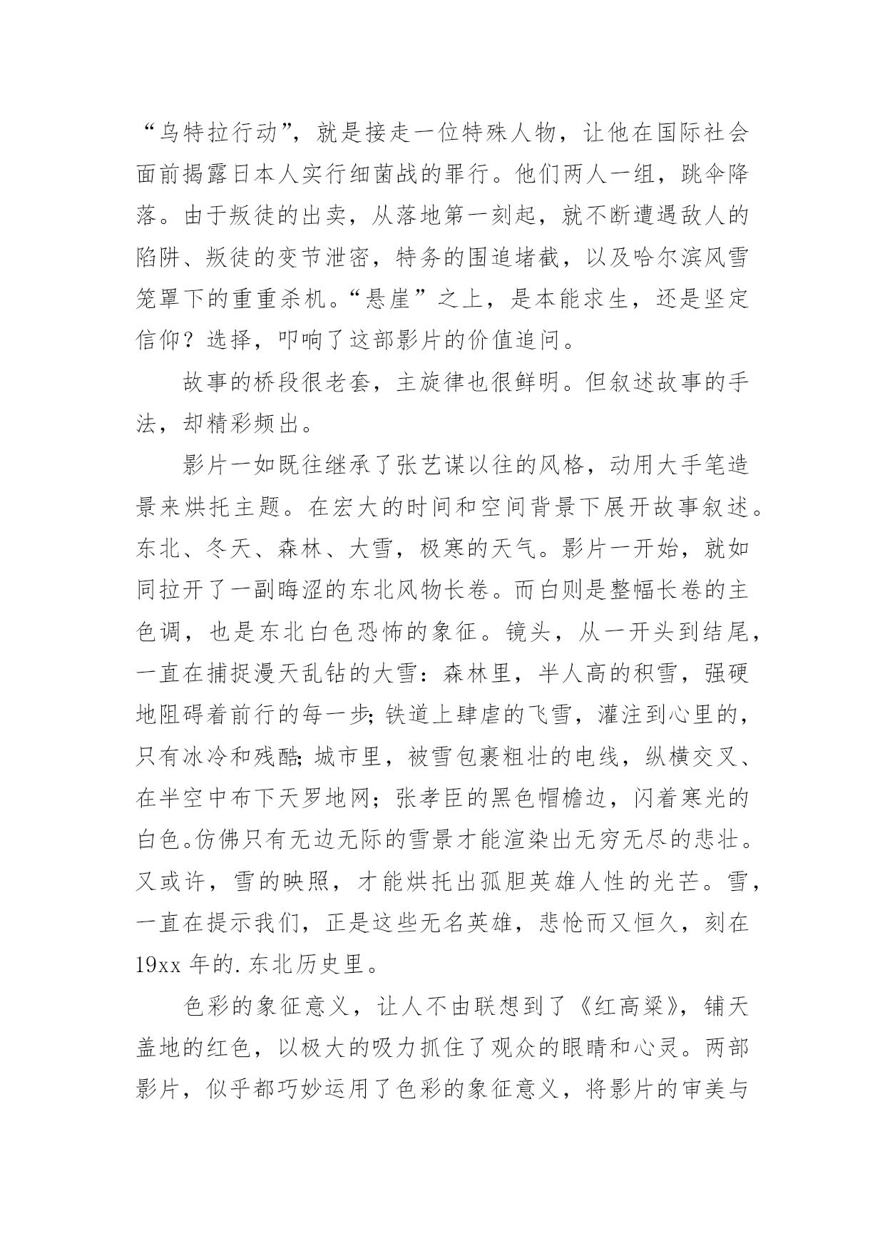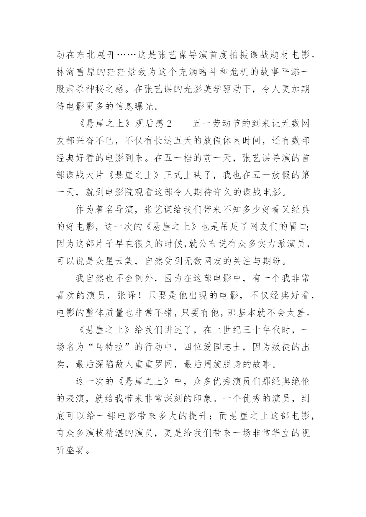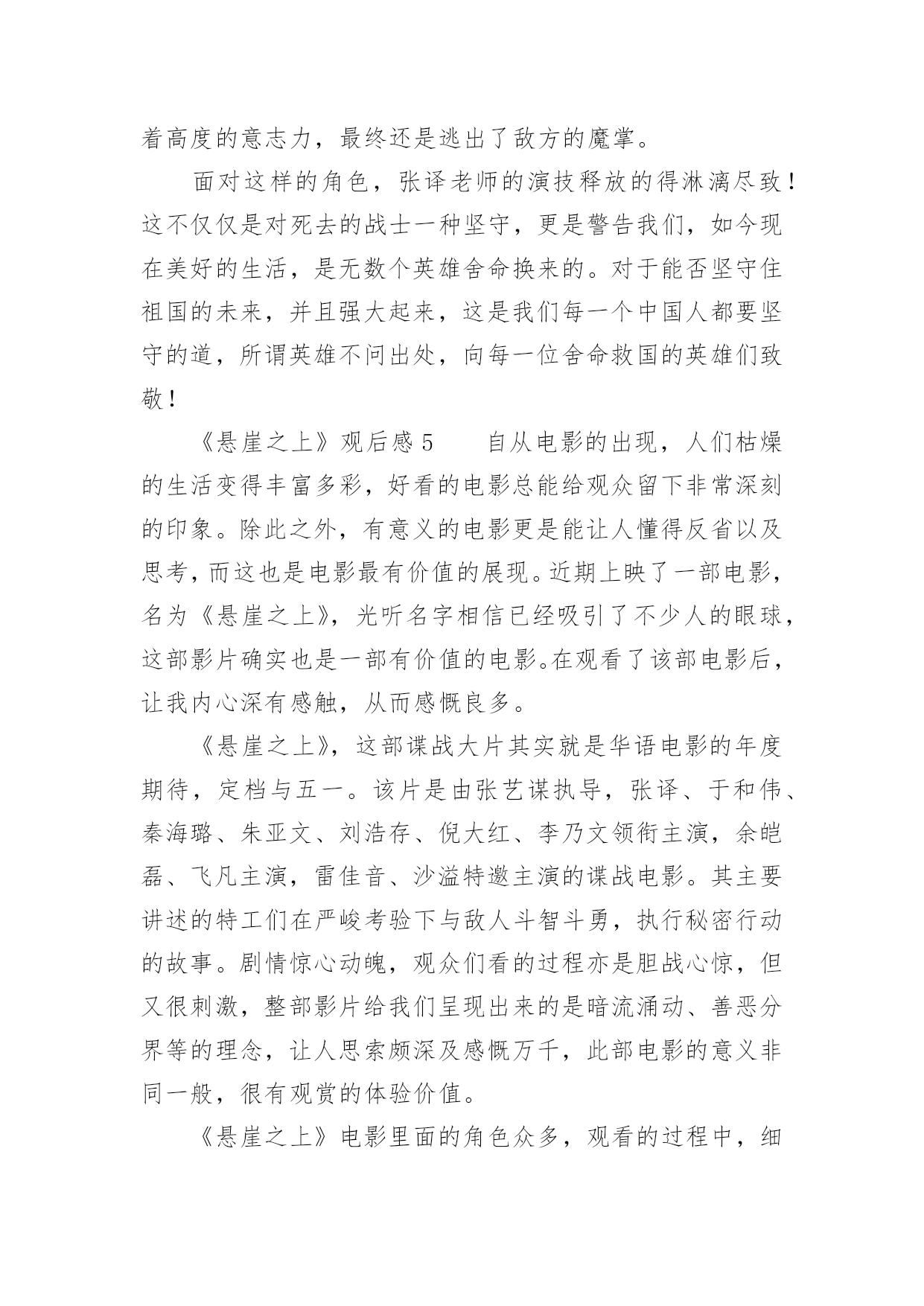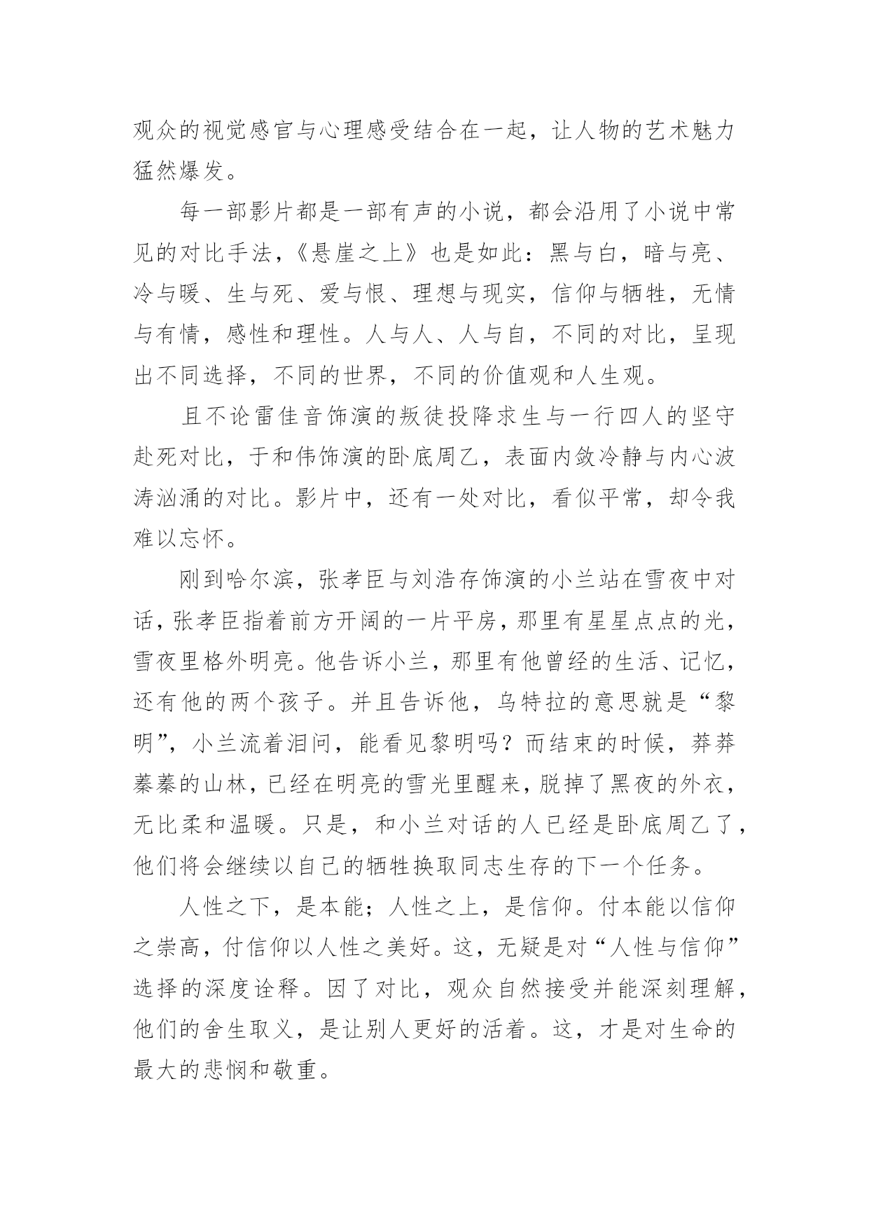 《悬崖之上》观后感《悬崖之上》优秀观后感(通用8篇)在看完一部作品以后,能够给我们不少启示,为此需要好好认真地写观后感。到底应如何写观后感呢?下面是小编为大家收集的《悬崖之上》优秀观后感(通用8篇),希望能够帮助到大家。《悬崖之上》观后感1《悬崖之上》是全勇先和导演张艺谋的首次合作,电影在东北雪乡官宣开机之时,网友便对电影的故事产生了极大好奇。作为一名“资深谍战片编剧”,全勇先此前已有许多优秀作品面世,此次现身金爵论坛,让人格外期待他的“爆料”。谈到谍战类型,全勇先表示“我写谍战戏最关注的是人,人物是最有魅力的。”全勇先常常把人物关系放在谍战氛围里去表现,他特别提到,把人写好才能更好地打动观众:“如果观众对这个人物建立了兴趣,建立了情感,这个人物的一举一动,一言一行所有行为都会牵动观众的情绪。这对我来说是一个法宝。”《悬崖之上》对人物的描绘是电影的一大看点,也是创作的难点。全勇先提到,《悬崖之上》和普通的谍战片还有一些区别,除了敌我阵营的明暗交锋,电影对人的复杂性、人在极端情况下的反应、绝境之中的遭遇等都有较深的刻画。而且电影中人物较多,这也无疑为剧本创作增加了难度。《悬崖之上》故事发生在上世纪三十年代,为获得日本展开反人类实验的证据,一场关系复杂又危机四伏的秘密行动在东北展开……这是张艺谋导演首度拍摄谍战题材电影。林海雪原的茫茫景致为这个充满暗斗和危机的故事平添一股肃杀神秘之感。在张艺谋的光影美学驱动下,令人更加期待电影更多的信息曝光。《悬崖之上》观后感2五一劳动节的到来让无数网友都兴奋不已,不仅有长达五天的放假休闲时间,还有数部经典好看的电影到来。在五一档的前一天,张艺谋导演的首部谍战大片《悬崖之上》正式上映了,我也在五一放假的第一天,就到电影院观看这部令人期待许久的谍战电影。作为著名导演,张艺谋给我们带来不知多少好看又经典的好电影,这一次的《悬崖之上》也是吊足了网友们的胃口;因为这部片子早在很久的时候,就公布说有众多实力派演员,可以说是众星云集,自然受到无数网友的关注与期盼。我自然也不会例外,因为在这部电影中,有一个我非常喜欢的演员,张译!只要是他出现的电影,不仅经典好看,电影的整体质量也非常不错,只要有他,那基本就不会太差。《悬崖之上》给我们讲述了,在上世纪三十年代时,一场名为“乌特拉”的行动中,四位爱国志士,因为叛徒的出卖,最后深陷敌人重重罗网,最后周旋脱身的故事。这一次的《悬崖之上》中,众多优秀演员们那经典绝伦的表演,就给我带来非常深刻的印象。一个优秀的演员,到底可以给一部电影带来多大的提升;而悬崖之上这部电影,有众多演技精湛的演员,更是给我们带来一场非常华立的视听盛宴。通过观看这个电影我感触良多,我们的祖国有如今这个美好和平的社会,绝对离不开当年无数英烈先辈们的无私付出,正是因为有他们立足于悬崖之上时,无畏艰难的付出,我们才能享受如今和平安宁的生活。《悬崖之上》观后感3《悬崖之上》是由张艺谋导演最新上影的谍战片,由于电影是改编自原创故事,所以影片中的角色在历史上是没有故事原型,但是张艺谋对人物塑造却能让观众感受到切实存在的情感冲动,就像是看到了自己的爱人,自己的亲人,看到了自己身边那些鼓足勇气向生活发起挑战的普通人。在影片中,我们可以看到张译率领的“乌特拉”小队为了完成任务与敌人展开生死斗争,在那个风雪交加的哈尔滨城,有多方势力割据角力,整个城市被肃杀的黑色建筑分割着,影片的黑白色调也预示着光明与黑暗无处不在的斗争,这也是张艺谋一贯善用的色彩艺术。张艺谋也在影片中使用了很多动与静的对比,凸显了气氛的紧张和危机,比如火车上那场群戏,就是在平静中暗藏生死攸关的较量,动与静之间的对比,更加体现了一种对峙气氛。然而就是这种气氛下,更能渲染大家的情绪,让人在观影中心情跌宕起伏。战争是残酷的,在那个动荡的年代,生死前途都是随机的未知数。片中格外打动人的一幕是,张译和秦海璐约定,“活下来的去找孩子”。父母对孩子的牵挂体现出真实到让人心痛的悲情,虽然经过苏联特训的间谍,他们会压抑住本能的情感,秦海璐直到最后一刻才爆发出的眼泪,让我突然发现,他们也是会伤心会流泪的普通人,在那些孤军奋战的时刻,谁也体会不到他们内心的煎熬。《悬崖之上》与其他谍战片的区别在于,张艺谋把角色的心理揣度到了极致,看向孩子的眼神,躲在厕所里无声的哭泣,走向敌人时的决绝,是那个年代真实的情感,是残酷的事实。每个年代都有这样的无名英雄,我们其实只需要静下心来感受生活中来自家人和朋友的爱,用自己的方式勇敢面对生活,我们也可以成为自己生活中的英雄。《悬崖之上》观后感4如果说《一秒钟》让人看到张艺谋还在尽责地创作,那么这部《悬崖之上》,则让人再次记起那个拍《长城》的张艺谋。这部《悬崖之上》为我们带来了很大的惊喜,作为一部谍战电影,时间线的推进,空间的安排上几乎没有