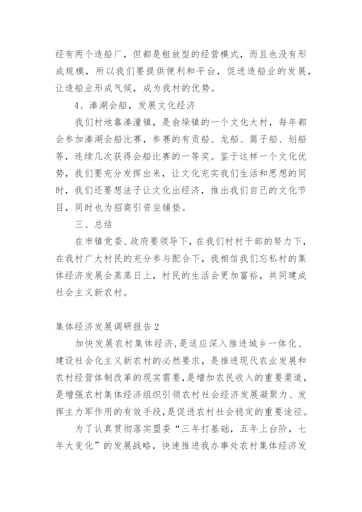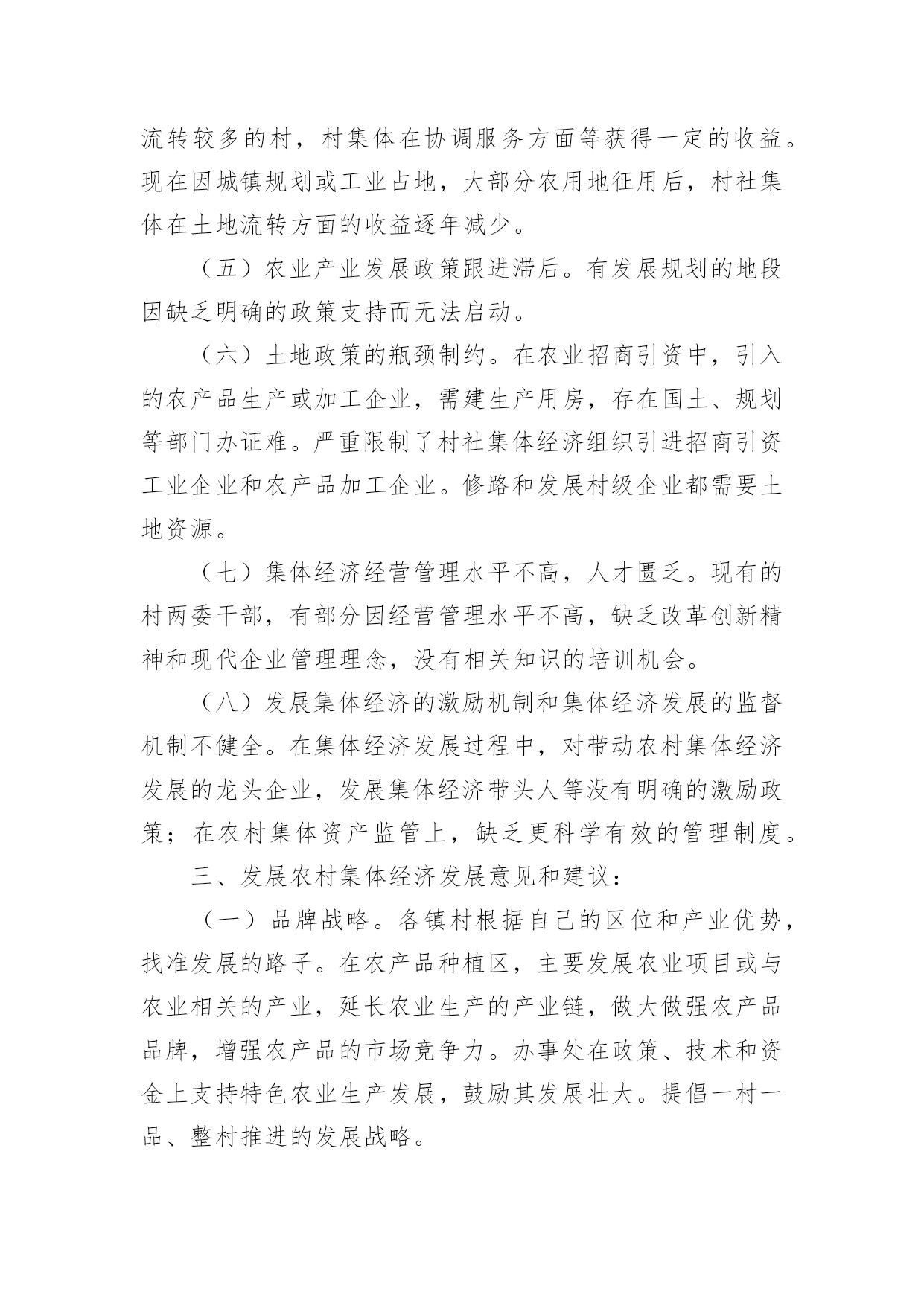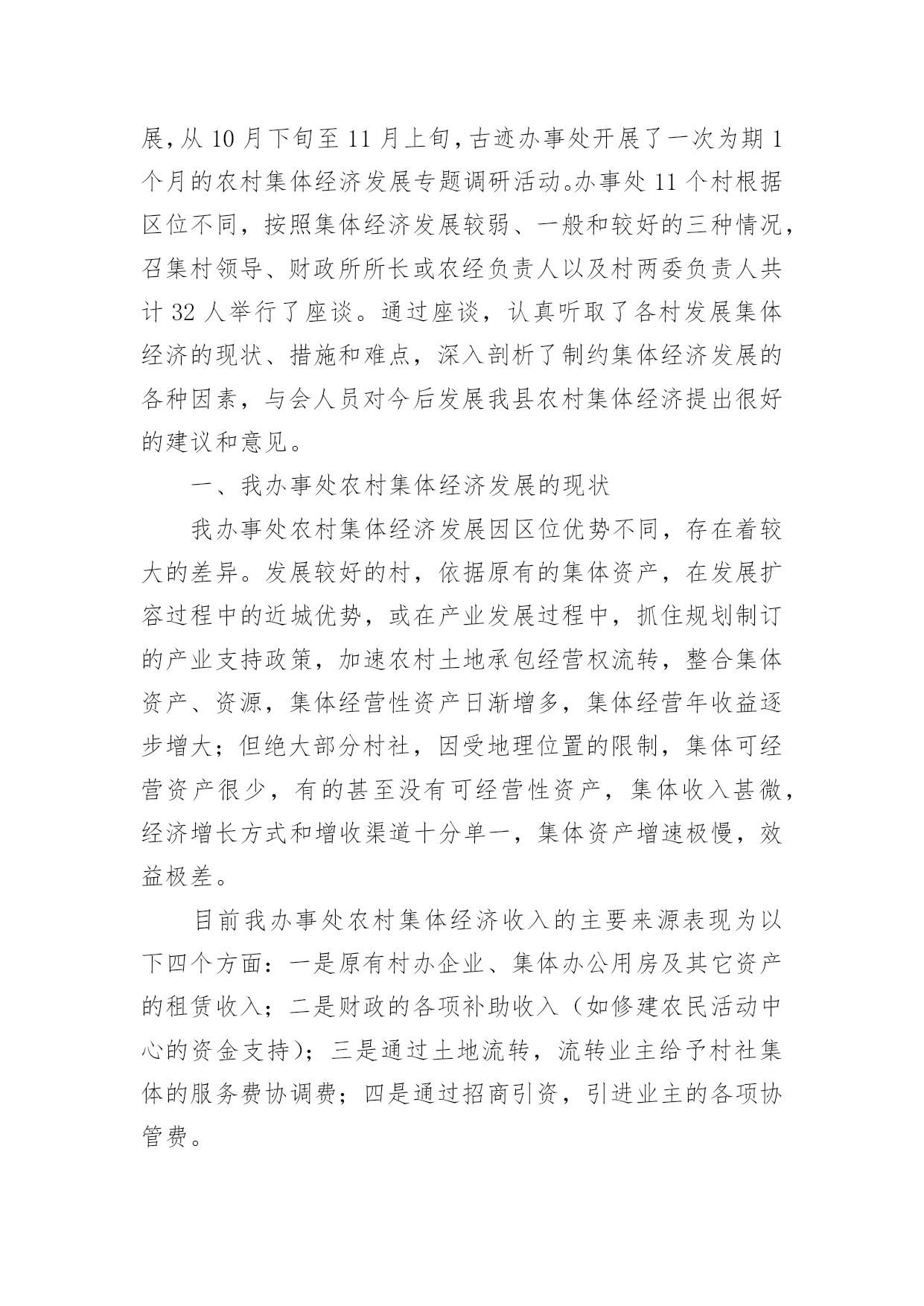 集体经济发展调研报告随着社会不断地进步,接触并使用报告的人越来越多,报告具有语言陈述性的特点。你所见过的报告是什么样的呢?以下是小编收集整理的集体经济发展调研报告,希望对大家有所帮助。集体经济发展调研报告1一、忘私村集体经济发展状况俞垛镇忘私村地处里下河地区,南与镇相邻,省级河道唐湾河穿村而过,水陆十分便利,全村共有17个村民小组,810户,总人口2118人,村地域面积3000亩,耕地面积2502亩,人均耕地1.18亩,20xx年村集体纯收入100万元,农民纯收入7000元。村里三分之二大部分村民主要通过种田和上班取得收入,部分村民承包农田种植稻麦和林木,还有部分村民从事畜禽养殖,另外还有少数的个体业经营户,主要从事机械加工、造船。二、发展壮大村级集体经济的对策与思考1、充分利用土地,让土地出金子农村经济要发展,农民要增收,离不开土体,土地出效益。如何让土地出金子?我有几点思考。第一,我们要强化科技服务,进一步提升农业科技含量。让农民增收,最直接的就是让农田增产,我们要利用本村与镇农机站结对挂钩这个优势,多派村干部到农机站学习新的农业知识,还可以请农机站的工作人员到我们村宣传和推广农业技术,并对我村村民进行培训,让农民科技种田。而且这方面我们也已经有了成果,譬如说我们村率先实行的麦套稻技术,已取得了成效,还有在粮作物的病虫害防治、全量还田方面我们也都取得了喜人的成就,帮助农民增加农田产量。以后我们要做的是继续和农机站保持对接,不断投入新的农业技术,继续走科技兴农的道路。第二,我们村地靠集镇,目前通往集镇的通北公路全长大概400米,而且这条公路宽广,交通便利,但是路两边仍是农田,还没有开发,而且我们村的村民坐落主要集中在庄中心,而且住房紧凑,大都是旧房,庄中心的道路狭小,不方面行车,只能由自行车和电动车行走,所以大都村民再造房时豆想搬往集镇,利用这一点,我们可以将通北公路两侧的农田开发,建住宅区,促进本村经济发展。2、充分利用优势,做好招商引资工作农村经济发展,光靠农业还不行,我们还要发展工业。我们村南与镇相邻,省级河道唐湾河穿村而过,水陆交通便利,我们要充分利用地理位置的优势来促进招商引资工作。目前我村已经完成了一个500万、一个300万的招商引资项目。在此基础上我们要进一步完善村里的基础设施建设,特别是水陆交通建设,充分发挥人际作用,促进招商引资工作的推展。3、充分发挥特色,让造船业形成气候俞垛镇是一个鱼米之乡,我们村从事船舶运输业的比较多,所以这也促进了我们村造船业的.发展,目前我们村已经有两个造船厂,但都是粗放型的经营模式,而且也没有形成规模,所以我们要提供便利和平台,促进造船业的发展,让造船业形成气候,成为我村的优势。4、溱湖会船,发展文化经济我们村地靠溱潼镇,是俞垛镇的一个文化大村,每年都会参加溱湖会船比赛,参赛的有贡船、龙船、篙子船、划船等,连续几次获得会船比赛的一等奖。鉴于这样一个文化优势,我们要充分发挥出来,让文化充实我们生活和思想的同时,我们还要想法子让文化出经济,推出我们自己的文化节目,同时也为招商引资坐铺垫。三、总结在市镇党委、政府要领导下,在我们村村干部的努力下,在我村广大村民的充分参与配合下,我相信我们忘私村的集体经济发展会蒸蒸日上,村民的生活会更加富裕,共同建成社会主义新农村。集体经济发展调研报告2加快发展农村集体经济,是适应深入推进城乡一体化、建设社会化主义新农村的必然要求,是推进现代农业发展和农村经营体制改革的现实需要,是增加农民收入的重要渠道,是增强农村集体经济组织引领农村社会经济发展凝聚力、发挥主力军作用的有效手段,是促进农村社会稳定的重要途径。为了认真贯彻落实盟委“三年打基础,五年上台阶,七年大变化”的发展战略,快速推进我办事处农村集体经济发展,从10月下旬至11月上旬,古迹办事处开展了一次为期1个月的农村集体经济发展专题调研活动。办事处11个村根据区位不同,按照集体经济发展较弱、一般和较好的三种情况,召集村领导、财政所所长或农经负责人以及村两委负责人共计32人举行了座谈。通过座谈,认真听取了各村发展集体经济的现状、措施和难点,深入剖析了制约集体经济发展的各种因素,与会人员对今后发展我县农村集体经济提出很好的建议和意见。一、我办事处农村集体经济发展的现状我办事处农村集体经济发展因区位优势不同,存在着较大的差异。发展较好的村,依据原有的集体资产,在发展扩容过程中的近城优势,或在产业发展过程中,抓住规划制订的产业支持政策,加速农村土地承包经营权流转,整合集体资产、资源,集体经营性资产日渐增多,集体经营年收益逐步增大;但绝大部分村社,因受地理位置的限制,集体可经营资产很少,有的甚至没有可经营性资产,集体收入甚微,经济增长方式和增收渠道十分单一,集体资产增速极慢,效益极差。目前我办事处农村集体