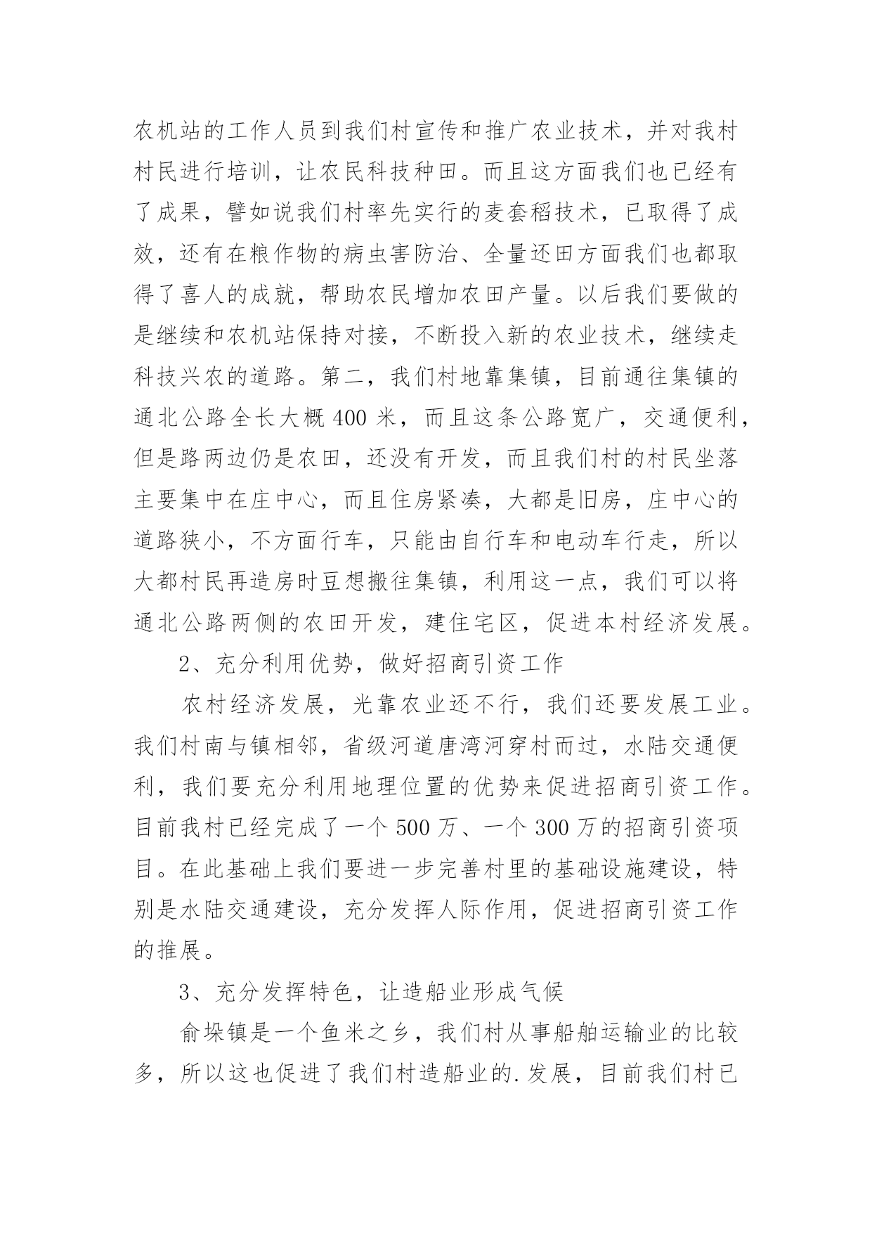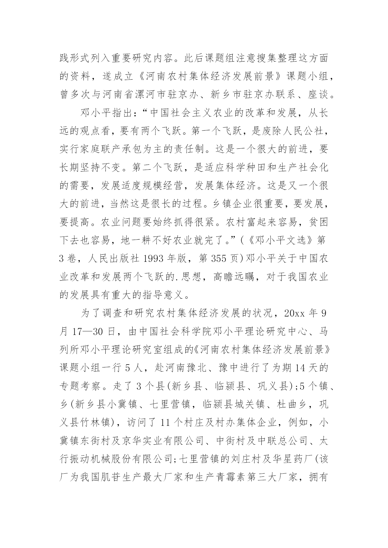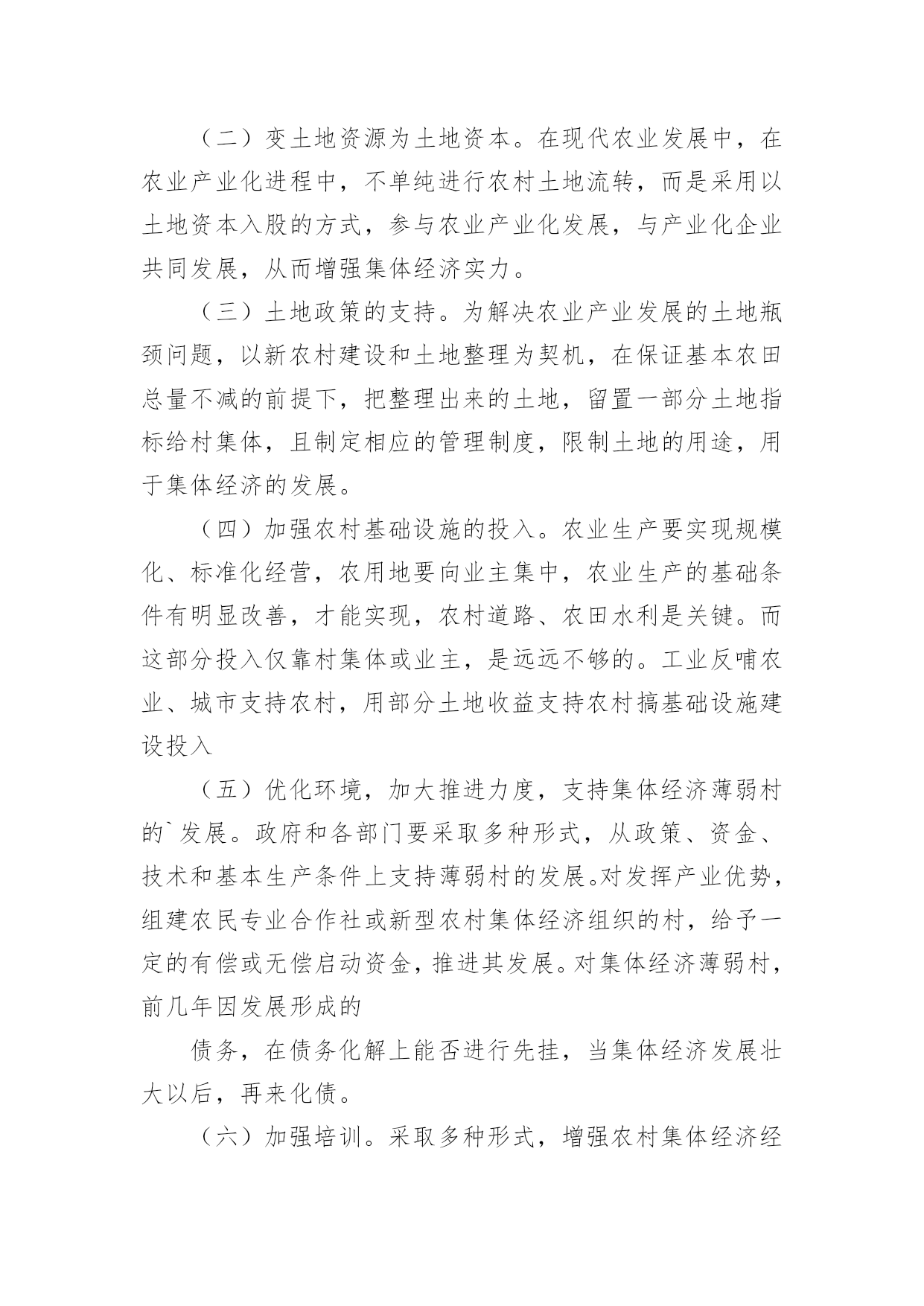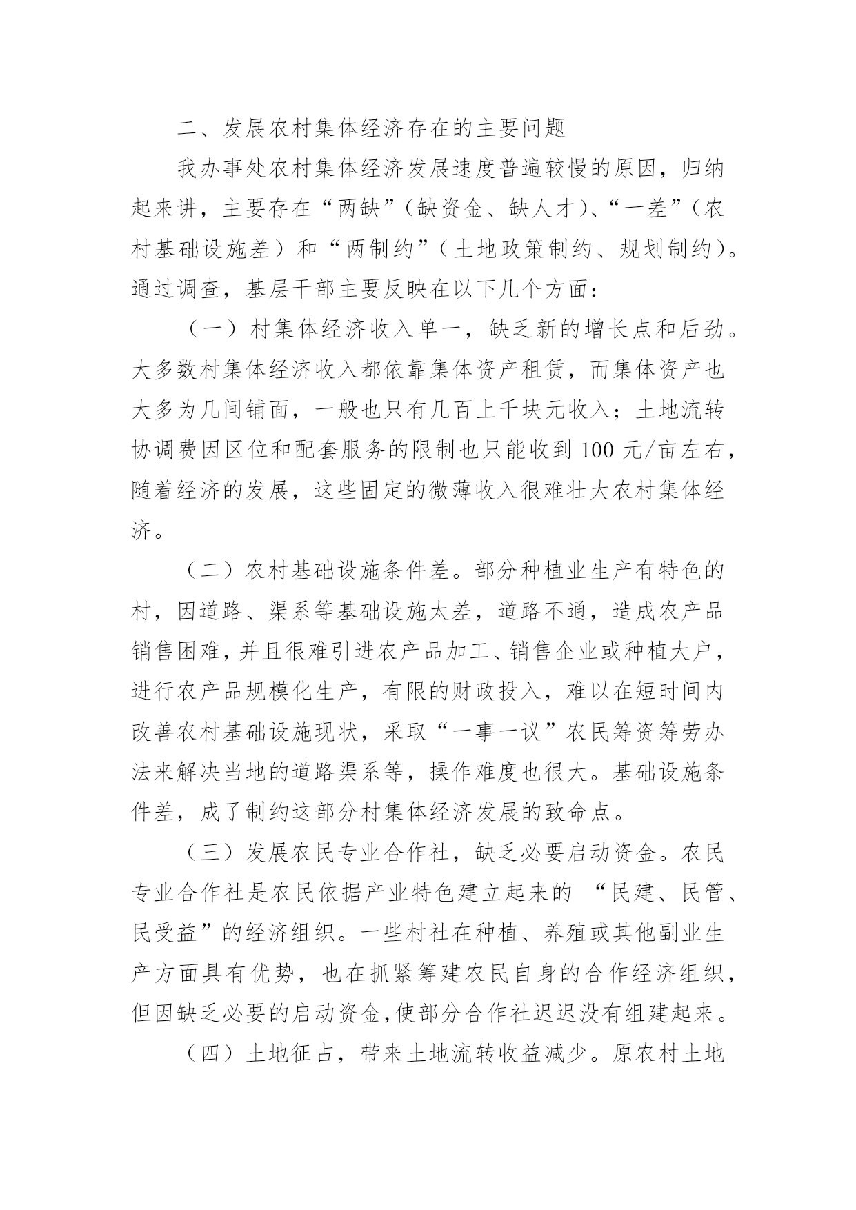 集体经济发展调研报告随着社会不断地进步,接触并使用报告的人越来越多,报告具有语言陈述性的特点。你所见过的报告是什么样的呢?以下是小编收集整理的集体经济发展调研报告,希望对大家有所帮助。集体经济发展调研报告1一、忘私村集体经济发展状况俞垛镇忘私村地处里下河地区,南与镇相邻,省级河道唐湾河穿村而过,水陆十分便利,全村共有17个村民小组,810户,总人口2118人,村地域面积3000亩,耕地面积2502亩,人均耕地1.18亩,20xx年村集体纯收入100万元,农民纯收入7000元。村里三分之二大部分村民主要通过种田和上班取得收入,部分村民承包农田种植稻麦和林木,还有部分村民从事畜禽养殖,另外还有少数的个体业经营户,主要从事机械加工、造船。二、发展壮大村级集体经济的对策与思考1、充分利用土地,让土地出金子农村经济要发展,农民要增收,离不开土体,土地出效益。如何让土地出金子?我有几点思考。第一,我们要强化科技服务,进一步提升农业科技含量。让农民增收,最直接的就是让农田增产,我们要利用本村与镇农机站结对挂钩这个优势,多派村干部到农机站学习新的农业知识,还可以请农机站的工作人员到我们村宣传和推广农业技术,并对我村村民进行培训,让农民科技种田。而且这方面我们也已经有了成果,譬如说我们村率先实行的麦套稻技术,已取得了成效,还有在粮作物的病虫害防治、全量还田方面我们也都取得了喜人的成就,帮助农民增加农田产量。以后我们要做的是继续和农机站保持对接,不断投入新的农业技术,继续走科技兴农的道路。第二,我们村地靠集镇,目前通往集镇的通北公路全长大概400米,而且这条公路宽广,交通便利,但是路两边仍是农田,还没有开发,而且我们村的村民坐落主要集中在庄中心,而且住房紧凑,大都是旧房,庄中心的道路狭小,不方面行车,只能由自行车和电动车行走,所以大都村民再造房时豆想搬往集镇,利用这一点,我们可以将通北公路两侧的农田开发,建住宅区,促进本村经济发展。2、充分利用优势,做好招商引资工作农村经济发展,光靠农业还不行,我们还要发展工业。我们村南与镇相邻,省级河道唐湾河穿村而过,水陆交通便利,我们要充分利用地理位置的优势来促进招商引资工作。目前我村已经完成了一个500万、一个300万的招商引资项目。在此基础上我们要进一步完善村里的基础设施建设,特别是水陆交通建设,充分发挥人际作用,促进招商引资工作的推展。3、充分发挥特色,让造船业形成气候俞垛镇是一个鱼米之乡,我们村从事船舶运输业的比较多,所以这也促进了我们村造船业的.发展,目前我们村已经有两个造船厂,但都是粗放型的经营模式,而且也没有形成规模,所以我们要提供便利和平台,促进造船业的发展,让造船业形成气候,成为我村的优势。4、溱湖会船,发展文化经济我们村地靠溱潼镇,是俞垛镇的一个文化大村,每年都会参加溱湖会船比赛,参赛的有贡船、龙船、篙子船、划船等,连续几次获得会船比赛的一等奖。鉴于这样一个文化优势,我们要充分发挥出来,让文化充实我们生活和思想的同时,我们还要想法子让文化出经济,推出我们自己的文化节目,同时也为招商引资坐铺垫。三、总结在市镇党委、政府要领导下,在我们村村干部的努力下,在我村广大村民的充分参与配合下,我相信我们忘私村的集体经济发展会蒸蒸日上,村民的生活会更加富裕,共同建成社会主义新农村。集体经济发展调研报告2加快发展农村集体经济,是适应深入推进城乡一体化、建设社会化主义新农村的必然要求,是推进现代农业发展和农村经营体制改革的现实需要,是增加农民收入的重要渠道,是增强农村集体经济组织引领农村社会经济发展凝聚力、发挥主力军作用的有效手段,是促进农村社会稳定的重要途径。为了认真贯彻落实盟委“三年打基础,五年上台阶,七年大变化”的发展战略,快速推进我办事处农村集体经济发展,从10月下旬至11月上旬,古迹办事处开展了一次为期1个月的农村集体经济发展专题调研活动。办事处11个村根据区位不同,按照集体经济发展较弱、一般和较好的三种情况,召集村领导、财政所所长或农经负责人以及村两委负责人共计32人举行了座谈。通过座谈,认真听取了各村发展集体经济的现状、措施和难点,深入剖析了制约集体经济发展的各种因素,与会人员对今后发展我县农村集体经济提出很好的建议和意见。一、我办事处农村集体经济发展的现状我办事处农村集体经济发展因区位优势不同,存在着较大的差异。发展较好的村,依据原有的集体资产,在发展扩容过程中的近城优势,或在产业发展过程中,抓住规划制订的产业支持政策,加速农村土地承包经营权流转,整合集体资产、资源,集体经营性资产日渐增多,集体经营年收益逐步增大;但绝大部分村社,因受地理位置的限制,集体可经营资产很少,有的甚至没有可经营性资产,集体收入甚微,经济增长方式和增收渠道十分单一,集体资产增速极慢,效益极差。目前我办事处农村集体