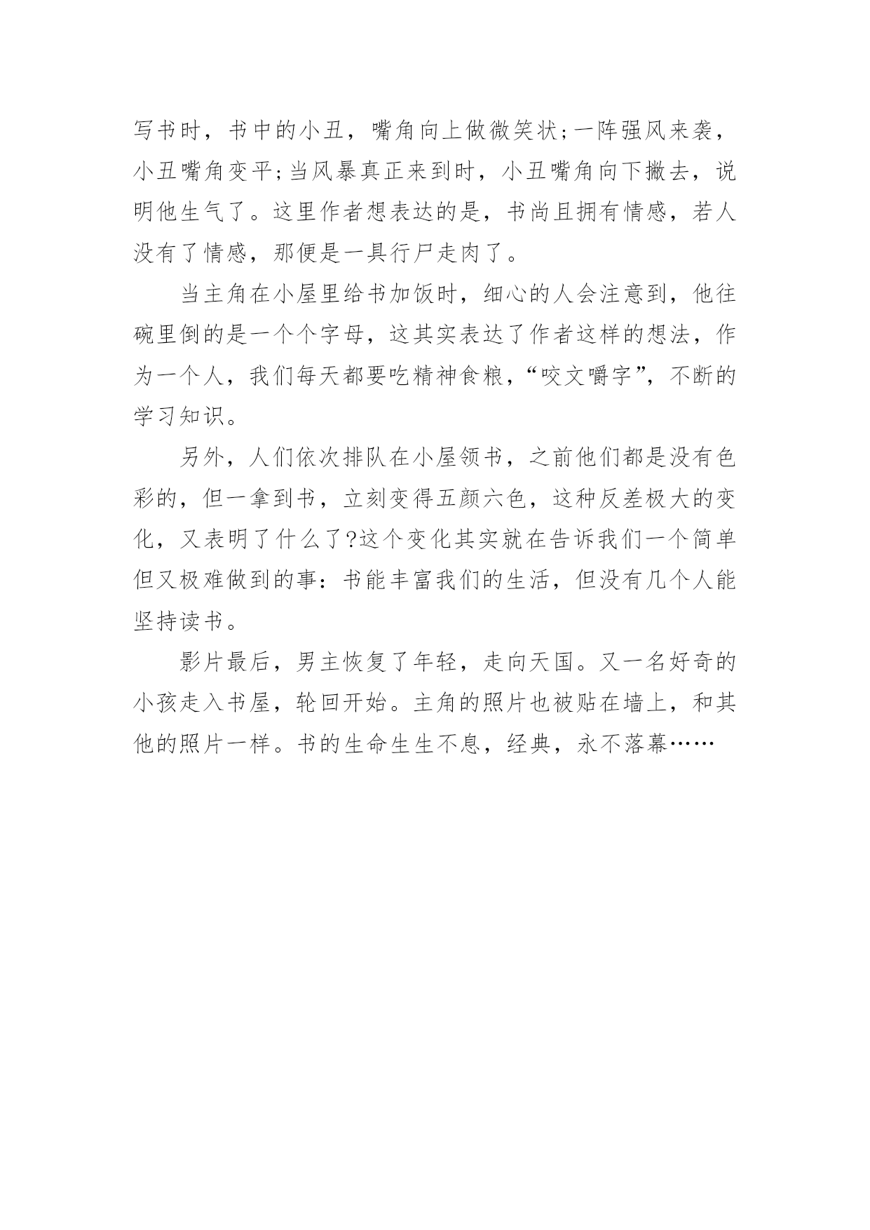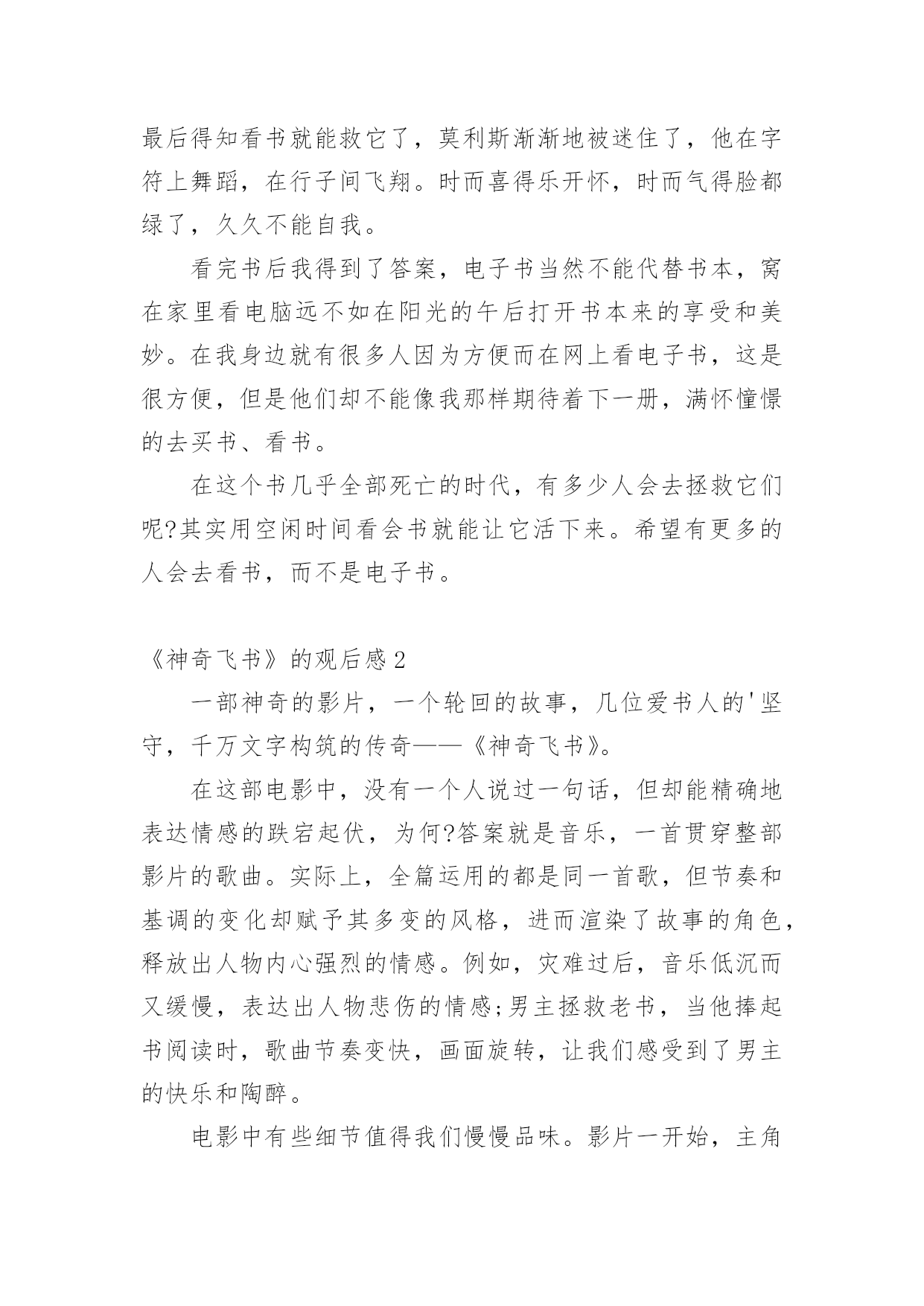 《神奇飞书》的观后感认真品味一部作品后,你有什么总结呢?让我们好好写份观后感,把你的收获感想写下来吧。现在你是否对观后感一筹莫展呢?以下是小编为大家整理的《神奇飞书》的观后感,仅供参考,欢迎大家阅读。《神奇飞书》的观后感1生活在这个高科技的时代里,电子产品渐渐代替大部分事,比方说写信,变成了qq,写论文、作业、小报变成了直接在电脑打字,其中影响最大的还是看书,有些家庭甚至把看电子书当作看书,书本被时代的进步而落下了。可是电子书真的能替代书本吗?带着这个疑问,我观看了短片《神奇飞书》。故事的开头是一个名叫莫利斯的主角被一场突如其来的暴风刮到了一个没有文字、没有色彩的黑白世界。这时,一位牵着会飞的书的漂亮女士走了过来,一本停在她肩上的书飞了过来,把他引到了一个图书馆,他变的有色彩了,之后他就生活在这个图书馆里,把书借给别人,让这个黑白的世界富有色彩了,他自己也写了一本书——他的自传。最后年老的他把书带回了原来的世界,而他的自传则到了一个小女孩手中,小女孩也成了图书馆的下一代传人。其中,最令我印象深刻的是莫利斯救书的片段,一本书快死了,莫利斯用了呼吸器、心跳显示仪,可是都无济于事,最后得知看书就能救它了,莫利斯渐渐地被迷住了,他在字符上舞蹈,在行子间飞翔。时而喜得乐开怀,时而气得脸都绿了,久久不能自我。看完书后我得到了答案,电子书当然不能代替书本,窝在家里看电脑远不如在阳光的午后打开书本来的享受和美妙。在我身边就有很多人因为方便而在网上看电子书,这是很方便,但是他们却不能像我那样期待着下一册,满怀憧憬的去买书、看书。在这个书几乎全部死亡的时代,有多少人会去拯救它们呢?其实用空闲时间看会书就能让它活下来。希望有更多的人会去看书,而不是电子书。《神奇飞书》的观后感2一部神奇的影片,一个轮回的故事,几位爱书人的'坚守,千万文字构筑的传奇——《神奇飞书》。在这部电影中,没有一个人说过一句话,但却能精确地表达情感的跌宕起伏,为何?答案就是音乐,一首贯穿整部影片的歌曲。实际上,全篇运用的都是同一首歌,但节奏和基调的变化却赋予其多变的风格,进而渲染了故事的角色,释放出人物内心强烈的情感。例如,灾难过后,音乐低沉而又缓慢,表达出人物悲伤的情感;男主拯救老书,当他捧起书阅读时,歌曲节奏变快,画面旋转,让我们感受到了男主的快乐和陶醉。电影中有些细节值得我们慢慢品味。影片一开始,主角写书时,书中的小丑,嘴角向上做微笑状;一阵强风来袭,小丑嘴角变平;当风暴真正来到时,小丑嘴角向下撇去,说明他生气了。这里作者想表达的是,书尚且拥有情感,若人没有了情感,那便是一具行尸走肉了。当主角在小屋里给书加饭时,细心的人会注意到,他往碗里倒的是一个个字母,这其实表达了作者这样的想法,作为一个人,我们每天都要吃精神食粮,“咬文嚼字”,不断的学习知识。另外,人们依次排队在小屋领书,之前他们都是没有色彩的,但一拿到书,立刻变得五颜六色,这种反差极大的变化,又表明了什么了?这个变化其实就在告诉我们一个简单但又极难做到的事:书能丰富我们的生活,但没有几个人能坚持读书。影片最后,男主恢复了年轻,走向天国。又一名好奇的小孩走入书屋,轮回开始。主角的照片也被贴在墙上,和其他的照片一样。书的生命生生不息,经典,永不落幕……