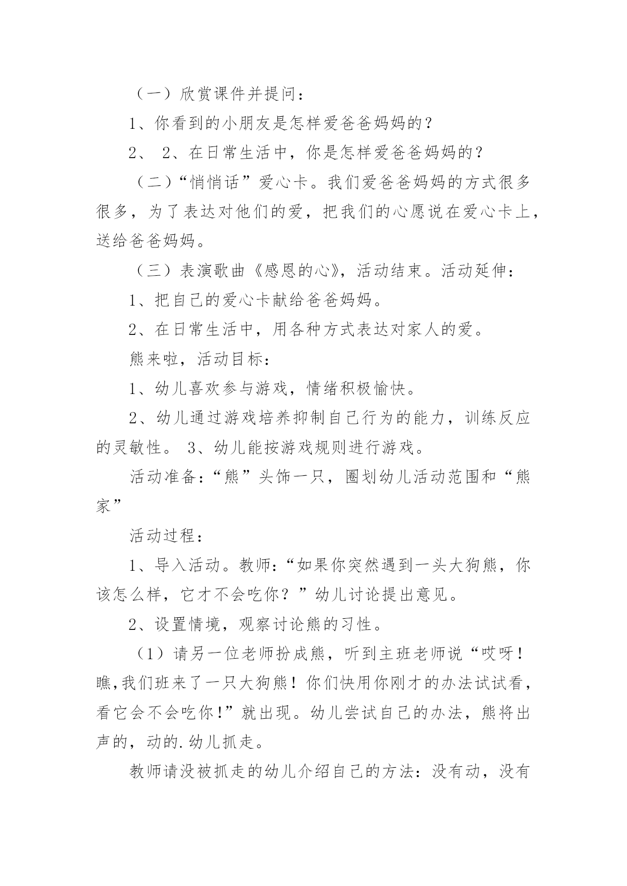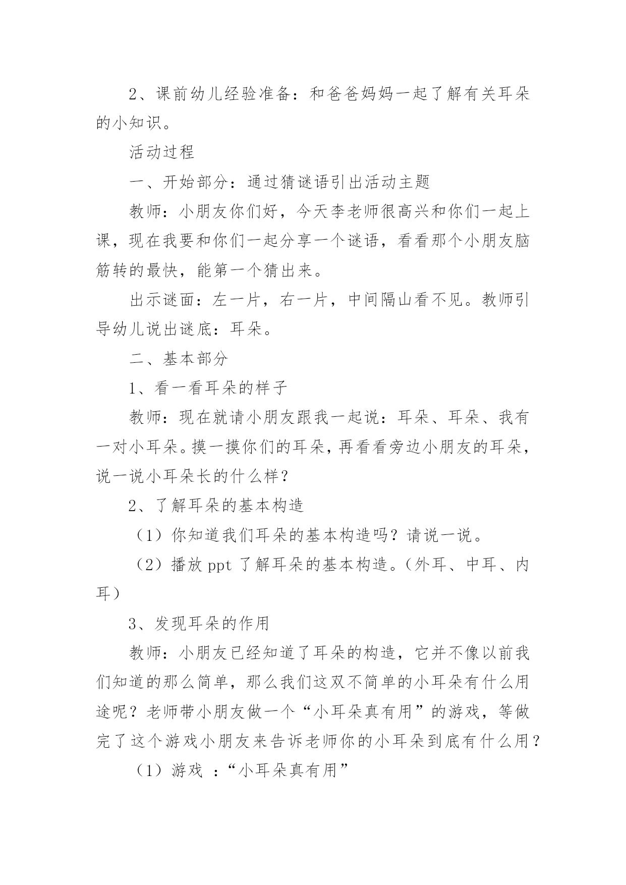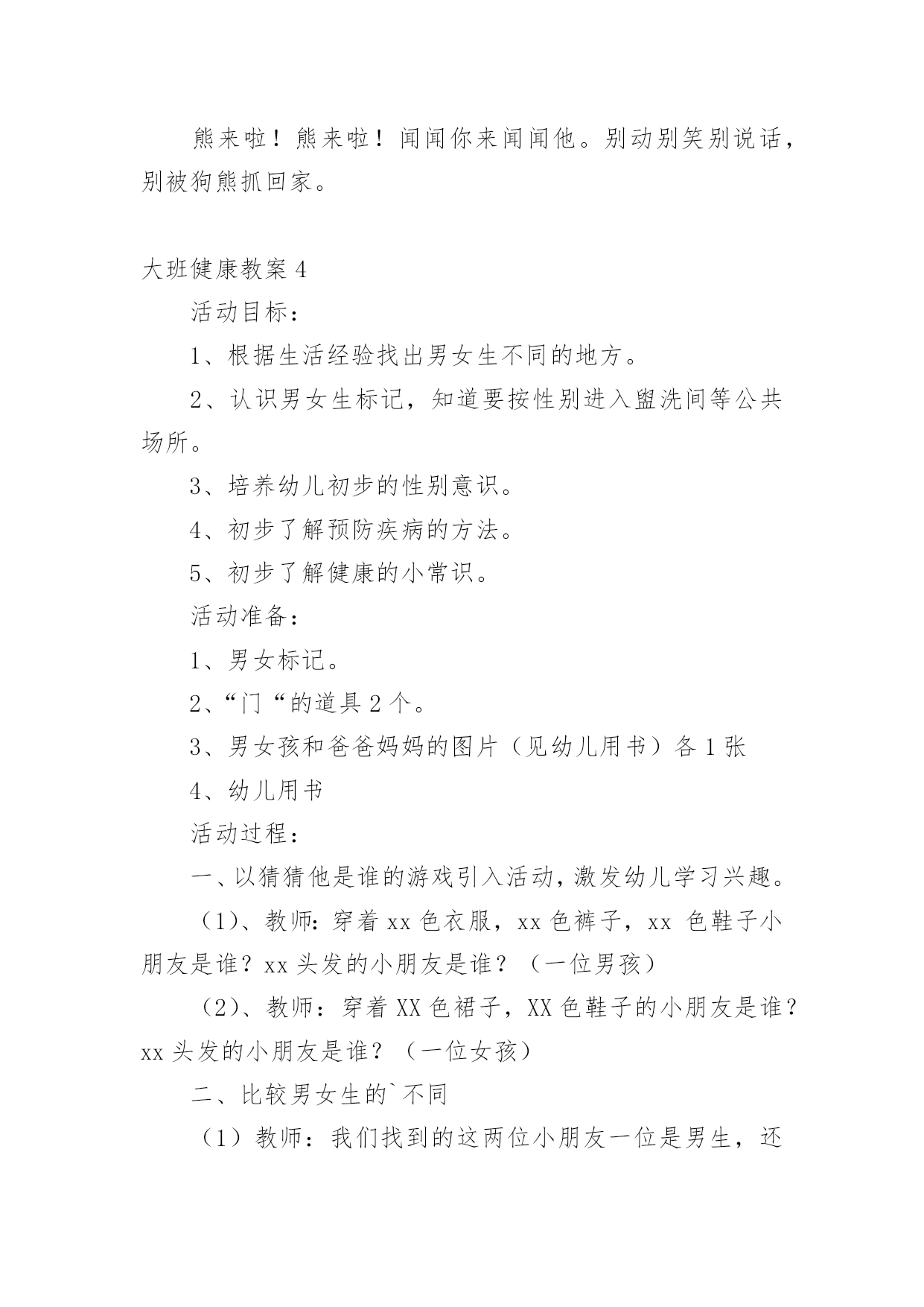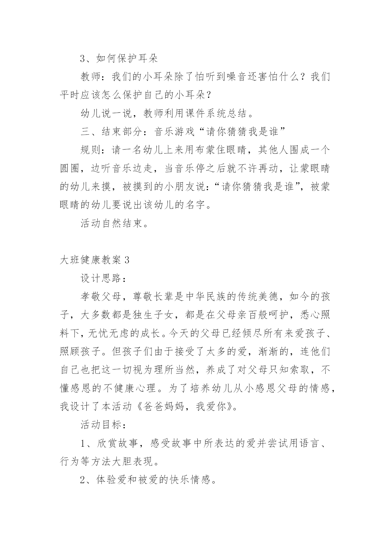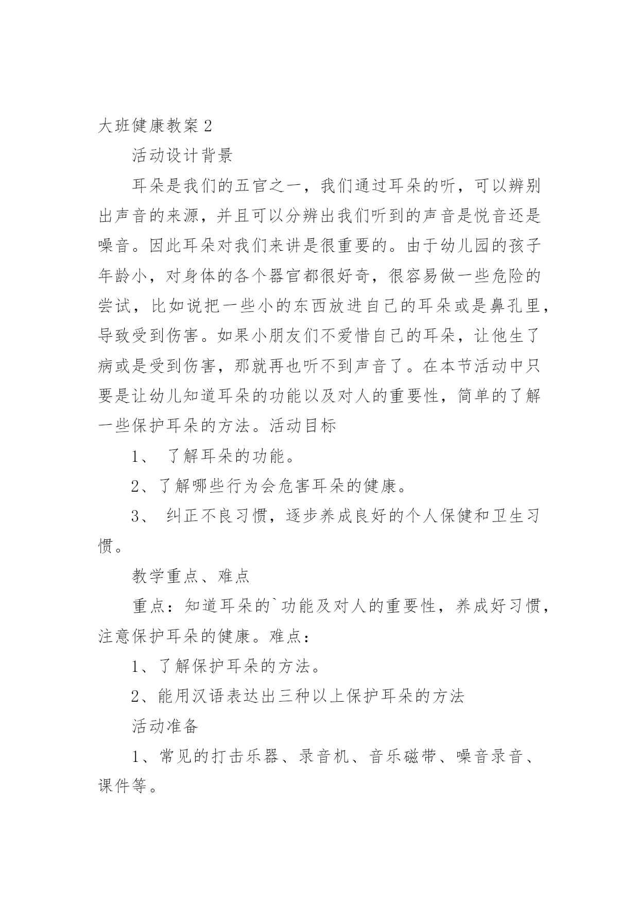 大班健康教案大班健康教案集锦(15篇)作为一位杰出的老师,就不得不需要编写教案,教案是教学活动的总的组织纲领和行动方案。那么优秀的教案是什么样的呢?下面是小编为大家收集的大班健康教案,仅供参考,大家一起来看看吧。大班健康教案1一、活动目标:1、利用纸棒进行活动,学习跳竹竿游戏,发展弹跳能力。2、体验与同伴合作游戏带来的快乐。3、愿意积极想办法解决活动中遇到的困难。二、活动准备:幼儿观看过录像,人手一根纸棒(长度为1米)。录音机,磁带。三、活动过程:1、开始部分:幼儿随音乐利用纸棒进行队列练习。师:今天天气真不错,我们骑着马出去玩玩吧!(幼儿随音乐的变化“骑马”变双圆————大圆————小圆————“坐马车”)2、基本部分:(1)利用纸棒进行“一棒多玩”师:纸棒可以和我们玩坐马车的游戏,还可以和我们玩什么游戏呢?我们一起来试试,可以自己玩,也可以和小伙伴一起玩。(幼儿四散游戏)队形:两路纵队(2)学习“跳竹竿”游戏A、讲解游戏玩法师:刚才小朋友用纸棒玩了许多游戏,今天老师要和大家用纸棒玩一个新游戏——跳竹竿,这个游戏可以三个或四个小朋友一起玩,其中两个小朋友手拿竹竿面对面跪下,用竹竿同时分合敲击,另一个小朋友在中间看准竹竿的分合跳进或跳出。大家可以自己选择小伙伴一起试一试。队形:梯形队(3)幼儿自由组合尝试玩“跳竹竿”游戏队形:四散(4)对幼儿在游戏过程中出现的'情况及时进行指导(合作、交往方面)师:你刚才和谁一起玩的?你们是怎么跳竹竿的?队形:梯形队(5)鼓励幼儿创造性地玩“跳竹竿”游戏,师生共同参与。师:刚才小朋友在跳竹竿时想到了许多不同的跳法,真有趣!老师也想和你们一起跳竹竿,行吗?队形:四散、游戏“叫号接棒”队形:四散反思:结束活动中通过“叫号接棒”的游戏帮助幼儿调整教大的活动量。大班健康教案2活动设计背景耳朵是我们的五官之一,我们通过耳朵的听,可以辨别出声音的来源,并且可以分辨出我们听到的声音是悦音还是噪音。因此耳朵对我们来讲是很重要的。由于幼儿园的孩子年龄小,对身体的各个器官都很好奇,很容易做一些危险的尝试,比如说把一些小的东西放进自己的耳朵或是鼻孔里,导致受到伤害。如果小朋友们不爱惜自己的耳朵,让他生了病或是受到伤害,那就再也听不到声音了。在本节活动中只要是让幼儿知道耳朵的功能以及对人的重要性,简单的了解一些保护耳朵的方法。活动目标1、了解耳朵的功能。2、了解哪些行为会危害耳朵的健康。3、纠正不良习惯,逐步养成良好的个人保健和卫生习惯。教学重点、难点重点:知道耳朵的`功能及对人的重要性,养成好习惯,注意保护耳朵的健康。难点:1、了解保护耳朵的方法。2、能用汉语表达出三种以上保护耳朵的方法活动准备1、常见的打击乐器、录音机、音乐磁带、噪音录音、课件等。2、课前幼儿经验准备:和爸爸妈妈一起了解有关耳朵的小知识。活动过程一、开始部分:通过猜谜语引出活动主题教师:小朋友你们好,今天李老师很高兴和你们一起上课,现在我要和你们一起分享一个谜语,看看那个小朋友脑筋转的最快,能第一个猜出来。出示谜面:左一片,右一片,中间隔山看不见。教师引导幼儿说出谜底:耳朵。二、基本部分1、看一看耳朵的样子教师:现在就请小朋友跟我一起说:耳朵、耳朵、我有一对小耳朵。摸一摸你们的耳朵,再看看旁边小朋友的耳朵,说一说小耳朵长的什么样?2、了解耳朵的基本构造(1)你知道我们耳朵的基本构造吗?请说一说。(2)播放ppt了解耳朵的基本构造。(外耳、中耳、内耳)3、发现耳朵的作用教师:小朋友已经知道了耳朵的构造,它并不像以前我们知道的那么简单,那么我们这双不简单的小耳朵有什么用途呢?老师带小朋友做一个“小耳朵真有用”的游戏,等做完了这个游戏小朋友来告诉老师你的小耳朵到底有什么用?(1)游戏:“小耳朵真有用”教师:现在请小朋友把眼睛闭上,看你们能不能猜出来老师在干什么了?教师将准备好的录音机、打击乐器、噪音,使它们发出声音,让幼儿说一说都听到什么声音,初步了解耳朵的用处。教师:·请小朋友把眼睛闭上用手把耳朵捂住,看你们能不能猜出来老师在干什么?·咦,奇怪,你们不是把眼睛都闭上了吗,怎么知道的?(听声)·继续把闭眼睛,你能说出这是什么发出的声音吗?·哇,你们又知道了,你是怎么知道的?(辨声)(2)教师小结:我们的耳朵可以帮助我们听见各种不同的声音,还可以辨别各种不同的声音(耳朵的两大基本作用)。有了小耳朵我们可以听到很多很多的声音。那小朋友想想我们的耳朵喜欢听到什么样的声音?(小朋友自由回答)(3)出示《小耳朵》儿歌,一起说儿歌小耳朵两只小耳朵,最爱听什么。小鸟来唱歌,美妙音乐多。两只小耳朵,最怕听什么?燥音若太多,掩耳躲一躲。教师:小耳朵最爱听什么声音?你的耳朵最爱听什么声音?小耳朵最怕听什么声音?3、如何保护耳朵教师:我们的小耳朵除了怕听到噪音还害怕什么