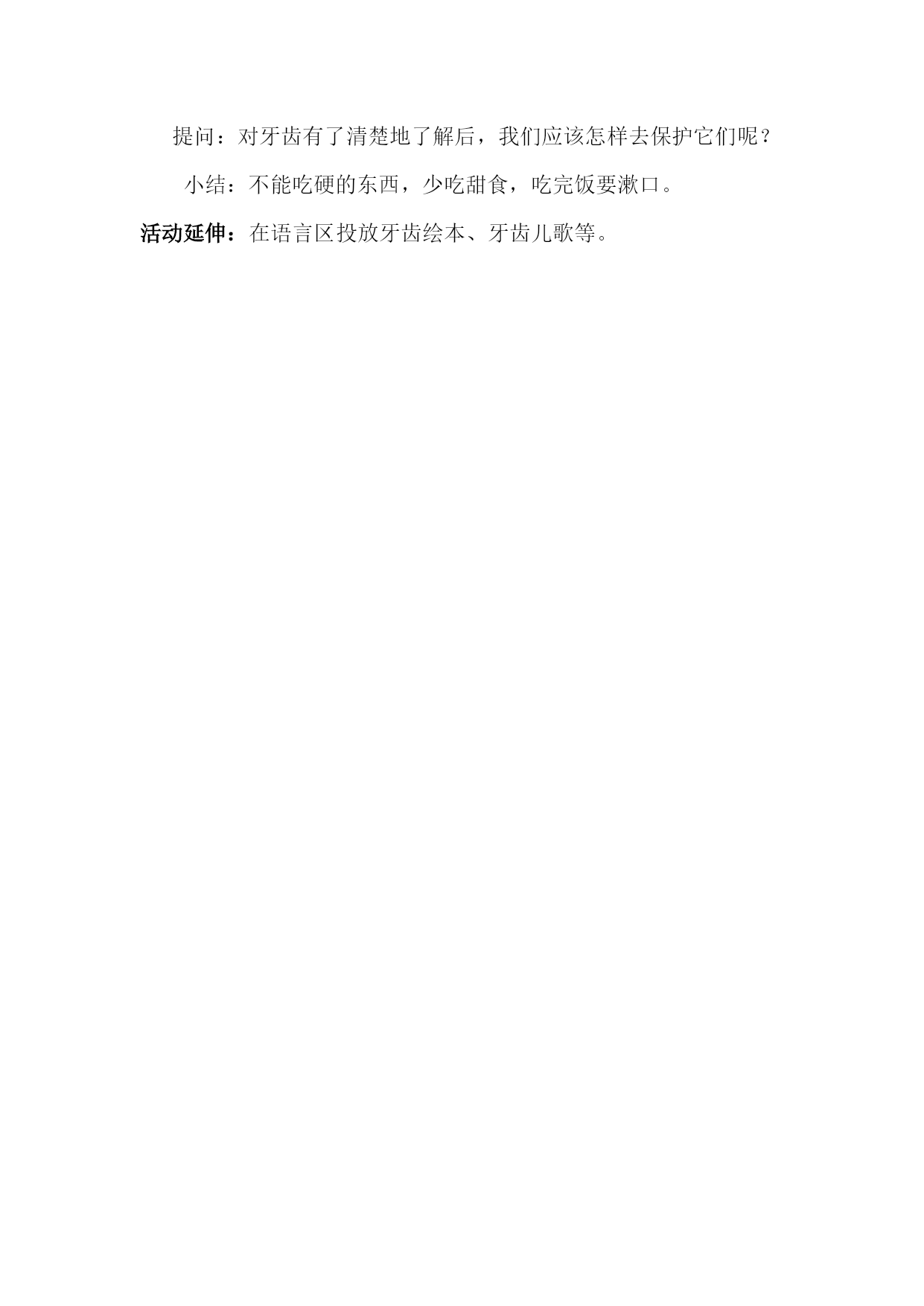 健康活动:保护牙齿活动目标:1.了解牙齿的重要性,知道牙齿的功能。2.初步知道保护牙齿的方法,掌握正确刷牙的方法。3.养成坚持每天刷牙的好习惯。活动准备:物质准备:ppt活动指导:1.换牙故事导入,激发幼儿讨论兴趣。引导语:小朋友长大了,开始掉牙齿了,每个人掉牙齿的经历都不一样,有的是自己掉的,有的是吃东西的时候掉的,有的是拔下来;有人很担心、害怕,有人很勇敢,每一次经历都是成长的标志。小朋友们对牙齿的秘密了解多少呢?2.展示图片,认识牙齿(1)播放图片,鼓励幼儿观察发现牙齿的不同。小结:我们的牙齿按功能还可以分成门牙、尖牙和臼齿。门牙主要来断食物,尖牙主要来撕碎食物,臼齿主要来磨碎食物,不管分工如何,牙齿的作用就是嚼碎食物,便于吸收营养。3.播放视频,认识牙齿生长顺序4.设置情景,讨论为什么会蛀牙5.护牙大作战提问:对牙齿有了清楚地了解后,我们应该怎样去保护它们呢?小结:不能吃硬的东西,少吃甜食,吃完饭要漱口。活动延伸:在语言区投放牙齿绘本、牙齿儿歌等。