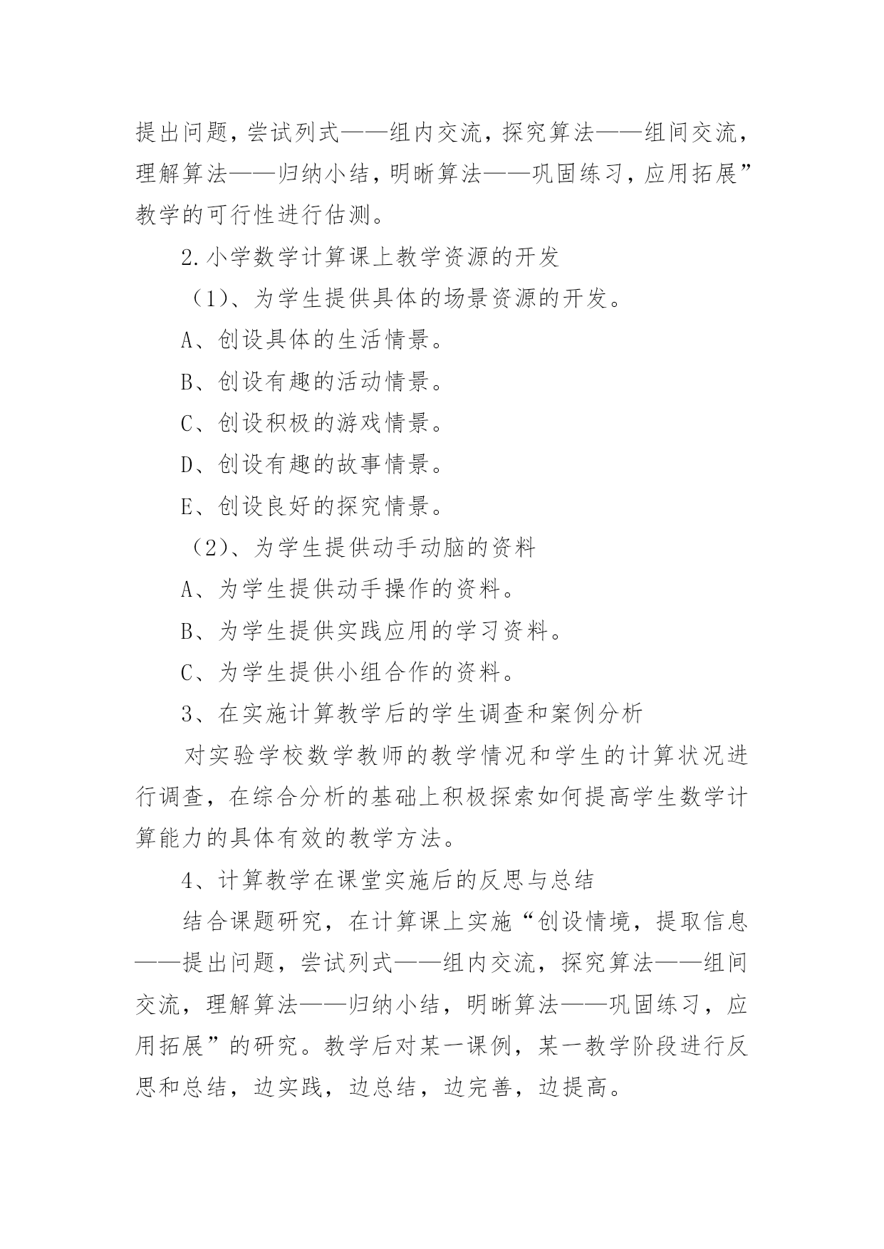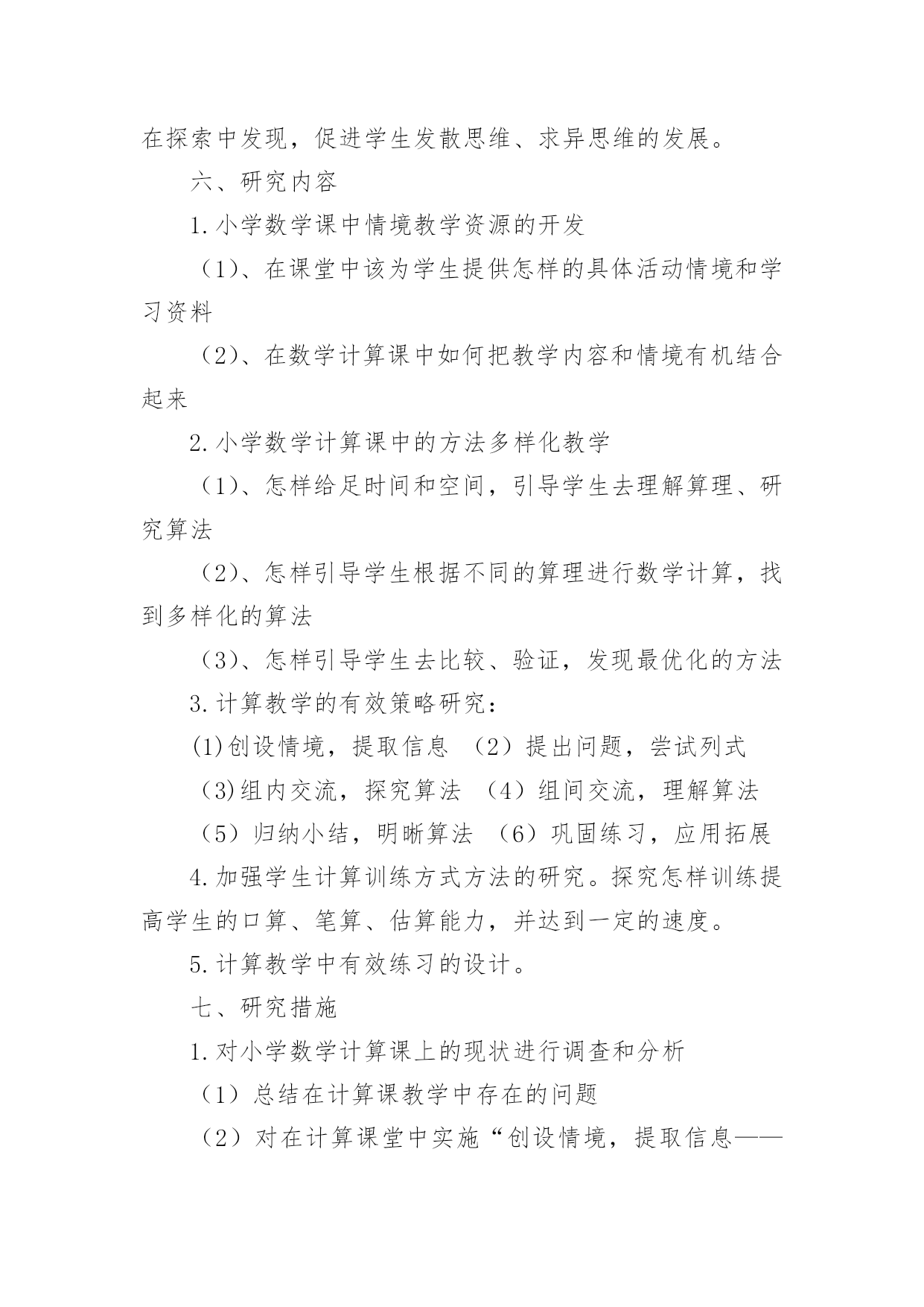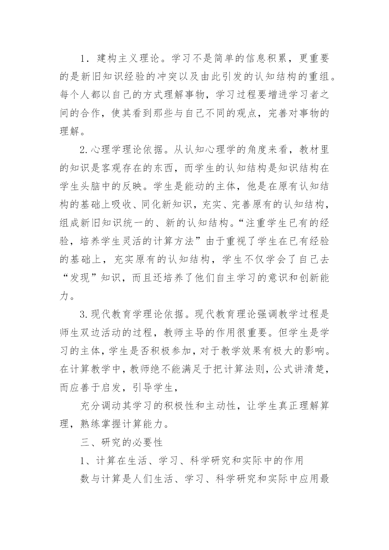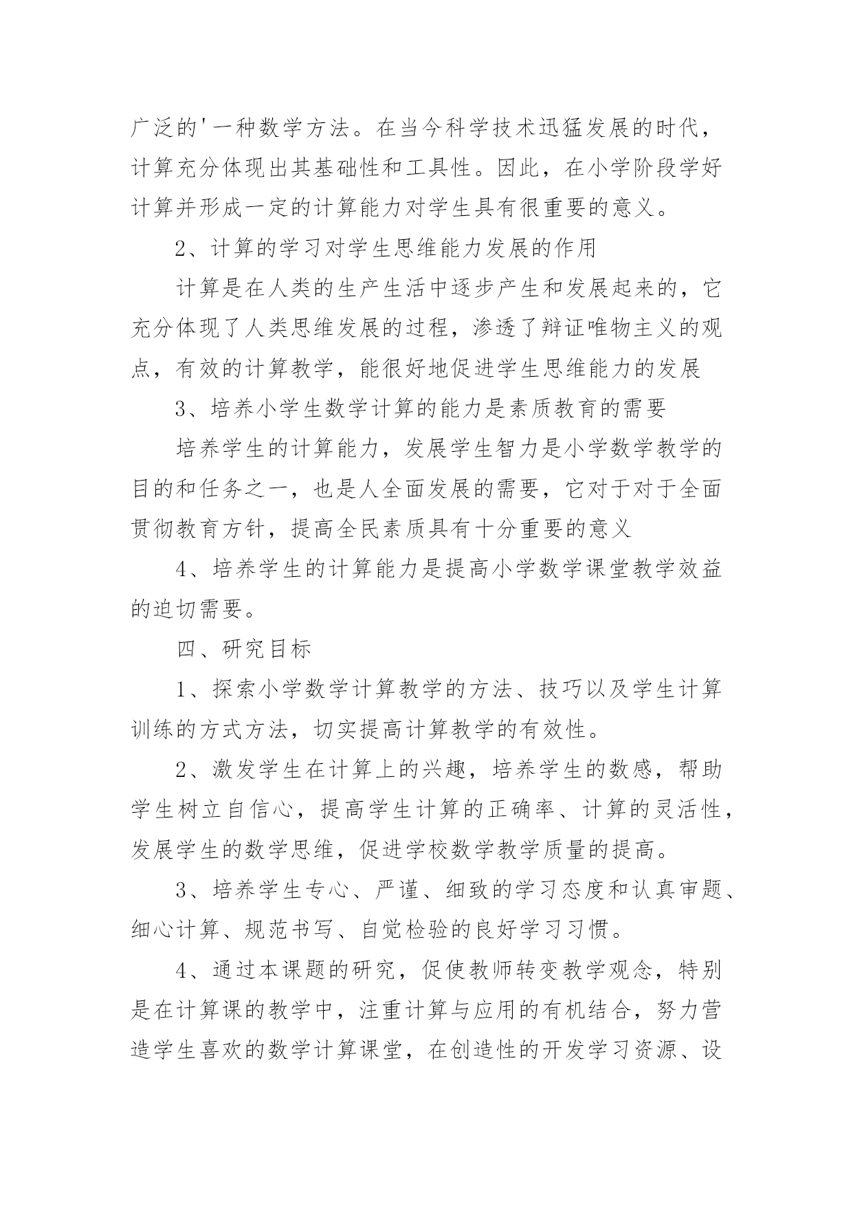 课题研究工作报告课题研究工作报告在我们平凡的日常里,越来越多人会去使用报告,报告具有语言陈述性的特点。我们应当如何写报告呢?以下是小编为大家整理的课题研究工作报告,仅供参考,欢迎大家阅读。课题研究工作报告1一、课题提出的背景和意义计算是小学数学教学的基本内容,它在小学数学教材中所占的比重很大。培养小学生的计算能力一直是小学数学教学的主要目的之一。《数学课程标准》明确提出:在“数与代数”的教学中,应帮助学生建立数感和符号意识,发展运算能力和推理能力,初步形成模型思想。运算能力主要是指能够根据法则和运算律正确地进行运算的能力。因此,在小学数学教学中,培养学生准确、迅速、灵活的计算能力是小学数学教学的一项重要任务,也是提高教学质量的基石。而良好的计算能力更是学生今后生活、学习和参加社会活动所必备的基本素养之一,所以培养学生的计算能力是小学数学课堂教学的一项重要任务,也将为学生今后更好地学习数学奠定扎实的基础。二、研究的理论1.建构主义理论。学习不是简单的信息积累,更重要的是新旧知识经验的冲突以及由此引发的认知结构的重组。每个人都以自己的方式理解事物,学习过程要增进学习者之间的合作,使其看到那些与自己不同的观点,完善对事物的理解。2.心理学理论依据。从认知心理学的角度来看,教材里的知识是客观存在的东西,而学生的认知结构是知识结构在学生头脑中的反映。学生是能动的主体,他是在原有认知结构的基础上吸收、同化新知识,充实、完善原有的认知结构,组成新旧知识统一的、新的认知结构。“注重学生已有的经验,培养学生灵活的计算方法”由于重视了学生在已有经验的基础上,充实原有的认知结构,学生不仅学会了自己去“发现”知识,而且还培养了他们自主学习的意识和创新能力。3.现代教育学理论依据。现代教育理论强调教学过程是师生双边活动的过程,教师主导的作用很重要。但学生是学习的主体,学生是否积极参加,对于教学效果有极大的影响。在计算教学中,教师绝不能满足于把计算法则,公式讲清楚,而应善于启发,引导学生,充分调动其学习的积极性和主动性,让学生真正理解算理,熟练掌握计算能力。三、研究的必要性1、计算在生活、学习、科学研究和实际中的作用数与计算是人们生活、学习、科学研究和实际中应用最广泛的'一种数学方法。在当今科学技术迅猛发展的时代,计算充分体现出其基础性和工具性。因此,在小学阶段学好计算并形成一定的计算能力对学生具有很重要的意义。2、计算的学习对学生思维能力发展的作用计算是在人类的生产生活中逐步产生和发展起来的,它充分体现了人类思维发展的过程,渗透了辩证唯物主义的观点,有效的计算教学,能很好地促进学生思维能力的发展3、培养小学生数学计算的能力是素质教育的需要培养学生的计算能力,发展学生智力是小学数学教学的目的和任务之一,也是人全面发展的需要,它对于对于全面贯彻教育方针,提高全民素质具有十分重要的意义4、培养学生的计算能力是提高小学数学课堂教学效益的迫切需要。四、研究目标1、探索小学数学计算教学的方法、技巧以及学生计算训练的方式方法,切实提高计算教学的有效性。2、激发学生在计算上的兴趣,培养学生的数感,帮助学生树立自信心,提高学生计算的正确率、计算的灵活性,发展学生的数学思维,促进学校数学教学质量的提高。3、培养学生专心、严谨、细致的学习态度和认真审题、细心计算、规范书写、自觉检验的良好学习习惯。4、通过本课题的研究,促使教师转变教学观念,特别是在计算课的教学中,注重计算与应用的有机结合,努力营造学生喜欢的数学计算课堂,在创造性的开发学习资源、设计情境及探究的过程中,实现教师专业的自我成长。五、研究原则1、主体性原则:本课题研究的目标是探索一种比较有效的计算教学方法。小学数学计算教学有效性的研究要从学生的数学学习出发,从小学生的实际出发,将教学目标、教学方法、教学手段调适契合,真正做到“一切为了学生”。2、开放性原则:开放教学空间、开放教学过程、开放教学内容,努力形成“大数学”、“大课堂”的格局。把学生学习的视野、活动的空间引向广阔的大千世界和社会生活,引导学生在丰富多彩的生活实践中获取知识、发展能力、提升境界。3、发展性原则:在进行课题研究的过程中,研究者要充分调动学生参与的积极性,用发展的战略眼光对待课题研究,注重学生数学活动中的理解、体验、表达、实践、评价等,让其真正成为学习的主人,不断提升学生的学习能力和思维能力。4、平等性原则:研究者要相信每个学生都有能力在学习上取得成功,都有潜质有待开发,都是值得尊重和关怀的,平等地对待每个学生。5、实践性原则:让学生在自主探究中去发现和理解算理,培养学生初步的归纳推理能力,并能运用新学的计算知识与方法去解决实际问题,培养学生的应用意识和解决简单实际问题的能力,让学生在实践中探索,在探索中发现,促进学生发散思维、求异思维的发
