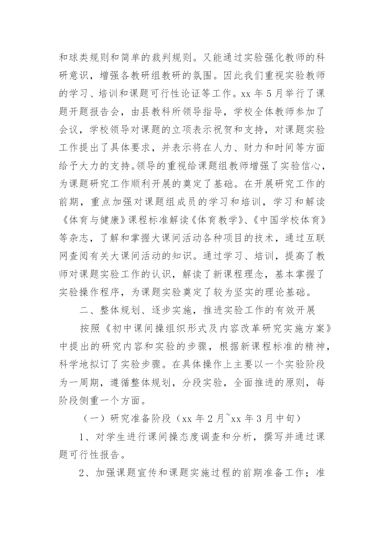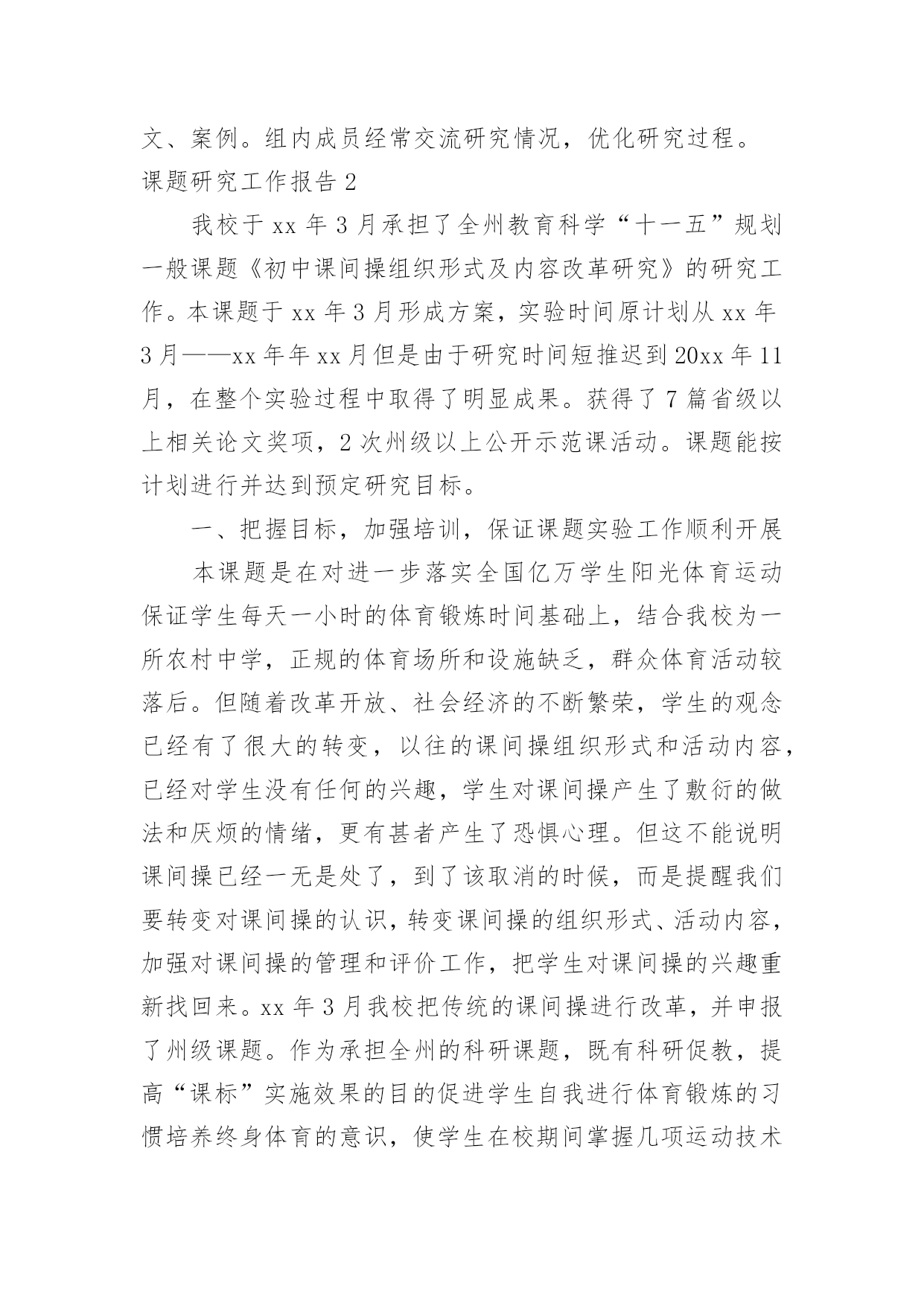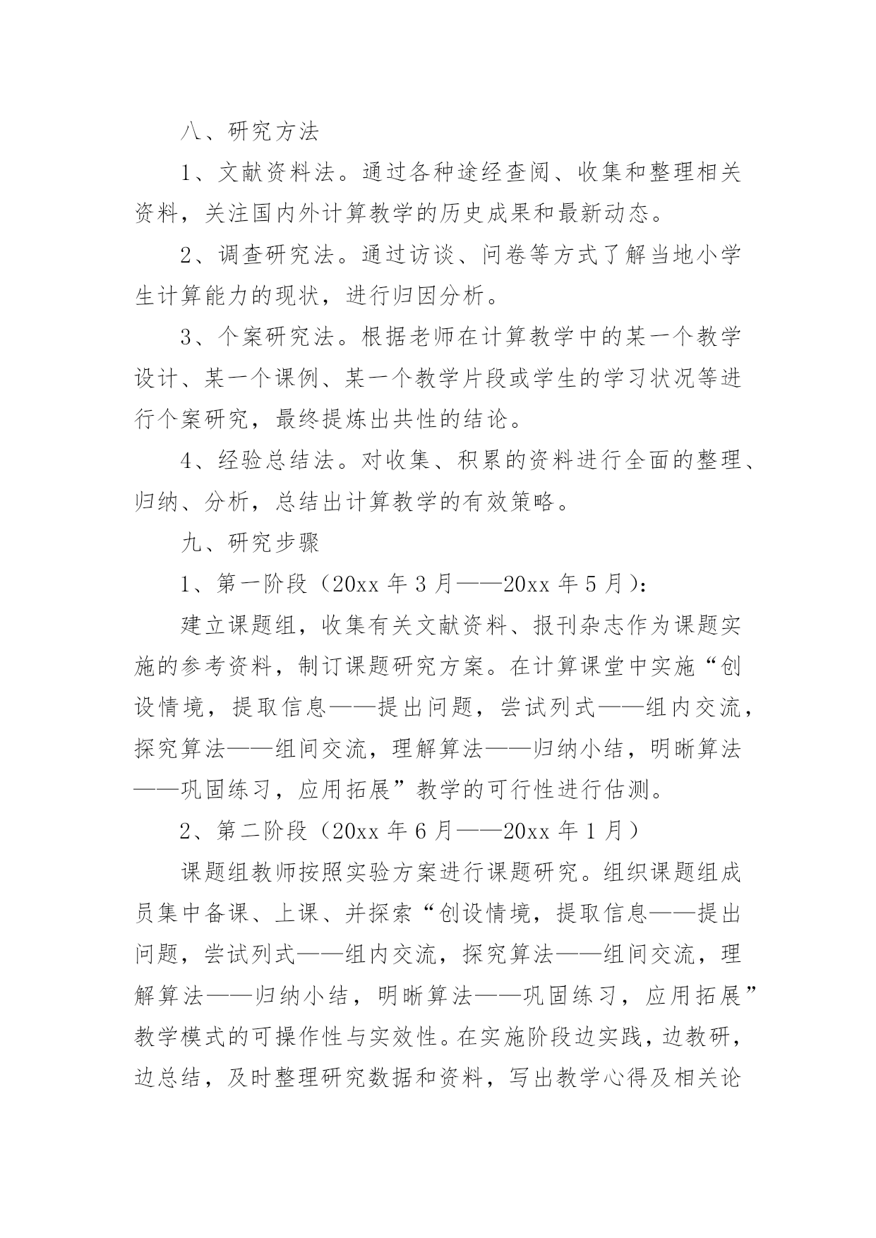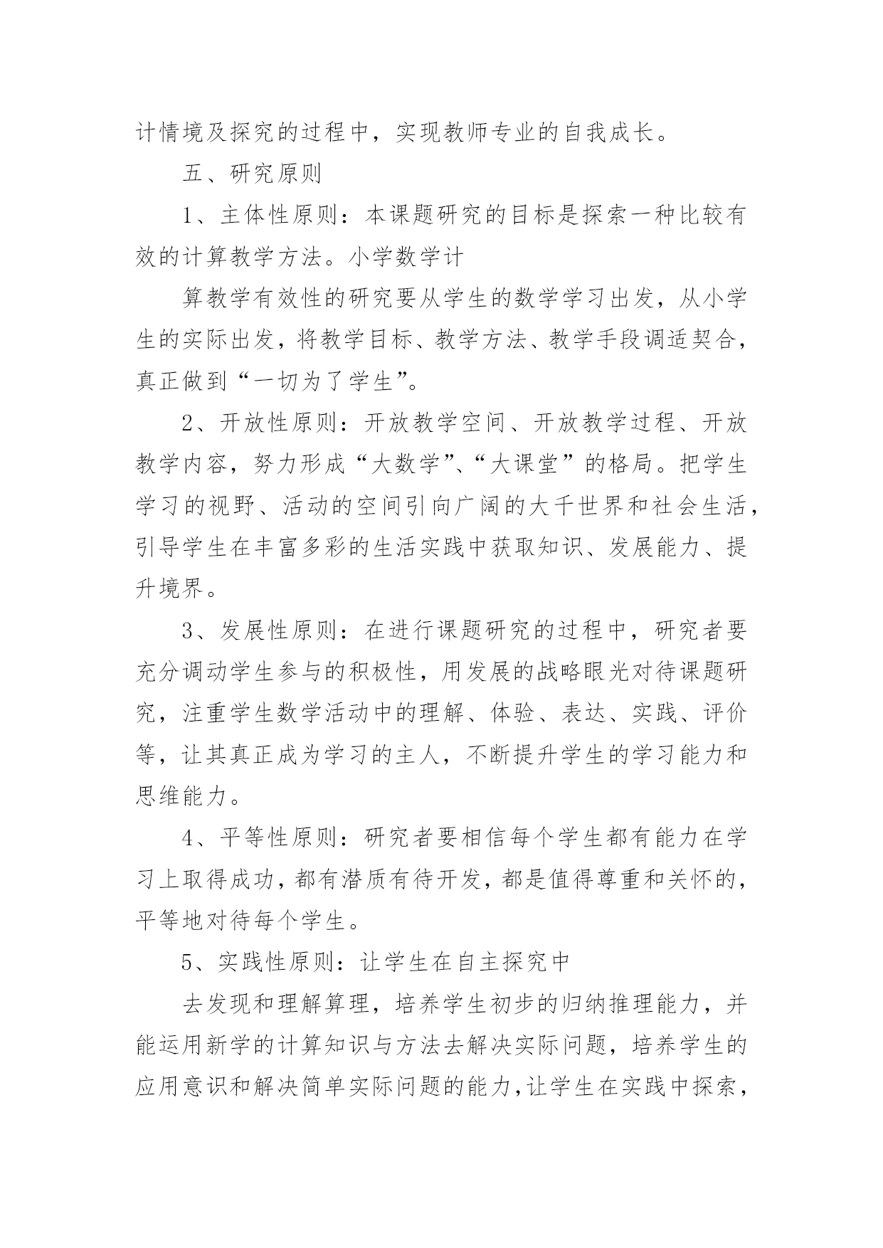 课题研究工作报告课题研究工作报告在我们平凡的日常里,越来越多人会去使用报告,报告具有语言陈述性的特点。我们应当如何写报告呢?以下是小编为大家整理的课题研究工作报告,仅供参考,欢迎大家阅读。课题研究工作报告1一、课题提出的背景和意义计算是小学数学教学的基本内容,它在小学数学教材中所占的比重很大。培养小学生的计算能力一直是小学数学教学的主要目的之一。《数学课程标准》明确提出:在“数与代数”的教学中,应帮助学生建立数感和符号意识,发展运算能力和推理能力,初步形成模型思想。运算能力主要是指能够根据法则和运算律正确地进行运算的能力。因此,在小学数学教学中,培养学生准确、迅速、灵活的计算能力是小学数学教学的一项重要任务,也是提高教学质量的基石。而良好的计算能力更是学生今后生活、学习和参加社会活动所必备的基本素养之一,所以培养学生的计算能力是小学数学课堂教学的一项重要任务,也将为学生今后更好地学习数学奠定扎实的基础。二、研究的理论1.建构主义理论。学习不是简单的信息积累,更重要的是新旧知识经验的冲突以及由此引发的认知结构的重组。每个人都以自己的方式理解事物,学习过程要增进学习者之间的合作,使其看到那些与自己不同的观点,完善对事物的理解。2.心理学理论依据。从认知心理学的角度来看,教材里的知识是客观存在的东西,而学生的认知结构是知识结构在学生头脑中的反映。学生是能动的主体,他是在原有认知结构的基础上吸收、同化新知识,充实、完善原有的认知结构,组成新旧知识统一的、新的认知结构。“注重学生已有的经验,培养学生灵活的计算方法”由于重视了学生在已有经验的基础上,充实原有的认知结构,学生不仅学会了自己去“发现”知识,而且还培养了他们自主学习的意识和创新能力。3.现代教育学理论依据。现代教育理论强调教学过程是师生双边活动的过程,教师主导的作用很重要。但学生是学习的主体,学生是否积极参加,对于教学效果有极大的影响。在计算教学中,教师绝不能满足于把计算法则,公式讲清楚,而应善于启发,引导学生,充分调动其学习的积极性和主动性,让学生真正理解算理,熟练掌握计算能力。三、研究的必要性1、计算在生活、学习、科学研究和实际中的作用数与计算是人们生活、学习、科学研究和实际中应用最广泛的'一种数学方法。在当今科学技术迅猛发展的时代,计算充分体现出其基础性和工具性。因此,在小学阶段学好计算并形成一定的计算能力对学生具有很重要的意义。2、计算的学习对学生思维能力发展的作用计算是在人类的生产生活中逐步产生和发展起来的,它充分体现了人类思维发展的过程,渗透了辩证唯物主义的观点,有效的计算教学,能很好地促进学生思维能力的发展3、培养小学生数学计算的能力是素质教育的需要培养学生的计算能力,发展学生智力是小学数学教学的目的和任务之一,也是人全面发展的需要,它对于对于全面贯彻教育方针,提高全民素质具有十分重要的意义4、培养学生的计算能力是提高小学数学课堂教学效益的迫切需要。四、研究目标1、探索小学数学计算教学的方法、技巧以及学生计算训练的方式方法,切实提高计算教学的有效性。2、激发学生在计算上的兴趣,培养学生的数感,帮助学生树立自信心,提高学生计算的正确率、计算的灵活性,发展学生的数学思维,促进学校数学教学质量的提高。3、培养学生专心、严谨、细致的学习态度和认真审题、细心计算、规范书写、自觉检验的良好学习习惯。4、通过本课题的研究,促使教师转变教学观念,特别是在计算课的教学中,注重计算与应用的有机结合,努力营造学生喜欢的数学计算课堂,在创造性的开发学习资源、设计情境及探究的过程中,实现教师专业的自我成长。五、研究原则1、主体性原则:本课题研究的目标是探索一种比较有效的计算教学方法。小学数学计算教学有效性的研究要从学生的数学学习出发,从小学生的实际出发,将教学目标、教学方法、教学手段调适契合,真正做到“一切为了学生”。2、开放性原则:开放教学空间、开放教学过程、开放教学内容,努力形成“大数学”、“大课堂”的格局。把学生学习的视野、活动的空间引向广阔的大千世界和社会生活,引导学生在丰富多彩的生活实践中获取知识、发展能力、提升境界。3、发展性原则:在进行课题研究的过程中,研究者要充分调动学生参与的积极性,用发展的战略眼光对待课题研究,注重学生数学活动中的理解、体验、表达、实践、评价等,让其真正成为学习的主人,不断提升学生的学习能力和思维能力。4、平等性原则:研究者要相信每个学生都有能力在学习上取得成功,都有潜质有待开发,都是值得尊重和关怀的,平等地对待每个学生。5、实践性原则:让学生在自主探究中去发现和理解算理,培养学生初步的归纳推理能力,并能运用新学的计算知识与方法去解决实际问题,培养学生的应用意识和解决简单实际问题的能力,让学生在实践中探索,在探索中发现,促进学生发散思维、求异思维的发