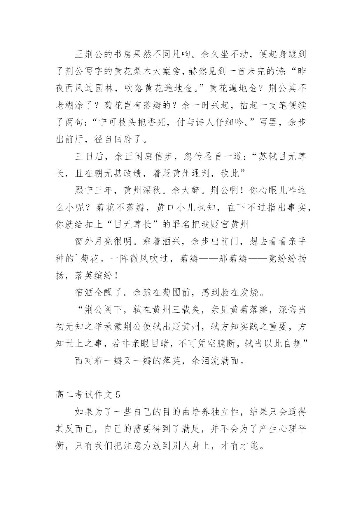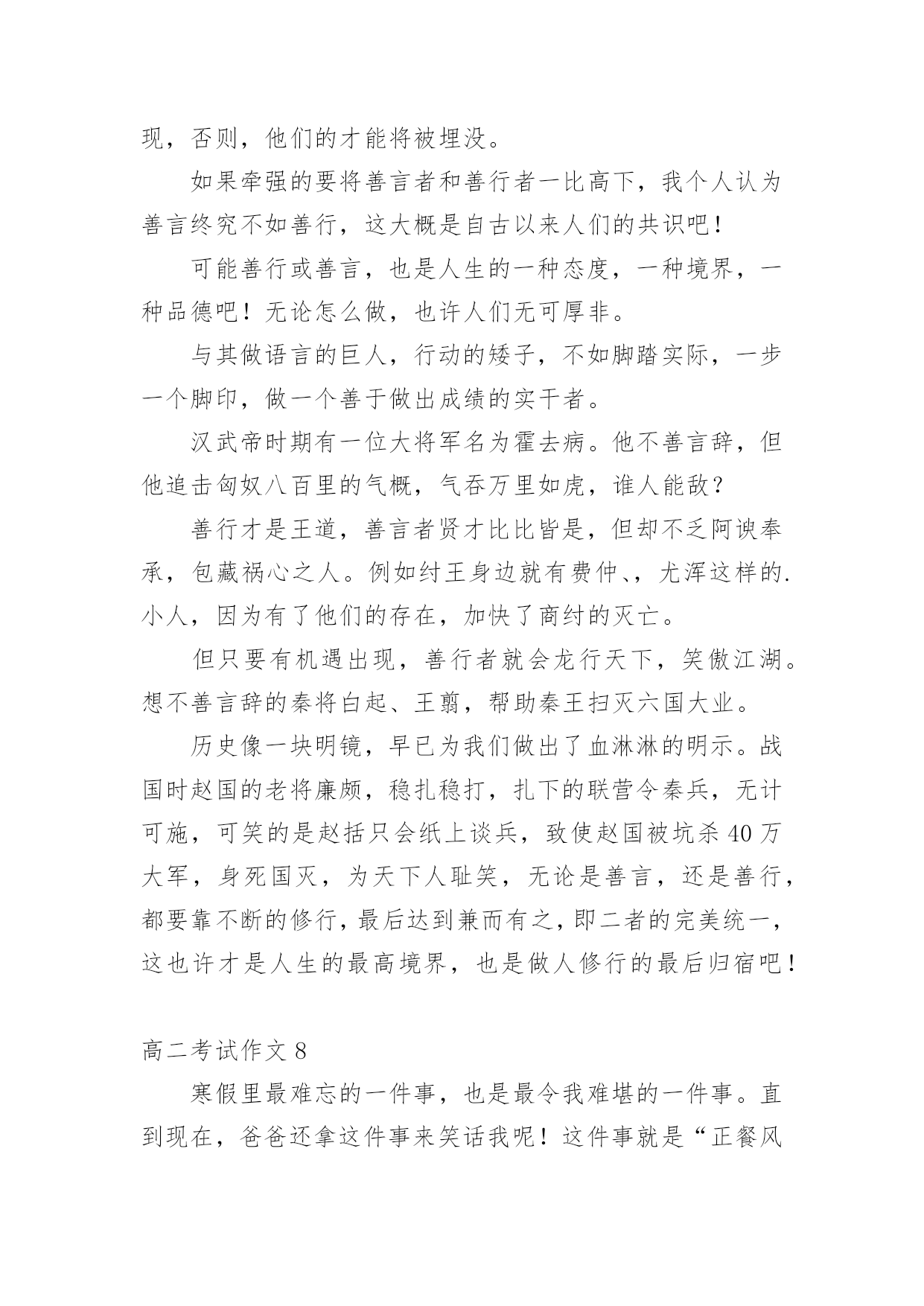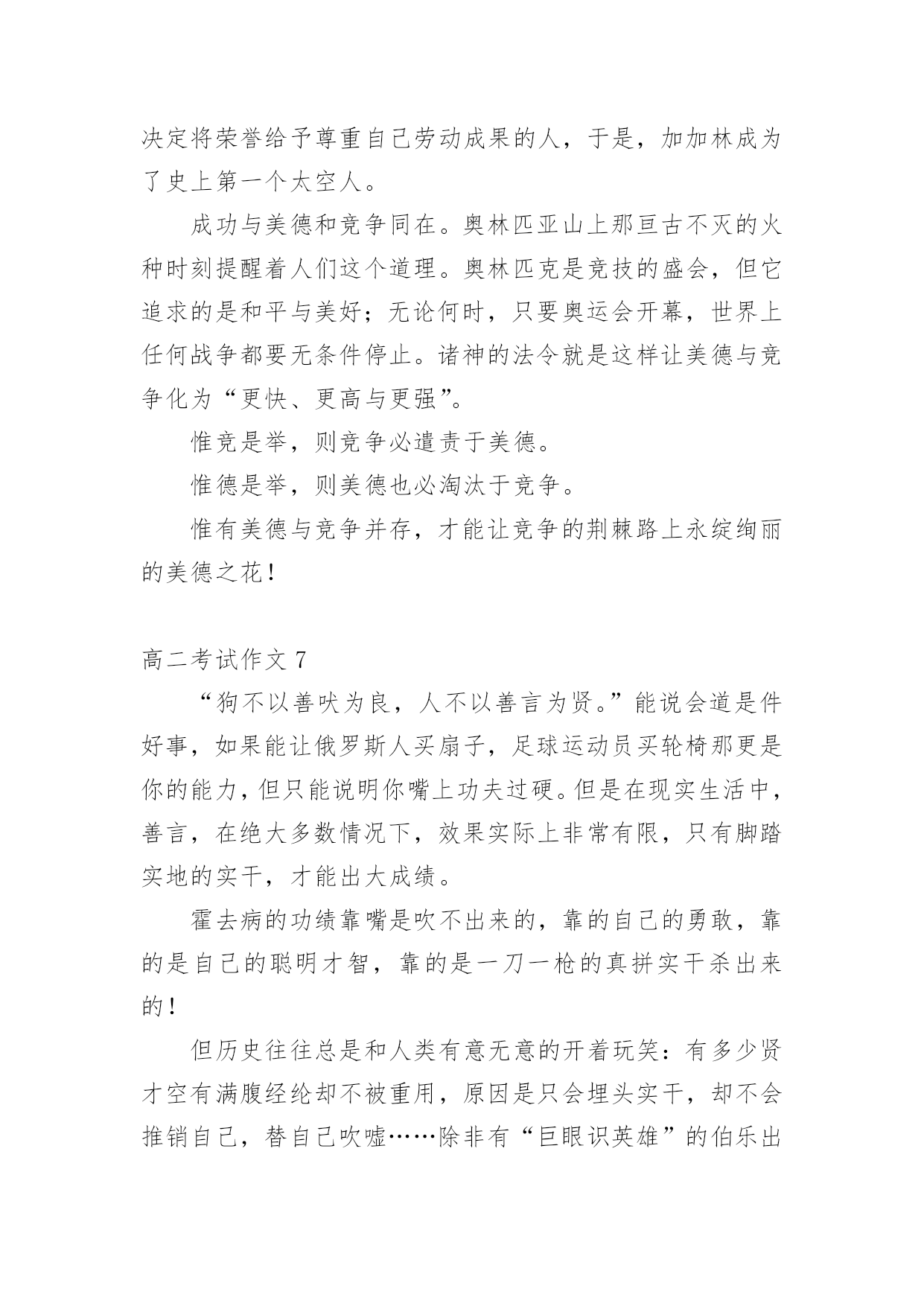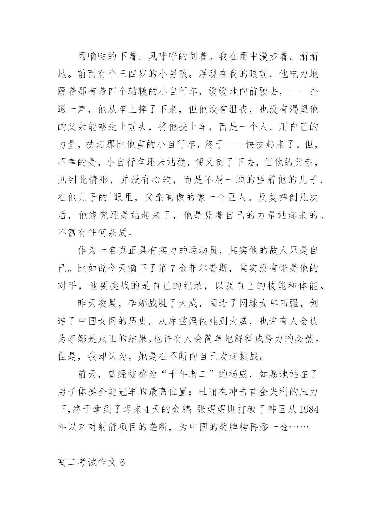 高二考试作文在日常的学习、工作、生活中,大家都经常接触到作文吧,作文是经过人的思想考虑和语言组织,通过文字来表达一个主题意义的记叙方法。那么,怎么去写作文呢?以下是小编精心整理的高二考试作文,仅供参考,欢迎大家阅读。高二考试作文1对于春天,从我们的口里跑出来的词语大多是“万紫千红、春回大地、姹紫嫣红……”这个象征着新生的季节是我们为之向往的季节之一;对于夏天,从我们嘴里跳出来的词语就大番不同了,“热气腾腾、炎炎夏日、夏虫语冰……”,不喜欢热的人们是很难对夏天生起喜爱的情绪的,而对于秋天,“硕果累累、秋高气爽……”这样的词语就会出现在我们的谈话中,那么冬天呢!冬天的词语也是有的,像“阳春白雪、寒冷刺骨、银装素裹……”在我们的面前勾勒出一幅幅冬天的景象。寒来暑往,冬天一直以来都以一种独特的姿态在四季中占据着重要角色,如果没有冬天会怎么样呢!春天百花齐放、百鸟争鸣,孩子们欢快地跳跃着迎接美好明天的到来。这个时候已经没有冬天的参与了,我们开始肆无忌惮的享受起无尽的`温暖来,但是当我们心里却一直在想着一个声音,好像缺少点什么,是的,缺少着冬天的味道。哦,原来冬天那一窜又一窜雪球降落的声音还有那孩子们玩堆雪人发出的欢快声,有着与春天声相媲美的境界,那是我们对冬天的感悟!夏天火辣辣的太阳照在拿着可口冰激凌的孩子们脸上,一时让他们睁不开眼;只见有人在冰凉的游泳池里拍打着水珠想要赶走这炎炎夏日的暑气。可是我们总觉得少了些什么。哦,原来是冬天孩子们正在堆着雪人,雪人大肚子上有两枚纽扣,它的鼻子是哪位孩子从家里厨房拿来的萝卜安插上去的,还有两颗红枣当作雪人的眼睛,煞是显眼。这是孩子们对冬天的感悟!秋天落叶纷飞,给人们以丰收的喜悦带来了无比的快乐。可是我们总觉得少了些什么。哦,原来在冬天,我们看到了雪花在冬日里融化的样子……渐渐地,人们学会了如何品味这严寒的冬天,品味这被无数人忘却的冬天,当我们细细体会这一年四季的变化时,才会发现原来冬天还有别样的记忆。高二考试作文2春天姑娘是温柔的,夏天姑娘是热辣辣的,秋天姑娘是请冷冷的,只有冬天是一位既残酷又圣洁的姑娘。要说我最爱哪一个,当然要非圣洁的冬天姑娘,在冬天,你可以随时随地都可以感触到冬天姑娘的存在,无论是从天空中飘落而下的雪花,还是从你身边咆哮而过的风儿先生,你总能感受一种美丽正在你的身边环绕着。窗外又扬起了纷纷扬扬的雪花,冬天姑娘是上天的宠儿,富裕了她无穷的力量,而冬天姑娘也不吝啬,把美都绽放到了世界上,让大家一起同享乐。冬天的窗户上结满了霜花,那是大自然的杰作。有的像郁郁葱葱的原始森林、有的像正在奔跑的小动物、还有的像摇曳多姿的珊瑚丛,让人看得眼花缭乱。冬天的河流不在叮咚作响,而结了厚厚的冰,从远处看就像是一条银色的丝带绵延伸向远方。冬天的太阳就像一位虚弱的老人,不再发出强烈的光芒。冬天的树木披上了银装,就像一根根晶亮的银条,寒风吹过,就像竖琴在演奏美好的乐曲。冬天只有梅花不怕寒冷,还是在雪中傲然开放。冬天是一个独特的季节,鸡、鸭、狗、兔脱掉了轻薄的衬衫,换上了厚厚的`棉衣。蜂蝶蚊虫早已销声匿迹。青蛙、蛇、刺猬不知躲到哪里?进入了甜美的梦乡。这白皑皑的世界是小朋友的乐园,他们三人成群打雪仗、堆雪人、滑冰……甚至还忘了寒冷、忘了时间。冬天我们还可以尽情的装扮自己,女孩子带靓丽的围巾,穿时尚的羽绒服,给萧瑟的冬日带来了一抹绚丽的色彩,冬泳和冬捕也是冬天里鲜明的特色。餐桌上的色彩没有夏日时的丰富绚丽。白菜、酸菜、土豆成了我们的家常菜。不过冬天的美食也数不胜数,炖粉条、蒸血肠、腊八粥、黏豆包、汤圆可是地道的北方冬日美食啊!我爱春天的五颜六色,我爱夏天的烈日炎炎,我爱秋天的天高气爽,但是我更爱那冬天的冰天雪地。高二考试作文3“读史使人明智”,同样的,酒也是一种历史的精华,更何况是名酒,所以我们不宜丢失名酒。1915年,东莞棉酒能获得巴拿马万国博览会大奖,记录在名录上,如今却已消失得无影无踪。我们都会情不自禁的产生一个疑问,为什么会丢失名酒的呢名酒也是文化的传承。中国许许多多的风格习惯流传了千年久,有的至今还会若隐若现,有的甚至被人们发扬得红红火火。从古至今,人们都会借酒消愁,解脱郁闷之情;有的在空闲或者吃饭也要倒一杯酒自己慢慢享受,品尝着它的香醇,享受着心中那份舒适自由的心情。酒在我们的生活中扮演着这么中要的角色,怎么可以丢失名酒,忘了它的存在呢因此,我们不应该丢失名酒。我们会钟情于花的芳香,眼里绘满了色彩;我们也会沉浸于夜的静谧,眼里充满了无丝的遐想;同样,我们也会沉醉于酒的`香醇,嘴里飘满了酒的甘香。名酒,是一种很美妙的东西,它可以让你乐在心中,甜在心中,当你抵挡不住它的诱惑时,你便会深深的沉浸在它的诱惑里,感受着酒给予你的快乐我们应该保留名酒,不应该让它在我们的记忆中慢慢褪去。名酒不仅是文化的传承