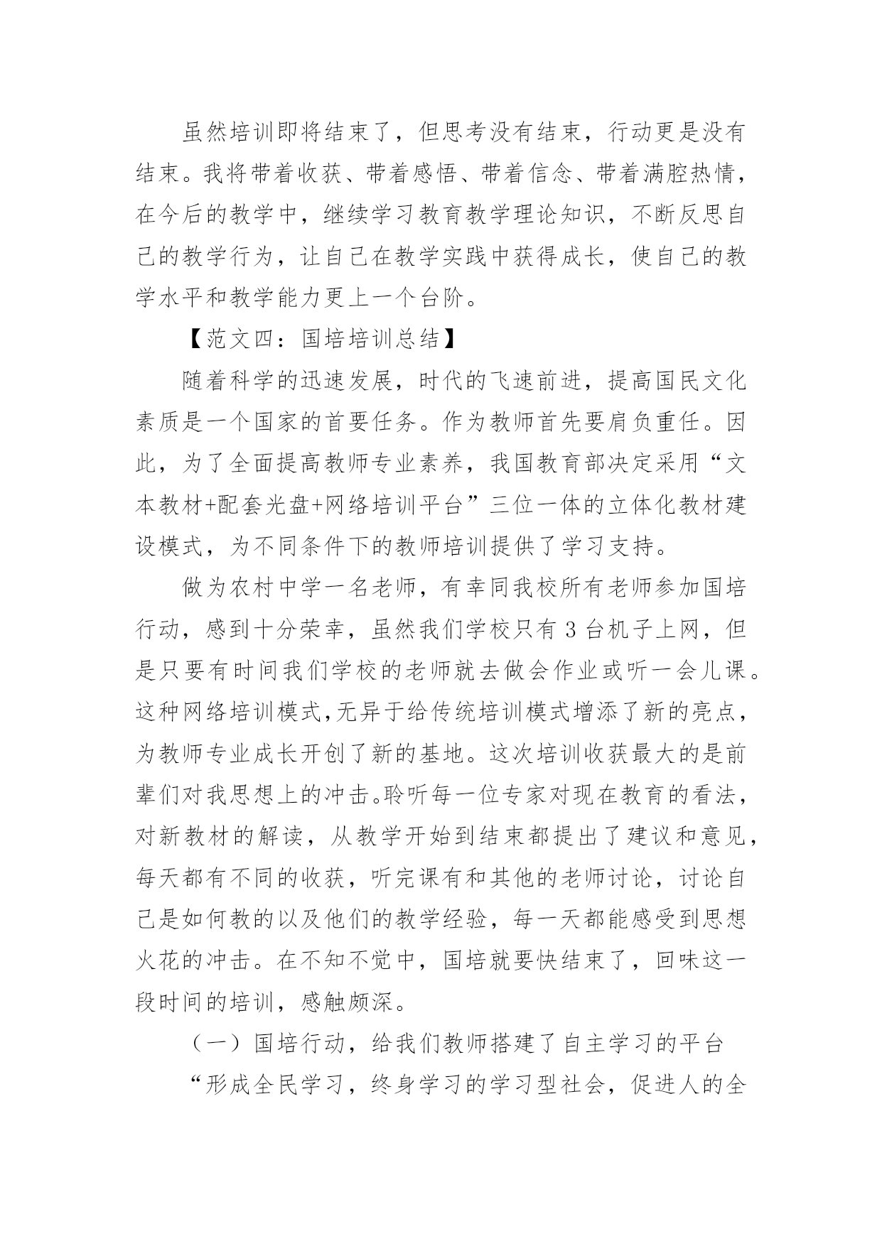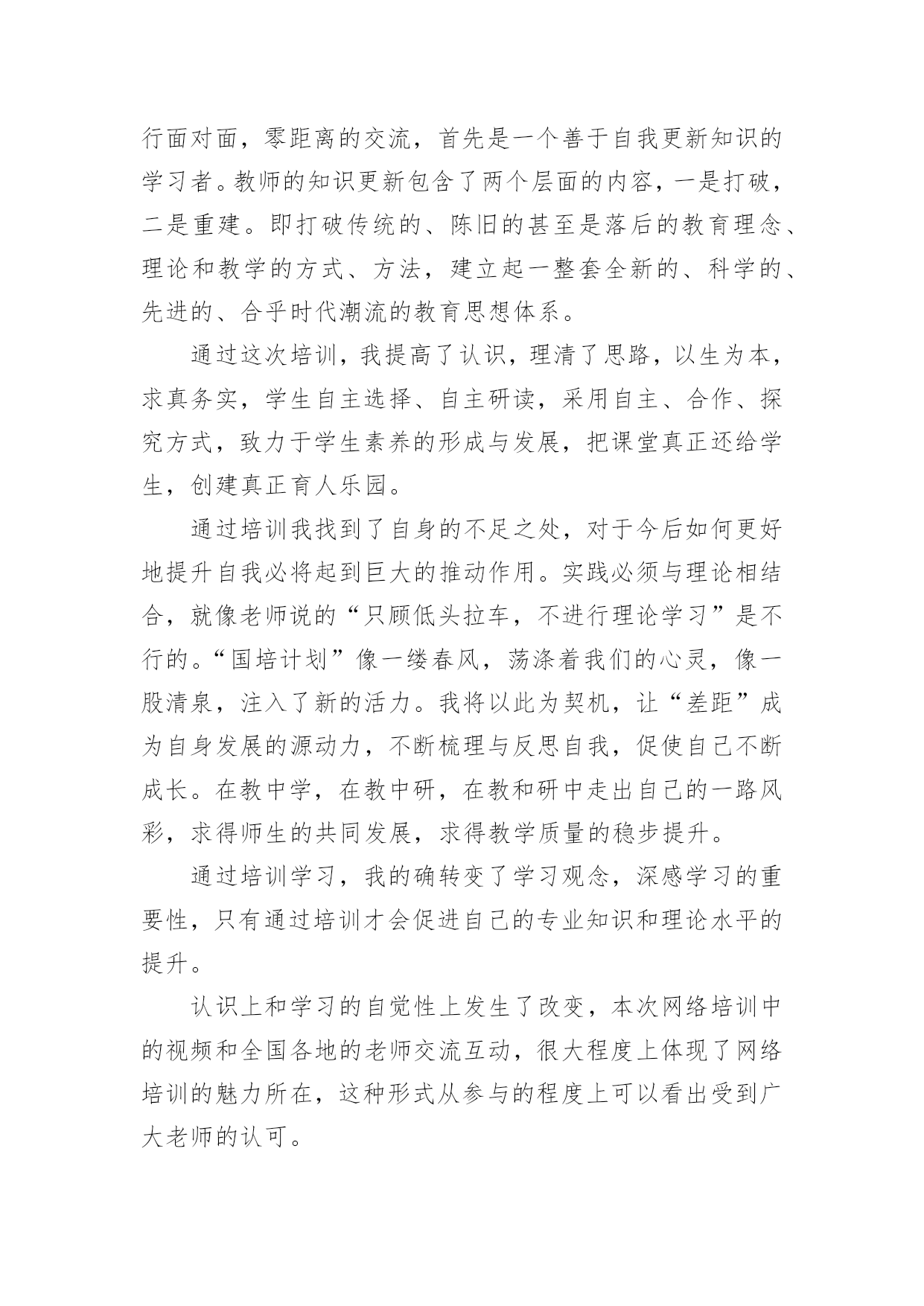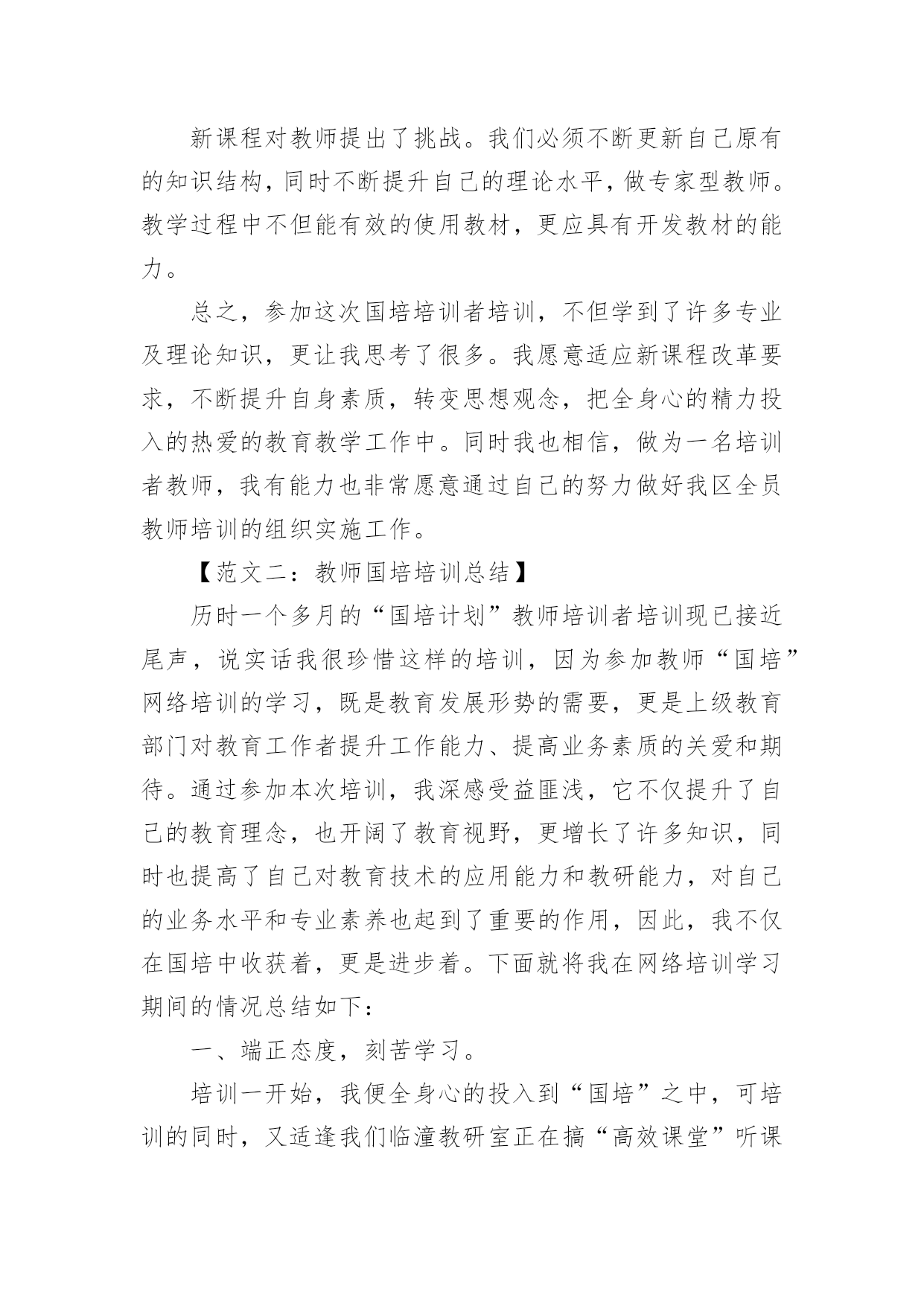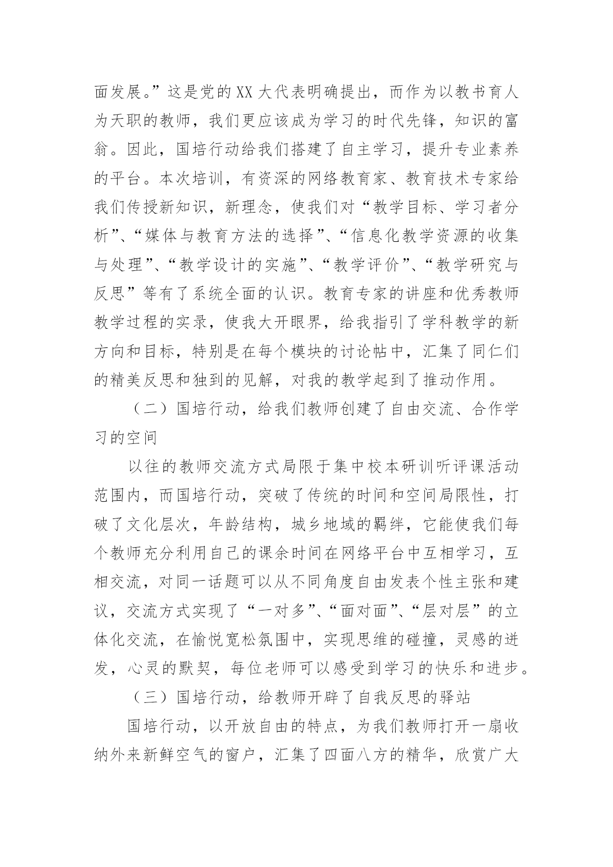 国培培训的总结【范文一:国培培训总结】20XX年1月9日至12日,在石家庄军兴宾馆参加了“国培计划—农村教师培训者骨干教师培训”的面授学习。截止到20XX年2月28日止,又按培训要求完成了《教师个性问题的自我调适》、《教师怎样做教育叙事研究》、《教师职业道德解读与实践导行》、《教师职业适应问题的自我调适》、《教育研究成果的表述》、《教育研究的过程与方法》、《教育研究课题的选择》等课程的视频在线学习,圆满完成了各项培训任务。做为一个培训者,基本掌握了整个培训流程及平台操作方法。非常感谢各级领导给我提供了这样一个学习的机会,让我有机会与各位同仁交流学习,让我有机会继续充实和完善自己专业技术水平和理论水平。新课程改革,需要老师的创新与探索,更需要老师扎实的专业技术水平和理论水平,国培适应了广大教师的需求。专家讲座,从教学实例入手,从教师喜欢、感兴趣的案例讲析。说实话,这次培训,在很大程度上提升了自己的理论水平,尤其是在教学观念上有了很大的提高。总结如下培训体会与大家共享。一、新课程改革必须更新教师观念。教师是课改的执行者,是学生学习的促进者、组织者、指导者,整个教学过程不再是以教师为中心,而是“以学生为中心”。这样就更好地激发学生的学习兴趣,充分调动他们的学习积极性,更有利于教师开展教育教学活动。二、教师要主动转换角色,改变教学行为,适应新课程改革要求。面对新课程,教师首先要主动转变角色,确认自己在新课程教学中的身份和地位,在新课程中教师是课堂教学中学生学习活动的组织者、指导者、参与者。新课程要求教师由传统的知识传授者转变为学生学习的组织者。教师作为学生学习的组织者就是为学生提供合作交流的空间与时间,让学生在教学中,自主学习、同桌交流、小组合作、组组交流、全班交流等。教师通过参与学生的观察、感知、参与、倾听、交流等学习活动参与、引导学生的学习过程中。三、教师要转变传统的教学观念,设计符合学生特点的学习方式。学生学习方式的变革是本次课程改革的重点内容。新课程倡导学生主动参与、乐于探究、勤于动手,培养学生收集和处理信息的能力、获取新知识的能力、分析和解决问题的能力以及交流与合作能力。在教学过程中,我们要注重发挥学生的主体性和主动性,变被动接受为主体参与。所以,我们在进行教学设计时,要注重设计,注重方法,注重课堂实效,从而实现“知识技能为基础目标,过程方法为核心目标,情感、思维和价值观为最终目标”的三维整合,提升整个课堂的教学效果。四、更新知识,提高专业技术水平和理论水平。新课程对教师提出了挑战。我们必须不断更新自己原有的知识结构,同时不断提升自己的理论水平,做专家型教师。教学过程中不但能有效的使用教材,更应具有开发教材的能力。总之,参加这次国培培训者培训,不但学到了许多专业及理论知识,更让我思考了很多。我愿意适应新课程改革要求,不断提升自身素质,转变思想观念,把全身心的精力投入的热爱的教育教学工作中。同时我也相信,做为一名培训者教师,我有能力也非常愿意通过自己的努力做好我区全员教师培训的组织实施工作。【范文二:教师国培培训总结】历时一个多月的“国培计划”教师培训者培训现已接近尾声,说实话我很珍惜这样的培训,因为参加教师“国培”网络培训的学习,既是教育发展形势的需要,更是上级教育部门对教育工作者提升工作能力、提高业务素质的关爱和期待。通过参加本次培训,我深感受益匪浅,它不仅提升了自己的教育理念,也开阔了教育视野,更增长了许多知识,同时也提高了自己对教育技术的应用能力和教研能力,对自己的业务水平和专业素养也起到了重要的作用,因此,我不仅在国培中收获着,更是进步着。下面就将我在网络培训学习期间的情况总结如下:一、端正态度,刻苦学习。培训一开始,我便全身心的投入到“国培”之中,可培训的同时,又适逢我们临潼教研室正在搞“高效课堂”听课调研活动与市级小课题的结题阶段,作为中学教研员,又是小课题的负责人,我白天要下校听课,晚上回来还要写课题结题报告。因此,就只能尽量在晚上挤时间上网学习,常常学习到深夜一两点钟。在不同的模块学习中,我博采众长,取长补短,成果丰硕,每天都能感受到思想火花的撞击。培训期间,可以每天聆听各位名家大师的讲座,他们精彩的讲演内容既深刻独到又通俗易懂,既旁征博引又紧扣主题,既发人深省又生动有趣。大师们以鲜活的案例和丰富的知识内涵,给了我具体的操作指导,他们“以学定教,关注学生促进发展”,“让反思成为一种习惯”的教学观给了我深深地震撼,他们课堂上那种浑然天成,对比鲜明的教学风格给我留下深刻的印象。让我的心灵受到如沐春风般的启迪,使我的教育观念进一步得到了更新,真是收获多多,妙不可言。另外,在“国培”的平台上,学员们可以与相互交流教学心得,讨论热点话题,相互留言勉励,还可以交流学习体会、撰写学习日志,上传资源共享等。因此,我感觉每