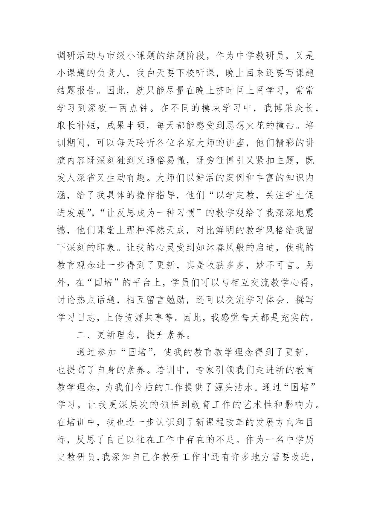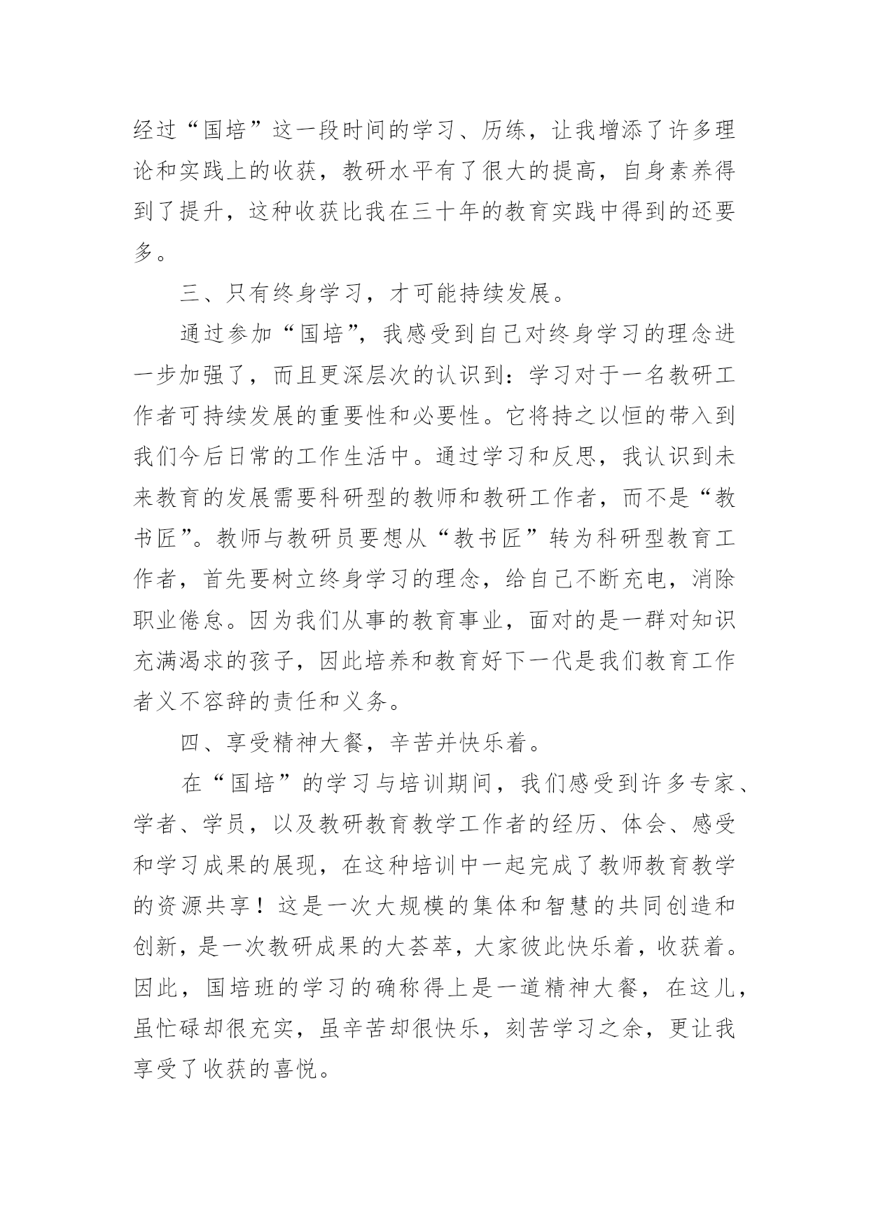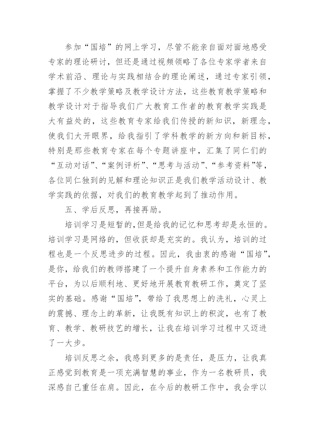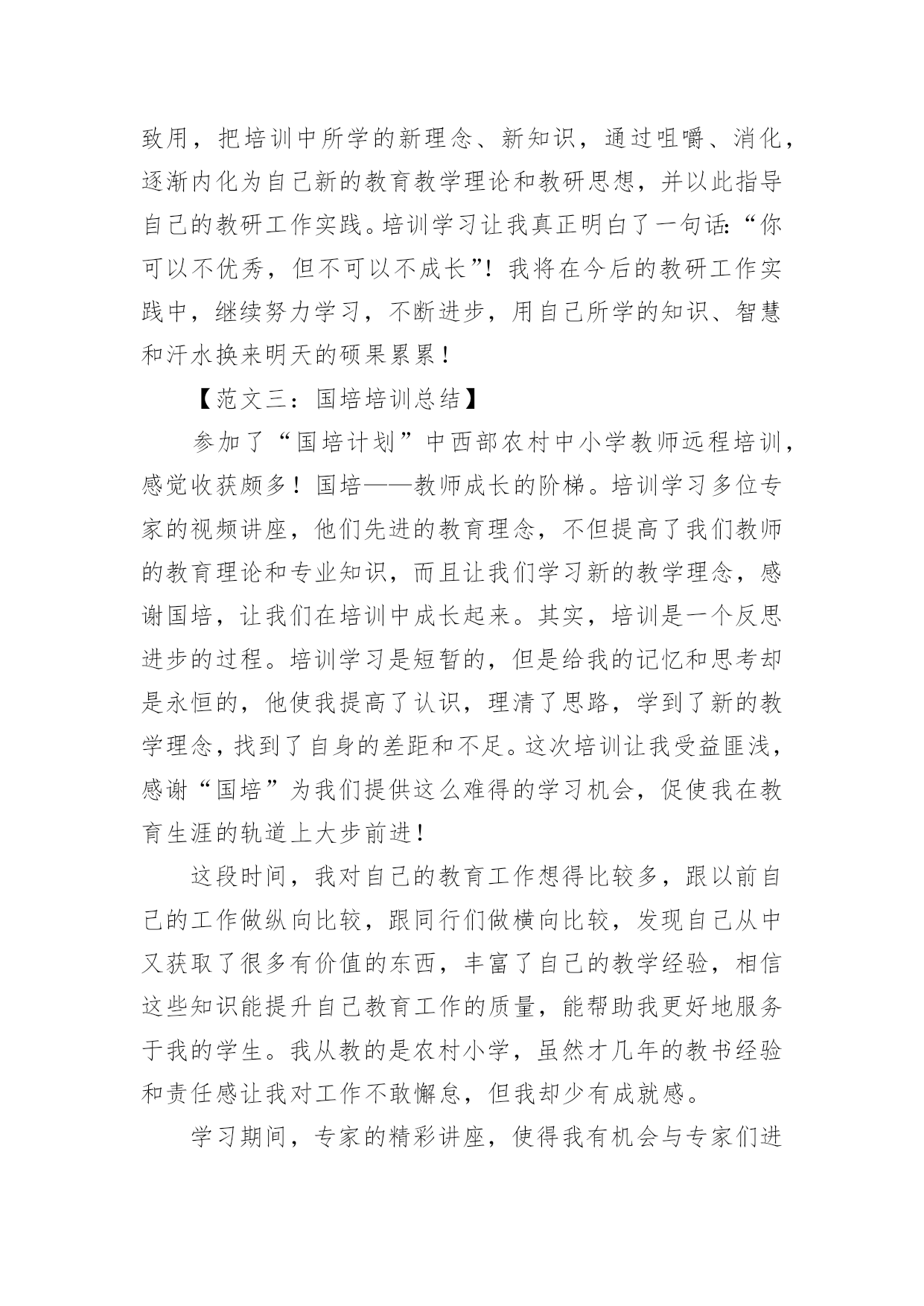 国培培训的总结【范文一:国培培训总结】20XX年1月9日至12日,在石家庄军兴宾馆参加了“国培计划—农村教师培训者骨干教师培训”的面授学习。截止到20XX年2月28日止,又按培训要求完成了《教师个性问题的自我调适》、《教师怎样做教育叙事研究》、《教师职业道德解读与实践导行》、《教师职业适应问题的自我调适》、《教育研究成果的表述》、《教育研究的过程与方法》、《教育研究课题的选择》等课程的视频在线学习,圆满完成了各项培训任务。做为一个培训者,基本掌握了整个培训流程及平台操作方法。非常感谢各级领导给我提供了这样一个学习的机会,让我有机会与各位同仁交流学习,让我有机会继续充实和完善自己专业技术水平和理论水平。新课程改革,需要老师的创新与探索,更需要老师扎实的专业技术水平和理论水平,国培适应了广大教师的需求。专家讲座,从教学实例入手,从教师喜欢、感兴趣的案例讲析。说实话,这次培训,在很大程度上提升了自己的理论水平,尤其是在教学观念上有了很大的提高。总结如下培训体会与大家共享。一、新课程改革必须更新教师观念。教师是课改的执行者,是学生学习的促进者、组织者、指导者,整个教学过程不再是以教师为中心,而是“以学生为中心”。这样就更好地激发学生的学习兴趣,充分调动他们的学习积极性,更有利于教师开展教育教学活动。二、教师要主动转换角色,改变教学行为,适应新课程改革要求。面对新课程,教师首先要主动转变角色,确认自己在新课程教学中的身份和地位,在新课程中教师是课堂教学中学生学习活动的组织者、指导者、参与者。新课程要求教师由传统的知识传授者转变为学生学习的组织者。教师作为学生学习的组织者就是为学生提供合作交流的空间与时间,让学生在教学中,自主学习、同桌交流、小组合作、组组交流、全班交流等。教师通过参与学生的观察、感知、参与、倾听、交流等学习活动参与、引导学生的学习过程中。三、教师要转变传统的教学观念,设计符合学生特点的学习方式。学生学习方式的变革是本次课程改革的重点内容。新课程倡导学生主动参与、乐于探究、勤于动手,培养学生收集和处理信息的能力、获取新知识的能力、分析和解决问题的能力以及交流与合作能力。在教学过程中,我们要注重发挥学生的主体性和主动性,变被动接受为主体参与。所以,我们在进行教学设计时,要注重设计,注重方法,注重课堂实效,从而实现“知识技能为基础目标,过程方法为核心目标,情感、思维和价值观为最终目标”的三维整合,提升整个课堂的教学效果。四、更新知识,提高专业技术水平和理论水平。新课程对教师提出了挑战。我们必须不断更新自己原有的知识结构,同时不断提升自己的理论水平,做专家型教师。教学过程中不但能有效的使用教材,更应具有开发教材的能力。总之,参加这次国培培训者培训,不但学到了许多专业及理论知识,更让我思考了很多。我愿意适应新课程改革要求,不断提升自身素质,转变思想观念,把全身心的精力投入的热爱的教育教学工作中。同时我也相信,做为一名培训者教师,我有能力也非常愿意通过自己的努力做好我区全员教师培训的组织实施工作。【范文二:教师国培培训总结】历时一个多月的“国培计划”教师培训者培训现已接近尾声,说实话我很珍惜这样的培训,因为参加教师“国培”网络培训的学习,既是教育发展形势的需要,更是上级教育部门对教育工作者提升工作能力、提高业务素质的关爱和期待。通过参加本次培训,我深感受益匪浅,它不仅提升了自己的教育理念,也开阔了教育视野,更增长了许多知识,同时也提高了自己对教育技术的应用能力和教研能力,对自己的业务水平和专业素养也起到了重要的作用,因此,我不仅在国培中收获着,更是进步着。下面就将我在网络培训学习期间的情况总结如下:一、端正态度,刻苦学习。培训一开始,我便全身心的投入到“国培”之中,可培训的同时,又适逢我们临潼教研室正在搞“高效课堂”听课调研活动与市级小课题的结题阶段,作为中学教研员,又是小课题的负责人,我白天要下校听课,晚上回来还要写课题结题报告。因此,就只能尽量在晚上挤时间上网学习,常常学习到深夜一两点钟。在不同的模块学习中,我博采众长,取长补短,成果丰硕,每天都能感受到思想火花的撞击。培训期间,可以每天聆听各位名家大师的讲座,他们精彩的讲演内容既深刻独到又通俗易懂,既旁征博引又紧扣主题,既发人深省又生动有趣。大师们以鲜活的案例和丰富的知识内涵,给了我具体的操作指导,他们“以学定教,关注学生促进发展”,“让反思成为一种习惯”的教学观给了我深深地震撼,他们课堂上那种浑然天成,对比鲜明的教学风格给我留下深刻的印象。让我的心灵受到如沐春风般的启迪,使我的教育观念进一步得到了更新,真是收获多多,妙不可言。另外,在“国培”的平台上,学员们可以与相互交流教学心得,讨论热点话题,相互留言勉励,还可以交流学习体会、撰写学习日志,上传资源共享等。因此,我感觉每