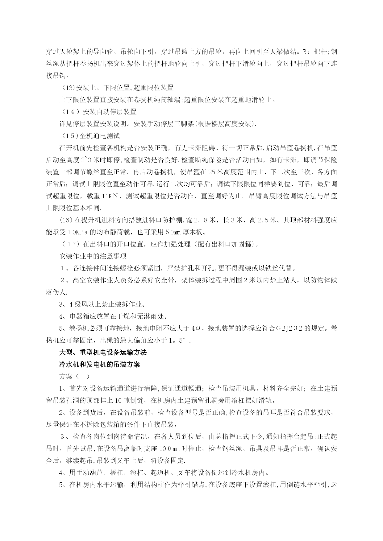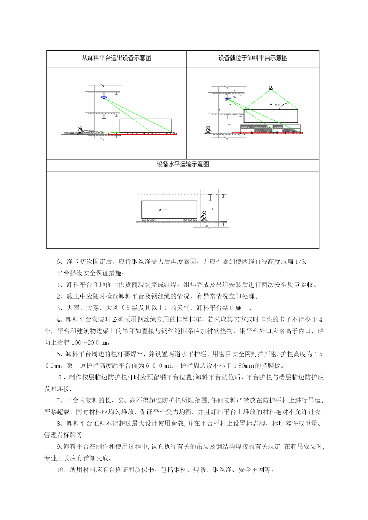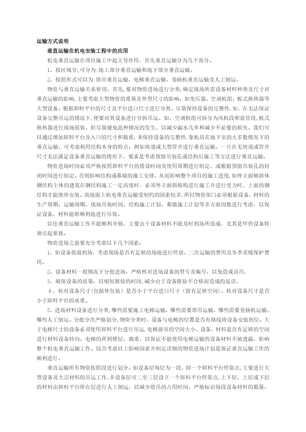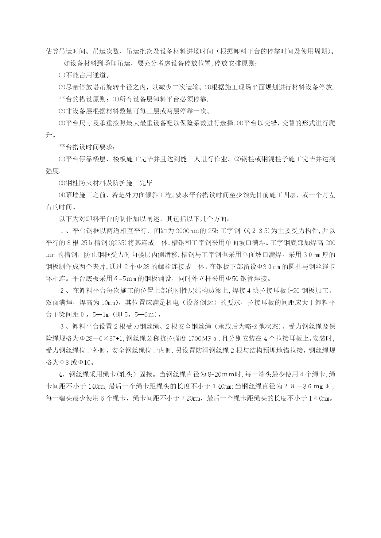 垂直及水平运输方案(完整资料)(可以直接使用,可编辑优秀版资料,欢迎下载)运输方式说明垂直运输在机电安装工程中的应用机电垂直运输在项目施工中起主导作用,首先垂直运输分为几个部分。1、按区域分,可分为:地上部分垂直运输和地下部分垂直运输。2、按照形式可以为:塔吊垂直运输、电梯垂直运输、卷扬机垂直运输及人工倒运。物资与垂直运输关系密切。首先,要对物资进场进行分类.确定现场所需设备材料种类及尺寸对垂直运输的影响.主要考虑大型物资的重量及外型尺寸的影响。如变压器、空调机组、板式换热器等大型设备。根据卸料平台的尺寸及平台进口尺寸进行分类。尽量保持设备的完整性.如,在无法保证设备完整吊运的情况下,便要对其设备进行分拆吊运。如,空调机组可拆分为风机段和盘管段,板式换热器进行现场组装。但尽量避免此种情况的发生,以减少漏水几率和减少不必要的损失。我们可以通过增加卸料平台及入口的尺寸和载重,来保持设备的完整性.象机房在地下室的大多数情况下的垂直运输。可考虑利用结构本身的特点:例如坡道或大型管井进行垂直运输。一旦在无坡道或管井尺寸无法满足设备垂直运输的情形下,要求是考虑预留吊装孔或结构后施工等方法进行垂直运输。物资进场时间必须严格按照卸料平台的搭设时间及使用周期进行制定,或根据预留吊装孔的封闭时间进行制定。否则影响结构或幕墙的施工安排,从而影响整个项目的施工进度.如外立面倾斜体钢结构主体的建筑在钢结构施工一定高度时,必须外立面斜格构进行施工并进行受力时,上面的钢结构才能继续安装。故地面上机电垂直运输受制约的因素较多.所以物资部门必须根据设备、材料的生产周期、运输周期、现场吊装时间、结构施工计划、幕墙施工计划等多方面因数进行考虑,以保证设备、材料能够顺利地进行吊装。以往垂直运输工作不能顺利开展,主要由于设备材料不能及时到场所造成,尤其是甲供设备特别引起重视。物资进场之前要充分考虑以下几个因素:1、如设备提前到场,考虑现场是否有足够的场地进行停放、二次运输的费用及冬季采暖保护费用。2、设备材料一般情况下分批进场,严格核对进场设备的型号及编号,以免造成误吊.3、确保设备的质量,以缩短报验的时间,减少由于设备报验不合格而造成的延误。4、核对设备尺寸(包括外包装)是否小于平台进口尺寸(留有足够空间)。核对设备尺寸是否小于卸料平台的承重。5、进场材料设备进行分类,哪些需要施工电梯运输、哪些需要塔吊运输、哪些需要卷扬机运输、哪些人工倒运。分批分次严格划分,物资分类时,设备与电梯的位置是否有路线将设备安装到位。大于电梯尺寸的设备必须使用卸料平台进行吊运.电梯前室的空间大小、设备、材料是否有足够的空间进行材料设备转向。电梯的所到楼层、载重,以保证不能使用电梯运输的设备材料不被遗漏,影响整个机电垂直运输工作。综合考虑以上影响因素并制定详细的物资进场计划是保证垂直运输工作的顺利进行。垂直运输所有物资按照段进行划分。如设备层每层为一段,即一个卸料平台停靠点,主要进行大型设备及大宗材料的吊运工作.非设备层可二至三层设立一个卸料平台停靠点,上下层、上层或下层的材料由卸料平台所在层进行人工倒运,以减少塔吊的占用时间。严格标识每段设备材料的数量、估算吊运时间、吊运次数、吊运批次及设备材料进场时间(根据卸料平台的停靠时间及使用周期)。如设备材料到场即吊运,要充分考虑设备停放位置,停放安排原则:⑴不能占用通道。⑵尽量停放塔吊旋转半径之内,以减少二次运输。⑶根据施工现场平面规划进行材料设备停放.平台的搭设原则:⑴所有设备层卸料平台必须停靠.⑵非设备层根据材料数量可每三层或两层停靠一次。⑶平台尺寸及承重按照最大最重设备配以保险系数进行选择.⑷平台以交错、交替的形式进行爬升。平台搭设时间要求:⑴平台停靠楼层、楼板施工完毕并且达到能上人进行作业。⑵钢柱或钢混柱子施工完毕并达到强度。⑶钢柱防火材料及防护施工完毕。⑷幕墙施工之前,若是外力面倾斜工程,要求平台搭设时间至少领先目前施工四层,或一个月左右的时间。以下为对卸料平台的制作加以阐述,其包括以下几个方面:1、平台钢框以两道相互平行、间距为3000mm的25b工字钢(Q235)为主要受力构件,并以平行的8根25b槽钢(Q235)将其连成一体,槽钢和工字钢采用单面坡口满焊。工字钢底部加焊高200mm的槽钢,防止钢框受力时向楼层内侧滑移,槽钢与工字钢也采用单面坡口满焊。采用30mm厚的钢板制作成两个夹片,通过2个Φ28的螺栓连接成一体,在钢板下部留设Φ30mm的圆孔与钢丝绳卡环相连。平台底板采用δ=5mm的钢板铺设,同时外立杆采用Φ50钢管焊接。2、在卸料平台每次施工的位置上部的刚性层结构边梁上,焊接4块拉接耳板(-20钢板加工,双面满焊,焊高为10mm),其位置应满足机电(设备倒运)的要求