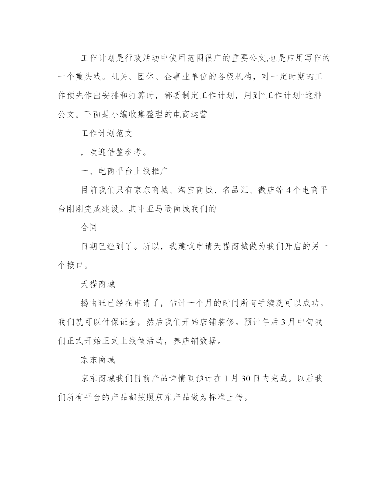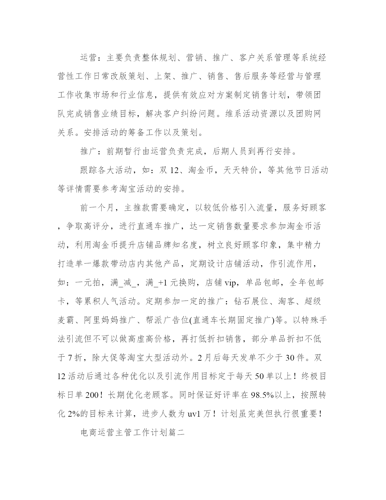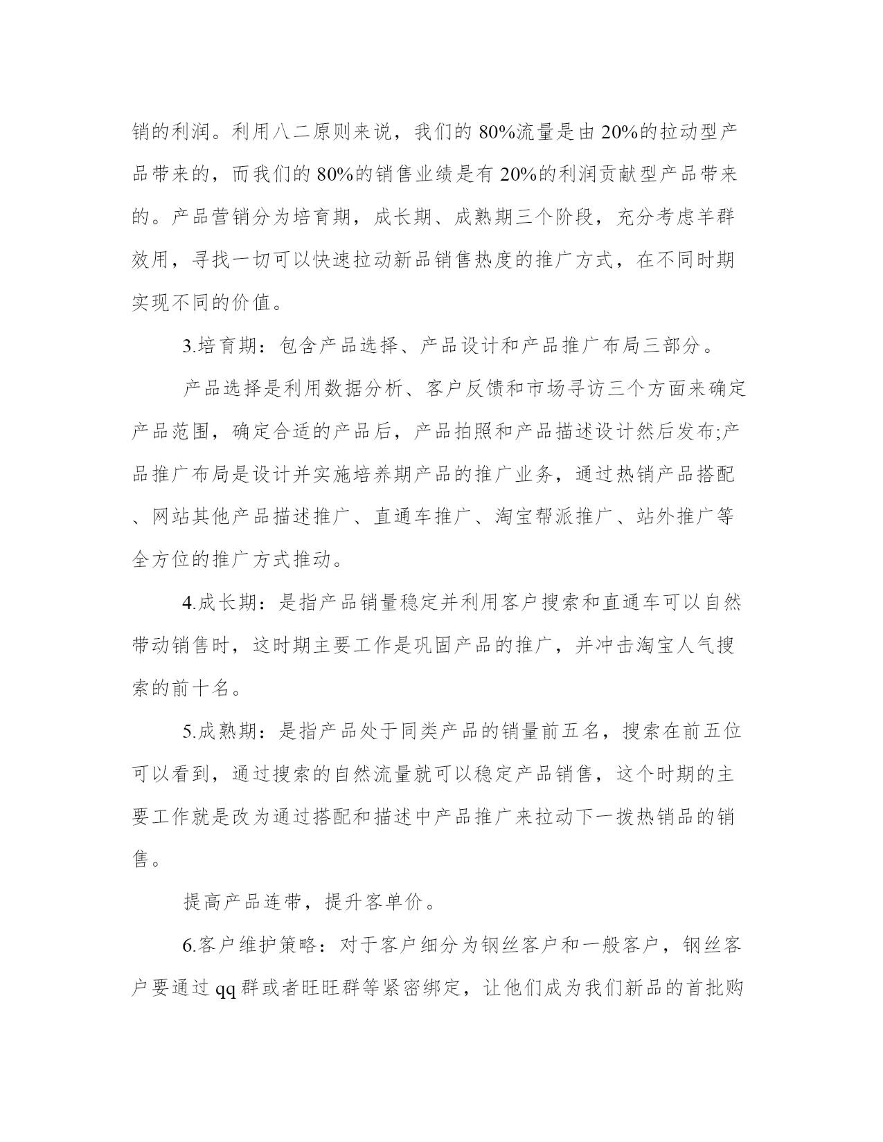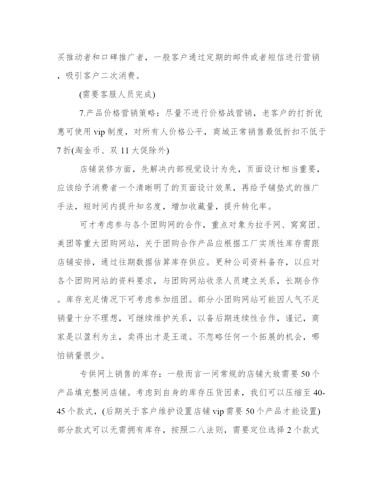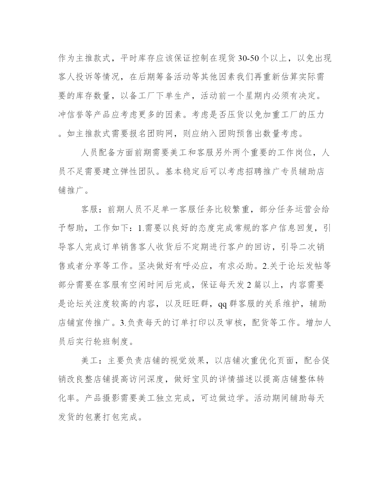 2023年电商运营主管工作计划(案例18篇)计划可以让我们更加有组织地进行工作和学习,从而减少无谓的浪费和拖延。分配资源和责任,将任务合理地分给团队成员或自己,确保每个人都清楚自己的职责和目标。计划是一种思维方式,以下是一些培养计划思维的方法和技巧。电商运营主管工作计划篇一1.运营要点:产品质量无疑在消费者心中无形建立一种信任,对于产品质量当然是关键,还需要有美观的形象出现消费者眼前,对于页面设计需要更加美观大方。需要练好内功的基础上,把握住有利的资源,更为重要,现在买家越来越成熟理性,我们应该在拥有流量的前提下精心做好店铺的内功,再以多渠道的方式引入更多优质的流量,从而提高转化率。跟踪客户会员信息,尽可能多做客户回访,建立会员关系信息。建立口碑回头客。做大型活动前的预告信息通知。2.营销手法:整体营销策略:集中利用淘宝系统推广方式,发掘潜力热销产品并大力推广,利用热销品拉动整体销售,优化销售各个环节,树立公司形象,尽量避免客服沟通成本,逐渐建立口碑。产品营销设计:产品在整体营销中要有两类,分别是销售拉动型和利润贡献型,销售拉动型要考虑产品购买量,在产品利润上可以做到微利;利润贡献型要考虑到产品品牌、竞争情况等因素,保证整体营销的利润。利用八二原则来说,我们的80%流量是由20%的拉动型产品带来的,而我们的80%的销售业绩是有20%的利润贡献型产品带来的。产品营销分为培育期,成长期、成熟期三个阶段,充分考虑羊群效用,寻找一切可以快速拉动新品销售热度的推广方式,在不同时期实现不同的价值。3.培育期:包含产品选择、产品设计和产品推广布局三部分。产品选择是利用数据分析、客户反馈和市场寻访三个方面来确定产品范围,确定合适的产品后,产品拍照和产品描述设计然后发布;产品推广布局是设计并实施培养期产品的推广业务,通过热销产品搭配、网站其他产品描述推广、直通车推广、淘宝帮派推广、站外推广等全方位的推广方式推动。4.成长期:是指产品销量稳定并利用客户搜索和直通车可以自然带动销售时,这时期主要工作是巩固产品的推广,并冲击淘宝人气搜索的前十名。5.成熟期:是指产品处于同类产品的销量前五名,搜索在前五位可以看到,通过搜索的自然流量就可以稳定产品销售,这个时期的主要工作就是改为通过搭配和描述中产品推广来拉动下一拨热销品的销售。提高产品连带,提升客单价。6.客户维护策略:对于客户细分为钢丝客户和一般客户,钢丝客户要通过qq群或者旺旺群等紧密绑定,让他们成为我们新品的首批购买推动者和口碑推广者,一般客户通过定期的邮件或者短信进行营销,吸引客户二次消费。(需要客服人员完成)7.产品价格营销策略:尽量不进行价格战营销,老客户的打折优惠可使用vip制度,对所有人价格公平,商城正常销售最低折扣不低于7折(淘金币、双11大促除外)店铺装修方面,先解决内部视觉设计为先,页面设计相当重要,应该给予消费者一个清晰明了的页面设计效果,再给予铺垫式的推广手法,短时间内提升知名度,增加收藏量,提升转化率。可才考虑参与各个团购网的合作,重点对象为拉手网、窝窝团、美团等重大团购网站,关于团购合作产品应根据工厂实质性库存需跟店铺安排,通过往期数据估算库存供应。更种公司资料备存,以应对各个团购网站的资料要求,与团购网站收录人员建立关系,长期合作。库存充足情况下可考虑参加组团。部分小团购网站可能因人气不足销量十分不理想,可继续维护关系,以备后期连续性合作,谨记,商家是以盈利为主,卖得出才是王道。不忽略任何一个拓展的机会,哪怕销量很少。专供网上销售的库存:一般而言一间常规的店铺大致需要50个产品填充整间店铺。考虑到自身的库存压货因素,我们可以压缩至40-45个款式,(后期关于客户维护设置店铺vip需要50个产品才能设置)部分款式可以无需拥有库存,按照二八法则,需要定位选择2个款式作为主推款式,平时库存应该保证控制在现货30-50个以上,以免出现客人投诉等情况,在后期筹备活动等其他因素我们再重新估算实际需要的库存数量,以备工厂下单生产,活动前一个星期内必须有决定。冲信誉等产品应考虑更多的因素。考虑是否压货以免加重工厂的压力。如主推款式需要报名团购网,则应纳入团购预售出数量考虑。人员配备方面前期需要美工和客服另外两个重要的工作岗位,人员不足需要建立弹性团队。基本稳定后可以考虑招聘推广专员辅助店铺推广。客服:前期人员不足单一客服任务比较繁重,部分任务运营会给予帮助,工作如下:1.需要以良好的态度完成常规的客户信息回复,引导客人完成订单销售客人收货后不定期进行客户的回访,引导二次销售或者分享等工作。坚决做好有呼必应,有求必助。2.关于论坛发帖等部分需要在客服有空闲时间后完成,保证每天发2篇以上,内容需要是论坛关注度较高的内容,以及旺旺群,qq群客服的关系维护