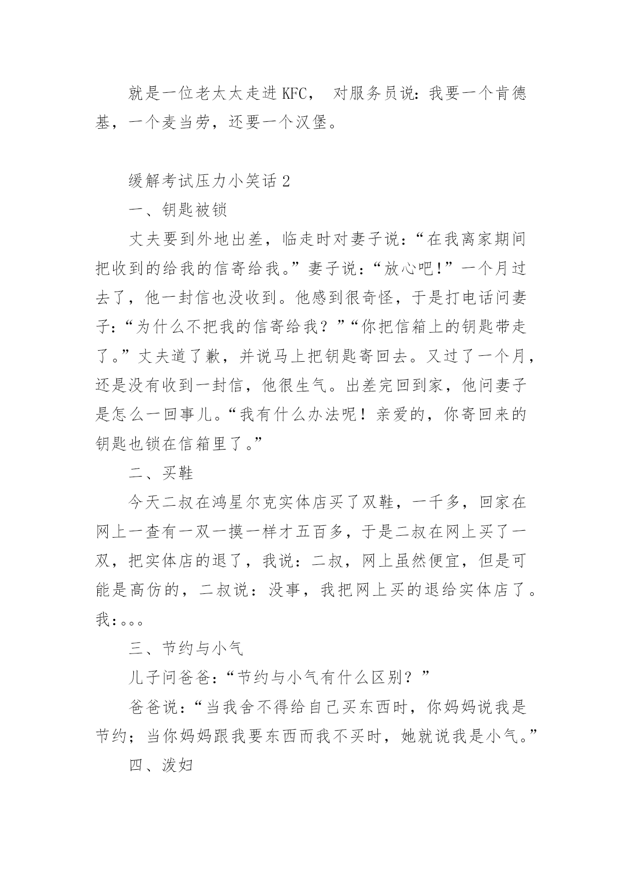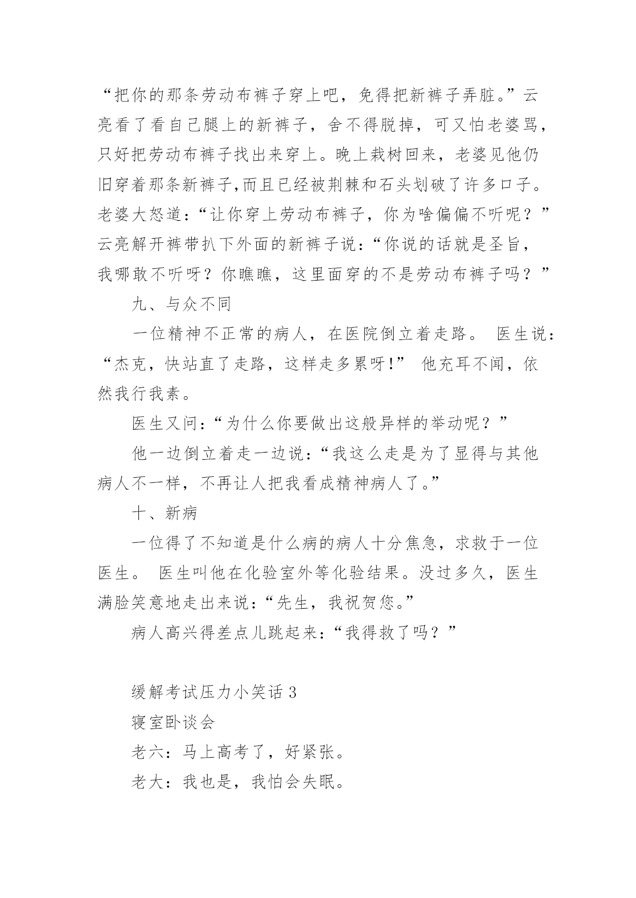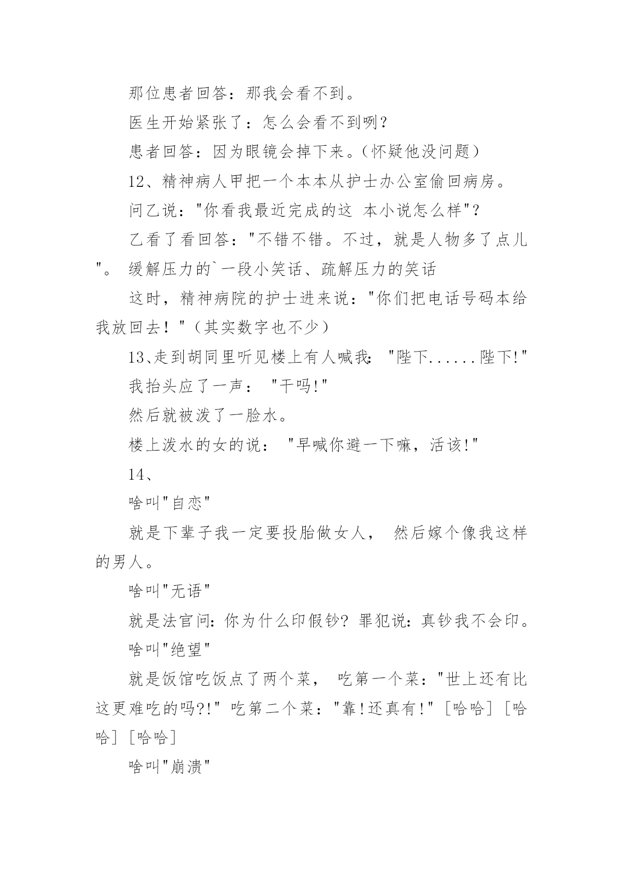 缓解考试压力小笑话笑话也可以是指以一句短语或一个小故事让说话者和听者之间觉得好笑,或是产生幽默感,另外一个行动(动作)型的笑话是以动作影响人的视觉及观感,而感到开心好笑。下面是小编整理的缓解考试压力小笑话,欢迎阅览。缓解考试压力小笑话11、我一同学,男生,每次用电脑看完鬼片都要放一遍大悲咒,说是给电脑压压惊……2、去图书馆自习,坐一妹子旁边时,妹子礼貌地把桌面上书包往自己位置挪了挪,给我腾出空位。我轻声说句“谢谢”,她低头面红嘀咕“我其实是怕你偷东西……”3、老师:“痴迷于网络游戏会让人变的暴力。”学生:“其实游戏并不是让人变暴力的罪魁祸首!”老师:“那是什么?”学生:“机子卡,网络延迟才是真正的罪魁祸首!”4、今天去钓鱼,碰到2个高中生也来玩,问:下午要考试,你们还来钓鱼?鱼放哪儿呀?答:我钓完了放生,好保佑我下午考试能过!5、小时候说狼来了,说了三次就没人相信了!但是同学说老师来了。说了无数次却次次当真!有此可见,老师比狼要可怕的多。6、我参加过一次唱歌节目的海选,评委都是很不专业的,当时我唱了一首梁静茹的《可惜不是你》,唱完后评委给我点评:“首先,我很欣赏你的勇气……”我马上打断他:“评委老师,我唱的不是《勇气》,是《可惜不是你》。”7、停车场进来一男子,我跑过去敬了个礼:“先生您好,这里停车是每小时十块。”“你有病吧!”男子滚着轮椅走了。8、一天晚上,我们和三个朋友在宿舍吃完饭喝了点小酒,几个人商量好一起去不远处的网吧玩,我们借着月光走的小路,在最前面带路的大个子低着头突然撞到了一根电线杆子后猛然的一回头对着后面的几个人喊道:“你们怎么带的路!”9、刚才在浴池洗澡,突然一块香皂掉在脚下。我下意识的扭头,看到一个大爷呲着牙笑着看我,还好我反应及时,淡定的一脚把香皂踹到下水道。大爷一把拉住我:这是我的香皂!10、我减肥的目标就是,去买衣服不要最大码,永远追求更小码。终于我成功了,今天店员对我说:“小姐,这已经是女款最大号了,要不然您试一下男式的小号?”11、有一位神经病院的医生问患者:如果我把你的一只耳朵割掉,你会怎样?那位患者回答:那我会听不到。医生听了:嗯嗯。很正常。医生又问道:那如果我再把你另一只耳朵也割掉,你会怎样?那位患者回答:那我会看不到。医生开始紧张了:怎么会看不到咧?患者回答:因为眼镜会掉下来。(怀疑他没问题)12、精神病人甲把一个本本从护士办公室偷回病房。问乙说:"你看我最近完成的这本小说怎么样"?乙看了看回答:"不错不错。不过,就是人物多了点儿"。缓解压力的`一段小笑话、疏解压力的笑话这时,精神病院的护士进来说:"你们把电话号码本给我放回去!"(其实数字也不少)13、走到胡同里听见楼上有人喊我:"陛下......陛下!"我抬头应了一声:"干吗!"然后就被泼了一脸水。楼上泼水的女的说:"早喊你避一下嘛,活该!"14、啥叫"自恋"就是下辈子我一定要投胎做女人,然后嫁个像我这样的男人。啥叫"无语"就是法官问:你为什么印假钞?罪犯说:真钞我不会印。啥叫"绝望"就是饭馆吃饭点了两个菜,吃第一个菜:"世上还有比这更难吃的吗?!"吃第二个菜:"靠!还真有!"[哈哈][哈哈][哈哈]啥叫"崩溃"就是一位老太太走进KFC,对服务员说:我要一个肯德基,一个麦当劳,还要一个汉堡。缓解考试压力小笑话2一、钥匙被锁丈夫要到外地出差,临走时对妻子说:“在我离家期间把收到的给我的信寄给我。”妻子说:“放心吧!”一个月过去了,他一封信也没收到。他感到很奇怪,于是打电话问妻子:“为什么不把我的信寄给我?”“你把信箱上的钥匙带走了。”丈夫道了歉,并说马上把钥匙寄回去。又过了一个月,还是没有收到一封信,他很生气。出差完回到家,他问妻子是怎么一回事儿。“我有什么办法呢!亲爱的,你寄回来的钥匙也锁在信箱里了。”二、买鞋今天二叔在鸿星尔克实体店买了双鞋,一千多,回家在网上一查有一双一摸一样才五百多,于是二叔在网上买了一双,把实体店的退了,我说:二叔,网上虽然便宜,但是可能是高仿的,二叔说:没事,我把网上买的退给实体店了。我:。。。三、节约与小气儿子问爸爸:“节约与小气有什么区别?”爸爸说:“当我舍不得给自己买东西时,你妈妈说我是节约;当你妈妈跟我要东西而我不买时,她就说我是小气。”四、泼妇孩子问:“妈妈,为什么许多人叫你泼妇?”母亲答:“那是他们表扬妈妈是个活泼的妇女!”五、延寿妙招午时三刻,烈日当空,监斩官下令:“斩!”突然死囚一阵哈哈大笑!监斩官问道:“你因何发笑?”死囚迟疑片刻道:“专家没说错,笑一笑可延长寿命5秒!”六、吃吸尘器丈夫抱回家一台吸尘器,兴奋地对妻子说:“我为你买了世界上最好的吸尘器。”说着,他把咖啡末、烟灰……撒在客厅的地毯上,“不信你看,只要我手按按钮,这些垃圾立即消失得无影无踪,否则,我顿时把它们吃下去。”妻子听了,