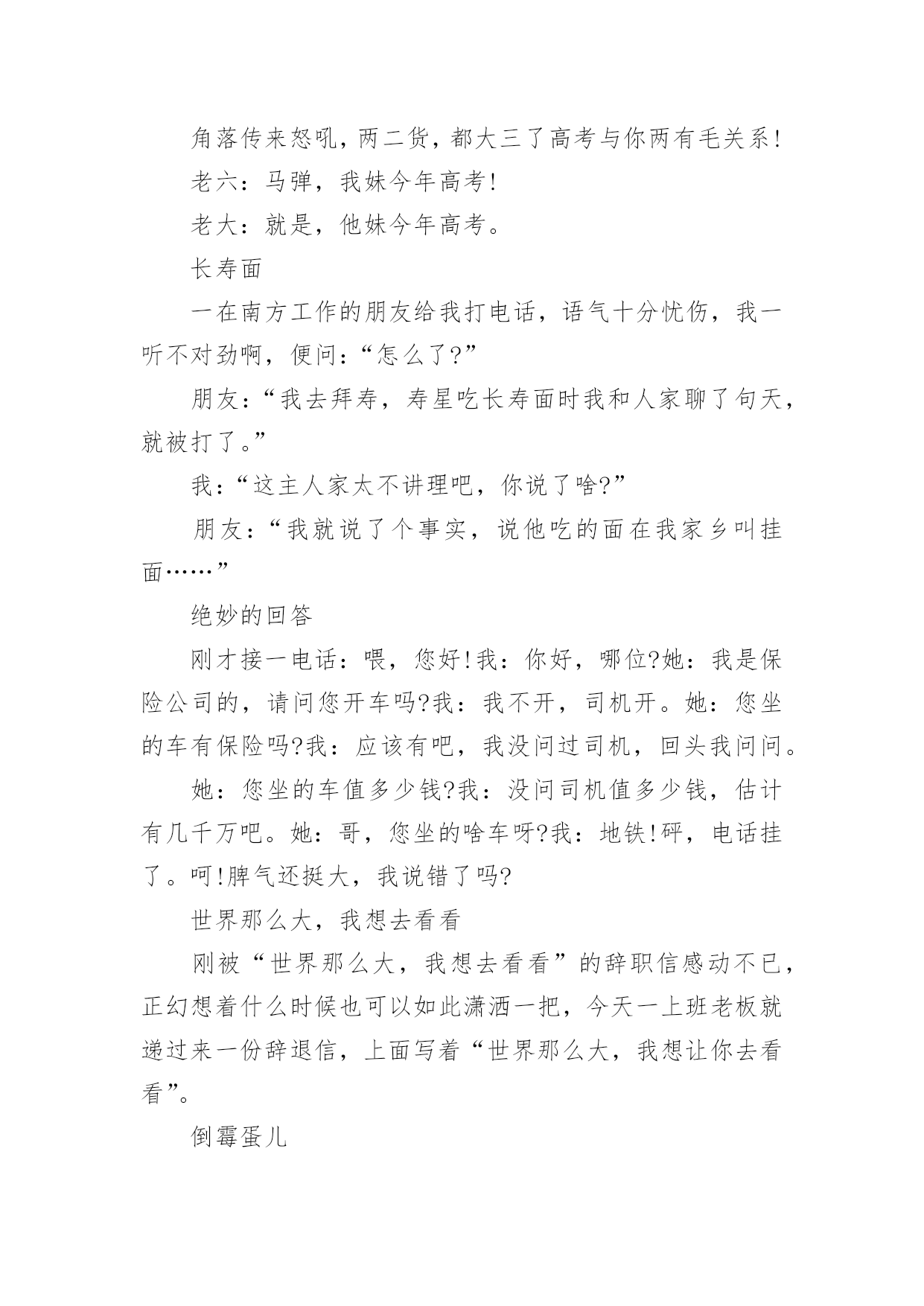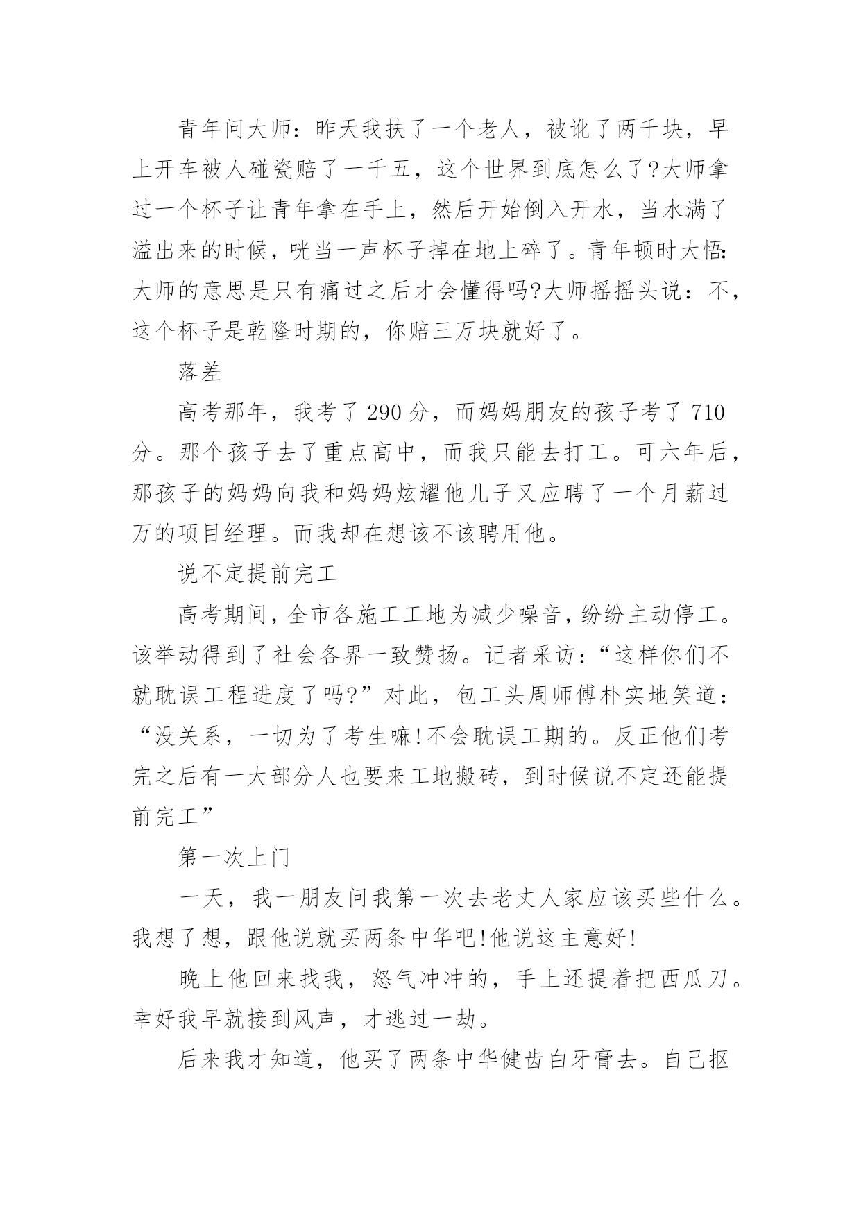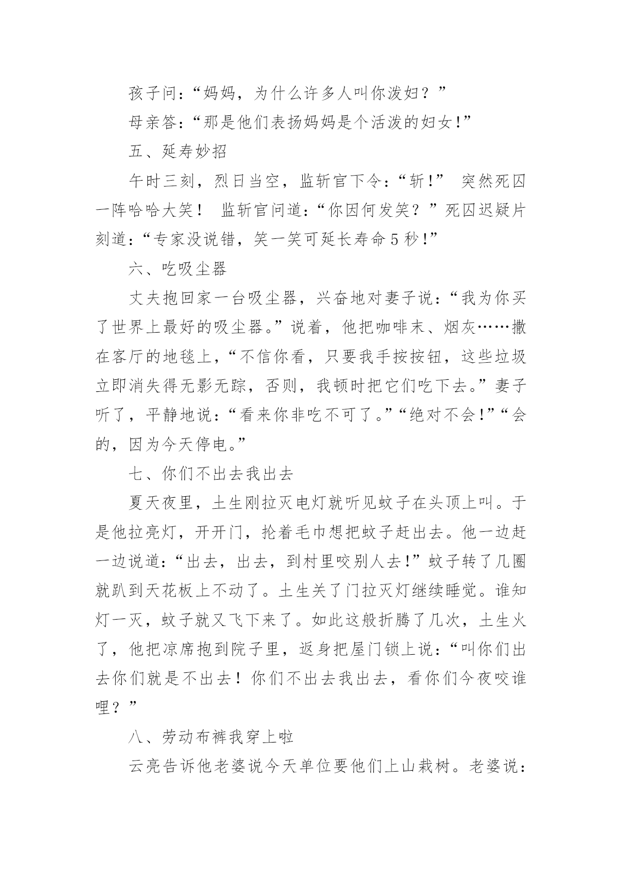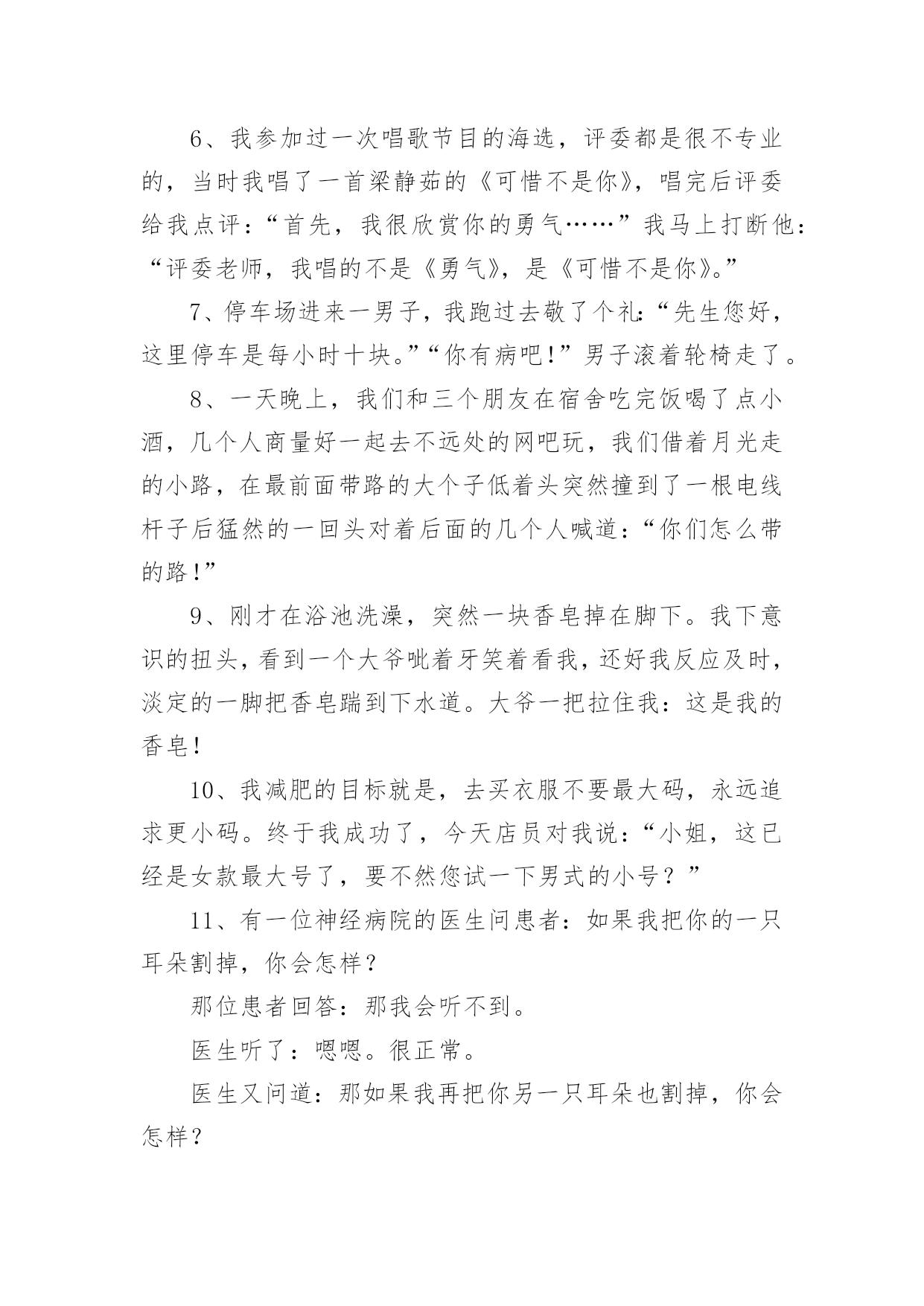 缓解考试压力小笑话笑话也可以是指以一句短语或一个小故事让说话者和听者之间觉得好笑,或是产生幽默感,另外一个行动(动作)型的笑话是以动作影响人的视觉及观感,而感到开心好笑。下面是小编整理的缓解考试压力小笑话,欢迎阅览。缓解考试压力小笑话11、我一同学,男生,每次用电脑看完鬼片都要放一遍大悲咒,说是给电脑压压惊……2、去图书馆自习,坐一妹子旁边时,妹子礼貌地把桌面上书包往自己位置挪了挪,给我腾出空位。我轻声说句“谢谢”,她低头面红嘀咕“我其实是怕你偷东西……”3、老师:“痴迷于网络游戏会让人变的暴力。”学生:“其实游戏并不是让人变暴力的罪魁祸首!”老师:“那是什么?”学生:“机子卡,网络延迟才是真正的罪魁祸首!”4、今天去钓鱼,碰到2个高中生也来玩,问:下午要考试,你们还来钓鱼?鱼放哪儿呀?答:我钓完了放生,好保佑我下午考试能过!5、小时候说狼来了,说了三次就没人相信了!但是同学说老师来了。说了无数次却次次当真!有此可见,老师比狼要可怕的多。6、我参加过一次唱歌节目的海选,评委都是很不专业的,当时我唱了一首梁静茹的《可惜不是你》,唱完后评委给我点评:“首先,我很欣赏你的勇气……”我马上打断他:“评委老师,我唱的不是《勇气》,是《可惜不是你》。”7、停车场进来一男子,我跑过去敬了个礼:“先生您好,这里停车是每小时十块。”“你有病吧!”男子滚着轮椅走了。8、一天晚上,我们和三个朋友在宿舍吃完饭喝了点小酒,几个人商量好一起去不远处的网吧玩,我们借着月光走的小路,在最前面带路的大个子低着头突然撞到了一根电线杆子后猛然的一回头对着后面的几个人喊道:“你们怎么带的路!”9、刚才在浴池洗澡,突然一块香皂掉在脚下。我下意识的扭头,看到一个大爷呲着牙笑着看我,还好我反应及时,淡定的一脚把香皂踹到下水道。大爷一把拉住我:这是我的香皂!10、我减肥的目标就是,去买衣服不要最大码,永远追求更小码。终于我成功了,今天店员对我说:“小姐,这已经是女款最大号了,要不然您试一下男式的小号?”11、有一位神经病院的医生问患者:如果我把你的一只耳朵割掉,你会怎样?那位患者回答:那我会听不到。医生听了:嗯嗯。很正常。医生又问道:那如果我再把你另一只耳朵也割掉,你会怎样?那位患者回答:那我会看不到。医生开始紧张了:怎么会看不到咧?患者回答:因为眼镜会掉下来。(怀疑他没问题)12、精神病人甲把一个本本从护士办公室偷回病房。问乙说:"你看我最近完成的这本小说怎么样"?乙看了看回答:"不错不错。不过,就是人物多了点儿"。缓解压力的`一段小笑话、疏解压力的笑话这时,精神病院的护士进来说:"你们把电话号码本给我放回去!"(其实数字也不少)13、走到胡同里听见楼上有人喊我:"陛下......陛下!"我抬头应了一声:"干吗!"然后就被泼了一脸水。楼上泼水的女的说:"早喊你避一下嘛,活该!"14、啥叫"自恋"就是下辈子我一定要投胎做女人,然后嫁个像我这样的男人。啥叫"无语"就是法官问:你为什么印假钞?罪犯说:真钞我不会印。啥叫"绝望"就是饭馆吃饭点了两个菜,吃第一个菜:"世上还有比这更难吃的吗?!"吃第二个菜:"靠!还真有!"[哈哈][哈哈][哈哈]啥叫"崩溃"就是一位老太太走进KFC,对服务员说:我要一个肯德基,一个麦当劳,还要一个汉堡。缓解考试压力小笑话2一、钥匙被锁丈夫要到外地出差,临走时对妻子说:“在我离家期间把收到的给我的信寄给我。”妻子说:“放心吧!”一个月过去了,他一封信也没收到。他感到很奇怪,于是打电话问妻子:“为什么不把我的信寄给我?”“你把信箱上的钥匙带走了。”丈夫道了歉,并说马上把钥匙寄回去。又过了一个月,还是没有收到一封信,他很生气。出差完回到家,他问妻子是怎么一回事儿。“我有什么办法呢!亲爱的,你寄回来的钥匙也锁在信箱里了。”二、买鞋今天二叔在鸿星尔克实体店买了双鞋,一千多,回家在网上一查有一双一摸一样才五百多,于是二叔在网上买了一双,把实体店的退了,我说:二叔,网上虽然便宜,但是可能是高仿的,二叔说:没事,我把网上买的退给实体店了。我:。。。三、节约与小气儿子问爸爸:“节约与小气有什么区别?”爸爸说:“当我舍不得给自己买东西时,你妈妈说我是节约;当你妈妈跟我要东西而我不买时,她就说我是小气。”四、泼妇孩子问:“妈妈,为什么许多人叫你泼妇?”母亲答:“那是他们表扬妈妈是个活泼的妇女!”五、延寿妙招午时三刻,烈日当空,监斩官下令:“斩!”突然死囚一阵哈哈大笑!监斩官问道:“你因何发笑?”死囚迟疑片刻道:“专家没说错,笑一笑可延长寿命5秒!”六、吃吸尘器丈夫抱回家一台吸尘器,兴奋地对妻子说:“我为你买了世界上最好的吸尘器。”说着,他把咖啡末、烟灰……撒在客厅的地毯上,“不信你看,只要我手按按钮,这些垃圾立即消失得无影无踪,否则,我顿时把它们吃下去。”妻子听了,