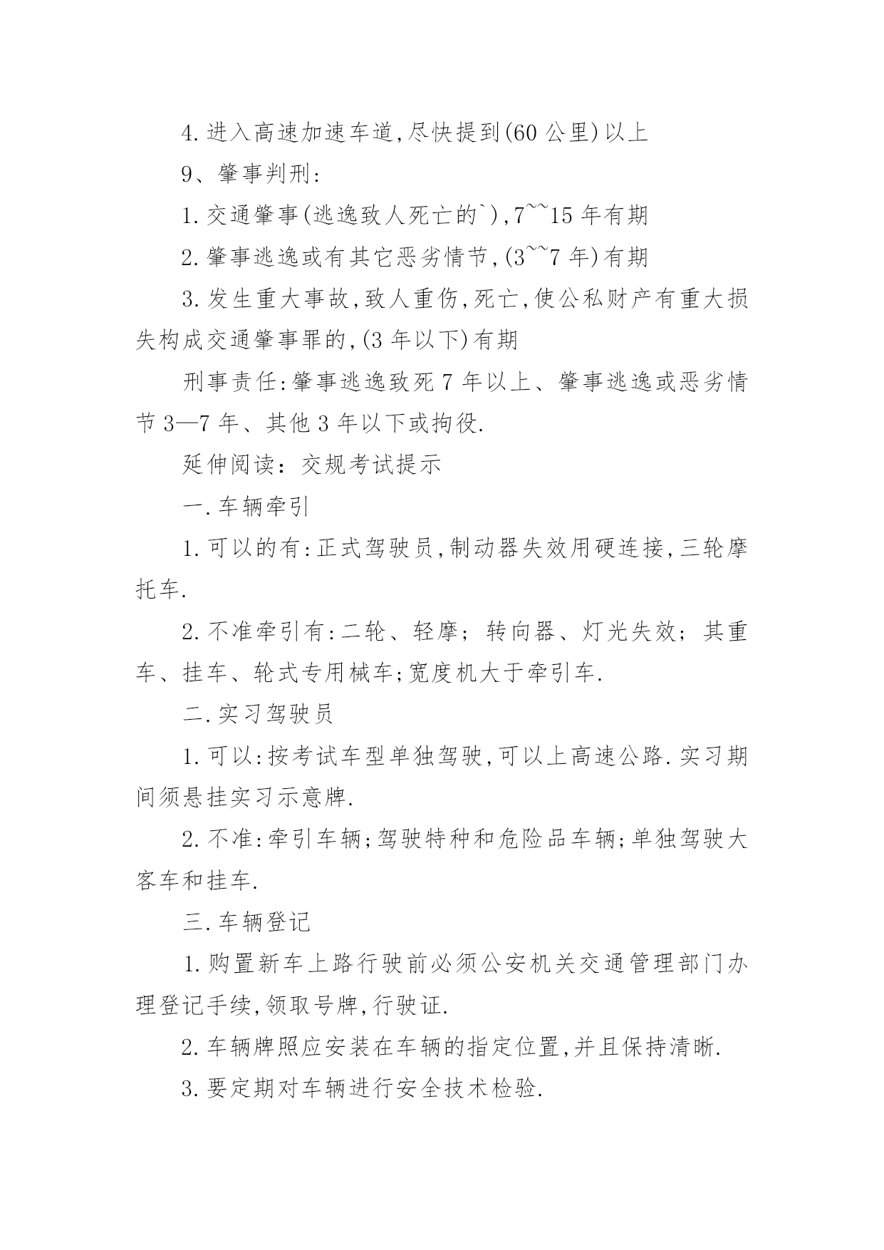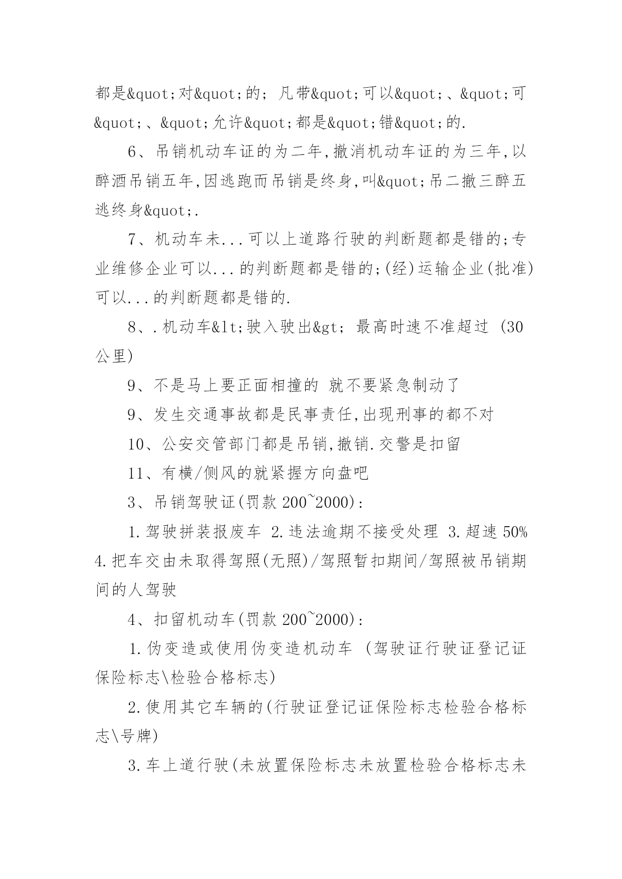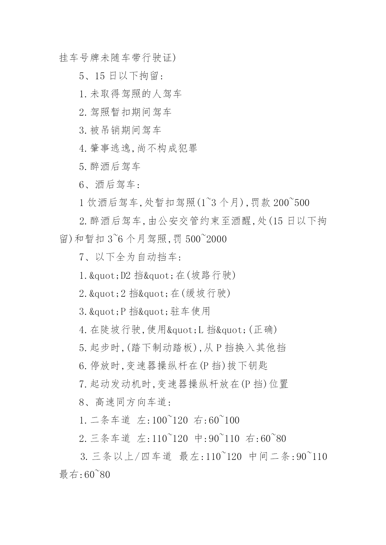 科目一考试口诀解析科目一考试口诀解析科目一考试口诀简单易懂,词义明确,而且,最重要的是该口诀比较好记,以下是小编为您整理的科目一考试口诀解析相关资料,欢迎阅读!1、题目里有"口"的选50米,有"站"的选30米,叫"口五站三"剩下的全选150米,没有150的选最大.判断题全对.解析:1:车在<公交站>(30米)以内,不得停车.2、车在<距交叉路口>(50米)以内不得停车1、有关公里的题目:城市街道选50公里,其余有30的全选30.2、有"不得停车"的选择"不得停车"3、危险知识:题目里找"不需要""不受""可以""三层""坚固无损"是错的,其余都是对的.4、高速公路有关"不允许的行为"规定的选择题:选带"不准"、"不得"的答案;5、判断题:只有"远心端"和"软质担架"是错的,其余都是对的.6、判断题:带"不得"、"不准"的都是"对"的;凡带"可以"、"可"、"允许"都是"错"的.6、吊销机动车证的为二年,撤消机动车证的为三年,以醉酒吊销五年,因逃跑而吊销是终身,叫"吊二撤三醉五逃终身".7、机动车未...可以上道路行驶的判断题都是错的;专业维修企业可以...的判断题都是错的;(经)运输企业(批准)可以...的判断题都是错的.8、.机动车<驶入驶出>最高时速不准超过(30公里)9、不是马上要正面相撞的就不要紧急制动了9、发生交通事故都是民事责任,出现刑事的都不对10、公安交管部门都是吊销,撤销.交警是扣留11、有横/侧风的就紧握方向盘吧3、吊销驾驶证(罚款200~2000):1.驾驶拼装报废车2.违法逾期不接受处理3.超速50%4.把车交由未取得驾照(无照)/驾照暂扣期间/驾照被吊销期间的人驾驶4、扣留机动车(罚款200~2000):1.伪变造或使用伪变造机动车(驾驶证行驶证登记证保险标志\检验合格标志)2.使用其它车辆的(行驶证登记证保险标志检验合格标志\号牌)3.车上道行驶(未放置保险标志未放置检验合格标志未挂车号牌未随车带行驶证)5、15日以下拘留:1.未取得驾照的人驾车2.驾照暂扣期间驾车3.被吊销期间驾车4.肇事逃逸,尚不构成犯罪5.醉酒后驾车6、酒后驾车:1饮酒后驾车,处暂扣驾照(1~3个月),罚款200~5002.醉酒后驾车,由公安交管约束至酒醒,处(15日以下拘留)和暂扣3~6个月驾照,罚500~20007、以下全为自动挡车:1."D2挡"在(坡路行驶)2."2挡"在(缓坡行驶)3."P挡"驻车使用4.在陡坡行驶,使用"L挡"(正确)5.起步时,(踏下制动踏板),从P挡换入其他挡6.停放时,变速器操纵杆在(P挡)拔下钥匙7.起动发动机时,变速器操纵杆放在(P挡)位置8、高速同方向车道:1.二条车道左:100~120右:60~1002.三条车道左:110~120中:90~110右:60~803.三条以上/四车道最左:110~120中间二条:90~110最右:60~804.进入高速加速车道,尽快提到(60公里)以上9、肇事判刑:1.交通肇事(逃逸致人死亡的`),7~~15年有期2.肇事逃逸或有其它恶劣情节,(3~~7年)有期3.发生重大事故,致人重伤,死亡,使公私财产有重大损失构成交通肇事罪的,(3年以下)有期刑事责任:肇事逃逸致死7年以上、肇事逃逸或恶劣情节3—7年、其他3年以下或拘役.延伸阅读:交规考试提示一.车辆牵引1.可以的有:正式驾驶员,制动器失效用硬连接,三轮摩托车.2.不准牵引有:二轮、轻摩;转向器、灯光失效;其重车、挂车、轮式专用械车;宽度机大于牵引车.二.实习驾驶员1.可以:按考试车型单独驾驶,可以上高速公路.实习期间须悬挂实习示意牌.2.不准:牵引车辆;驾驶特种和危险品车辆;单独驾驶大客车和挂车.三.车辆登记1.购置新车上路行驶前必须公安机关交通管理部门办理登记手续,领取号牌,行驶证.2.车辆牌照应安装在车辆的指定位置,并且保持清晰.3.要定期对车辆进行安全技术检验.4.机动车号牌和行驶证不准转借、涂改、伪造.5.达到报废的车辆要注销登记.四.鸣喇叭1.可以:鸣三次,鸣半秒钟.行车中遇到畜力车时,尽量少鸣喇叭.2.不准:郊外高音喇
