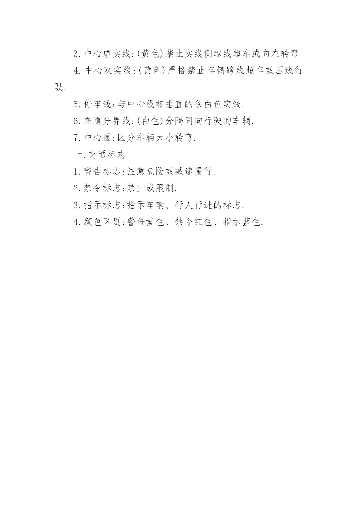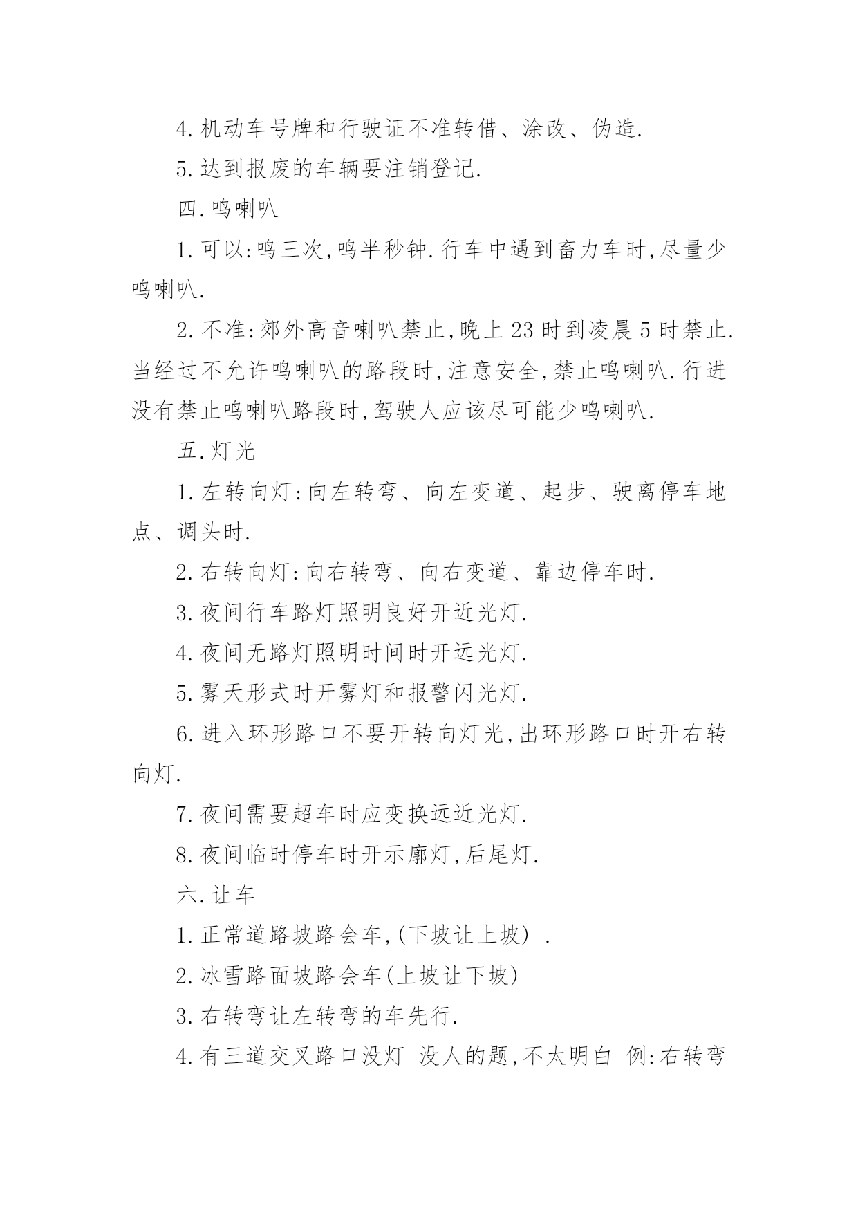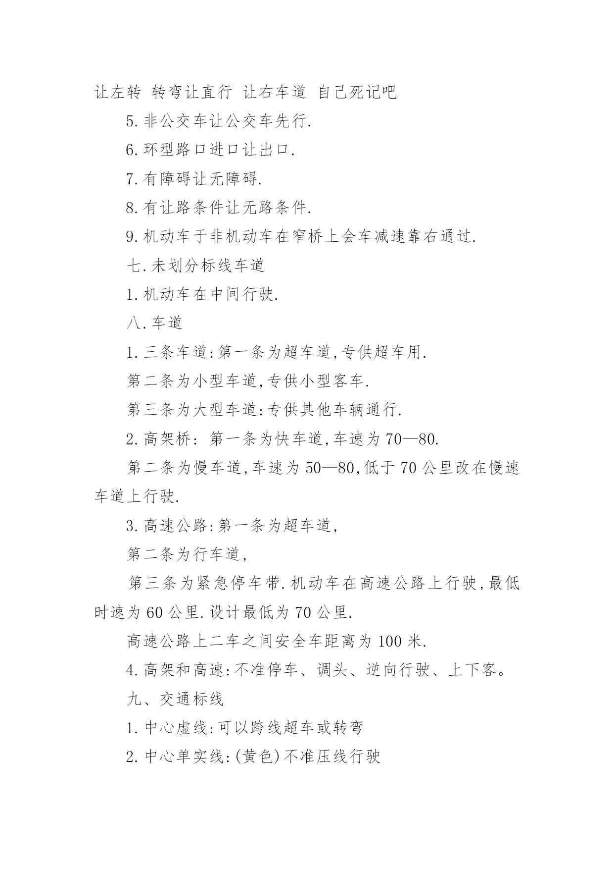 科目一考试口诀解析科目一考试口诀解析科目一考试口诀简单易懂,词义明确,而且,最重要的是该口诀比较好记,以下是小编为您整理的科目一考试口诀解析相关资料,欢迎阅读!1、题目里有"口"的选50米,有"站"的选30米,叫"口五站三"剩下的全选150米,没有150的选最大.判断题全对.解析:1:车在<公交站>(30米)以内,不得停车.2、车在<距交叉路口>(50米)以内不得停车1、有关公里的题目:城市街道选50公里,其余有30的全选30.2、有"不得停车"的选择"不得停车"3、危险知识:题目里找"不需要""不受""可以""三层""坚固无损"是错的,其余都是对的.4、高速公路有关"不允许的行为"规定的选择题:选带"不准"、"不得"的答案;5、判断题:只有"远心端"和"软质担架"是错的,其余都是对的.6、判断题:带"不得"、"不准"的都是"对"的;凡带"可以"、"可"、"允许"都是"错"的.6、吊销机动车证的为二年,撤消机动车证的为三年,以醉酒吊销五年,因逃跑而吊销是终身,叫"吊二撤三醉五逃终身".7、机动车未...可以上道路行驶的判断题都是错的;专业维修企业可以...的判断题都是错的;(经)运输企业(批准)可以...的判断题都是错的.8、.机动车<驶入驶出>最高时速不准超过(30公里)9、不是马上要正面相撞的就不要紧急制动了9、发生交通事故都是民事责任,出现刑事的都不对10、公安交管部门都是吊销,撤销.交警是扣留11、有横/侧风的就紧握方向盘吧3、吊销驾驶证(罚款200~2000):1.驾驶拼装报废车2.违法逾期不接受处理3.超速50%4.把车交由未取得驾照(无照)/驾照暂扣期间/驾照被吊销期间的人驾驶4、扣留机动车(罚款200~2000):1.伪变造或使用伪变造机动车(驾驶证行驶证登记证保险标志\检验合格标志)2.使用其它车辆的(行驶证登记证保险标志检验合格标志\号牌)3.车上道行驶(未放置保险标志未放置检验合格标志未挂车号牌未随车带行驶证)5、15日以下拘留:1.未取得驾照的人驾车2.驾照暂扣期间驾车3.被吊销期间驾车4.肇事逃逸,尚不构成犯罪5.醉酒后驾车6、酒后驾车:1饮酒后驾车,处暂扣驾照(1~3个月),罚款200~5002.醉酒后驾车,由公安交管约束至酒醒,处(15日以下拘留)和暂扣3~6个月驾照,罚500~20007、以下全为自动挡车:1."D2挡"在(坡路行驶)2."2挡"在(缓坡行驶)3."P挡"驻车使用4.在陡坡行驶,使用"L挡"(正确)5.起步时,(踏下制动踏板),从P挡换入其他挡6.停放时,变速器操纵杆在(P挡)拔下钥匙7.起动发动机时,变速器操纵杆放在(P挡)位置8、高速同方向车道:1.二条车道左:100~120右:60~1002.三条车道左:110~120中:90~110右:60~803.三条以上/四车道最左:110~120中间二条:90~110最右:60~804.进入高速加速车道,尽快提到(60公里)以上9、肇事判刑:1.交通肇事(逃逸致人死亡的`),7~~15年有期2.肇事逃逸或有其它恶劣情节,(3~~7年)有期3.发生重大事故,致人重伤,死亡,使公私财产有重大损失构成交通肇事罪的,(3年以下)有期刑事责任:肇事逃逸致死7年以上、肇事逃逸或恶劣情节3—7年、其他3年以下或拘役.延伸阅读:交规考试提示一.车辆牵引1.可以的有:正式驾驶员,制动器失效用硬连接,三轮摩托车.2.不准牵引有:二轮、轻摩;转向器、灯光失效;其重车、挂车、轮式专用械车;宽度机大于牵引车.二.实习驾驶员1.可以:按考试车型单独驾驶,可以上高速公路.实习期间须悬挂实习示意牌.2.不准:牵引车辆;驾驶特种和危险品车辆;单独驾驶大客车和挂车.三.车辆登记1.购置新车上路行驶前必须公安机关交通管理部门办理登记手续,领取号牌,行驶证.2.车辆牌照应安装在车辆的指定位置,并且保持清晰.3.要定期对车辆进行安全技术检验.4.机动车号牌和行驶证不准转借、涂改、伪造.5.达到报废的车辆要注销登记.四.鸣喇叭1.可以:鸣三次,鸣半秒钟.行车中遇到畜力车时,尽量少鸣喇叭.2.不准:郊外高音喇