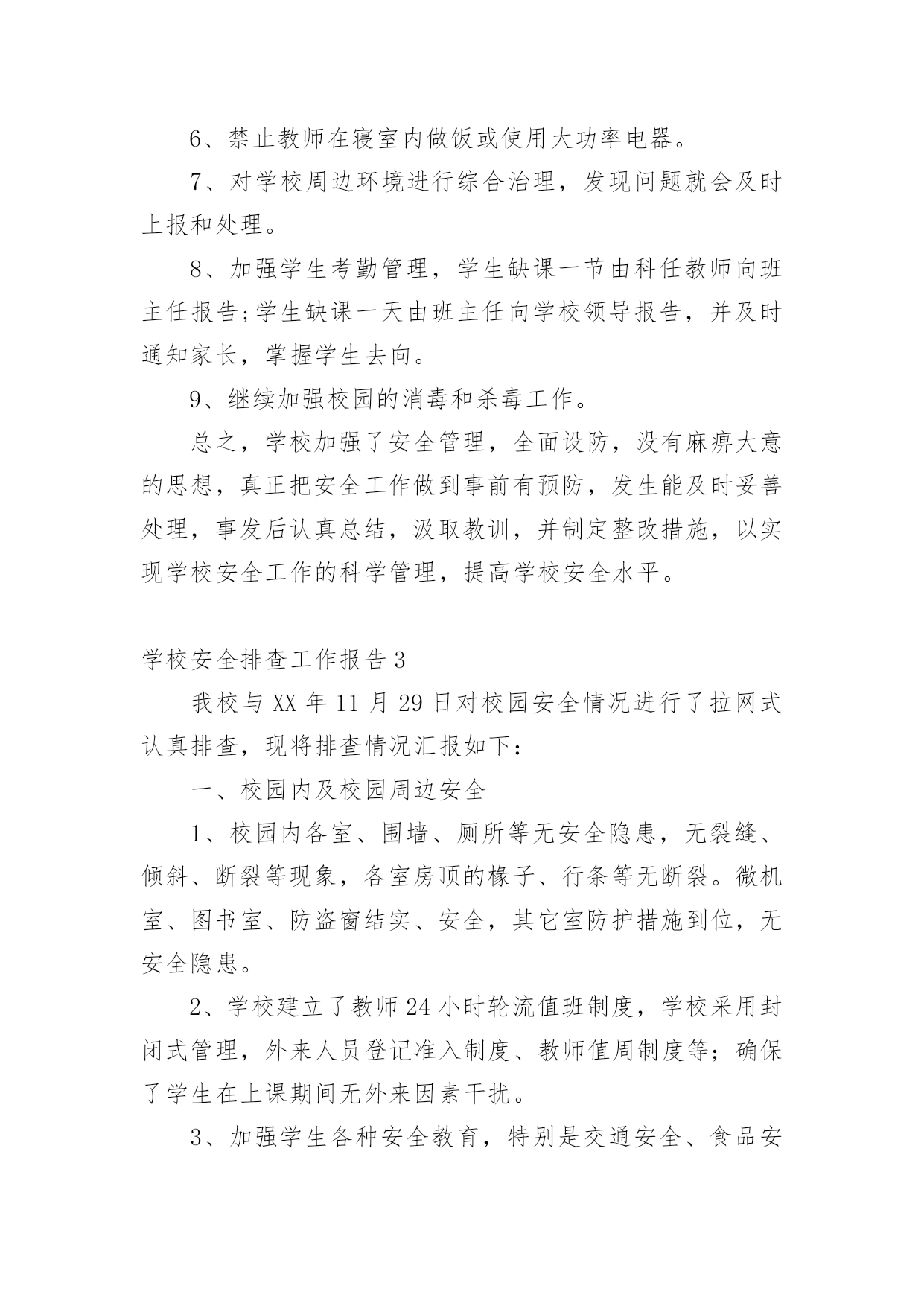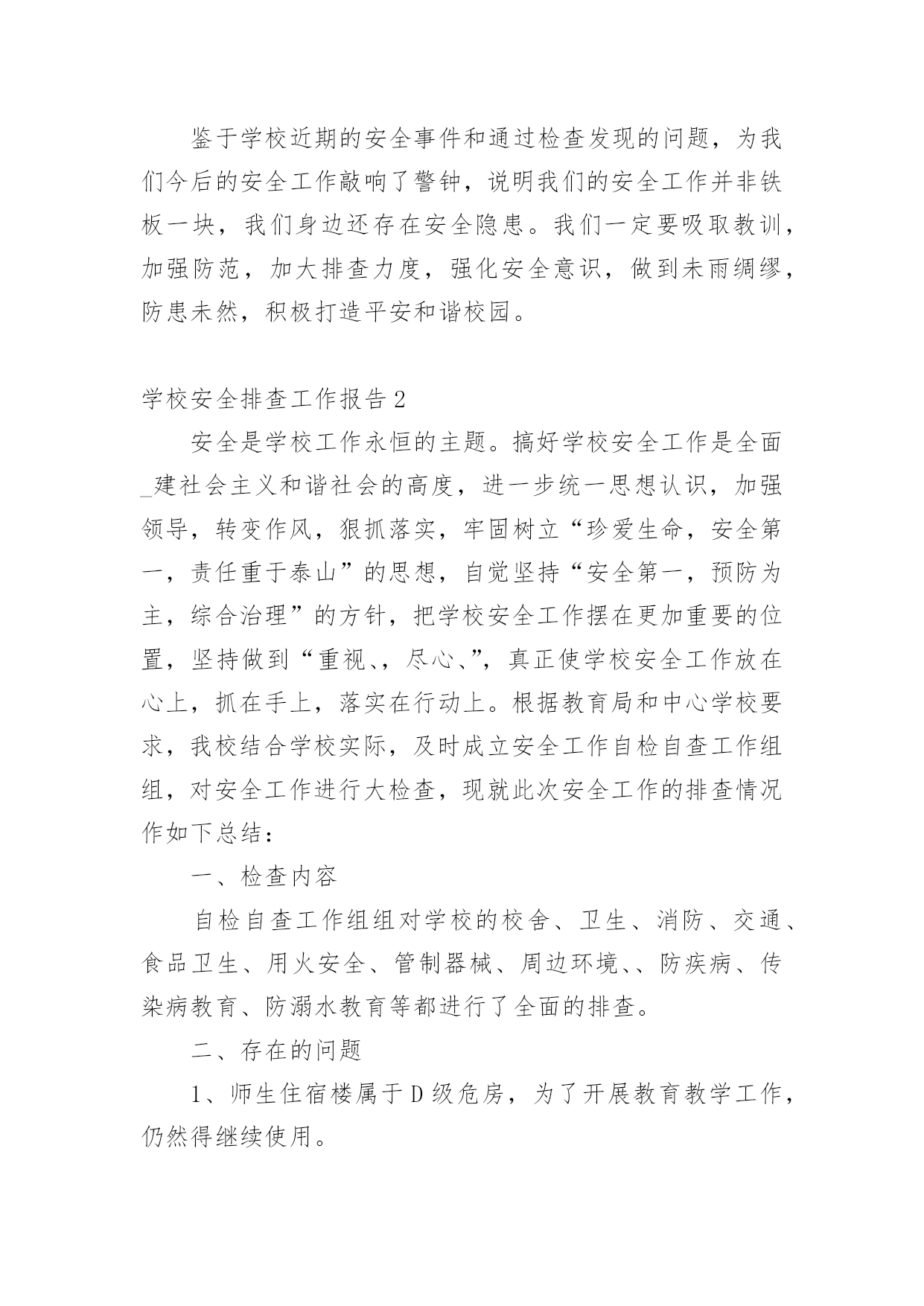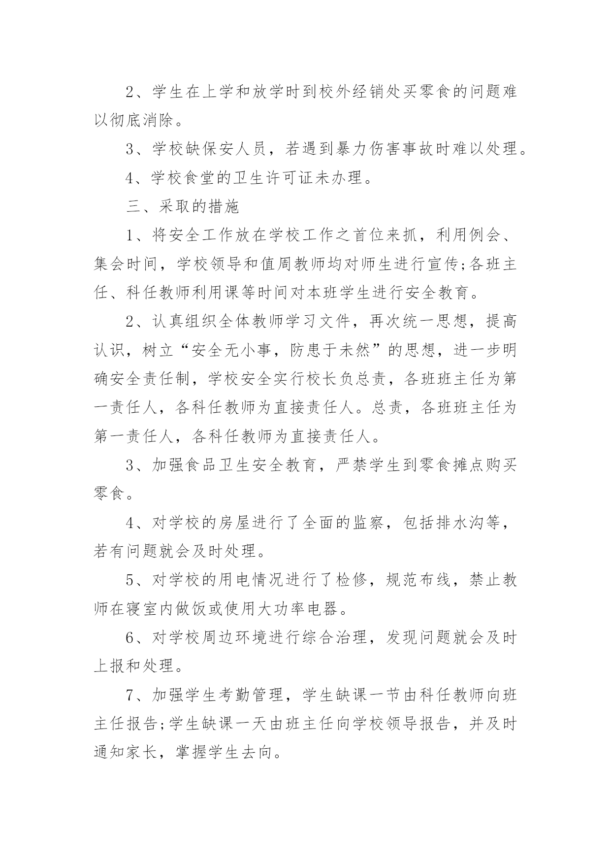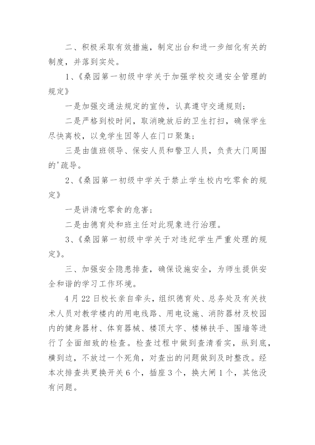 学校安全排查工作报告在人们越来越注重自身素养的今天,报告的使用频率呈上升趋势,报告中提到的所有信息应该是准确无误的。那么你真正懂得怎么写好报告吗?下面是小编为大家整理的学校安全排查工作报告,仅供参考,希望能够帮助到大家。学校安全排查工作报告1近期学校安全事故频频发生,引起各级部门的高度重视,加强学生安全教育,确保师生的政治高度进一步提升。4月19日学区在运河小学召开安全工作现场会,对学区近期安全工作进行了布署,并要求以近期的几起安全事故为鉴,加大安全工作的宣传力度,积极采取有效措施,坚决杜绝类似事故的发生。会后,我校召开班子会,按照学区要求,结合学校实际情况,对学校安全工作现状和存在的问题进行了深刻剖析,制定措施,堵塞漏洞,强化责任,积极整改。一、提高认识,强化意识增强安全工作的危机感和紧迫感,紧急召开班主任会,及时传达上级有关文件精神,要求牢固树立责任重于泰山的思想意识,安全工作来不得半点的马虎和麻痹,各班要积极开展形式多样的宣传教育,使安全意识深深烙在每个人的脑海里。二、积极采取有效措施,制定出台和进一步细化有关的制度,并落到实处。1、《桑园第一初级中学关于加强学校交通安全管理的规定》一是加强交通法规定的宣传,认真遵守交通规则;二是严格到校时间,取消晚放后的卫生打扫,确保学生尽快离校,以免学生因等人在门口聚集;三是由值班领导、保安人员和警卫人员,负责大门周围的'疏导。2、《桑园第一初级中学关于禁止学生校内吃零食的规定》一是讲清吃零食的危害;二是由德育处和班主任对此现象进行治理。3、《桑园第一初级中学关于对违纪学生严重处理的规定》。三、加强安全隐患排查,确保设施安全,为师生提供安全和谐的学习工作环境。4月22日校长亲自牵头,组织德育处、总务处及有关技术人员对教学楼内的用电线路、用电设施、消防器材及校园内的健身器材、体育器械、楼顶大字、楼梯扶手、围墙等进行了全面细致的检查。检查过程中做到查清看实,纵到底,横到边,不放过一个死角,对查出的问题做到及时整改。经本次排查共更换开关6个,插座3个,换大闸1个,其他没有问题。鉴于学校近期的安全事件和通过检查发现的问题,为我们今后的安全工作敲响了警钟,说明我们的安全工作并非铁板一块,我们身边还存在安全隐患。我们一定要吸取教训,加强防范,加大排查力度,强化安全意识,做到未雨绸缪,防患未然,积极打造平安和谐校园。学校安全排查工作报告2安全是学校工作永恒的主题。搞好学校安全工作是全面_建社会主义和谐社会的高度,进一步统一思想认识,加强领导,转变作风,狠抓落实,牢固树立“珍爱生命,安全第一,责任重于泰山”的思想,自觉坚持“安全第一,预防为主,综合治理”的方针,把学校安全工作摆在更加重要的位置,坚持做到“重视、,尽心、”,真正使学校安全工作放在心上,抓在手上,落实在行动上。根据教育局和中心学校要求,我校结合学校实际,及时成立安全工作自检自查工作组组,对安全工作进行大检查,现就此次安全工作的排查情况作如下总结:一、检查内容自检自查工作组组对学校的校舍、卫生、消防、交通、食品卫生、用火安全、管制器械、周边环境、、防疾病、传染病教育、防溺水教育等都进行了全面的排查。二、存在的问题1、师生住宿楼属于D级危房,为了开展教育教学工作,仍然得继续使用。2、学生在上学和放学时到校外经销处买零食的问题难以彻底消除。3、学校缺保安人员,若遇到暴力伤害事故时难以处理。4、学校食堂的卫生许可证未办理。三、采取的措施1、将安全工作放在学校工作之首位来抓,利用例会、集会时间,学校领导和值周教师均对师生进行宣传;各班主任、科任教师利用课等时间对本班学生进行安全教育。2、认真组织全体教师学习文件,再次统一思想,提高认识,树立“安全无小事,防患于未然”的思想,进一步明确安全责任制,学校安全实行校长负总责,各班班主任为第一责任人,各科任教师为直接责任人。总责,各班班主任为第一责任人,各科任教师为直接责任人。3、加强食品卫生安全教育,严禁学生到零食摊点购买零食。4、对学校的房屋进行了全面的监察,包括排水沟等,若有问题就会及时处理。5、对学校的用电情况进行了检修,规范布线,禁止教师在寝室内做饭或使用大功率电器。6、对学校周边环境进行综合治理,发现问题就会及时上报和处理。7、加强学生考勤管理,学生缺课一节由科任教师向班主任报告;学生缺课一天由班主任向学校领导报告,并及时通知家长,掌握学生去向。8、安排教师及时办理食堂卫生许可证。9、加强了校园的消毒和杀毒工作。四、需上级协助办理的事1、师生住宿楼属于D级危房,望各级协调后及时立项处理。2、取消离学校较近的小卖部。3、为学校配备保安人员。五、今后的工作1、继续将安全工作放在学校工作之首位来抓,利用例会、集会时间,学校领导和值周教师均对师生进行安全知识宣传;各班主任、科任教师利用班会课等时间