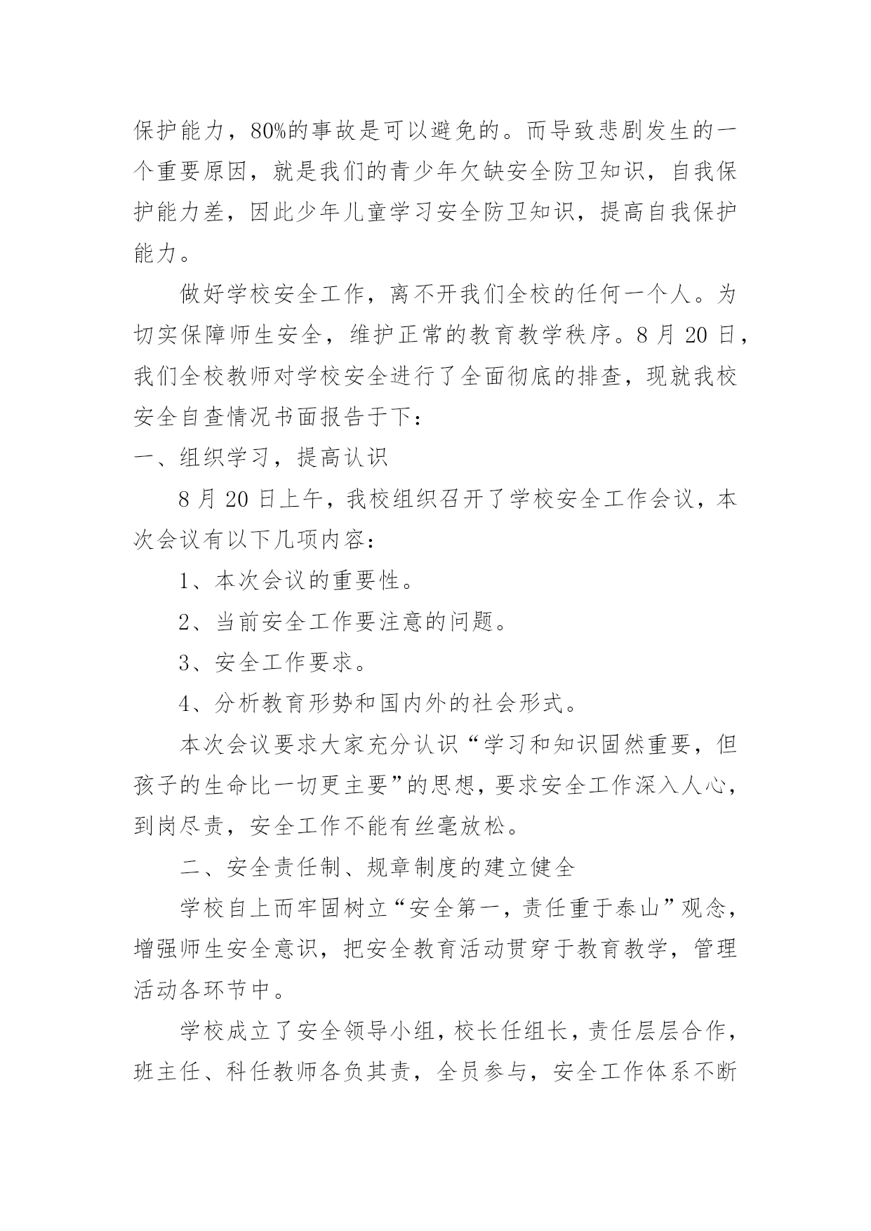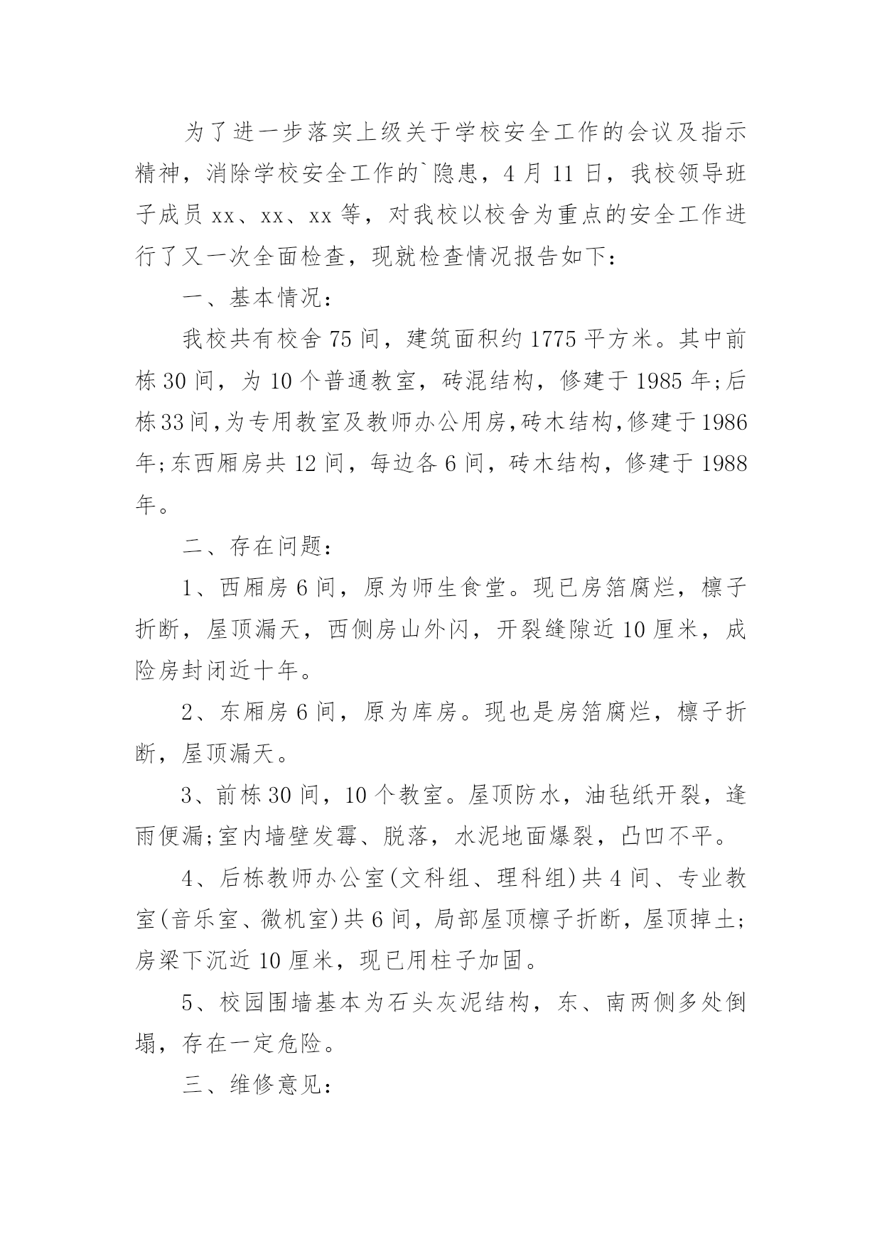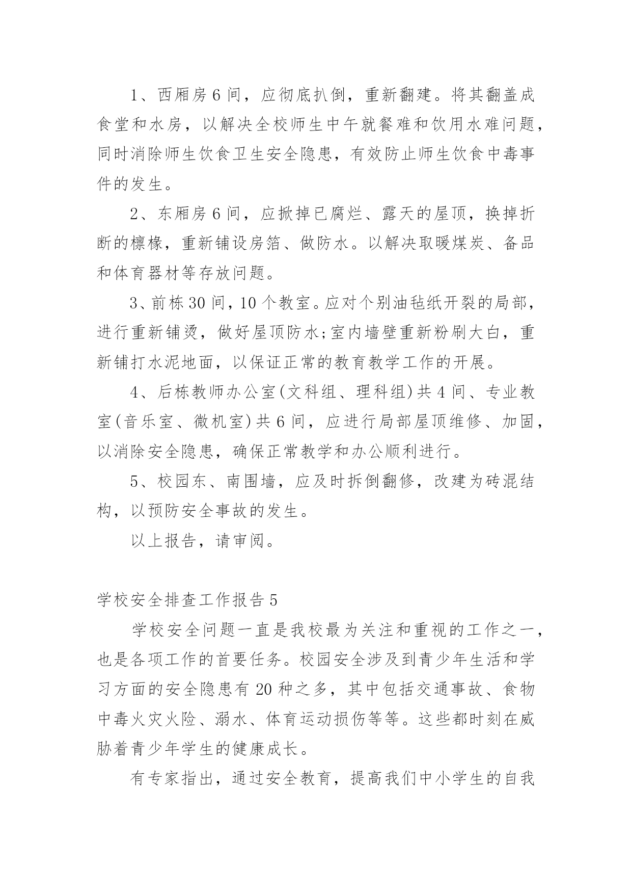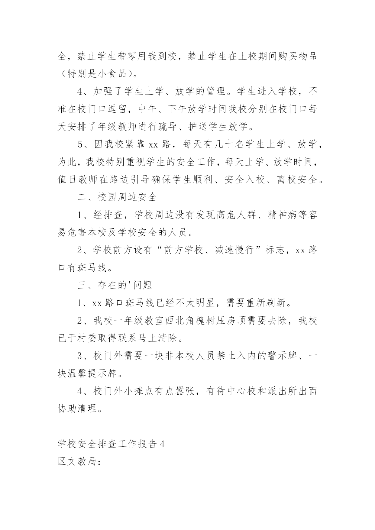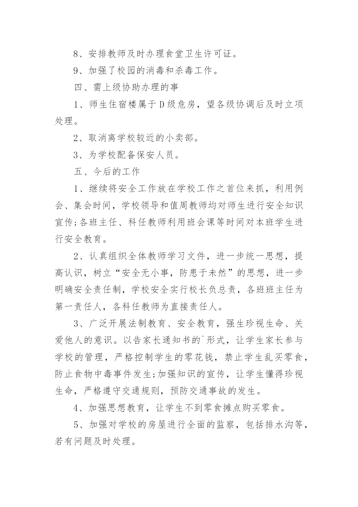 学校安全排查工作报告在人们越来越注重自身素养的今天,报告的使用频率呈上升趋势,报告中提到的所有信息应该是准确无误的。那么你真正懂得怎么写好报告吗?下面是小编为大家整理的学校安全排查工作报告,仅供参考,希望能够帮助到大家。学校安全排查工作报告1近期学校安全事故频频发生,引起各级部门的高度重视,加强学生安全教育,确保师生的政治高度进一步提升。4月19日学区在运河小学召开安全工作现场会,对学区近期安全工作进行了布署,并要求以近期的几起安全事故为鉴,加大安全工作的宣传力度,积极采取有效措施,坚决杜绝类似事故的发生。会后,我校召开班子会,按照学区要求,结合学校实际情况,对学校安全工作现状和存在的问题进行了深刻剖析,制定措施,堵塞漏洞,强化责任,积极整改。一、提高认识,强化意识增强安全工作的危机感和紧迫感,紧急召开班主任会,及时传达上级有关文件精神,要求牢固树立责任重于泰山的思想意识,安全工作来不得半点的马虎和麻痹,各班要积极开展形式多样的宣传教育,使安全意识深深烙在每个人的脑海里。二、积极采取有效措施,制定出台和进一步细化有关的制度,并落到实处。1、《桑园第一初级中学关于加强学校交通安全管理的规定》一是加强交通法规定的宣传,认真遵守交通规则;二是严格到校时间,取消晚放后的卫生打扫,确保学生尽快离校,以免学生因等人在门口聚集;三是由值班领导、保安人员和警卫人员,负责大门周围的'疏导。2、《桑园第一初级中学关于禁止学生校内吃零食的规定》一是讲清吃零食的危害;二是由德育处和班主任对此现象进行治理。3、《桑园第一初级中学关于对违纪学生严重处理的规定》。三、加强安全隐患排查,确保设施安全,为师生提供安全和谐的学习工作环境。4月22日校长亲自牵头,组织德育处、总务处及有关技术人员对教学楼内的用电线路、用电设施、消防器材及校园内的健身器材、体育器械、楼顶大字、楼梯扶手、围墙等进行了全面细致的检查。检查过程中做到查清看实,纵到底,横到边,不放过一个死角,对查出的问题做到及时整改。经本次排查共更换开关6个,插座3个,换大闸1个,其他没有问题。鉴于学校近期的安全事件和通过检查发现的问题,为我们今后的安全工作敲响了警钟,说明我们的安全工作并非铁板一块,我们身边还存在安全隐患。我们一定要吸取教训,加强防范,加大排查力度,强化安全意识,做到未雨绸缪,防患未然,积极打造平安和谐校园。学校安全排查工作报告2安全是学校工作永恒的主题。搞好学校安全工作是全面_建社会主义和谐社会的高度,进一步统一思想认识,加强领导,转变作风,狠抓落实,牢固树立“珍爱生命,安全第一,责任重于泰山”的思想,自觉坚持“安全第一,预防为主,综合治理”的方针,把学校安全工作摆在更加重要的位置,坚持做到“重视、,尽心、”,真正使学校安全工作放在心上,抓在手上,落实在行动上。根据教育局和中心学校要求,我校结合学校实际,及时成立安全工作自检自查工作组组,对安全工作进行大检查,现就此次安全工作的排查情况作如下总结:一、检查内容自检自查工作组组对学校的校舍、卫生、消防、交通、食品卫生、用火安全、管制器械、周边环境、、防疾病、传染病教育、防溺水教育等都进行了全面的排查。二、存在的问题1、师生住宿楼属于D级危房,为了开展教育教学工作,仍然得继续使用。2、学生在上学和放学时到校外经销处买零食的问题难以彻底消除。3、学校缺保安人员,若遇到暴力伤害事故时难以处理。4、学校食堂的卫生许可证未办理。三、采取的措施1、将安全工作放在学校工作之首位来抓,利用例会、集会时间,学校领导和值周教师均对师生进行宣传;各班主任、科任教师利用课等时间对本班学生进行安全教育。2、认真组织全体教师学习文件,再次统一思想,提高认识,树立“安全无小事,防患于未然”的思想,进一步明确安全责任制,学校安全实行校长负总责,各班班主任为第一责任人,各科任教师为直接责任人。总责,各班班主任为第一责任人,各科任教师为直接责任人。3、加强食品卫生安全教育,严禁学生到零食摊点购买零食。4、对学校的房屋进行了全面的监察,包括排水沟等,若有问题就会及时处理。5、对学校的用电情况进行了检修,规范布线,禁止教师在寝室内做饭或使用大功率电器。6、对学校周边环境进行综合治理,发现问题就会及时上报和处理。7、加强学生考勤管理,学生缺课一节由科任教师向班主任报告;学生缺课一天由班主任向学校领导报告,并及时通知家长,掌握学生去向。8、安排教师及时办理食堂卫生许可证。9、加强了校园的消毒和杀毒工作。四、需上级协助办理的事1、师生住宿楼属于D级危房,望各级协调后及时立项处理。2、取消离学校较近的小卖部。3、为学校配备保安人员。五、今后的工作1、继续将安全工作放在学校工作之首位来抓,利用例会、集会时间,学校领导和值周教师均对师生进行安全知识宣传;各班主任、科任教师利用班会课等时间