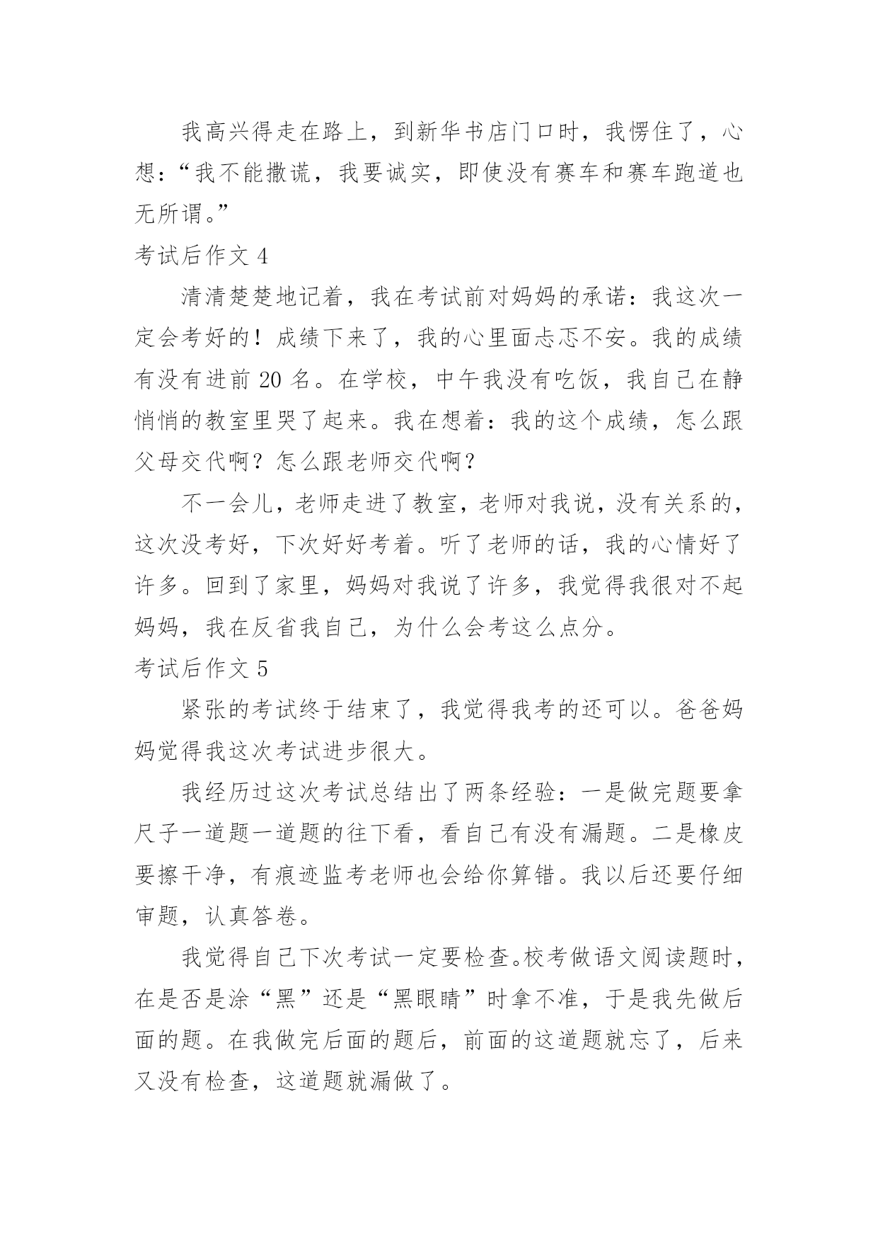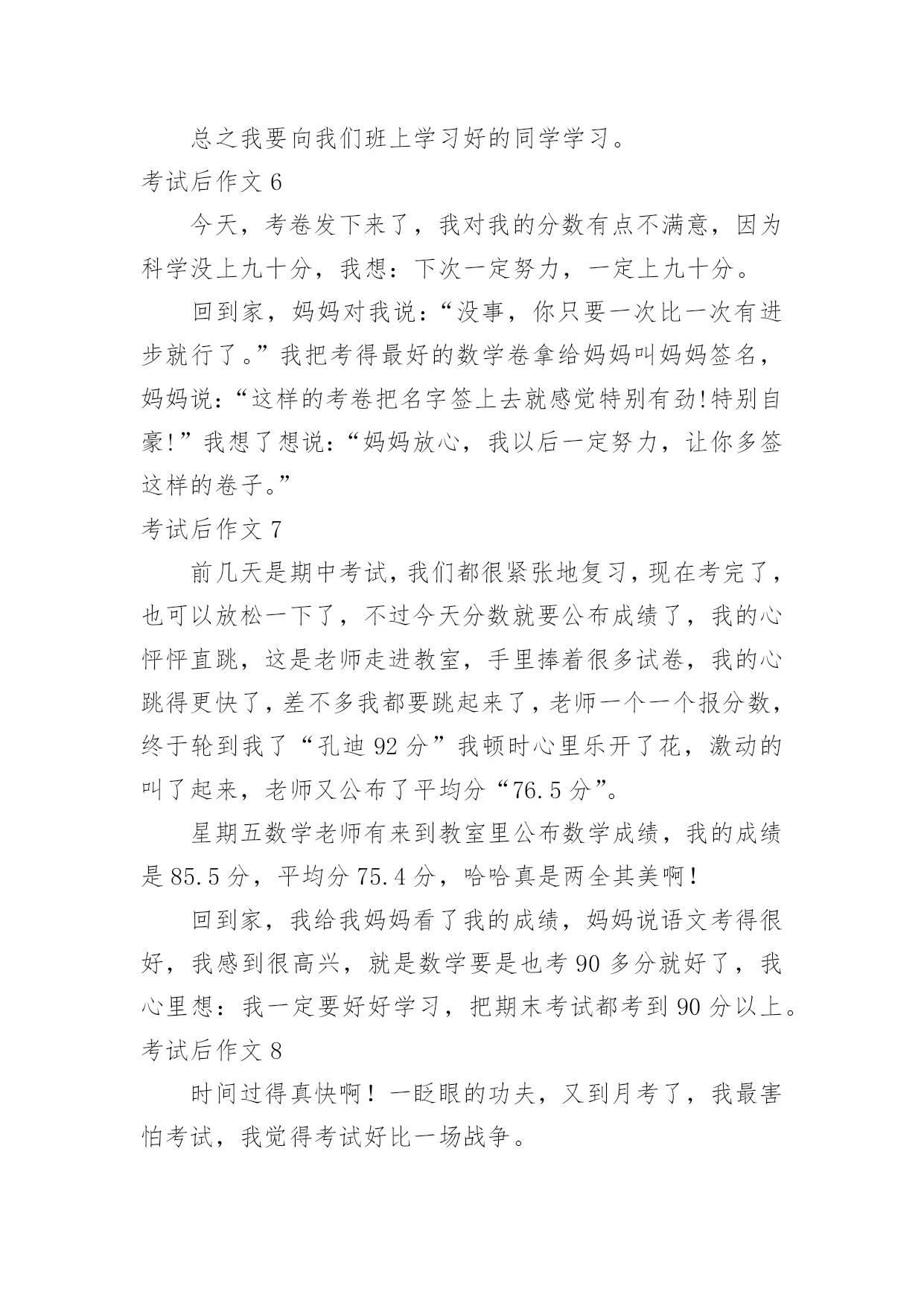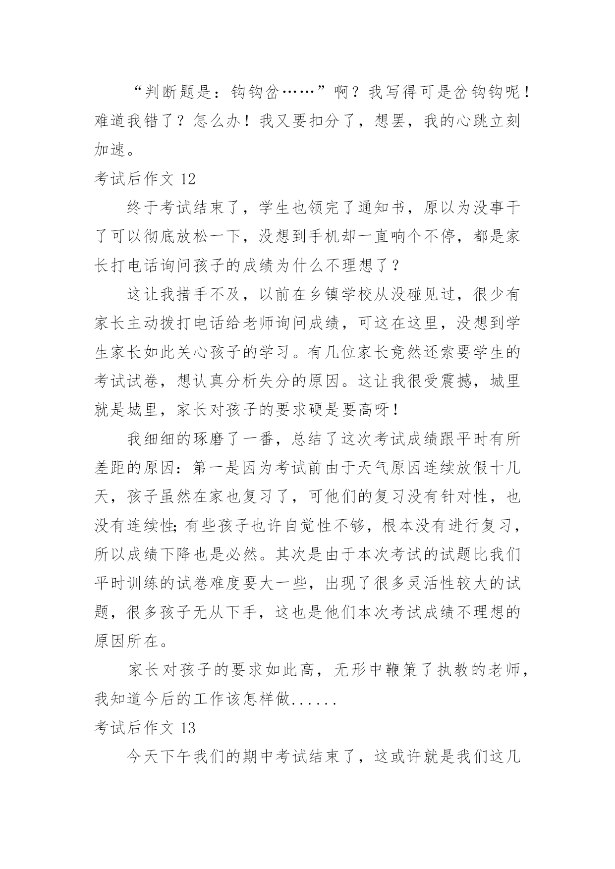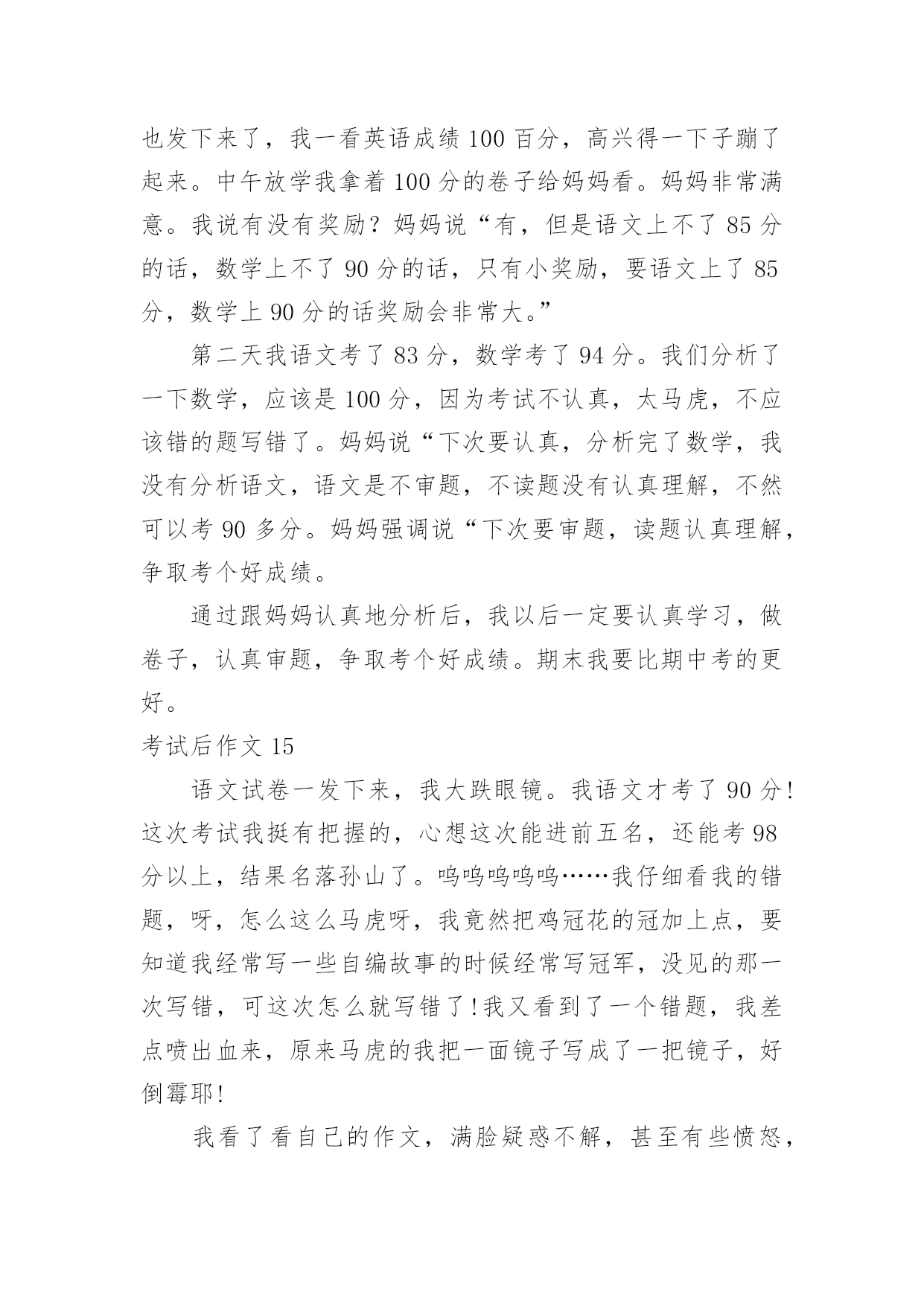 考试后作文考试后作文(集锦15篇)在我们平凡的日常里,大家都不可避免地要接触到作文吧,写作文可以锻炼我们的独处习惯,让自己的心静下来,思考自己未来的方向。如何写一篇有思想、有文采的作文呢?以下是小编收集整理的考试后作文,希望能够帮助到大家。考试后作文1“叮叮叮”,上课铃一响,我紧张得汗珠也流下来了,但我看见其他同学那么勇敢,于是我也壮着胆子,决心要和难题挑战。考试后,老师把试卷发下来,我一看试卷,非常惊讶,因为我交了一个不该交的朋友―89分!当时,我心里很不好受,心想:这张试卷不是我的吧!可能是老师发错了。可是试卷上明明写了“刘奕含”这三个字。快受不了,89分!恨不得把它撕成碎片。可是……我不得不把试卷带回家。就这样,我的心理负担也渐渐跑到了九霄云外。同学们,让我们一块为自己加油吧!好!考试后作文2语文试卷一发下来,我大跌眼镜。我语文才考了90分!这次考试我挺有把握的,心想这次能进前五名,还能考98分以上,结果名落孙山了。呜呜呜呜呜……我仔细看我的错题,呀,怎样这么马虎呀,我竟然把鸡冠花的冠加上点,要明白我经常写一些自编故事的时候经常写冠军,没见的那一次写错,可这次怎样就写错了!我又看到了一个错题,我差点喷出血来,原先马虎的我把一面镜子写成了一把镜子,好倒霉耶!我看了看自我的作文,满脸疑惑不解,甚至有些愤怒,减了三分呀!教师让背的好开头我用上了,我的每一个自然段里最少有两个比喻句和五个好词好句,怎样就减了三分呀!我的目光落到了作文的结尾,教师给我圈起来了,可能是我的结尾写得不和开头呼应或者是写得有点简单才扣了这么多分吧。唉,原先作文的每一句话都是那么重要,回家我要背背好的结尾。这张试卷告诉我们:对待任何题都要认真、仔细,往往你不经常错的题会在那里写错,相反,难一点的字会在那里写对。写作文不要以为开头和资料还就行了,还要写好结尾。就跟教师说的一样:有些教师懒,直接看你的开头、结尾、字体,还有字数的数量来给你评分。考试后作文3我进了自己的房间,真想大哭一场,可是,不能露馅,只好伤心得坐在那写作业。写完了作业便把试卷藏了起来。我想起了妈妈说的话:“如果这次数学测试考好了,就给你买赛车,买赛车跑道,去参加比赛。”过了一会儿,妈妈问我:“远远呀!测试考了多少分?”我撒了个谎,脱口而出:“一百分!”妈妈听了,给我二百元钱让我去买赛车和赛车跑道了。我高兴得走在路上,到新华书店门口时,我愣住了,心想:“我不能撒谎,我要诚实,即使没有赛车和赛车跑道也无所谓。”考试后作文4清清楚楚地记着,我在考试前对妈妈的承诺:我这次一定会考好的!成绩下来了,我的心里面忐忑不安。我的成绩有没有进前20名。在学校,中午我没有吃饭,我自己在静悄悄的教室里哭了起来。我在想着:我的这个成绩,怎么跟父母交代啊?怎么跟老师交代啊?不一会儿,老师走进了教室,老师对我说,没有关系的,这次没考好,下次好好考着。听了老师的话,我的心情好了许多。回到了家里,妈妈对我说了许多,我觉得我很对不起妈妈,我在反省我自己,为什么会考这么点分。考试后作文5紧张的考试终于结束了,我觉得我考的还可以。爸爸妈妈觉得我这次考试进步很大。我经历过这次考试总结出了两条经验:一是做完题要拿尺子一道题一道题的往下看,看自己有没有漏题。二是橡皮要擦干净,有痕迹监考老师也会给你算错。我以后还要仔细审题,认真答卷。我觉得自己下次考试一定要检查。校考做语文阅读题时,在是否是涂“黑”还是“黑眼睛”时拿不准,于是我先做后面的题。在我做完后面的题后,前面的这道题就忘了,后来又没有检查,这道题就漏做了。总之我要向我们班上学习好的同学学习。考试后作文6今天,考卷发下来了,我对我的分数有点不满意,因为科学没上九十分,我想:下次一定努力,一定上九十分。回到家,妈妈对我说:“没事,你只要一次比一次有进步就行了。”我把考得最好的数学卷拿给妈妈叫妈妈签名,妈妈说:“这样的考卷把名字签上去就感觉特别有劲!特别自豪!”我想了想说:“妈妈放心,我以后一定努力,让你多签这样的卷子。”考试后作文7前几天是期中考试,我们都很紧张地复习,现在考完了,也可以放松一下了,不过今天分数就要公布成绩了,我的心怦怦直跳,这是老师走进教室,手里捧着很多试卷,我的心跳得更快了,差不多我都要跳起来了,老师一个一个报分数,终于轮到我了“孔迪92分”我顿时心里乐开了花,激动的叫了起来,老师又公布了平均分“76.5分”。星期五数学老师有来到教室里公布数学成绩,我的成绩是85.5分,平均分75.4分,哈哈真是两全其美啊!回到家,我给我妈妈看了我的成绩,妈妈说语文考得很好,我感到很高兴,就是数学要是也考90多分就好了,我心里想:我一定要好好学习,把期末考试都考到90分以上。考试后作文8时间过得真快啊!一眨眼的功夫,又到月考了,我最害怕考试,我觉得考试好比一场战争。考试之后,