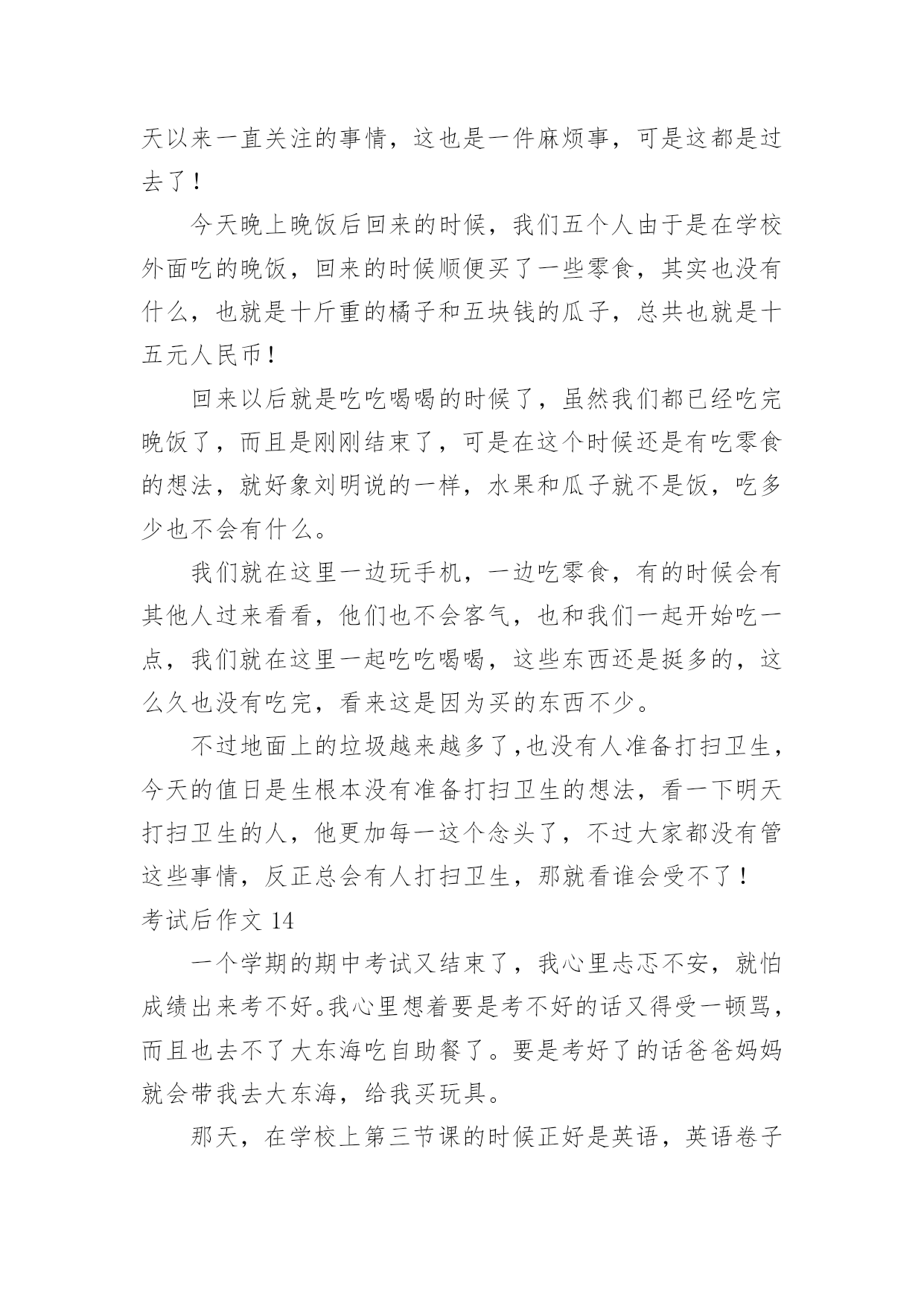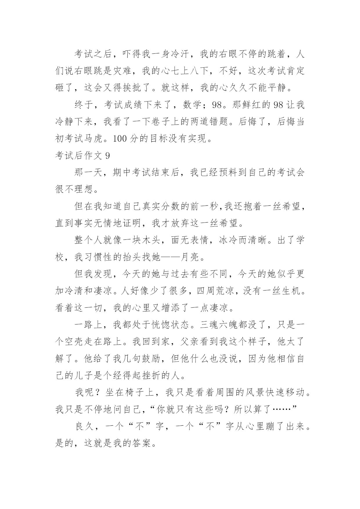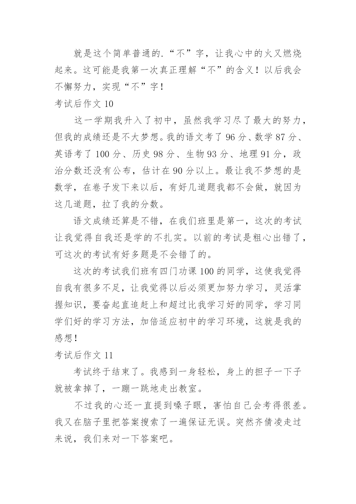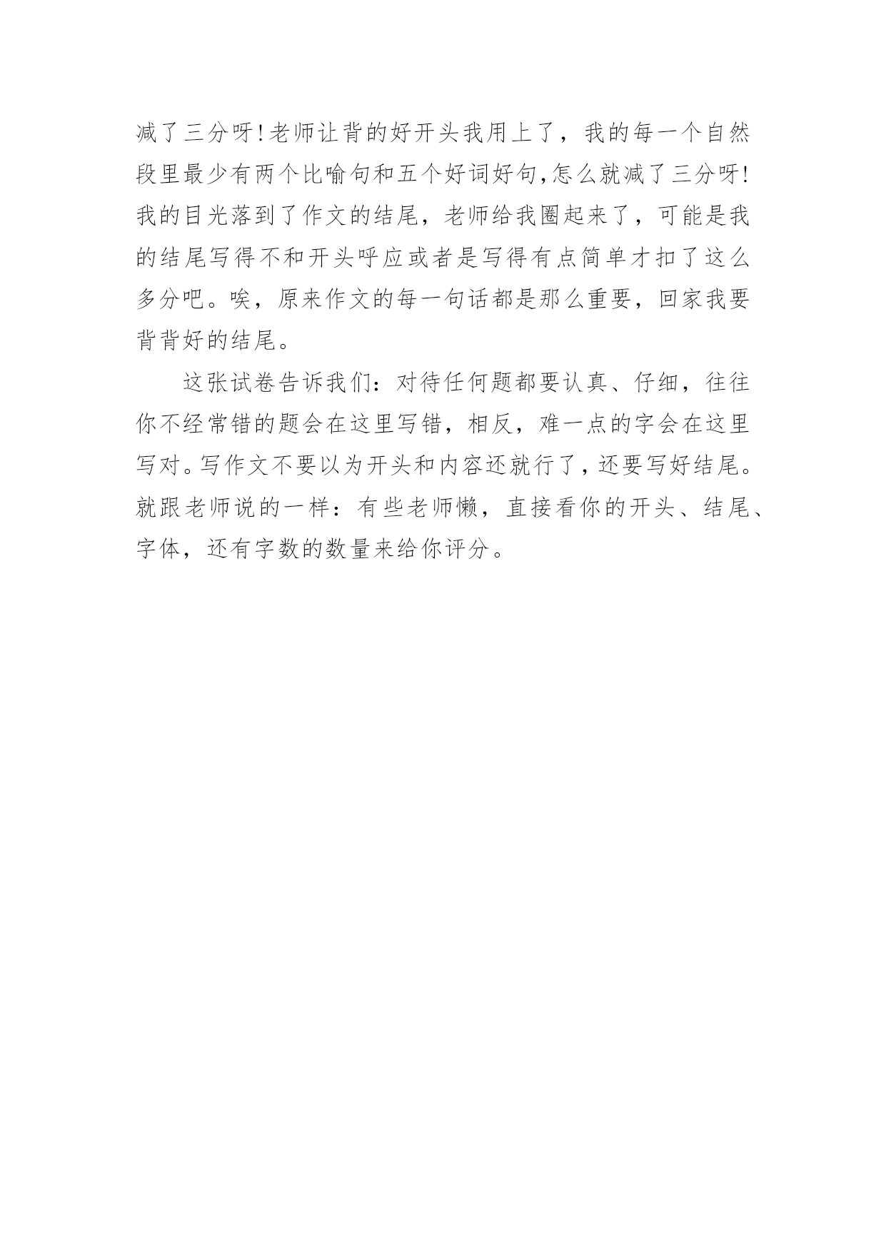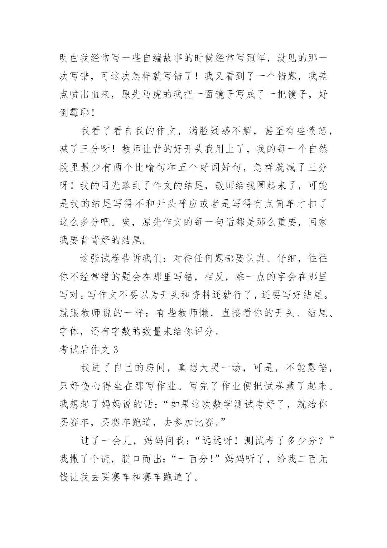 考试后作文考试后作文(集锦15篇)在我们平凡的日常里,大家都不可避免地要接触到作文吧,写作文可以锻炼我们的独处习惯,让自己的心静下来,思考自己未来的方向。如何写一篇有思想、有文采的作文呢?以下是小编收集整理的考试后作文,希望能够帮助到大家。考试后作文1“叮叮叮”,上课铃一响,我紧张得汗珠也流下来了,但我看见其他同学那么勇敢,于是我也壮着胆子,决心要和难题挑战。考试后,老师把试卷发下来,我一看试卷,非常惊讶,因为我交了一个不该交的朋友―89分!当时,我心里很不好受,心想:这张试卷不是我的吧!可能是老师发错了。可是试卷上明明写了“刘奕含”这三个字。快受不了,89分!恨不得把它撕成碎片。可是……我不得不把试卷带回家。就这样,我的心理负担也渐渐跑到了九霄云外。同学们,让我们一块为自己加油吧!好!考试后作文2语文试卷一发下来,我大跌眼镜。我语文才考了90分!这次考试我挺有把握的,心想这次能进前五名,还能考98分以上,结果名落孙山了。呜呜呜呜呜……我仔细看我的错题,呀,怎样这么马虎呀,我竟然把鸡冠花的冠加上点,要明白我经常写一些自编故事的时候经常写冠军,没见的那一次写错,可这次怎样就写错了!我又看到了一个错题,我差点喷出血来,原先马虎的我把一面镜子写成了一把镜子,好倒霉耶!我看了看自我的作文,满脸疑惑不解,甚至有些愤怒,减了三分呀!教师让背的好开头我用上了,我的每一个自然段里最少有两个比喻句和五个好词好句,怎样就减了三分呀!我的目光落到了作文的结尾,教师给我圈起来了,可能是我的结尾写得不和开头呼应或者是写得有点简单才扣了这么多分吧。唉,原先作文的每一句话都是那么重要,回家我要背背好的结尾。这张试卷告诉我们:对待任何题都要认真、仔细,往往你不经常错的题会在那里写错,相反,难一点的字会在那里写对。写作文不要以为开头和资料还就行了,还要写好结尾。就跟教师说的一样:有些教师懒,直接看你的开头、结尾、字体,还有字数的数量来给你评分。考试后作文3我进了自己的房间,真想大哭一场,可是,不能露馅,只好伤心得坐在那写作业。写完了作业便把试卷藏了起来。我想起了妈妈说的话:“如果这次数学测试考好了,就给你买赛车,买赛车跑道,去参加比赛。”过了一会儿,妈妈问我:“远远呀!测试考了多少分?”我撒了个谎,脱口而出:“一百分!”妈妈听了,给我二百元钱让我去买赛车和赛车跑道了。我高兴得走在路上,到新华书店门口时,我愣住了,心想:“我不能撒谎,我要诚实,即使没有赛车和赛车跑道也无所谓。”考试后作文4清清楚楚地记着,我在考试前对妈妈的承诺:我这次一定会考好的!成绩下来了,我的心里面忐忑不安。我的成绩有没有进前20名。在学校,中午我没有吃饭,我自己在静悄悄的教室里哭了起来。我在想着:我的这个成绩,怎么跟父母交代啊?怎么跟老师交代啊?不一会儿,老师走进了教室,老师对我说,没有关系的,这次没考好,下次好好考着。听了老师的话,我的心情好了许多。回到了家里,妈妈对我说了许多,我觉得我很对不起妈妈,我在反省我自己,为什么会考这么点分。考试后作文5紧张的考试终于结束了,我觉得我考的还可以。爸爸妈妈觉得我这次考试进步很大。我经历过这次考试总结出了两条经验:一是做完题要拿尺子一道题一道题的往下看,看自己有没有漏题。二是橡皮要擦干净,有痕迹监考老师也会给你算错。我以后还要仔细审题,认真答卷。我觉得自己下次考试一定要检查。校考做语文阅读题时,在是否是涂“黑”还是“黑眼睛”时拿不准,于是我先做后面的题。在我做完后面的题后,前面的这道题就忘了,后来又没有检查,这道题就漏做了。总之我要向我们班上学习好的同学学习。考试后作文6今天,考卷发下来了,我对我的分数有点不满意,因为科学没上九十分,我想:下次一定努力,一定上九十分。回到家,妈妈对我说:“没事,你只要一次比一次有进步就行了。”我把考得最好的数学卷拿给妈妈叫妈妈签名,妈妈说:“这样的考卷把名字签上去就感觉特别有劲!特别自豪!”我想了想说:“妈妈放心,我以后一定努力,让你多签这样的卷子。”考试后作文7前几天是期中考试,我们都很紧张地复习,现在考完了,也可以放松一下了,不过今天分数就要公布成绩了,我的心怦怦直跳,这是老师走进教室,手里捧着很多试卷,我的心跳得更快了,差不多我都要跳起来了,老师一个一个报分数,终于轮到我了“孔迪92分”我顿时心里乐开了花,激动的叫了起来,老师又公布了平均分“76.5分”。星期五数学老师有来到教室里公布数学成绩,我的成绩是85.5分,平均分75.4分,哈哈真是两全其美啊!回到家,我给我妈妈看了我的成绩,妈妈说语文考得很好,我感到很高兴,就是数学要是也考90多分就好了,我心里想:我一定要好好学习,把期末考试都考到90分以上。考试后作文8时间过得真快啊!一眨眼的功夫,又到月考了,我最害怕考试,我觉得考试好比一场战争。考试之后,
