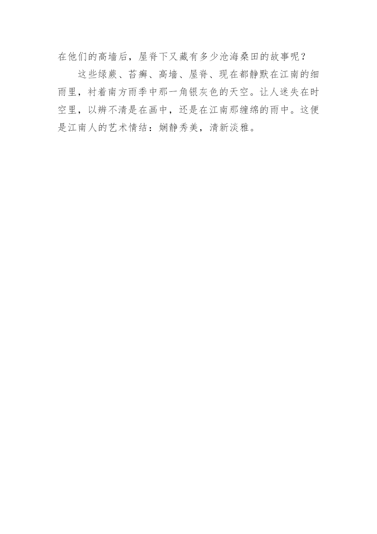 小城雨巷的观后感小城雨巷的观后感篇一:《小城雨巷》观后感冬季悄悄起开,春天渐渐来临。春姑娘首先派来春雨。春雨来到天空,用心整理着自己的秀发,抖动着美丽来的花衣裳,顷刻间,天地间便落下了美丽、晶莹、剔透的珍珠。美丽的姑娘们再也按捺不住内心的好奇,纷纷打着雨伞,迈着优美的步伐,走出家中,在街巷中跳着迎接春雨的舞蹈。一出门,一阵凉爽的风迎面吹来,风里夹杂着新鲜泥土的气息。牛毛般的细雨,随着微微的轻风四处飘荡。毛毛细雨中,一位姑娘独自走在街巷中,或许她也会故作忧愁低吟着“亭无言,花无声,只有旅人独自行。”多么迷人的景色啊!这是我看完《小城雨巷》后的感受。在清新迷人的雨巷中,以舞者敏捷犯动人的舞步,让我的视觉、听觉、感觉得到了特殊的享受。我惊讶现代科技的高超,寻逼真的幕景让我有如身临其境的感觉。看完节目后,我发现我渐渐喜欢上了春雨,在春雨的滋润下,小草变得更嫩了,更绿了;在春雨的.滋润下,花儿变得更艳了,更美了;在春雨的润湿下,小麦变得更高了,更壮了。我喜欢你,春雨!看完节目后,我发现我渐渐喜欢上了舞蹈。舞蹈以其优美、轻柔奔放,羞涩等特点给人们传答着春夏秋冬,酸甜苦辣,人情冷暖,古老佳话,给人以视觉的享受。我也喜欢你,舞蹈!看完节目后,我发现我更喜欢科学和电脑了。“雨巷”“房屋”让我惊讶不已。为什么它们就像真实的一样,今后我一定努力学习科学技术,明白其中的道理,让我拥有自己的“小城雨巷”。我更喜欢你,科学!《小城雨巷》,在我的人生道路中,你给了我一条“美”的道路。篇二:观《小城雨巷》有感_450字在江南,雨总是很多的。或许,是雨赋予了江南人温婉的灵性吧,就是连建筑,也无一不显示着南方人心思的精巧。幽幽的,总有一种梦的神秘与静谧的味道。这些风情万千的景观,也只有在江南的氤氲水气中才能展现出所有的美。撑一柄南方人特有的纸伞,找一条被雨濡湿的小巷,就拐进了南方人深远绵长的心境里。只需平平常常地步入任一巷子,便可寻见一分令你心动不已的惊喜。两壁是古老的发黑的岩石院墙,连上面的苔癣,也隐隐透出古老的黑亮。抬头望去,会见一角突出的屋脊向上拱去,到最亮点时,形成一个怪异的上翘,仰天昂起,又流畅委婉地滑下去,很优雅,也很有力,韧而不硬,柔而不弱。屋脊上,墙缝间,不时挺出一秆秆绿蕨,一丛丛不知名的小草。远远望去屋脊,高墙似披上了碧绿的轻纱,斑斑驳驳。于是思绪不由自主地就漂向远方。哦,这大该就是明清遗迹了吧!在他们的高墙后,屋脊下又藏有多少沧海桑田的故事呢?这些绿蕨、苔癣、高墙、屋脊、现在都静默在江南的细雨里,衬着南方雨季中那一角银灰色的天空。让人迷失在时空里,以辨不清是在画中,还是在江南那缠绵的雨中。这便是江南人的艺术情结:娴静秀美,清新淡雅。