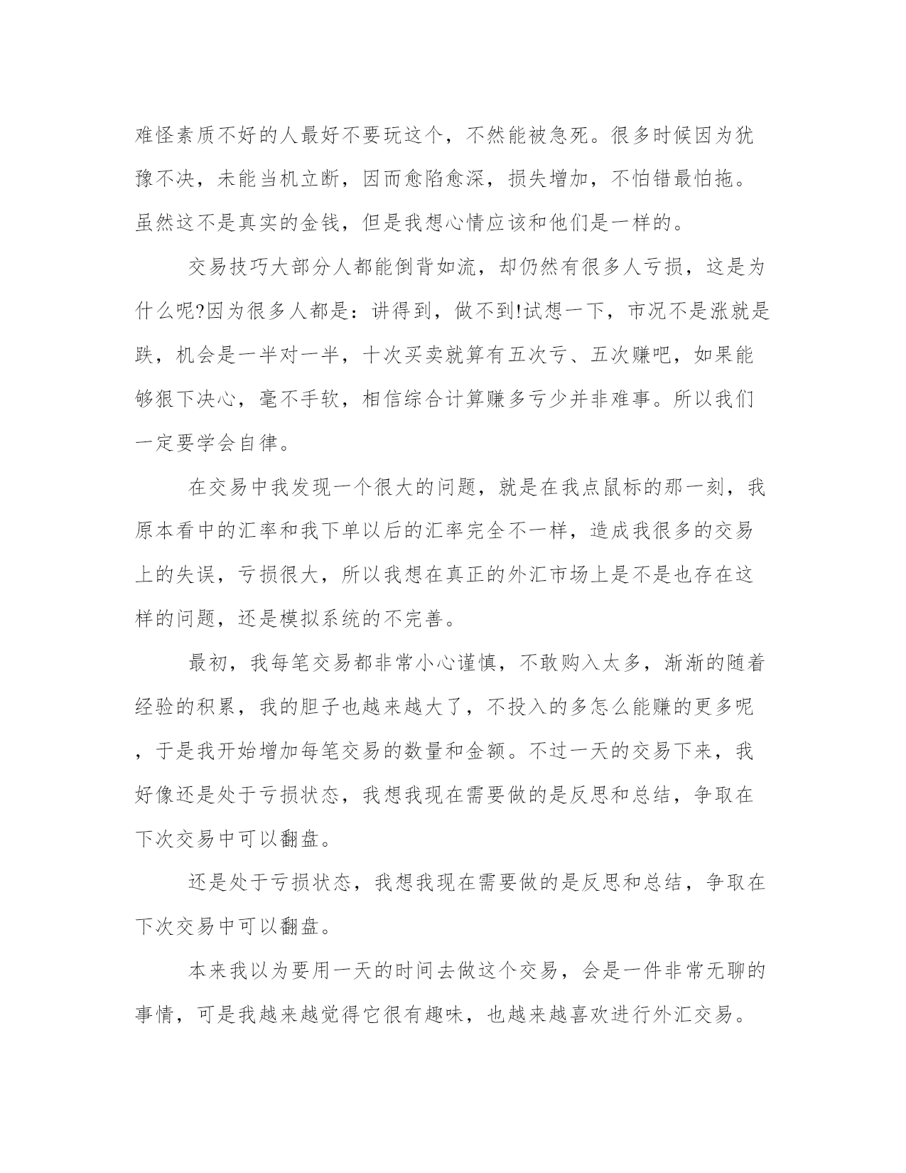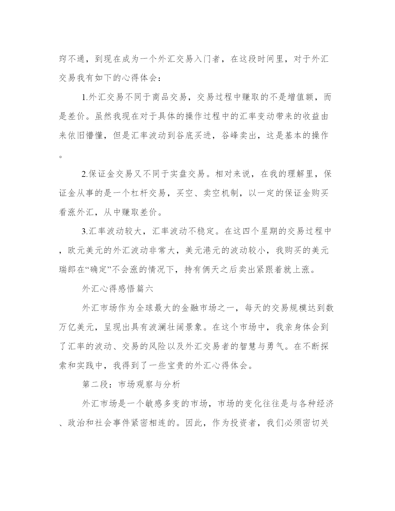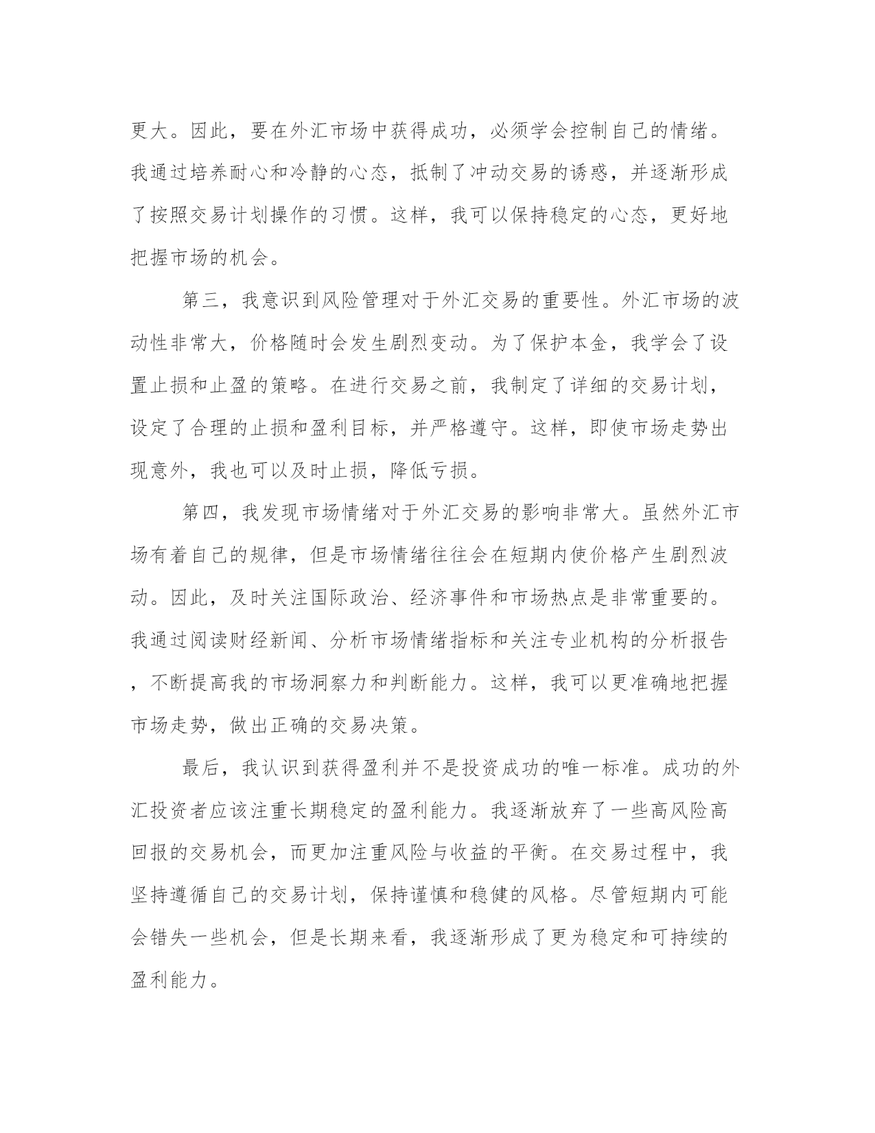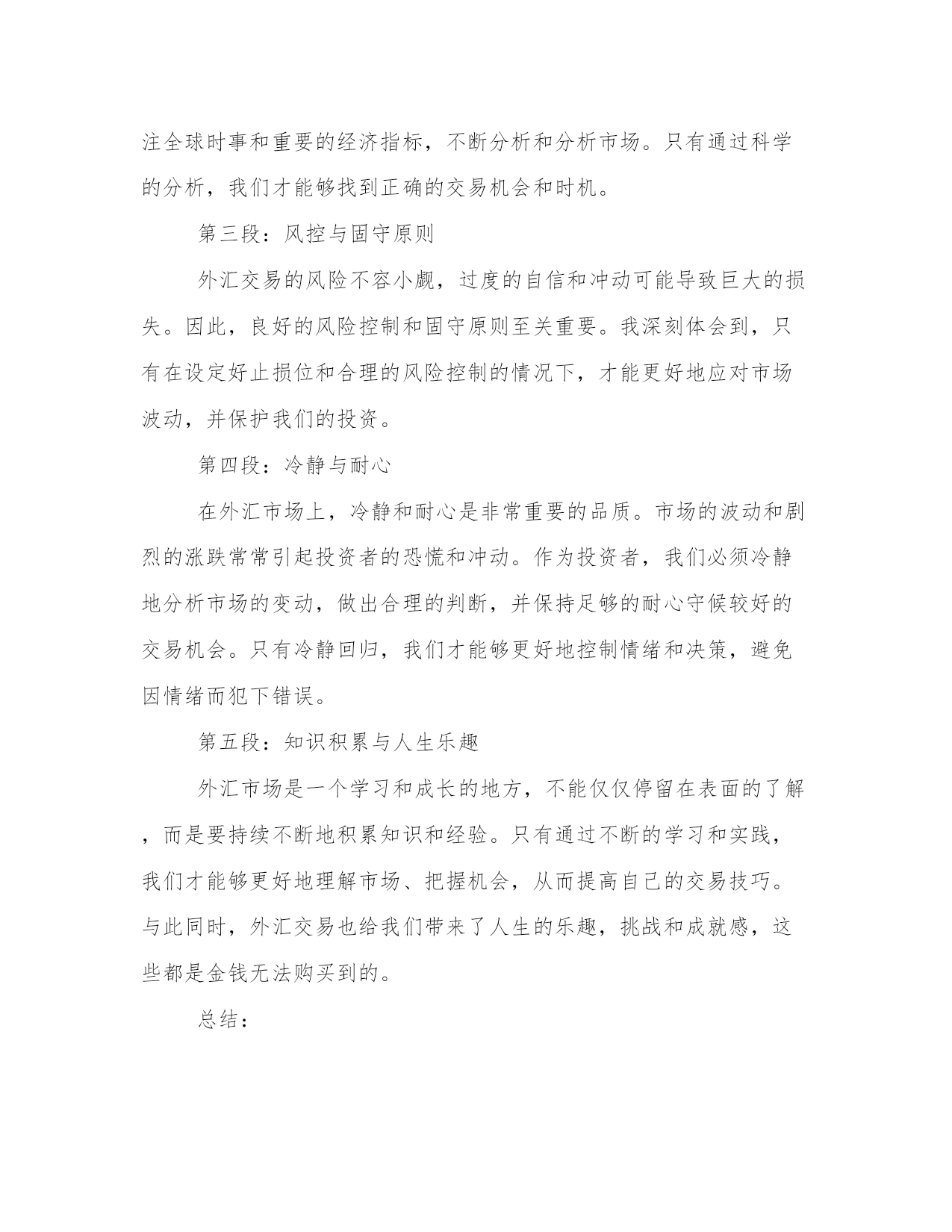 外汇心得感悟(优质15篇)当我们备受启迪时,常常可以将它们写成一篇心得感悟,如此就可以提升我们写作能力了。那么你知道心得感悟如何写吗?以下是我帮大家整理的最新心得感悟范文大全,希望能够帮助到大家,我们一起来看一看吧。外汇心得感悟篇一近年来,随着国际贸易的发展和人们对投资理财的越来越高的需求,外汇交易的市场也越来越活跃。外汇市场的分析、交易等方面都需要一定的知识和技巧,但无论是新手还是老手,买外汇都需要总结经验和教训。在此,我将分享我购买外汇的体会和经验,以供大家参考。第二段:了解外汇市场风险在买外汇之前,对外汇市场风险的了解是非常必要的。外汇市场的风险因素很多,如政治、经济、国际贸易、自然灾害等因素,这些都可以影响外汇汇率的变化。因此,购买外汇前必须对市场的风险有一定的预判,掌握相应的市场分析技巧,制定合理的投资方案。第三段:掌握外汇市场基础知识除了了解市场风险,我们还需要掌握外汇市场基础知识。掌握外汇汇率的变化、外汇交易的基本流程、外汇交易的理论、技术等知识是非常必要的。此外,了解国际贸易、地缘政治等方面的知识,有助于我们更好地了解外汇市场的整体情况,从而做出更准确的决策。第四段:合理制定投资方案在购买外汇之前,我们需要制定合理的投资方案,遵循一个有效的投资策略。在制定投资方案时,我们应该考虑自己的投资目标和风险承受能力,结合市场变化,分配不同比例的资金,规避风险,取得更好的收益。此外,我们还应该密切关注市场的变化,根据实时行情调整投资方案,保持敏锐性和灵活性。第五段:总结在购买外汇的过程中,我们需要充分了解市场风险,掌握市场基础知识,制定合理的投资方案。在交易过程中,我们还需要时刻保持敏锐和灵活,及时调整策略。相信只有这样,才能在外汇交易市场中获得更好的收益。外汇心得感悟篇二成功的投资者大多数能够控制自己的情绪且有严谨的纪律性,能够有效地约束自己。我们是人不是神,错误总是难免的。就像我在交易中,看到某种货币刚有上升趋势的时候,我就会立即将它抛出,却忽略掉它还有上升的空间,每次这个时候我就特后悔,还有就是没有察觉到某种货币已经上升到了极点,却依然买进。以致后来货币一直贬值,我等了好久也没有升值,每次看到它稍有上升的趋势,我就特别激动,可是过不了多久,它又开始下降了。我的心情大起大落的,难怪素质不好的人最好不要玩这个,不然能被急死。很多时候因为犹豫不决,未能当机立断,因而愈陷愈深,损失增加,不怕错最怕拖。虽然这不是真实的金钱,但是我想心情应该和他们是一样的。交易技巧大部分人都能倒背如流,却仍然有很多人亏损,这是为什么呢?因为很多人都是:讲得到,做不到!试想一下,市况不是涨就是跌,机会是一半对一半,十次买卖就算有五次亏、五次赚吧,如果能够狠下决心,毫不手软,相信综合计算赚多亏少并非难事。所以我们一定要学会自律。在交易中我发现一个很大的问题,就是在我点鼠标的那一刻,我原本看中的汇率和我下单以后的汇率完全不一样,造成我很多的交易上的失误,亏损很大,所以我想在真正的外汇市场上是不是也存在这样的问题,还是模拟系统的不完善。最初,我每笔交易都非常小心谨慎,不敢购入太多,渐渐的随着经验的积累,我的胆子也越来越大了,不投入的多怎么能赚的更多呢,于是我开始增加每笔交易的数量和金额。不过一天的交易下来,我好像还是处于亏损状态,我想我现在需要做的是反思和总结,争取在下次交易中可以翻盘。还是处于亏损状态,我想我现在需要做的是反思和总结,争取在下次交易中可以翻盘。本来我以为要用一天的时间去做这个交易,会是一件非常无聊的事情,可是我越来越觉得它很有趣味,也越来越喜欢进行外汇交易。那时候我还在想,如果我有一笔资金,我一定会去进行外汇投资,不管亏盈,也算是一种生活方式。而且我想时间长了,经验多了,总归会有赚钱的那天。后来我发现,原来不只是我一个人对这个产生了兴趣,大家都很开心,也很投入的去做这件事情,交流讨论的也很激烈。我想每件事情只要你用心去做都会成为一种乐趣,最终也会取得成功。外汇交易说不定最后也会成为我们的一份工作,一个赚钱的途径。外汇心得感悟篇三外汇市场是一个充满风险与机遇并存的市场,对于投资者来说,心理素质和经验的积累是非常重要的。在我投身外汇市场的这些年里,我经历了许多起伏,不断总结经验,逐渐形成了自己的交易策略和心得体会。在这篇文章中,我将分享我对外汇市场的一些见解,希望对其他投资者有所帮助。首先,我认识到外汇市场是一个永无止境的学习过程。在进入外汇市场之初,我以为只要掌握一些基本知识就可以轻松赚钱。然而,我很快意识到这个市场是非常复杂和波动的,需要持续不断地学习和改进自己的交易技巧。在这个过程中,我通过阅读专业书籍、参加培训课程和与其他经验丰富的交易者交流,不断提升自己的专业素养和市场洞察力。其次