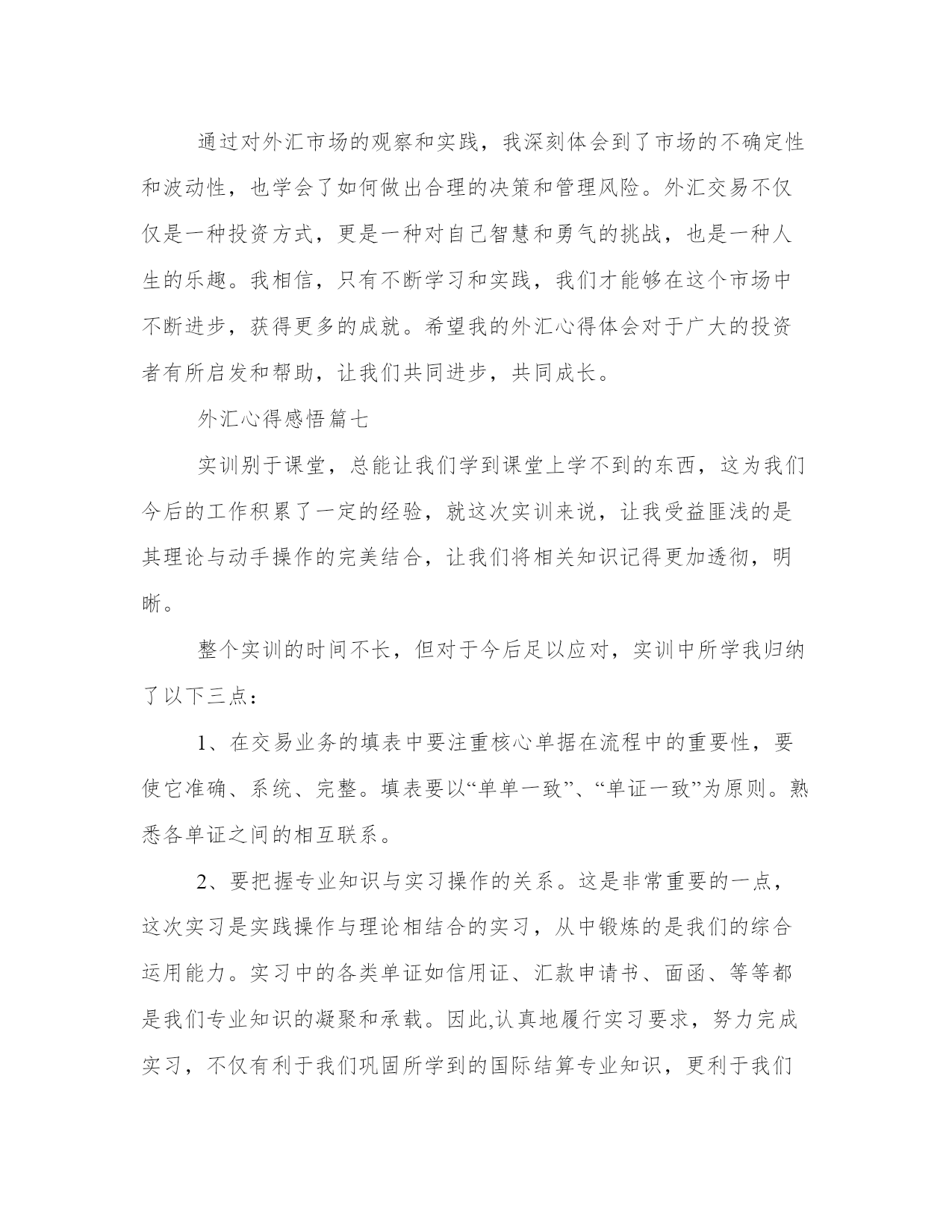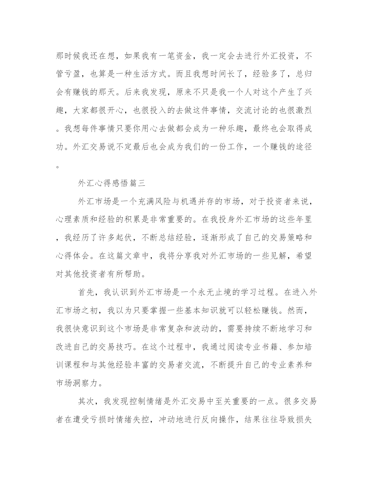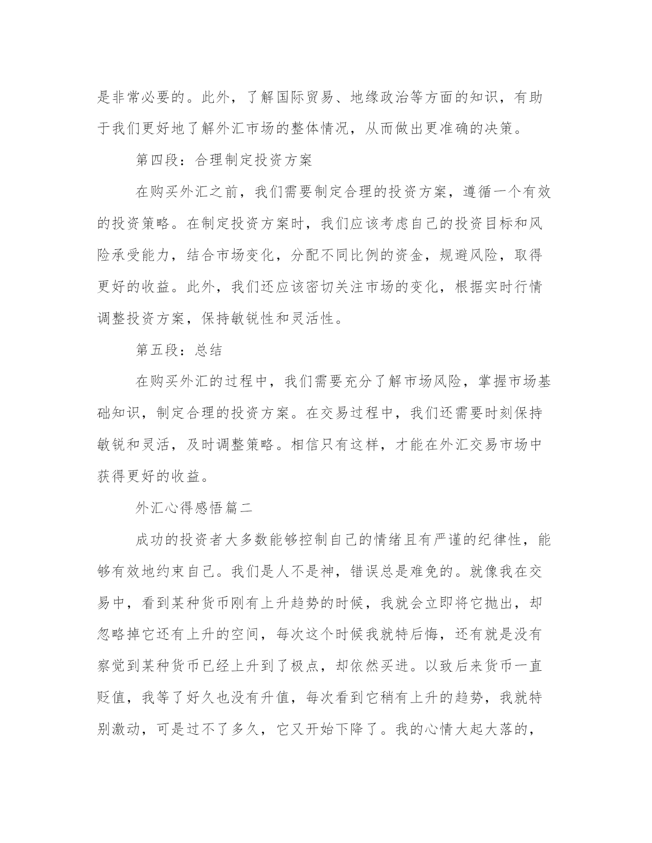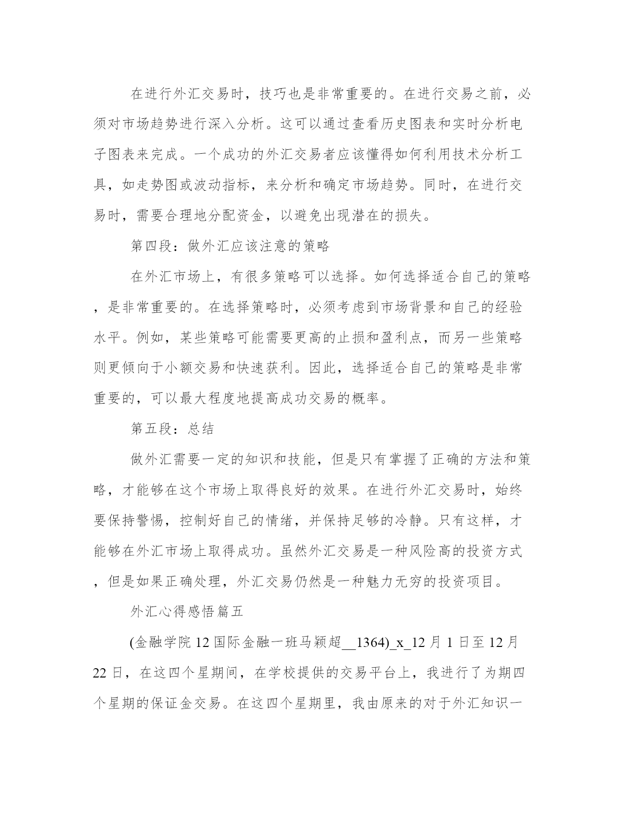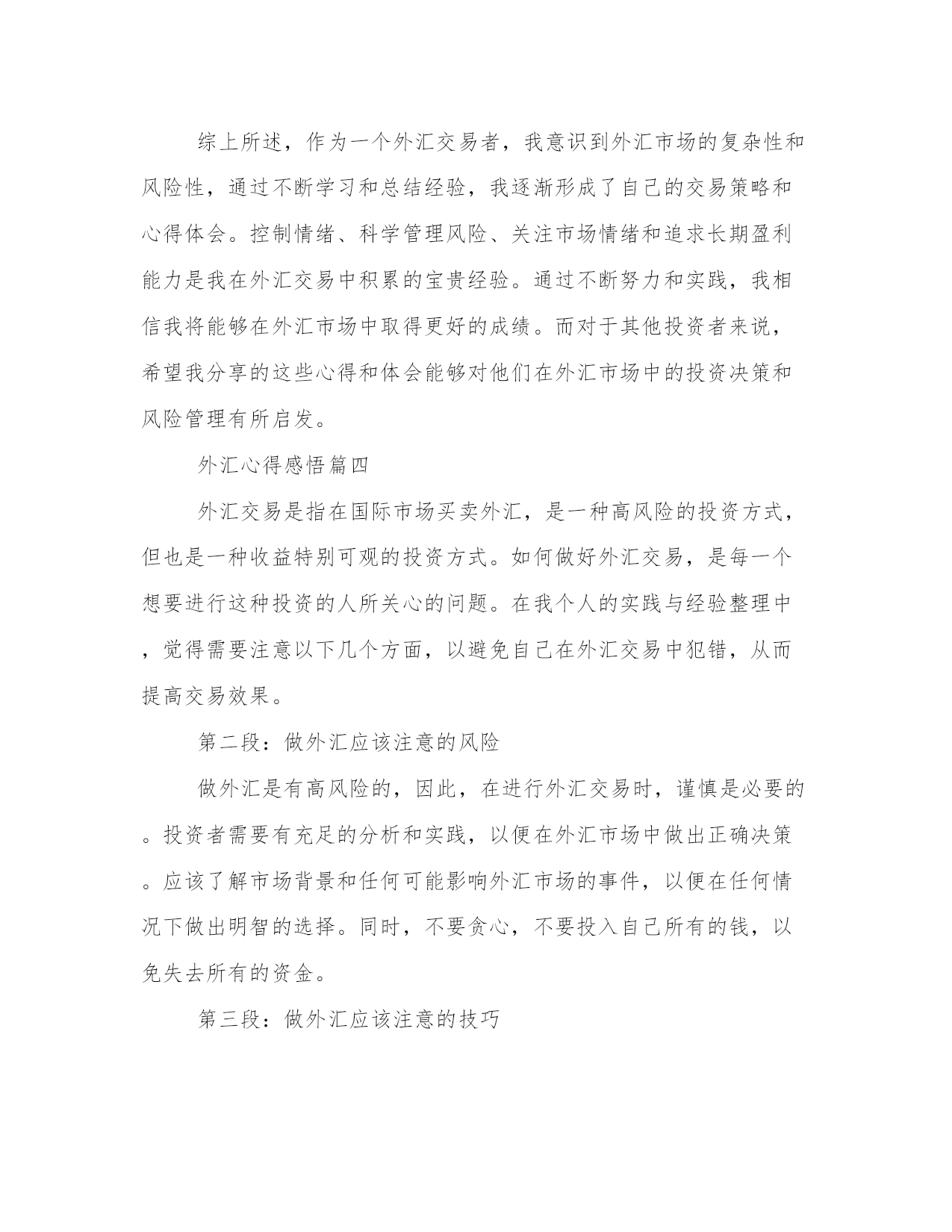 外汇心得感悟(优质15篇)当我们备受启迪时,常常可以将它们写成一篇心得感悟,如此就可以提升我们写作能力了。那么你知道心得感悟如何写吗?以下是我帮大家整理的最新心得感悟范文大全,希望能够帮助到大家,我们一起来看一看吧。外汇心得感悟篇一近年来,随着国际贸易的发展和人们对投资理财的越来越高的需求,外汇交易的市场也越来越活跃。外汇市场的分析、交易等方面都需要一定的知识和技巧,但无论是新手还是老手,买外汇都需要总结经验和教训。在此,我将分享我购买外汇的体会和经验,以供大家参考。第二段:了解外汇市场风险在买外汇之前,对外汇市场风险的了解是非常必要的。外汇市场的风险因素很多,如政治、经济、国际贸易、自然灾害等因素,这些都可以影响外汇汇率的变化。因此,购买外汇前必须对市场的风险有一定的预判,掌握相应的市场分析技巧,制定合理的投资方案。第三段:掌握外汇市场基础知识除了了解市场风险,我们还需要掌握外汇市场基础知识。掌握外汇汇率的变化、外汇交易的基本流程、外汇交易的理论、技术等知识是非常必要的。此外,了解国际贸易、地缘政治等方面的知识,有助于我们更好地了解外汇市场的整体情况,从而做出更准确的决策。第四段:合理制定投资方案在购买外汇之前,我们需要制定合理的投资方案,遵循一个有效的投资策略。在制定投资方案时,我们应该考虑自己的投资目标和风险承受能力,结合市场变化,分配不同比例的资金,规避风险,取得更好的收益。此外,我们还应该密切关注市场的变化,根据实时行情调整投资方案,保持敏锐性和灵活性。第五段:总结在购买外汇的过程中,我们需要充分了解市场风险,掌握市场基础知识,制定合理的投资方案。在交易过程中,我们还需要时刻保持敏锐和灵活,及时调整策略。相信只有这样,才能在外汇交易市场中获得更好的收益。外汇心得感悟篇二成功的投资者大多数能够控制自己的情绪且有严谨的纪律性,能够有效地约束自己。我们是人不是神,错误总是难免的。就像我在交易中,看到某种货币刚有上升趋势的时候,我就会立即将它抛出,却忽略掉它还有上升的空间,每次这个时候我就特后悔,还有就是没有察觉到某种货币已经上升到了极点,却依然买进。以致后来货币一直贬值,我等了好久也没有升值,每次看到它稍有上升的趋势,我就特别激动,可是过不了多久,它又开始下降了。我的心情大起大落的,难怪素质不好的人最好不要玩这个,不然能被急死。很多时候因为犹豫不决,未能当机立断,因而愈陷愈深,损失增加,不怕错最怕拖。虽然这不是真实的金钱,但是我想心情应该和他们是一样的。交易技巧大部分人都能倒背如流,却仍然有很多人亏损,这是为什么呢?因为很多人都是:讲得到,做不到!试想一下,市况不是涨就是跌,机会是一半对一半,十次买卖就算有五次亏、五次赚吧,如果能够狠下决心,毫不手软,相信综合计算赚多亏少并非难事。所以我们一定要学会自律。在交易中我发现一个很大的问题,就是在我点鼠标的那一刻,我原本看中的汇率和我下单以后的汇率完全不一样,造成我很多的交易上的失误,亏损很大,所以我想在真正的外汇市场上是不是也存在这样的问题,还是模拟系统的不完善。最初,我每笔交易都非常小心谨慎,不敢购入太多,渐渐的随着经验的积累,我的胆子也越来越大了,不投入的多怎么能赚的更多呢,于是我开始增加每笔交易的数量和金额。不过一天的交易下来,我好像还是处于亏损状态,我想我现在需要做的是反思和总结,争取在下次交易中可以翻盘。还是处于亏损状态,我想我现在需要做的是反思和总结,争取在下次交易中可以翻盘。本来我以为要用一天的时间去做这个交易,会是一件非常无聊的事情,可是我越来越觉得它很有趣味,也越来越喜欢进行外汇交易。那时候我还在想,如果我有一笔资金,我一定会去进行外汇投资,不管亏盈,也算是一种生活方式。而且我想时间长了,经验多了,总归会有赚钱的那天。后来我发现,原来不只是我一个人对这个产生了兴趣,大家都很开心,也很投入的去做这件事情,交流讨论的也很激烈。我想每件事情只要你用心去做都会成为一种乐趣,最终也会取得成功。外汇交易说不定最后也会成为我们的一份工作,一个赚钱的途径。外汇心得感悟篇三外汇市场是一个充满风险与机遇并存的市场,对于投资者来说,心理素质和经验的积累是非常重要的。在我投身外汇市场的这些年里,我经历了许多起伏,不断总结经验,逐渐形成了自己的交易策略和心得体会。在这篇文章中,我将分享我对外汇市场的一些见解,希望对其他投资者有所帮助。首先,我认识到外汇市场是一个永无止境的学习过程。在进入外汇市场之初,我以为只要掌握一些基本知识就可以轻松赚钱。然而,我很快意识到这个市场是非常复杂和波动的,需要持续不断地学习和改进自己的交易技巧。在这个过程中,我通过阅读专业书籍、参加培训课程和与其他经验丰富的交易者交流,不断提升自己的专业素养和市场洞察力。其次