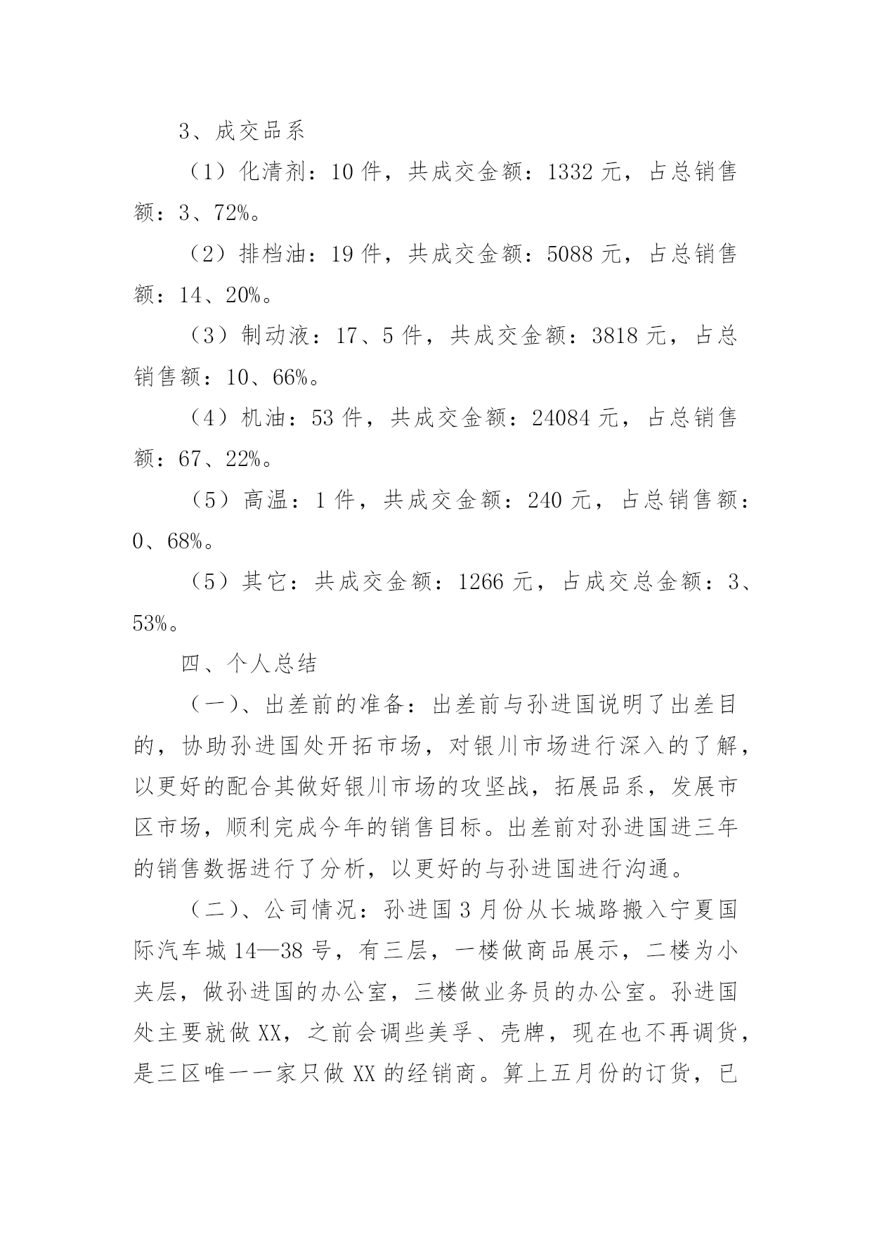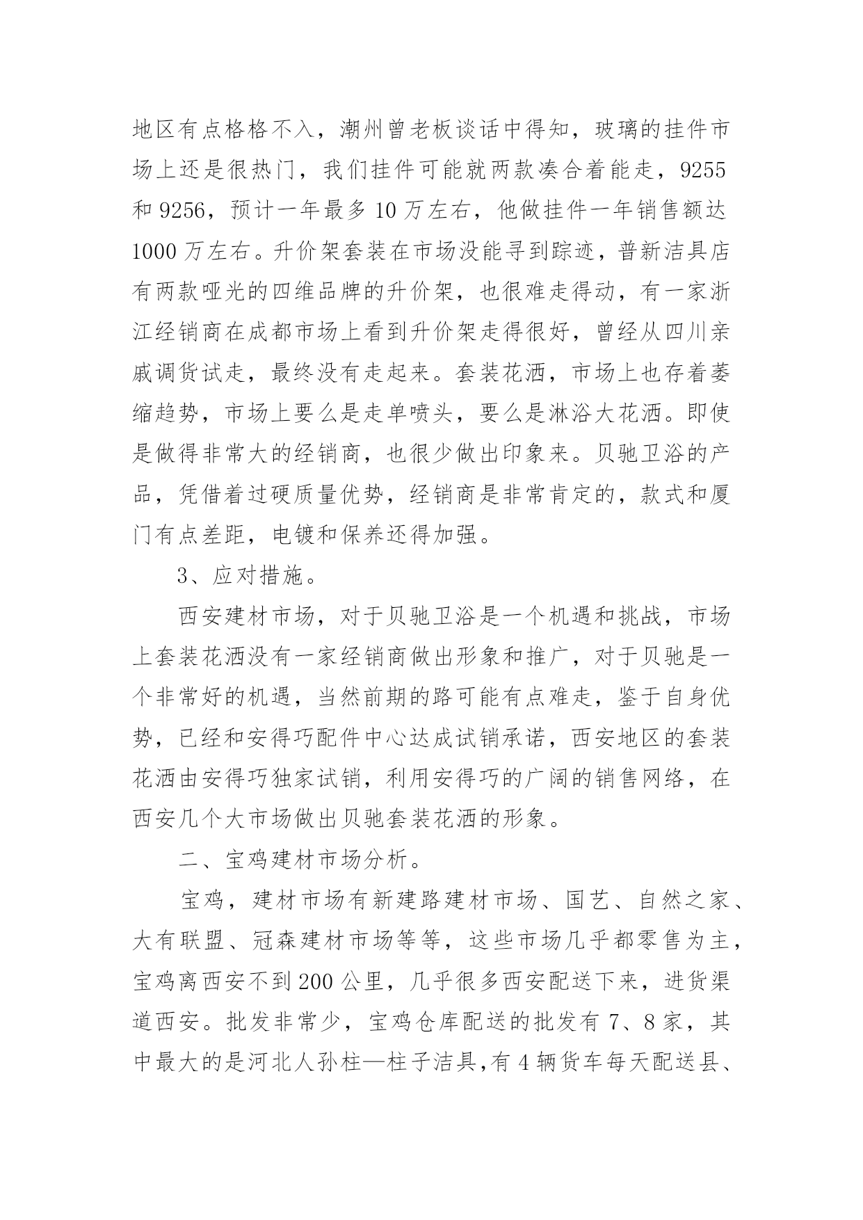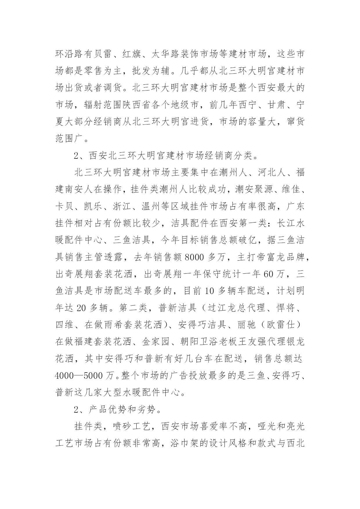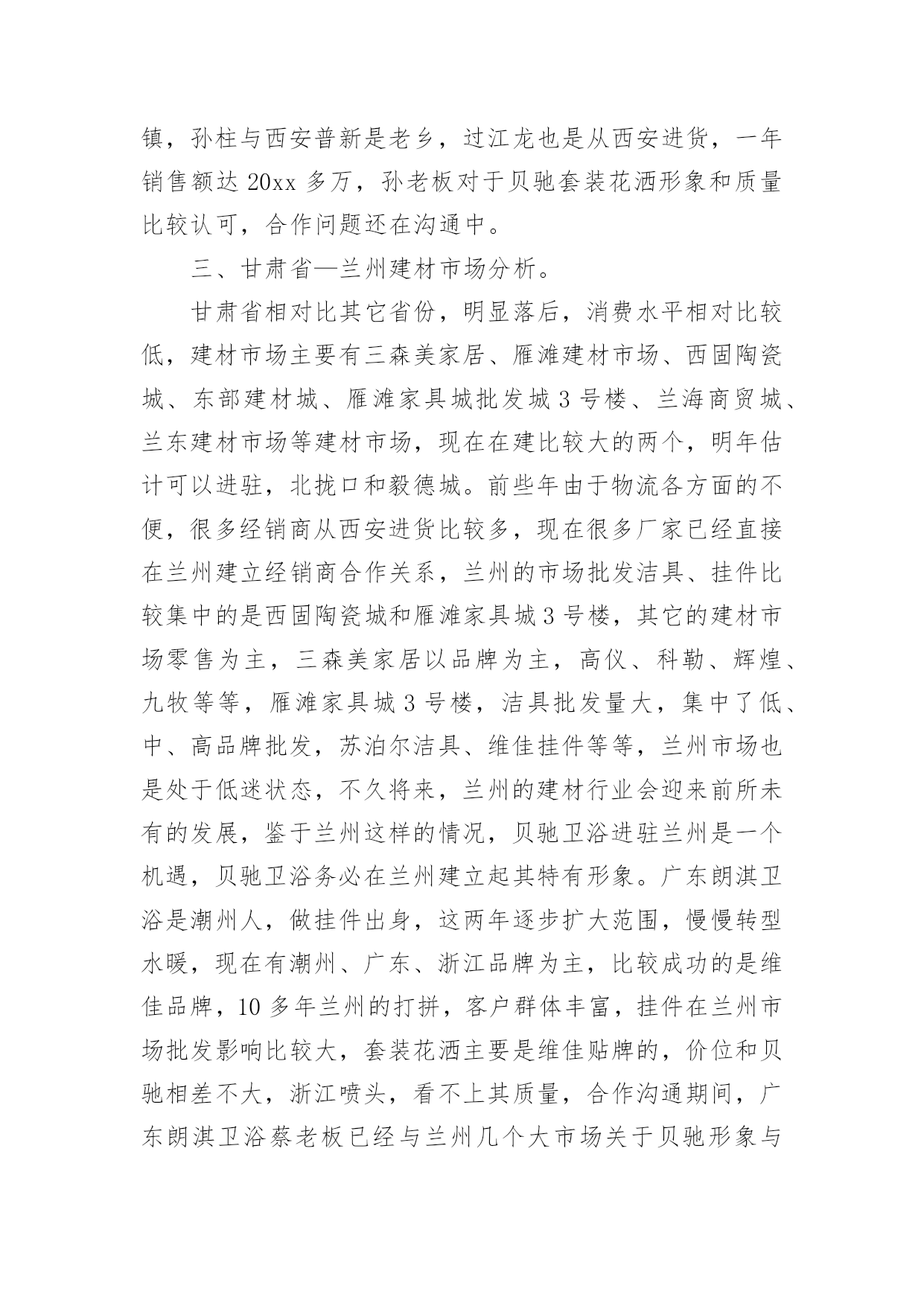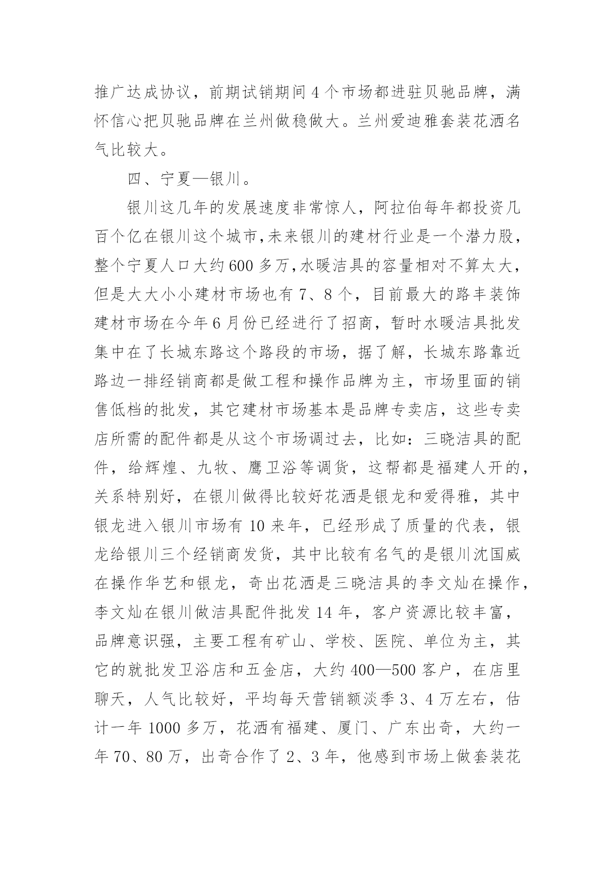 出差工作报告出差工作报告集锦15篇在我们平凡的日常里,报告的使用频率呈上升趋势,我们在写报告的时候要避免篇幅过长。一听到写报告就拖延症懒癌齐复发?下面是小编收集整理的出差工作报告,仅供参考,希望能够帮助到大家。出差工作报告1经过半个月的出差,走访陕西省、甘肃省、宁夏省三个省份的省会城市为主,这些年来,国家一直支持和发展西部,陕甘宁地区各行各业得到了迅速的发展,建材、洁具、卫浴等等逐步形成了一定的规模,与发达的省缩短了差距,特别是西安和银川的规模和西南地区市场不相伯仲,以下就个人对各个地区市场进行简单的分析。一、陕西省—西安。1、市场特点和范围。西安的建材市场分布在西安的东南西北,但是最有名最集中的在未央区,从北2、5环到北三环这个区域范围内,大大小小的市场不少于15个。北2、5环是早几年的建材批发市场,现在剩下了3个大型的市场,走中高档的品牌零售为主,北二环大明宫、大明宫建材批发商贸城,大品牌有汉斯格雅、高仪、科勒、安华等等高档卫浴,太华北路至北三环沿路有贝雷、红旗、太华路装饰市场等建材市场,这些市场都是零售为主,批发为辅。几乎都从北三环大明宫建材市场出货或者调货。北三环大明宫建材市场是整个西安最大的市场,辐射范围陕西省各个地级市,前几年西宁、甘肃、宁夏大部分经销商从北三环大明宫进货,市场的容量大,窜货范围广。2、西安北三环大明宫建材市场经销商分类。北三环大明宫建材市场主要集中在潮州人、河北人、福建南安人在操作,挂件类潮州人比较成功,潮安聚源、维佳、卡贝、凯乐、浙江、温州等区域挂件市场占有率很高,广东挂件相对占有份额比较少,洁具配件在西安第一类:长江水暖配件中心、三鱼洁具,今年目标销售总额破亿,据三鱼洁具销售主管透露,去年销售额8000多万,主打帝富龙品牌,出奇展翔套装花洒,出奇展翔一年保守统计一年60万,三鱼洁具是市场配送车最多的,目前10多辆车配送,计划明年达20多辆。第二类,普新洁具(过江龙总代理、悍将、四维、在做雨希套装花洒)、安得巧洁具、丽驰(欧雷仕)在做福建套装花洒、金家园、朝阳卫浴老板王友强代理银龙花洒,其中安得巧和普新有好几台车在配送,销售总额达4000—5000万。整个市场的广告投放最多的是三鱼、安得巧、普新这几家大型水暖配件中心。2、产品优势和劣势。挂件类,喷砂工艺,西安市场喜爱率不高,哑光和亮光工艺市场占有份额非常高,浴巾架的设计风格和款式与西北地区有点格格不入,潮州曾老板谈话中得知,玻璃的挂件市场上还是很热门,我们挂件可能就两款凑合着能走,9255和9256,预计一年最多10万左右,他做挂件一年销售额达1000万左右。升价架套装在市场没能寻到踪迹,普新洁具店有两款哑光的四维品牌的升价架,也很难走得动,有一家浙江经销商在成都市场上看到升价架走得很好,曾经从四川亲戚调货试走,最终没有走起来。套装花洒,市场上也存着萎缩趋势,市场上要么是走单喷头,要么是淋浴大花洒。即使是做得非常大的经销商,也很少做出印象来。贝驰卫浴的产品,凭借着过硬质量优势,经销商是非常肯定的,款式和厦门有点差距,电镀和保养还得加强。3、应对措施。西安建材市场,对于贝驰卫浴是一个机遇和挑战,市场上套装花洒没有一家经销商做出形象和推广,对于贝驰是一个非常好的机遇,当然前期的路可能有点难走,鉴于自身优势,已经和安得巧配件中心达成试销承诺,西安地区的套装花洒由安得巧独家试销,利用安得巧的广阔的销售网络,在西安几个大市场做出贝驰套装花洒的形象。二、宝鸡建材市场分析。宝鸡,建材市场有新建路建材市场、国艺、自然之家、大有联盟、冠森建材市场等等,这些市场几乎都零售为主,宝鸡离西安不到200公里,几乎很多西安配送下来,进货渠道西安。批发非常少,宝鸡仓库配送的批发有7、8家,其中最大的是河北人孙柱—柱子洁具,有4辆货车每天配送县、镇,孙柱与西安普新是老乡,过江龙也是从西安进货,一年销售额达20xx多万,孙老板对于贝驰套装花洒形象和质量比较认可,合作问题还在沟通中。三、甘肃省—兰州建材市场分析。甘肃省相对比其它省份,明显落后,消费水平相对比较低,建材市场主要有三森美家居、雁滩建材市场、西固陶瓷城、东部建材城、雁滩家具城批发城3号楼、兰海商贸城、兰东建材市场等建材市场,现在在建比较大的两个,明年估计可以进驻,北拢口和毅德城。前些年由于物流各方面的不便,很多经销商从西安进货比较多,现在很多厂家已经直接在兰州建立经销商合作关系,兰州的市场批发洁具、挂件比较集中的是西固陶瓷城和雁滩家具城3号楼,其它的建材市场零售为主,三森美家居以品牌为主,高仪、科勒、辉煌、九牧等等,雁滩家具城3号楼,洁具批发量大,集中了低、中、高品牌批发,苏泊尔洁具、维佳挂件等等,兰州市场也是处于低迷状态,不久将来,兰州的建材行业会迎来前所未有的发展,鉴于兰州这样的情况,贝驰卫浴进驻兰州是一个机遇