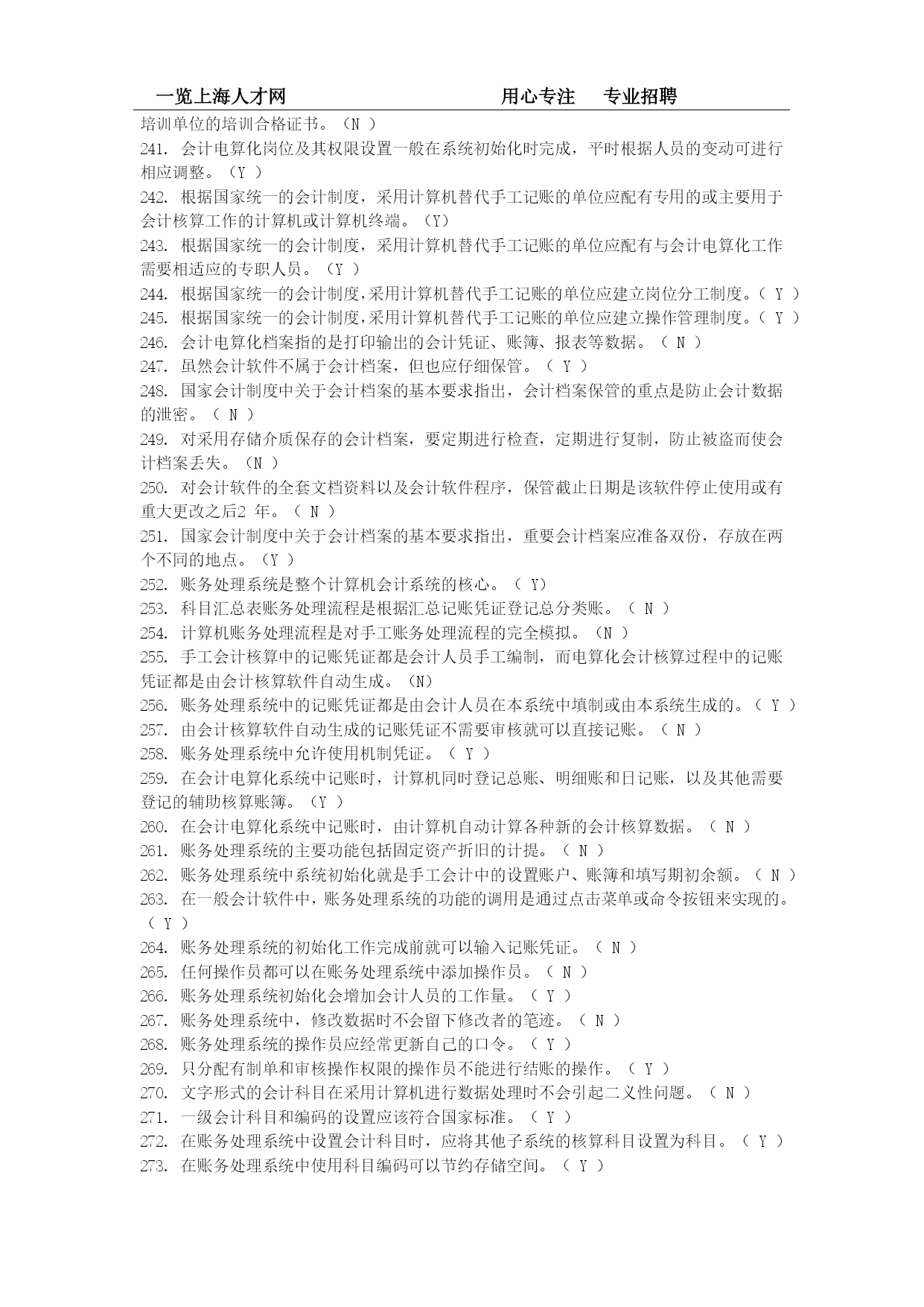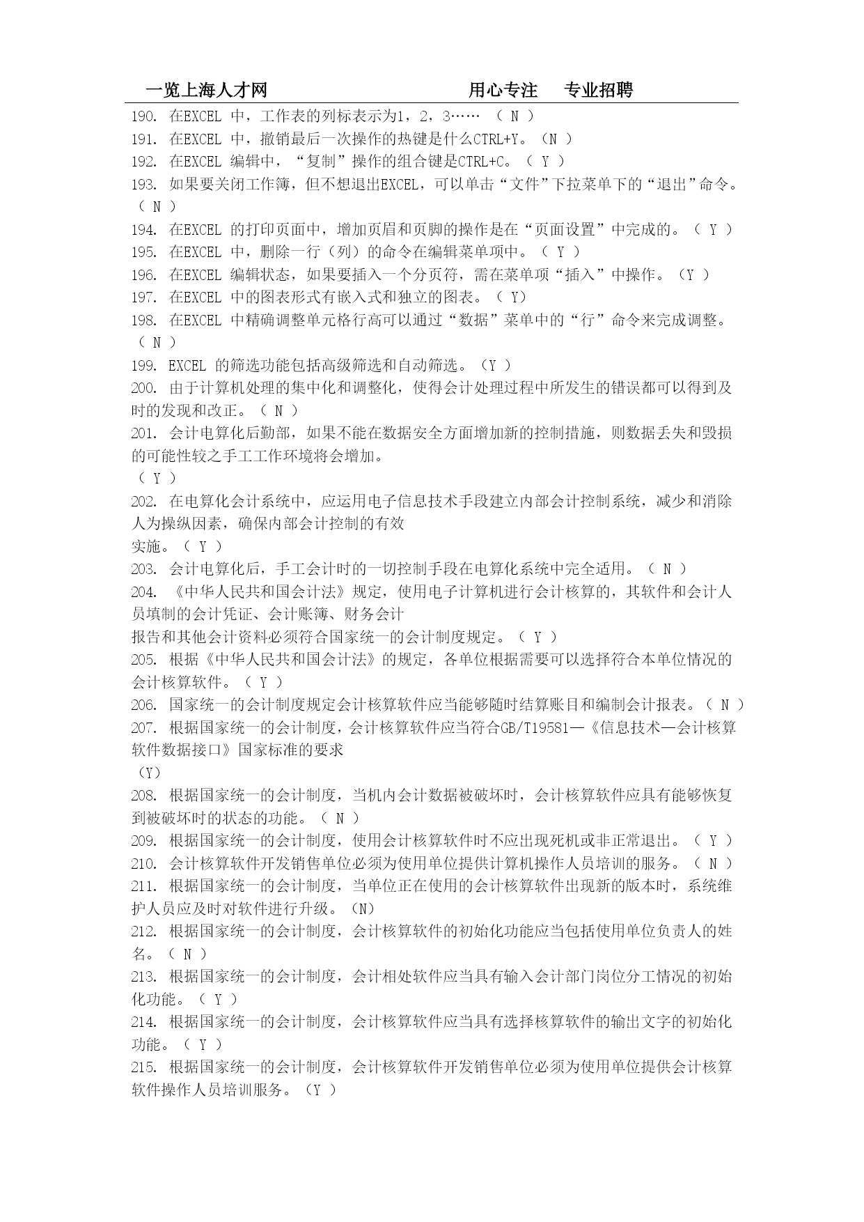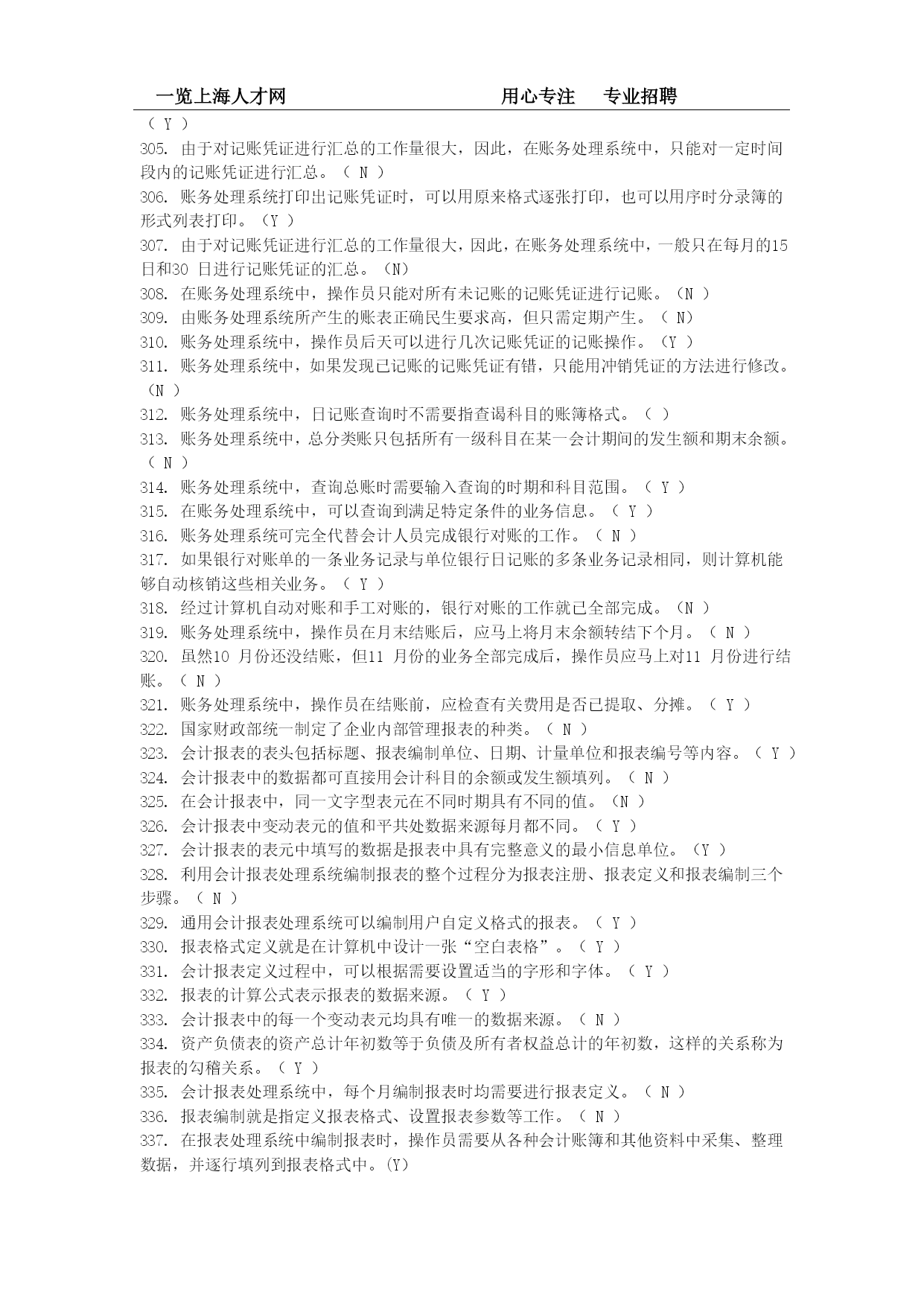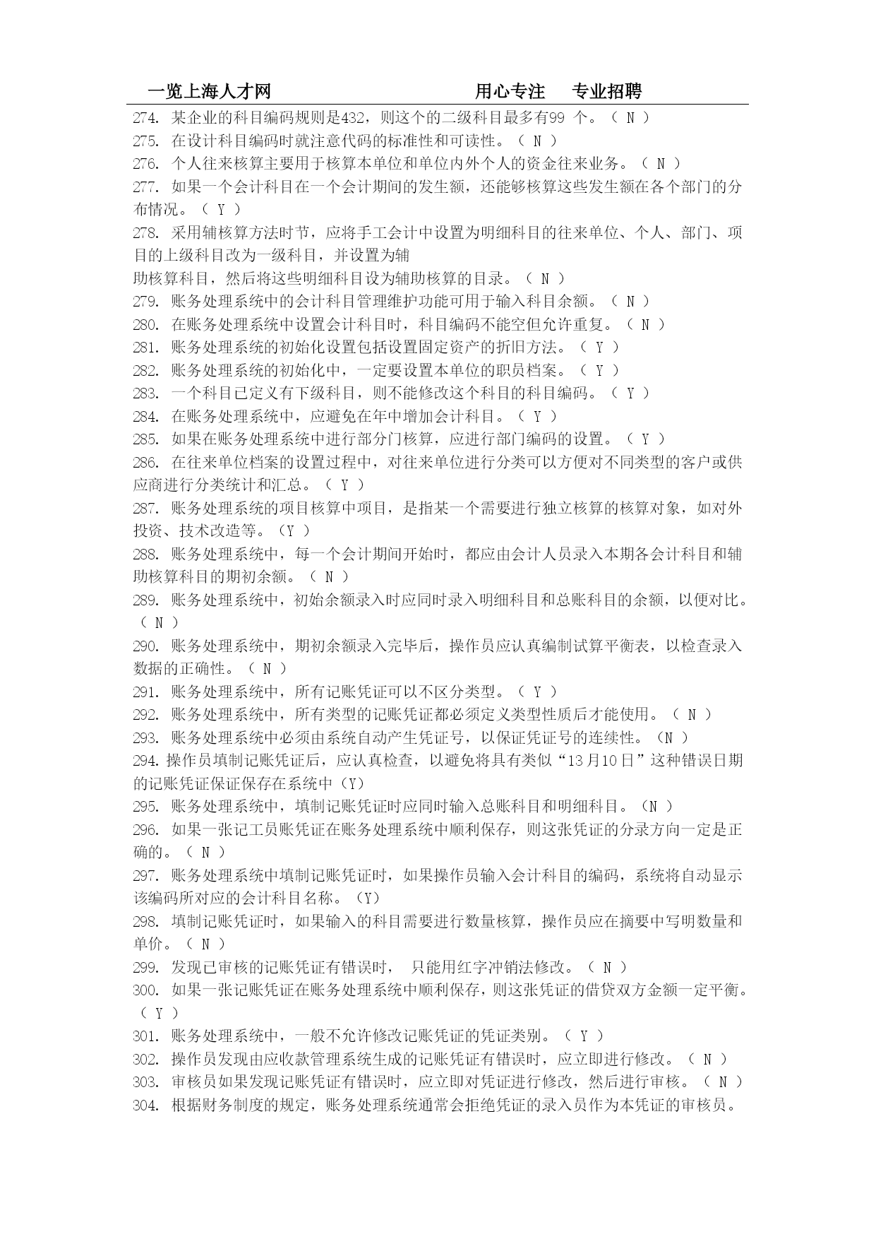 一览HYPERLINK"http://021.job1001.com/"上海人才网用心专注专业招聘一、判断题1.ASCII码是一种校验码。(N)2.CDROM是属于微型计算机的外存储器设备。(Y)3.CPU是由运算器和控制器组成。(Y)4.DVD光盘容量可达普通硬盘的容量的7倍。(N)5.EXCEL工具栏系统的一个显著特点就是灵活的定位方式。用户可以根据需要将工具栏放置在屏幕的任何区域。(Y)6.INTERNET的中文意思是广域网。(N)7.MIPS是表示计算机运行速度的单位。(Y)8.PC机的主流是微软公司在1981年推出的PC机系列及其众多的兼容机。(N)9.ROM不属于微型计算机的外存储器。(Y)10.WINDOWS2000本身提供的一些实用的应用程序,称为WINDOWS2000的附件。(Y)11.WINDOWS2000的文件名字可以有空格但不能有下列符号:?、\、*、<、>、|。(Y)12.WINDOWS包括WINDOWS95、WINDOWS98、WINDOWSNT、WINDOWS2000以及WINDOWSXP等多个操作系统产品。(Y)13.WINDOWS是微软(MICROSOFT)公司开发的操作系统产品的总称。(Y)14.WORD可以在文档任意需要的位置插入当前日期和时间。(Y)15.按照分布距离的长短我们将计算机网络分为局域网、都市网、广域网和互联网。(Y)16.按住鼠标器按键不松开,同时移动鼠标器,称作移动(N)17.报表格式定义就是在计算机中设计一张空白表格。(Y)18.不按鼠标器任何按键,仅移动鼠标器,称作拖放。(N)19.不论是在手工条件下还是电算化条件下,都必须加强账证核对和账账核对工作。(N)20.使用微型计算机和计算机网络会计软件的单位,都必须设立电算主管岗位。(Y)21.计算机带给会计的仅是会计数据处理手段的变革,对会计理论、实务没有什么影响。(N)22.随着会计电算化的不断发展,“会计电算化”的含义有广义和狭义之分。(Y)23.对于企业,会计电算化规划主要分为单位会计电算化规划和会计电算化的宏观发展规划等。(N)24.会计电算化的宏观发展规划主要由财政部门及各行业主管部门制定。(Y)25.企业实现会计电算化,必须使用一个比较规范的核算软件,这个软件通过主管部门的批准才可使用。(Y)26.新的会计核算软件不但能模仿替代手工的核算,进行事后反映,还能进行科学决策、预测和事中控制。(Y)27.会计电算化只是对核算工具和核算方法的改时,不会引起会计工作组织和人员分工的改变。(N)28.网络的使用,合得会计电算化安全性降低,不是会计电算化的发展趋势。(N)29.由于物流、资金流和信息流的一体化,传统意义上的会计电算化将不复存在。(Y)30.处于会计电算化核心位置的是会计制度。(N)31.ERP代表的意思是物流、资金流和信息流。(N)32.中国境内各单位应用的会计核算软件,应当符合财政部所发《会计核算软件基本功能规范》的要求。(Y)33.会计核算软件可以按照企业的需要随意划份会计期间,分期结算账目和编制会计报表。(N)34.专用会计核算软件一般是指自行开发或委托其开发,供本单位使用的会计核算软件。(Y)35.商品化会计软件属于专用会计核算软件。(N)36.通用会计软件学会较难,因此软件易使用性差。(N)37.通用会计软件初始工作量小,容易上手。(N)38.会计核算软件各个模块中,处于核心地位的是账务处理。(Y)39.ENIAC计算机所采用的逻辑器件是小型集成电路。(N)40.人们按计算机体积来划分,大致分为四个发展阶段。(N)41.计算机的发展,当前处于第四代。(Y)42.未来新一代计算机的特点是人工智能。(Y)43.大规模、超大规模集成电路的出现产生了第五代产品的计算机。(N)44.微型计算机属于第四代计算机,主要的元器件是集成电路。(N)45.计算机发展的方向是巨型化、微型化、网络化、智能化。其中“巨型化”是指体积大、重量重。(N)46.办公自动化(OA)是计算机的一顶应用,按计算机应用的分类,它属于信息处理。(N)47.计算机存储器中,组成一个字节的二进制位数是不确定的。(N)48.“32位微机”中的32指的是机器字长。(Y)49.PENTIUMⅢ等微机是使用64位微处理器。(Y)50.MIPS是衡量计算机的传输速率。(N)51.计算机的运行速度,这是由主频率、内存与外存速度的因素所综合决定。(Y)52.ASCII是一种字符编码。(Y)53.计算机系统是由主机和外设两大部分组成。(N)54.一个完整的计算机系统是由硬件系统和软件系统所组成。(Y)55.微型计算机硬件系统中最核心的部