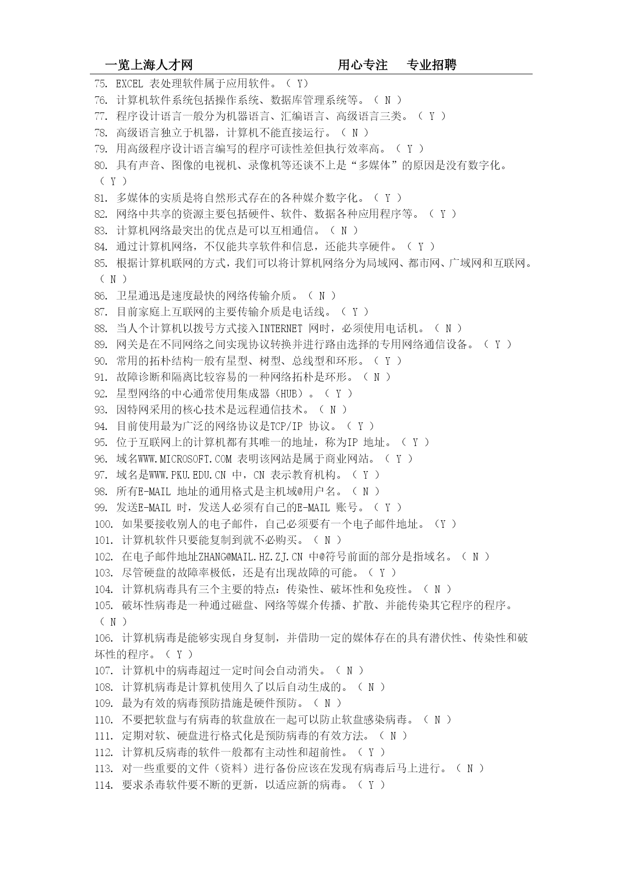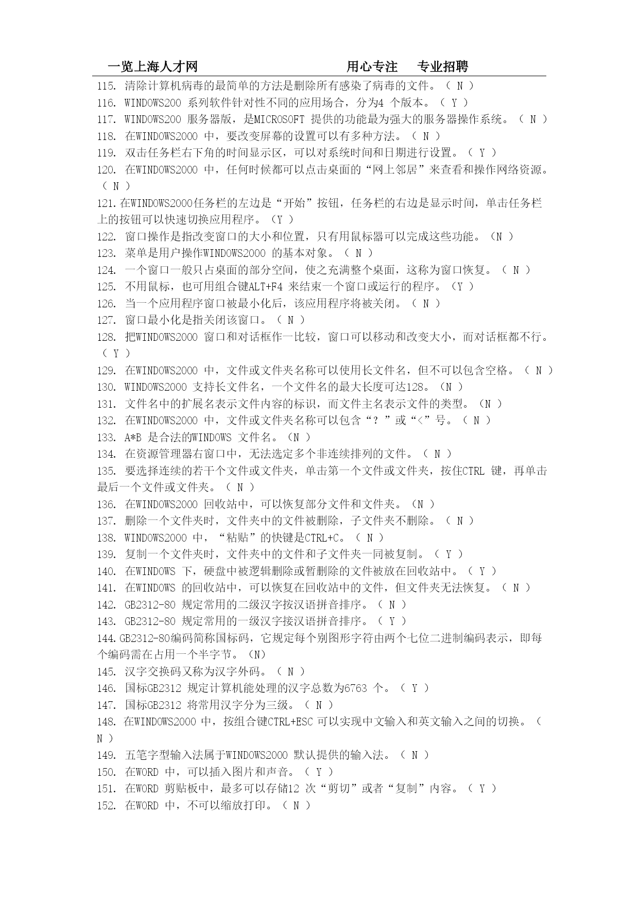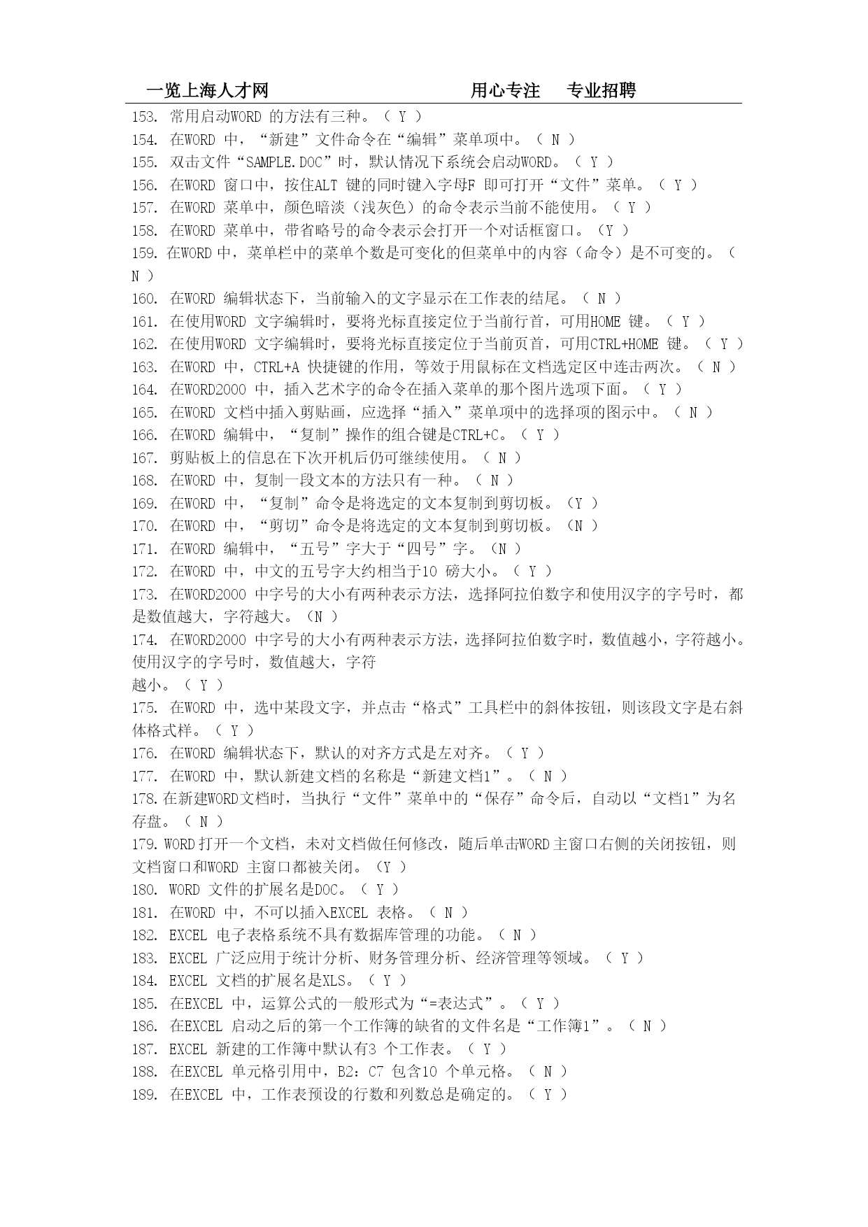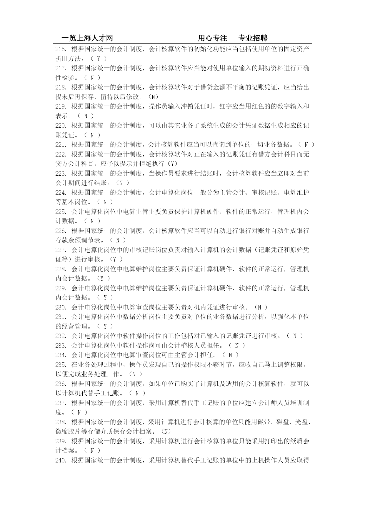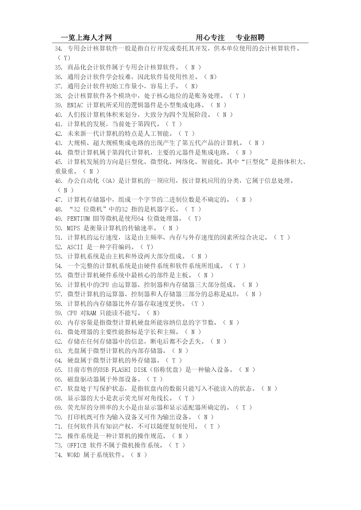 一览HYPERLINK"http://021.job1001.com/"上海人才网用心专注专业招聘一、判断题1.ASCII码是一种校验码。(N)2.CDROM是属于微型计算机的外存储器设备。(Y)3.CPU是由运算器和控制器组成。(Y)4.DVD光盘容量可达普通硬盘的容量的7倍。(N)5.EXCEL工具栏系统的一个显著特点就是灵活的定位方式。用户可以根据需要将工具栏放置在屏幕的任何区域。(Y)6.INTERNET的中文意思是广域网。(N)7.MIPS是表示计算机运行速度的单位。(Y)8.PC机的主流是微软公司在1981年推出的PC机系列及其众多的兼容机。(N)9.ROM不属于微型计算机的外存储器。(Y)10.WINDOWS2000本身提供的一些实用的应用程序,称为WINDOWS2000的附件。(Y)11.WINDOWS2000的文件名字可以有空格但不能有下列符号:?、\、*、<、>、|。(Y)12.WINDOWS包括WINDOWS95、WINDOWS98、WINDOWSNT、WINDOWS2000以及WINDOWSXP等多个操作系统产品。(Y)13.WINDOWS是微软(MICROSOFT)公司开发的操作系统产品的总称。(Y)14.WORD可以在文档任意需要的位置插入当前日期和时间。(Y)15.按照分布距离的长短我们将计算机网络分为局域网、都市网、广域网和互联网。(Y)16.按住鼠标器按键不松开,同时移动鼠标器,称作移动(N)17.报表格式定义就是在计算机中设计一张空白表格。(Y)18.不按鼠标器任何按键,仅移动鼠标器,称作拖放。(N)19.不论是在手工条件下还是电算化条件下,都必须加强账证核对和账账核对工作。(N)20.使用微型计算机和计算机网络会计软件的单位,都必须设立电算主管岗位。(Y)21.计算机带给会计的仅是会计数据处理手段的变革,对会计理论、实务没有什么影响。(N)22.随着会计电算化的不断发展,“会计电算化”的含义有广义和狭义之分。(Y)23.对于企业,会计电算化规划主要分为单位会计电算化规划和会计电算化的宏观发展规划等。(N)24.会计电算化的宏观发展规划主要由财政部门及各行业主管部门制定。(Y)25.企业实现会计电算化,必须使用一个比较规范的核算软件,这个软件通过主管部门的批准才可使用。(Y)26.新的会计核算软件不但能模仿替代手工的核算,进行事后反映,还能进行科学决策、预测和事中控制。(Y)27.会计电算化只是对核算工具和核算方法的改时,不会引起会计工作组织和人员分工的改变。(N)28.网络的使用,合得会计电算化安全性降低,不是会计电算化的发展趋势。(N)29.由于物流、资金流和信息流的一体化,传统意义上的会计电算化将不复存在。(Y)30.处于会计电算化核心位置的是会计制度。(N)31.ERP代表的意思是物流、资金流和信息流。(N)32.中国境内各单位应用的会计核算软件,应当符合财政部所发《会计核算软件基本功能规范》的要求。(Y)33.会计核算软件可以按照企业的需要随意划份会计期间,分期结算账目和编制会计报表。(N)34.专用会计核算软件一般是指自行开发或委托其开发,供本单位使用的会计核算软件。(Y)35.商品化会计软件属于专用会计核算软件。(N)36.通用会计软件学会较难,因此软件易使用性差。(N)37.通用会计软件初始工作量小,容易上手。(N)38.会计核算软件各个模块中,处于核心地位的是账务处理。(Y)39.ENIAC计算机所采用的逻辑器件是小型集成电路。(N)40.人们按计算机体积来划分,大致分为四个发展阶段。(N)41.计算机的发展,当前处于第四代。(Y)42.未来新一代计算机的特点是人工智能。(Y)43.大规模、超大规模集成电路的出现产生了第五代产品的计算机。(N)44.微型计算机属于第四代计算机,主要的元器件是集成电路。(N)45.计算机发展的方向是巨型化、微型化、网络化、智能化。其中“巨型化”是指体积大、重量重。(N)46.办公自动化(OA)是计算机的一顶应用,按计算机应用的分类,它属于信息处理。(N)47.计算机存储器中,组成一个字节的二进制位数是不确定的。(N)48.“32位微机”中的32指的是机器字长。(Y)49.PENTIUMⅢ等微机是使用64位微处理器。(Y)50.MIPS是衡量计算机的传输速率。(N)51.计算机的运行速度,这是由主频率、内存与外存速度的因素所综合决定。(Y)52.ASCII是一种字符编码。(Y)53.计算机系统是由主机和外设两大部分组成。(N)54.一个完整的计算机系统是由硬件系统和软件系统所组成。(Y)55.微型计算机硬件系统中最核心的部