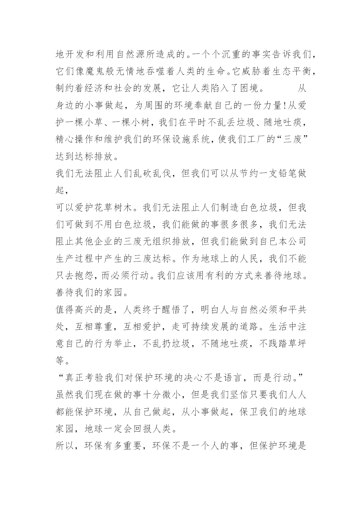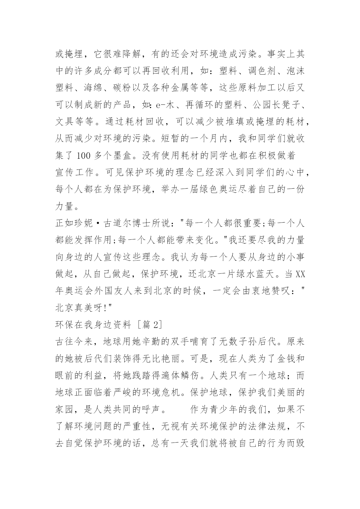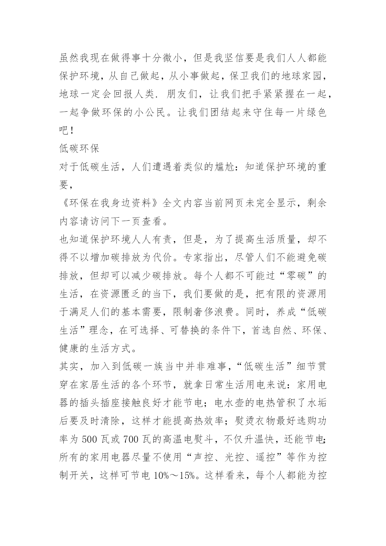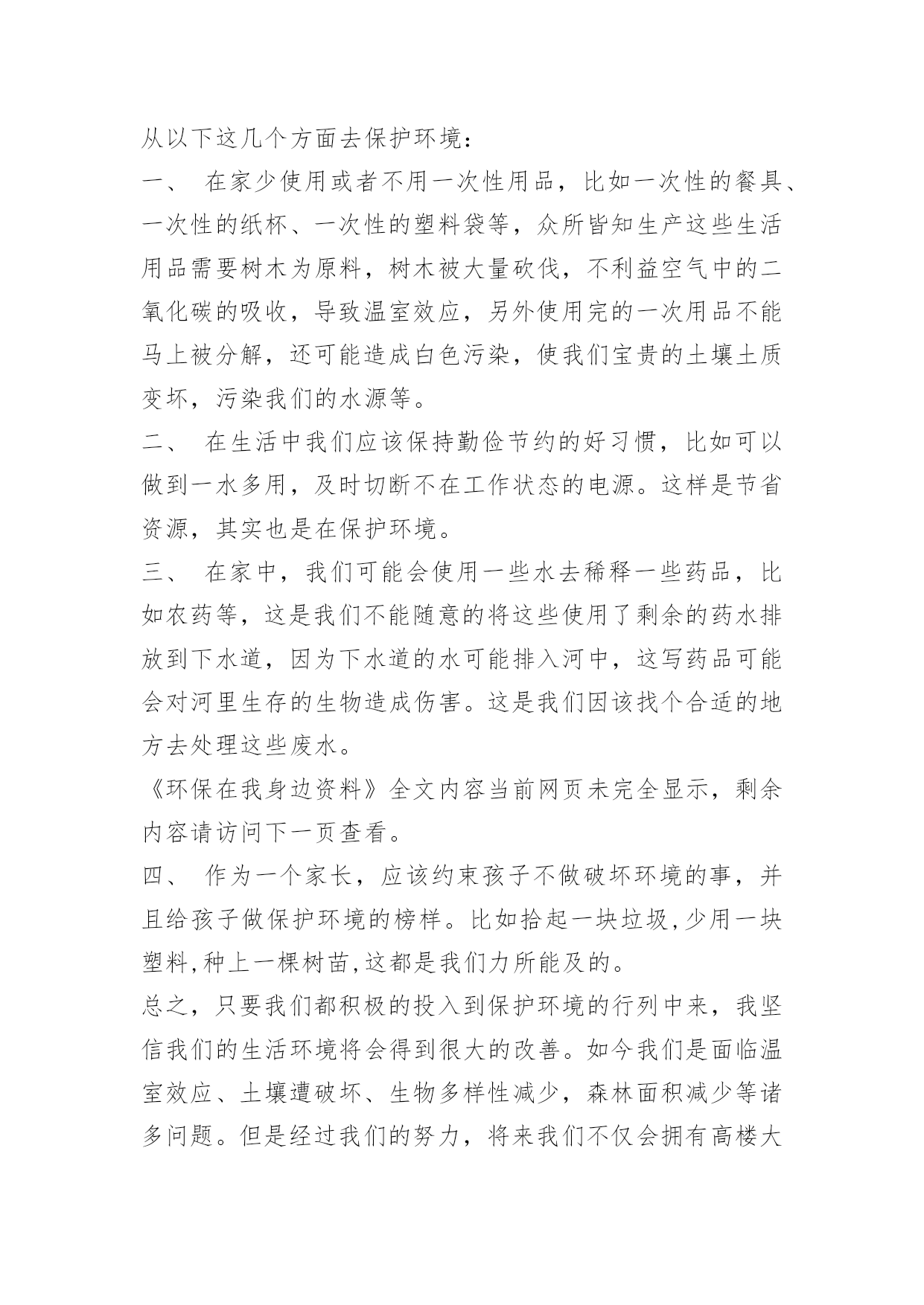 环保在我身边资料环保在我身边资料唯有了解,我们才会关心;唯有关心,我们才会行动;唯有行动,生命才会有希望。我很自豪,因为我生活在中国的首都--北京。北京申办下了XX年的奥运会,每一个中国人都激动不已。到XX年,世界各地的运动员都要来到中国北京,北京会是什么样子呢?让我来描绘一下吧:北京的环境将会有很大的改善,道路两旁种满了绿树,隔离带上开满了鲜花,鸟儿飞翔在蓝蓝的天空上,鱼儿畅游在清清的河水中。景色将会美不胜收。绿色奥运是我们承办的奥运会的主题之一。如今,环境问题已经愈发严峻,保护环境刻不容缓。我们每一个人都应为此贡献出自己的一份力量。我是文汇中学"根与芽"小组的一名成员。"根与芽"是珍妮·古道尔研究会面向全球青年关于环境与人道主义教育的项目。为了迎接奥运,我们"根与芽"小组组织了很多有关保护环境的活动。就在4月份,我们参加了一个"循环巨龙:耗材回收"的活动。这个活动是由地球村、根与芽、自然之友和惠普公司联手打造的。耗材回收计划是为了减少堆填和掩埋垃圾对环境带来的影响,为用户提供简单并环保的方法回收用过的打印机墨盒及墨粉盒。这个活动在同学中的反响很大,因为它与我们息息相关。全校同学都积极参与,大家了解到:耗材如果被弃置在环境中或掩埋,它很难降解,有的还会对环境造成污染。事实上其中的许多成分都可以再回收利用,如:塑料、调色剂、泡沫塑料、海绵、碳粉以及各种金属等等,这些原料加工以后又可以制成新的产品,如:e-木、再循环的塑料、公园长凳子、文具等等。通过耗材回收,可以减少被堆填或掩埋的耗材,从而减少对环境的污染。短暂的一个月内,我和同学们就收集了100多个墨盒。没有使用耗材的同学也都在积极做着宣传工作。可见保护环境的理念已经深入到同学们的心中,每个人都在为保护环境,举办一届绿色奥运尽着自己的一份力量。正如珍妮·古道尔博士所说:"每一个人都很重要;每一个人都能发挥作用;每一个人都能带来变化。"我还要尽我的力量向身边的人宣传这些理念。我认为每一个人要从身边的小事做起,从自己做起,保护环境,还北京一片绿水蓝天。当XX年奥运会外国友人来到北京的时候,一定会由衷地赞叹:"北京真美呀!"环保在我身边资料[篇2]古往今来,地球用她辛勤的双手哺育了无数子孙后代。原来的她被后代们装饰得无比艳丽。可是,现在人类为了金钱和眼前的利益,将她践踏得遍体鳞伤。人类只有一个地球;而地球正面临着严峻的环境危机。保护地球,保护我们美丽的家园,是人类共同的呼声。作为青少年的我们,如果不了解环境问题的严重性,无视有关环境保护的法律法规,不去自觉保护环境的话,总有一天我们就将被自己的行为而毁灭。从身边的小事做起,为周围的环境奉献自己的一份力量!这是我向大家发出的号召。从养一盆花,认养一棵树做起,我们在平时吃饭中可以不用一次性筷子,购物时少用塑料袋,远离白色污染。我们到处都可以看到随地吐痰,乱扔垃圾,废气废水乱排放的“风景”。我们应尽力制止这些事情。并去宣传环保知识.据我所知“环境问题是由于人类不合理地开发和利用自然源所造成的。环境问题主要有废气,废水,废渣和不合理利用自然资源等。”一个个沉重的事实告诉我们,它们像魔鬼一样无情地吞噬着人类的生命。它威胁着生态平衡,制约着经济和社会的发展,它让人类陷入了困境。为此我宣告:“只要我们人类不忘保护环境的意识,地球将成为我们美好的乐园”。未来的空气一定是清新的,水是清澈的,绿树成荫,人类可以尽情享受美丽的大自然。我们无法阻止人们乱砍乱伐,但我们可以从节约一支铅笔做起,可以爱护花草树木。我们无法阻止人们制造白色垃圾,但我们可做到不用白色垃圾,我们能做的事很多很多。作为地球上的人民,我们不能只去抱怨,而必须行动。我们应该用有利的方式来善待地球。善待我们的家园。值得高兴的是,人类终于醒悟了,明白人与自然必须和平共处,互相尊重,互相爱护,走可持续发展的道路。生活中注意自己的行为举止,不乱扔果皮,不乱吐痰,不践踏草坪等。“真正考验我们对保护环境的决心不是语言,而是行动。”虽然我现在做得事十分微小,但是我坚信要是我们人人都能保护环境,从自己做起,从小事做起,保卫我们的地球家园,地球一定会回报人类.朋友们,让我们把手紧紧握在一起,一起争做环保的小公民。让我们团结起来守住每一片绿色吧!低碳环保对于低碳生活,人们遭遇着类似的尴尬:知道保护环境的重要,《环保在我身边资料》全文内容当前网页未完全显示,剩余内容请访问下一页查看。也知道保护环境人人有责,但是,为了提高生活质量,却不得不以增加碳排放为代价。专家指出,尽管人们不能避免碳排放,但却可以减少碳排放。每个人都不可能过“零碳”的生活,在资源匮乏的当下,我们要做的是,把有限的资源用于满足人们的基本需要,限制奢侈浪费。同时,养成“低碳生活”理念,在可选择、可替换的条件下,首选自然、环保、健康的生活方式。