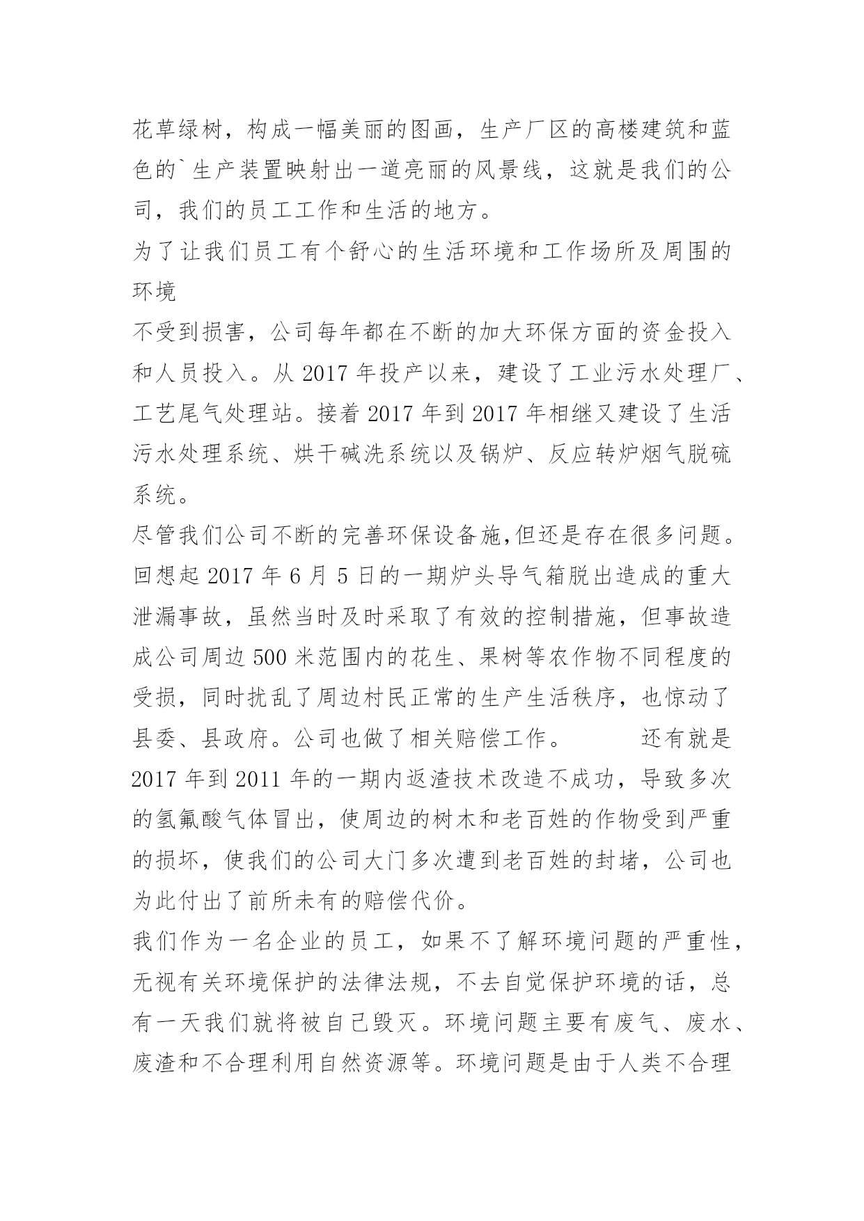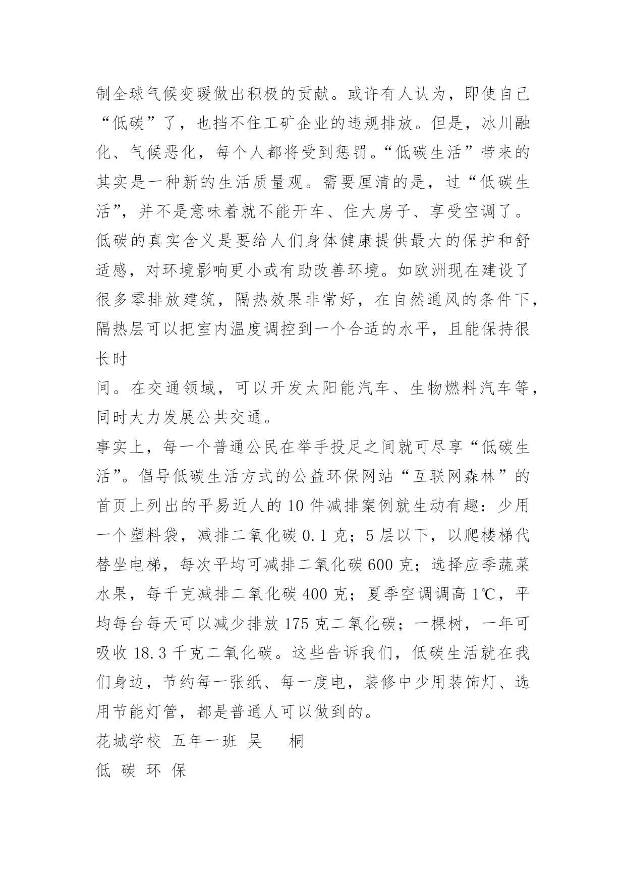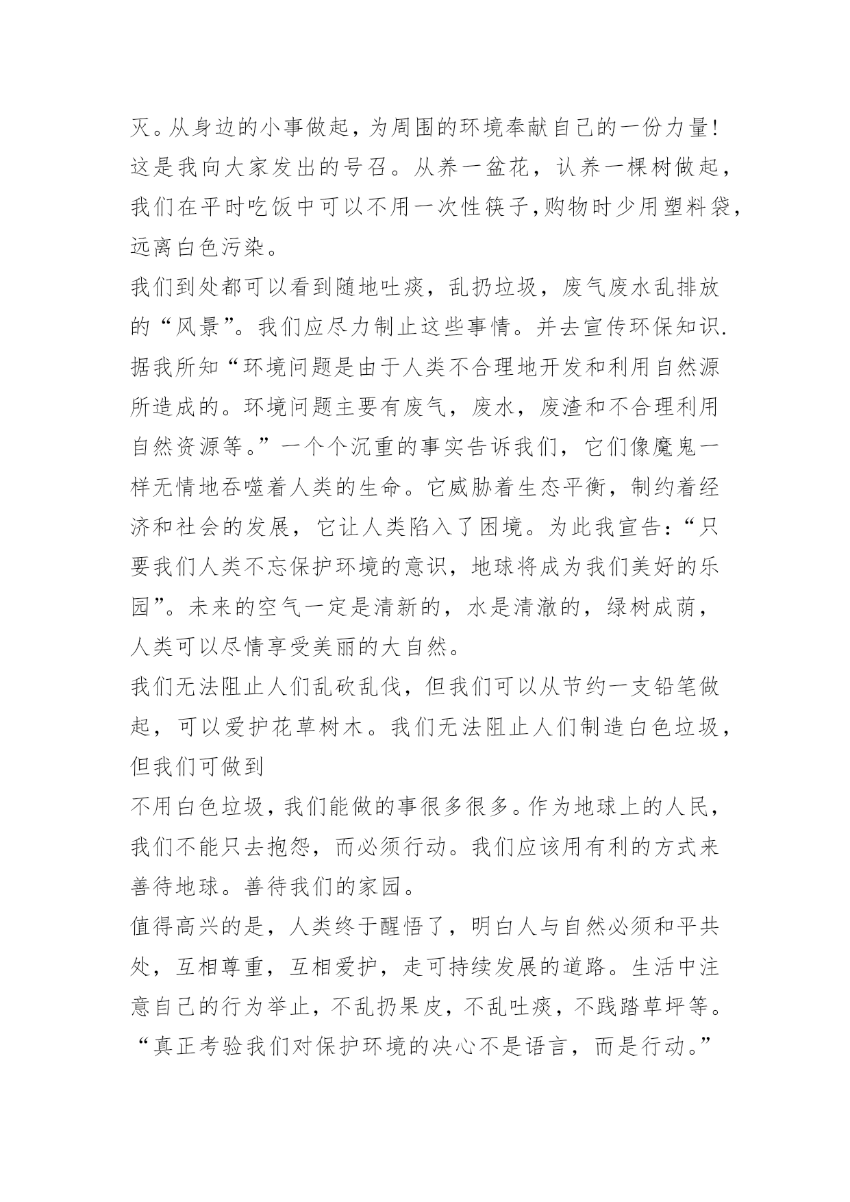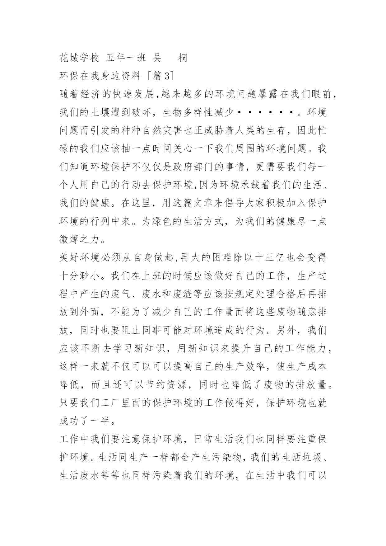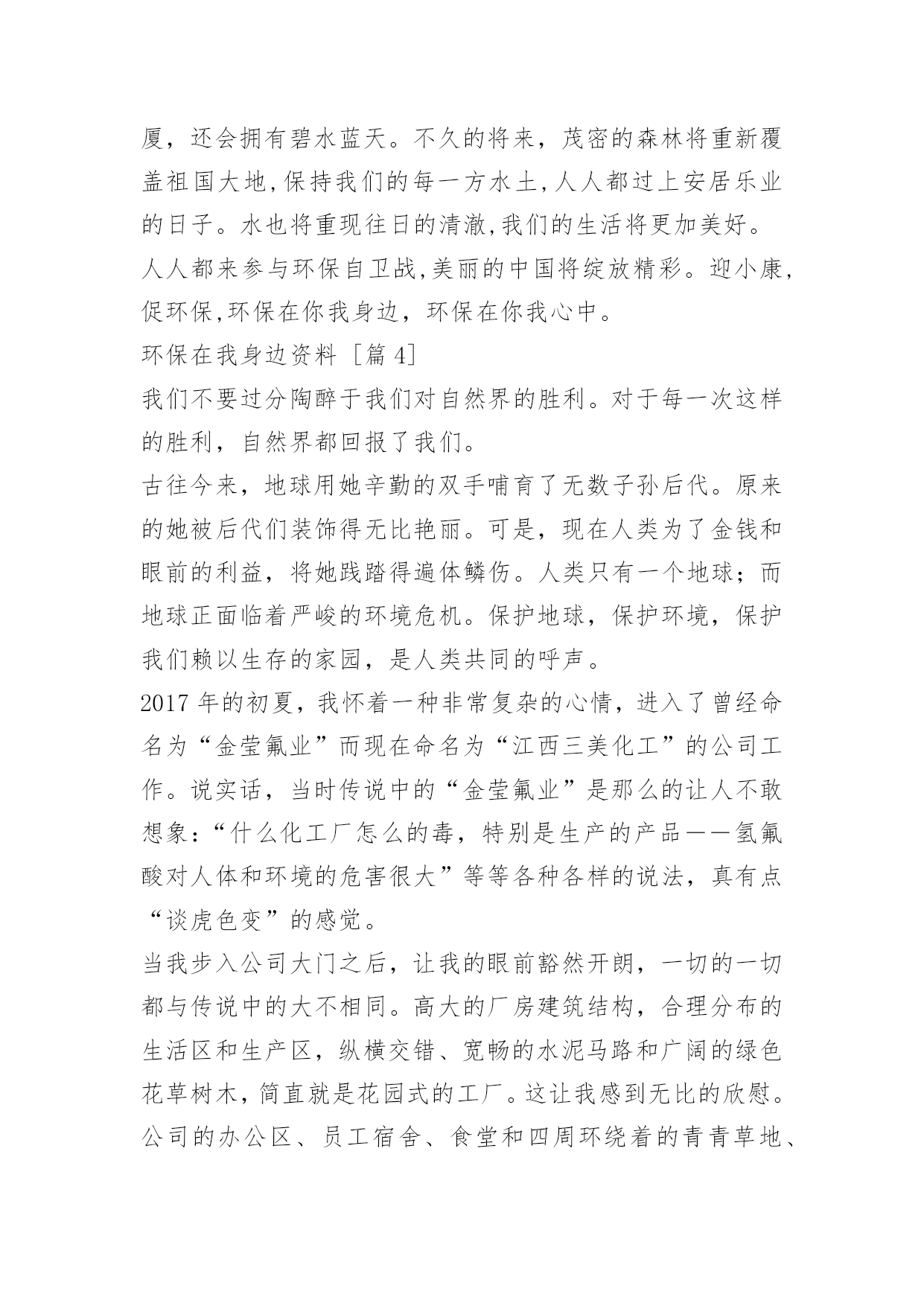 环保在我身边资料环保在我身边资料唯有了解,我们才会关心;唯有关心,我们才会行动;唯有行动,生命才会有希望。我很自豪,因为我生活在中国的首都--北京。北京申办下了XX年的奥运会,每一个中国人都激动不已。到XX年,世界各地的运动员都要来到中国北京,北京会是什么样子呢?让我来描绘一下吧:北京的环境将会有很大的改善,道路两旁种满了绿树,隔离带上开满了鲜花,鸟儿飞翔在蓝蓝的天空上,鱼儿畅游在清清的河水中。景色将会美不胜收。绿色奥运是我们承办的奥运会的主题之一。如今,环境问题已经愈发严峻,保护环境刻不容缓。我们每一个人都应为此贡献出自己的一份力量。我是文汇中学"根与芽"小组的一名成员。"根与芽"是珍妮·古道尔研究会面向全球青年关于环境与人道主义教育的项目。为了迎接奥运,我们"根与芽"小组组织了很多有关保护环境的活动。就在4月份,我们参加了一个"循环巨龙:耗材回收"的活动。这个活动是由地球村、根与芽、自然之友和惠普公司联手打造的。耗材回收计划是为了减少堆填和掩埋垃圾对环境带来的影响,为用户提供简单并环保的方法回收用过的打印机墨盒及墨粉盒。这个活动在同学中的反响很大,因为它与我们息息相关。全校同学都积极参与,大家了解到:耗材如果被弃置在环境中或掩埋,它很难降解,有的还会对环境造成污染。事实上其中的许多成分都可以再回收利用,如:塑料、调色剂、泡沫塑料、海绵、碳粉以及各种金属等等,这些原料加工以后又可以制成新的产品,如:e-木、再循环的塑料、公园长凳子、文具等等。通过耗材回收,可以减少被堆填或掩埋的耗材,从而减少对环境的污染。短暂的一个月内,我和同学们就收集了100多个墨盒。没有使用耗材的同学也都在积极做着宣传工作。可见保护环境的理念已经深入到同学们的心中,每个人都在为保护环境,举办一届绿色奥运尽着自己的一份力量。正如珍妮·古道尔博士所说:"每一个人都很重要;每一个人都能发挥作用;每一个人都能带来变化。"我还要尽我的力量向身边的人宣传这些理念。我认为每一个人要从身边的小事做起,从自己做起,保护环境,还北京一片绿水蓝天。当XX年奥运会外国友人来到北京的时候,一定会由衷地赞叹:"北京真美呀!"环保在我身边资料[篇2]古往今来,地球用她辛勤的双手哺育了无数子孙后代。原来的她被后代们装饰得无比艳丽。可是,现在人类为了金钱和眼前的利益,将她践踏得遍体鳞伤。人类只有一个地球;而地球正面临着严峻的环境危机。保护地球,保护我们美丽的家园,是人类共同的呼声。作为青少年的我们,如果不了解环境问题的严重性,无视有关环境保护的法律法规,不去自觉保护环境的话,总有一天我们就将被自己的行为而毁灭。从身边的小事做起,为周围的环境奉献自己的一份力量!这是我向大家发出的号召。从养一盆花,认养一棵树做起,我们在平时吃饭中可以不用一次性筷子,购物时少用塑料袋,远离白色污染。我们到处都可以看到随地吐痰,乱扔垃圾,废气废水乱排放的“风景”。我们应尽力制止这些事情。并去宣传环保知识.据我所知“环境问题是由于人类不合理地开发和利用自然源所造成的。环境问题主要有废气,废水,废渣和不合理利用自然资源等。”一个个沉重的事实告诉我们,它们像魔鬼一样无情地吞噬着人类的生命。它威胁着生态平衡,制约着经济和社会的发展,它让人类陷入了困境。为此我宣告:“只要我们人类不忘保护环境的意识,地球将成为我们美好的乐园”。未来的空气一定是清新的,水是清澈的,绿树成荫,人类可以尽情享受美丽的大自然。我们无法阻止人们乱砍乱伐,但我们可以从节约一支铅笔做起,可以爱护花草树木。我们无法阻止人们制造白色垃圾,但我们可做到不用白色垃圾,我们能做的事很多很多。作为地球上的人民,我们不能只去抱怨,而必须行动。我们应该用有利的方式来善待地球。善待我们的家园。值得高兴的是,人类终于醒悟了,明白人与自然必须和平共处,互相尊重,互相爱护,走可持续发展的道路。生活中注意自己的行为举止,不乱扔果皮,不乱吐痰,不践踏草坪等。“真正考验我们对保护环境的决心不是语言,而是行动。”虽然我现在做得事十分微小,但是我坚信要是我们人人都能保护环境,从自己做起,从小事做起,保卫我们的地球家园,地球一定会回报人类.朋友们,让我们把手紧紧握在一起,一起争做环保的小公民。让我们团结起来守住每一片绿色吧!低碳环保对于低碳生活,人们遭遇着类似的尴尬:知道保护环境的重要,《环保在我身边资料》全文内容当前网页未完全显示,剩余内容请访问下一页查看。也知道保护环境人人有责,但是,为了提高生活质量,却不得不以增加碳排放为代价。专家指出,尽管人们不能避免碳排放,但却可以减少碳排放。每个人都不可能过“零碳”的生活,在资源匮乏的当下,我们要做的是,把有限的资源用于满足人们的基本需要,限制奢侈浪费。同时,养成“低碳生活”理念,在可选择、可替换的条件下,首选自然、环保、健康的生活方式。