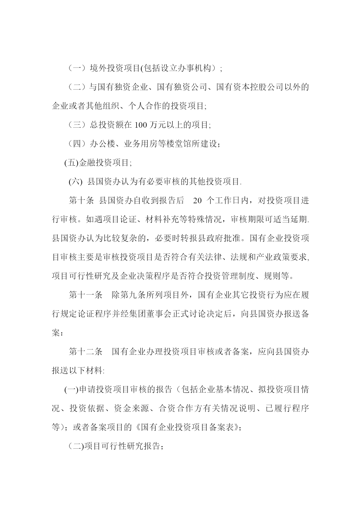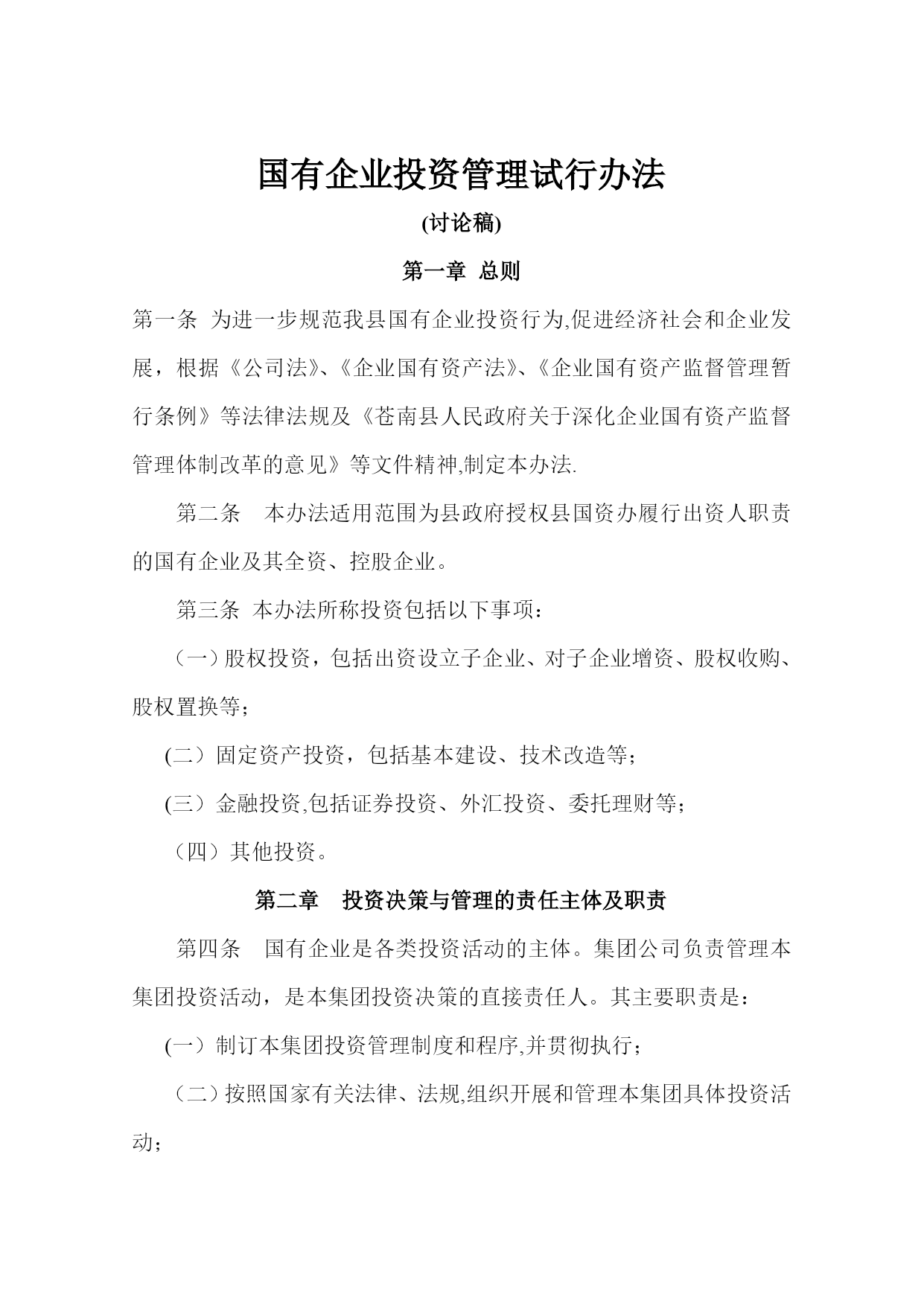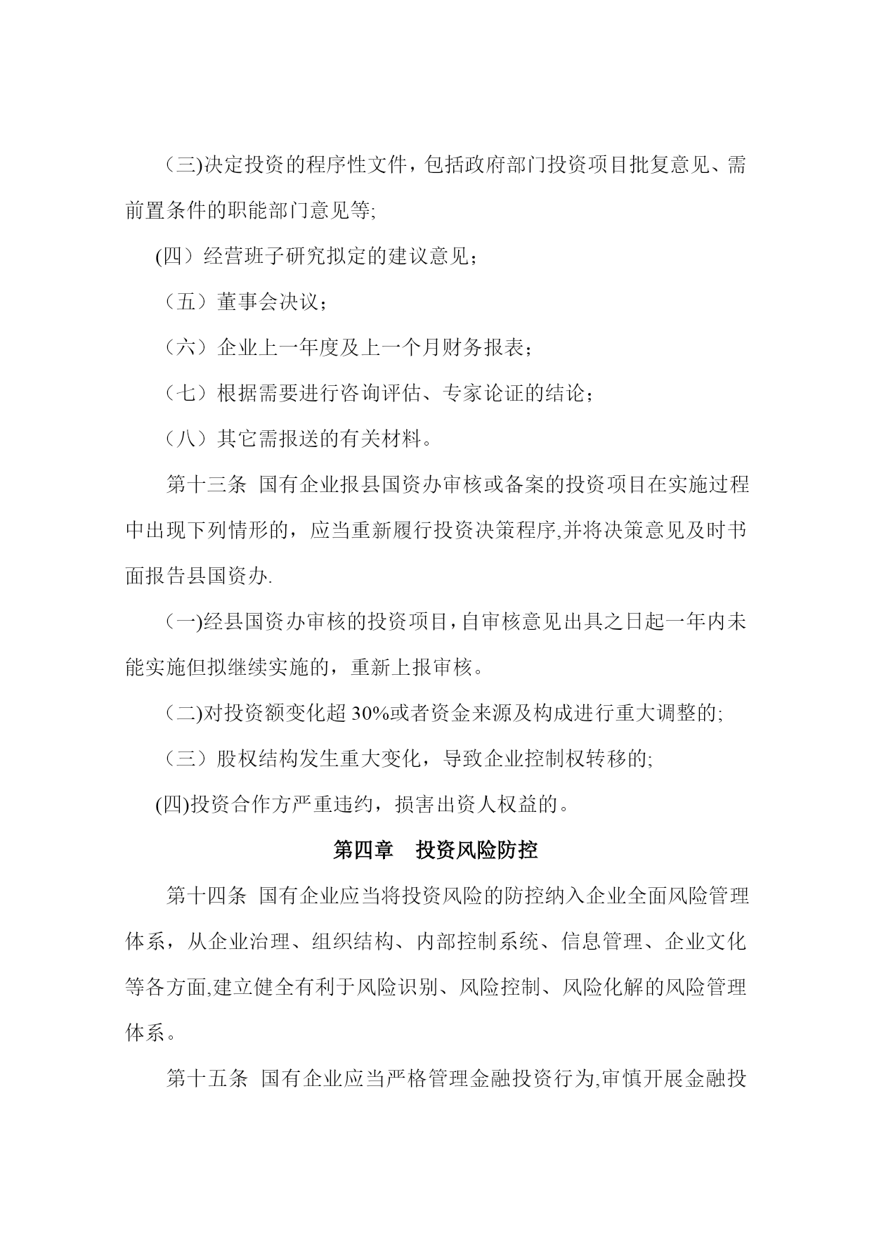 国有企业投资管理试行办法(完整资料)(可以直接使用,可编辑优秀版资料,欢迎下载)国有企业投资管理试行办法(讨论稿)第一章总则第一条为进一步规范我县国有企业投资行为,促进经济社会和企业发展,根据《公司法》、《企业国有资产法》、《企业国有资产监督管理暂行条例》等法律法规及《苍南县人民政府关于深化企业国有资产监督管理体制改革的意见》等文件精神,制定本办法.第二条本办法适用范围为县政府授权县国资办履行出资人职责的国有企业及其全资、控股企业。第三条本办法所称投资包括以下事项:(一)股权投资,包括出资设立子企业、对子企业增资、股权收购、股权置换等;(二)固定资产投资,包括基本建设、技术改造等;(三)金融投资,包括证券投资、外汇投资、委托理财等;(四)其他投资。第二章投资决策与管理的责任主体及职责第四条国有企业是各类投资活动的主体。集团公司负责管理本集团投资活动,是本集团投资决策的直接责任人。其主要职责是:(一)制订本集团投资管理制度和程序,并贯彻执行;(二)按照国家有关法律、法规,组织开展和管理本集团具体投资活动;(三)负责集团本级并指导管理所属企业的投资项目可行性研究、投资决策、风险控制、投资评价等;(四)向县国资办报送投资备案和需审核项目的报告;(五)对所属企业履行投资监管职责。第五条国有企业投资活动应当遵循以下原则:(一)符合国家和地方(含省、市、县)经济发展规划、产业导向等有关政策法规的方向和要求;(二)符合县级国有资本布局结构调整方向、企业发展规划和主业发展需要;(三)投资活动应规范执行企业投资决策程序,符合有关管理制度要求;(四)投资规模应与企业资产经营规模、资产负债水平及实际筹资能力相适应;(五)从严管理境外投资、金融投资、非主业投资和楼堂管所建设,审慎开展与非国有企业的合作投资。(六)由新投资形成的全资、控股(含拥有实际控制权)的企业层级,连同集团公司本级,原则上总数不超过三级;第六条国有企业必须建立健全投资管理制度,制度主要包括或明确以下内容:(一)董事会投资决策管理规则、权限和决策程序;(二)明确投资管理日常工作机构及管理职责;(三)对所属企业投资项目管理的规则和程序;(四)明确开展投资活动所必须遵循的基本原则,以及资产负债率、投资收益率等内部管理控制指标;(五)开展项目可行性研究和论证的规定或制度;(六)固定资产投资项目组织实施中的招投标管理、工程建设监督管理体系与实施过程的管理规定或制度;(七)重大投资项目审计和后评价工作体系的制度建设与实施要求;(八)投资风险管理机制,重点是法律、财务等方面的风险防范措施及重大投资活动可能出现问题的处理预案;(九)需规定或明确的其他事项。第七条根据《企业国有资产法》,国有企业的重大投资由董事会决定,企业是自身各类投资行为的责任主体,对所决定的投资事项直接负责.其具体投资活动,必须履行以下决策程序和要求:(一)由企业负责投资管理的机构在科学论证的基础上拟出初步投资方案;(二)编制或按相关规定委托有资质的机构编制可行性研究报告,必要的还应编制重大决策社会风险评估报告;(三)由企业总经理负责召集经营班子研究完善,并正式提出投资方案;(四)国有企业董事会召开会议,结合可研报告及重大风险评估意见书,对投资方案进行研究讨论,并作出决议;(五)企业投资方案在执行过程中如有投资额、资金来源及构成需要调整,或投资对象股权结构发生变化、投资合作方违约、因不可控因素造成投资风险剧增或已存在较大潜在损失等重大变化,需要调整或终止投资方案的,必须经企业董事会重新决策并作出新的书面决议;(六)企业董事会应当定期听取、分析、检查全部投资项目的执行情况。第八条县国资办依法对国有企业的投资活动进行监督管理,管理的主要内容是:(一)指导国有企业建立健全投资决策程序和管理制度,并开展监督检查;(二)建立国有企业重要投资事项报告、备案、审核机制并指导企业认真贯彻执行;(三)对国有企业总体投资情况进行统计分析,对重大投资项目开展稽查、审计、后评价等动态监督,对发现问题进行追责;(四)法律、法规规定的其他出资人职责.第三章投资项目的监督管理第九条除县政府直接决策项目外,国有企业及所属企业发生下列情形的,应按第二章规定的程序严格审查、酝酿、评估,由集团董事会正式会议讨论并作出书面决定后,报送县国资办进行审核,未经审核的项目,不得实施:(一)境外投资项目(包括设立办事机构);(二)与国有独资企业、国有独资公司、国有资本控股公司以外的企业或者其他组织、个人合作的投资项目;(三)总投资额在100万元以上的项目;(四)办公楼、业务用房等楼堂馆所建设;(五)金融投资项目;(六)县国资办认为有必要审核的其他投资项目.第十条