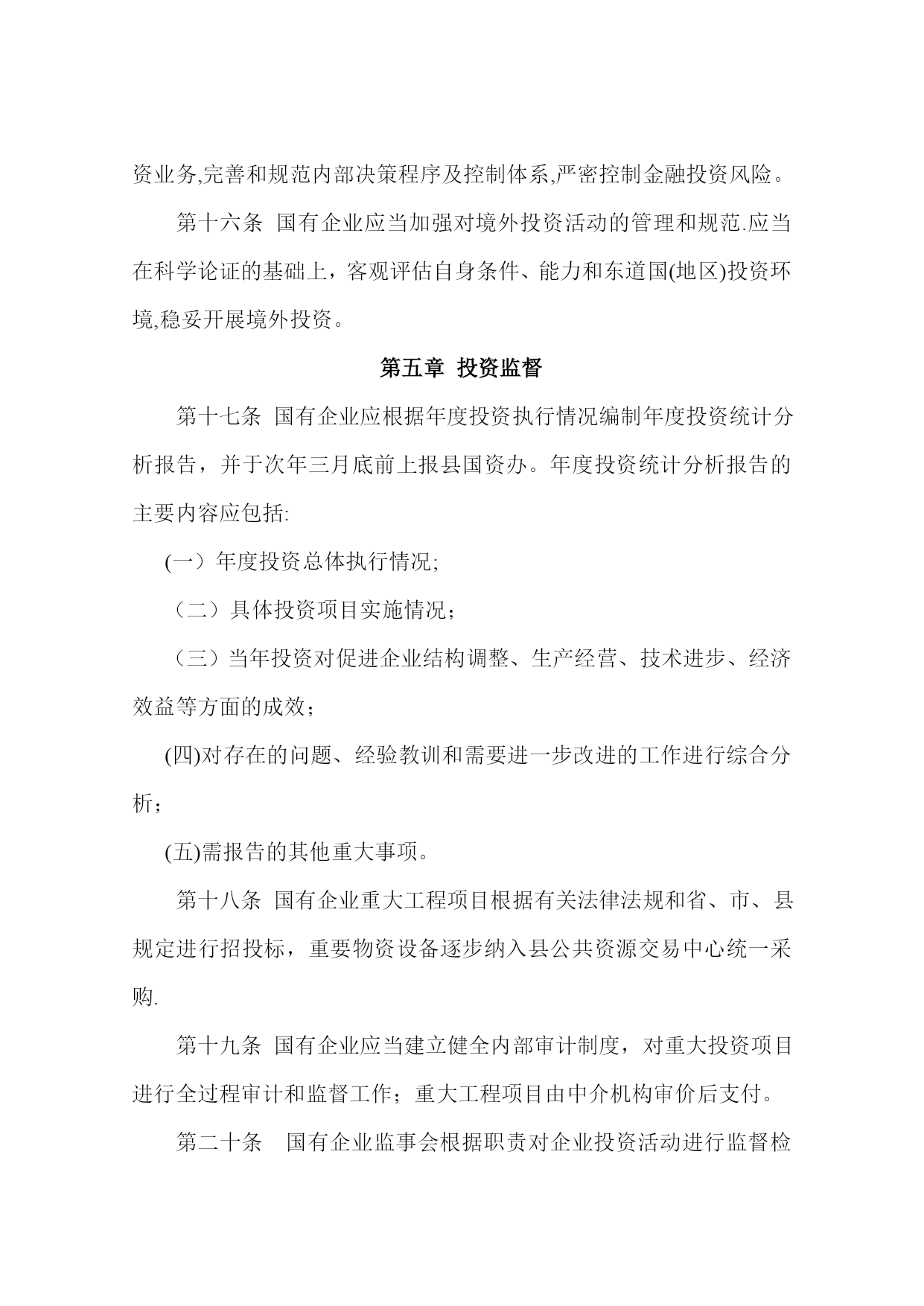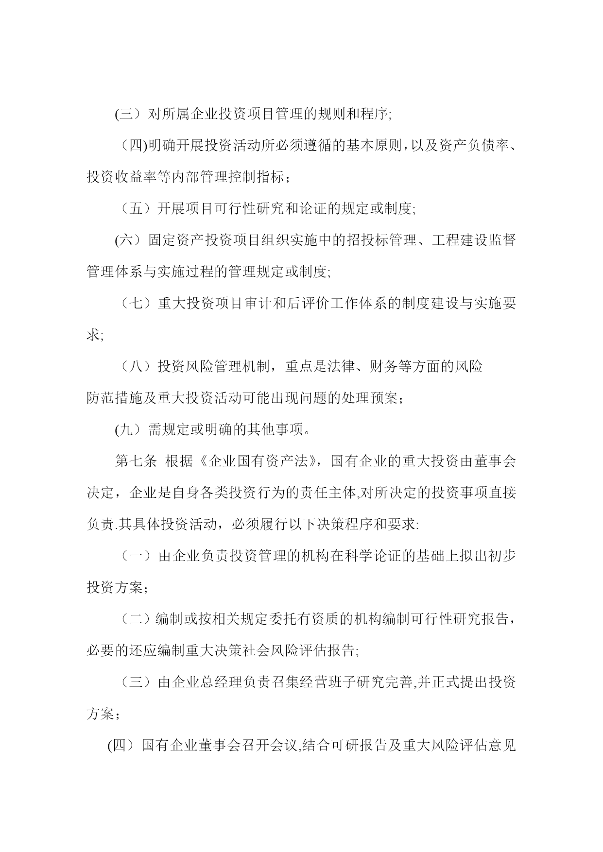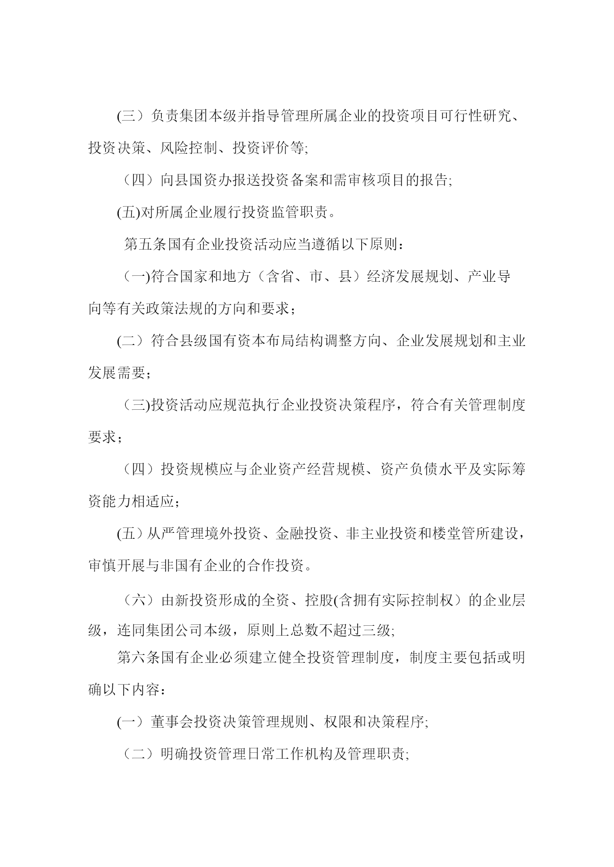 国有企业投资管理试行办法(完整资料)(可以直接使用,可编辑优秀版资料,欢迎下载)国有企业投资管理试行办法(讨论稿)第一章总则第一条为进一步规范我县国有企业投资行为,促进经济社会和企业发展,根据《公司法》、《企业国有资产法》、《企业国有资产监督管理暂行条例》等法律法规及《苍南县人民政府关于深化企业国有资产监督管理体制改革的意见》等文件精神,制定本办法.第二条本办法适用范围为县政府授权县国资办履行出资人职责的国有企业及其全资、控股企业。第三条本办法所称投资包括以下事项:(一)股权投资,包括出资设立子企业、对子企业增资、股权收购、股权置换等;(二)固定资产投资,包括基本建设、技术改造等;(三)金融投资,包括证券投资、外汇投资、委托理财等;(四)其他投资。第二章投资决策与管理的责任主体及职责第四条国有企业是各类投资活动的主体。集团公司负责管理本集团投资活动,是本集团投资决策的直接责任人。其主要职责是:(一)制订本集团投资管理制度和程序,并贯彻执行;(二)按照国家有关法律、法规,组织开展和管理本集团具体投资活动;(三)负责集团本级并指导管理所属企业的投资项目可行性研究、投资决策、风险控制、投资评价等;(四)向县国资办报送投资备案和需审核项目的报告;(五)对所属企业履行投资监管职责。第五条国有企业投资活动应当遵循以下原则:(一)符合国家和地方(含省、市、县)经济发展规划、产业导向等有关政策法规的方向和要求;(二)符合县级国有资本布局结构调整方向、企业发展规划和主业发展需要;(三)投资活动应规范执行企业投资决策程序,符合有关管理制度要求;(四)投资规模应与企业资产经营规模、资产负债水平及实际筹资能力相适应;(五)从严管理境外投资、金融投资、非主业投资和楼堂管所建设,审慎开展与非国有企业的合作投资。(六)由新投资形成的全资、控股(含拥有实际控制权)的企业层级,连同集团公司本级,原则上总数不超过三级;第六条国有企业必须建立健全投资管理制度,制度主要包括或明确以下内容:(一)董事会投资决策管理规则、权限和决策程序;(二)明确投资管理日常工作机构及管理职责;(三)对所属企业投资项目管理的规则和程序;(四)明确开展投资活动所必须遵循的基本原则,以及资产负债率、投资收益率等内部管理控制指标;(五)开展项目可行性研究和论证的规定或制度;(六)固定资产投资项目组织实施中的招投标管理、工程建设监督管理体系与实施过程的管理规定或制度;(七)重大投资项目审计和后评价工作体系的制度建设与实施要求;(八)投资风险管理机制,重点是法律、财务等方面的风险防范措施及重大投资活动可能出现问题的处理预案;(九)需规定或明确的其他事项。第七条根据《企业国有资产法》,国有企业的重大投资由董事会决定,企业是自身各类投资行为的责任主体,对所决定的投资事项直接负责.其具体投资活动,必须履行以下决策程序和要求:(一)由企业负责投资管理的机构在科学论证的基础上拟出初步投资方案;(二)编制或按相关规定委托有资质的机构编制可行性研究报告,必要的还应编制重大决策社会风险评估报告;(三)由企业总经理负责召集经营班子研究完善,并正式提出投资方案;(四)国有企业董事会召开会议,结合可研报告及重大风险评估意见书,对投资方案进行研究讨论,并作出决议;(五)企业投资方案在执行过程中如有投资额、资金来源及构成需要调整,或投资对象股权结构发生变化、投资合作方违约、因不可控因素造成投资风险剧增或已存在较大潜在损失等重大变化,需要调整或终止投资方案的,必须经企业董事会重新决策并作出新的书面决议;(六)企业董事会应当定期听取、分析、检查全部投资项目的执行情况。第八条县国资办依法对国有企业的投资活动进行监督管理,管理的主要内容是:(一)指导国有企业建立健全投资决策程序和管理制度,并开展监督检查;(二)建立国有企业重要投资事项报告、备案、审核机制并指导企业认真贯彻执行;(三)对国有企业总体投资情况进行统计分析,对重大投资项目开展稽查、审计、后评价等动态监督,对发现问题进行追责;(四)法律、法规规定的其他出资人职责.第三章投资项目的监督管理第九条除县政府直接决策项目外,国有企业及所属企业发生下列情形的,应按第二章规定的程序严格审查、酝酿、评估,由集团董事会正式会议讨论并作出书面决定后,报送县国资办进行审核,未经审核的项目,不得实施:(一)境外投资项目(包括设立办事机构);(二)与国有独资企业、国有独资公司、国有资本控股公司以外的企业或者其他组织、个人合作的投资项目;(三)总投资额在100万元以上的项目;(四)办公楼、业务用房等楼堂馆所建设;(五)金融投资项目;(六)县国资办认为有必要审核的其他投资项目.第十条