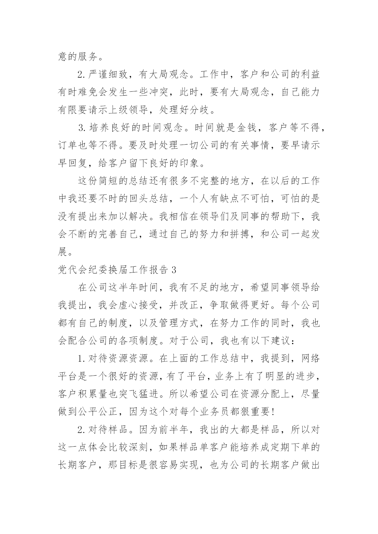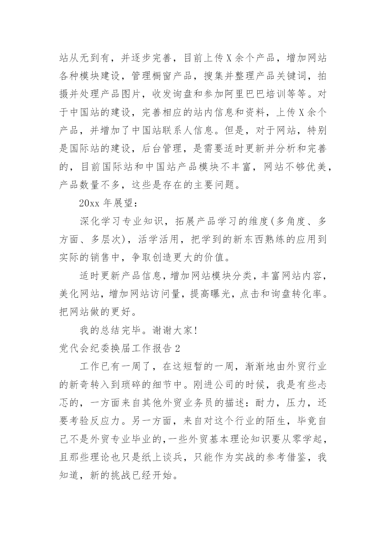 党代会纪委换届工作报告党代会纪委换届工作报告在学习、工作生活中,报告的使用频率呈上升趋势,我们在写报告的时候要注意涵盖报告的基本要素。我敢肯定,大部分人都对写报告很是头疼的,下面是小编帮大家整理的党代会纪委换届工作报告,欢迎阅读,希望大家能够喜欢。党代会纪委换届工作报告1时光匆匆,转瞬即逝,20xx年离我们渐行渐远,20xx年已经悄悄地到来。不管我们在20xx年里做过什么,无论好与坏,成与败,这已成为历史,我们无法去更改,能做的就是回顾历史,谱写未来。20xx年回顾历史:20xx年X月X日是我入职这里的第一天,到现在算算有X个月左右了。在这一个季度里,谢谢领导和同事们的支持与帮助,使得我从对一无所知,到现在知道名称,懂得了一些零件的工件原理,再到整个连接方式等等,这些专业知识的积累,都有了很好的认知。但是对于这些专业知识的认识深度还不够,维度比较窄,不能熟练应用所学的东西,便导致了没有很好的创造价值。对于阿里巴巴国际站和中国站的管理,有了一个新的认识和操作水平,阿里巴巴国际站从X月X日开通到现在,网站从无到有,并逐步完善,目前上传X余个产品,增加网站各种模块建设,管理橱窗产品,搜集并整理产品关键词,拍摄并处理产品图片,收发询盘和参加阿里巴巴培训等等。对于中国站的建设,完善相应的站内信息和资料,上传X余个产品,并增加了中国站联系人信息。但是,对于网站,特别是国际站的建设,后台管理,是需要适时更新并分析和完善的,目前国际站和中国站产品模块不丰富,网站不够优美,产品数量不多,这些是存在的主要问题。20xx年展望:深化学习专业知识,拓展产品学习的维度(多角度、多方面、多层次),活学活用,把学到的新东西熟练的应用到实际的销售中,争取创造更大的价值。适时更新产品信息,增加网站模块分类,丰富网站内容,美化网站,增加网站访问量,提高曝光,点击和询盘转化率。把网站做的更好。我的总结完毕。谢谢大家!党代会纪委换届工作报告2工作已有一周了,在这短暂的一周,渐渐地由外贸行业的新奇转入到琐碎的细节中。刚进公司的时候,我是有些忐忑的,一方面来自其他外贸业务员的描述:耐力,压力,还要考验反应力。另一方面,来自对这个行业的陌生,毕竟自己不是外贸专业毕业的,一些外贸基本理论知识要从零学起,且那些理论也只是纸上谈兵,只能作为实战的参考借鉴,我知道,新的挑战已经开始。非常幸运的,我的职场生活有一个不错的开端。我的指导师父是外贸这块的经理小郑。在小郑的帮助下,我先从熟悉本公司的出口产品—FROZENTILAPIAWHOLEROUND(冻条冻罗非鱼)开始。熟悉出口产品最好的途径就是进工厂车间看冻条冻罗非鱼的加工流程是怎么样的。穿上车间工作服之后,我跟着品管部的其中一位负责人老邹进车间,听他详细介绍罗非鱼的加工流程,并帮他做产品抽查检测工作,算出本批产品的渡冰率。接下来几天就是坐在小郑旁边,看他如何与其他公司的人员交接工作如何沟通的,并不断认识与我们公司出口业务等有重大关系的人员。最后,比较重要的就是学习缮制结汇单据以及报检、报关单据。在小郑的教导下认识这些看似简单但很重要的单据,并熟记这些单据的主要内容,并靠记忆自主完成缮制单据的任务,不懂的及时请教小郑。完成任务后并积极主动请小郑帮忙批评指正,做错的`地方要反复研究,把错误改正过来,并把重点记在笔记本上,下班后要不断的复习重点要领。其他时间就是按照小郑要求货代等人员核对单据信息,加强与他们的沟通联系,从而也增加我对外贸出口业务流程的熟悉认识。总体来说,总结本周的工作,一是为了梳理思路温故知新,二是为了展望未来,更好地提升自己。1.努力学习,让自己的能力和素质跟上公司发展的脚步。在以后的工作中,我应该抓重点,虚心向周边同事学习,取人之长补己之短,丰富自己。还要培养自己独立思考的习惯,遇到事情三思而后行,要比客人先想到,才能给客户提供满意的服务。2.严谨细致,有大局观念。工作中,客户和公司的利益有时难免会发生一些冲突,此时,要有大局观念,自己能力有限要请示上级领导,处理好分歧。3.培养良好的时间观念。时间就是金钱,客户等不得,订单也等不得。要及时处理一切公司的有关事情,要早请示早回复,给客户留下良好的印象。这份简短的总结还有很多不完整的地方,在以后的工作中我还要不时的回头总结,一个人有缺点不可怕,可怕的是没有提出来加以解决。我相信在领导们及同事的帮助下,我会不断的完善自己,通过自己的努力和拼搏,和公司一起发展。党代会纪委换届工作报告3在公司这半年时间,我有不足的地方,希望同事领导给我提出,我会虚心接受,并改正,争取做得更好。每个公司都有自己的制度,以及管理方式,在努力工作的同时,我也会配合公司的各项制度。对于公司,我也有以下建议:1.对待资源资源。在上面的工作总结中,我提到,网络平台是一个很好的资源,有了平台,业务上
