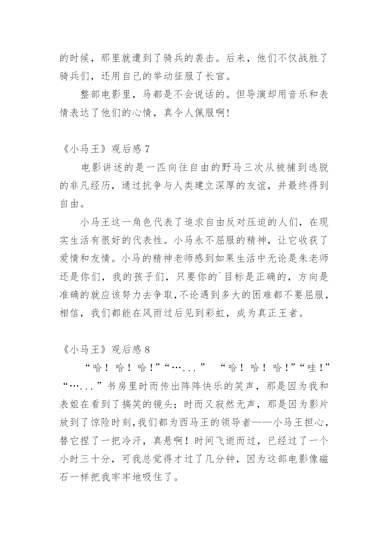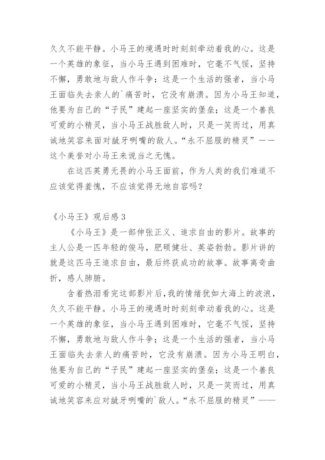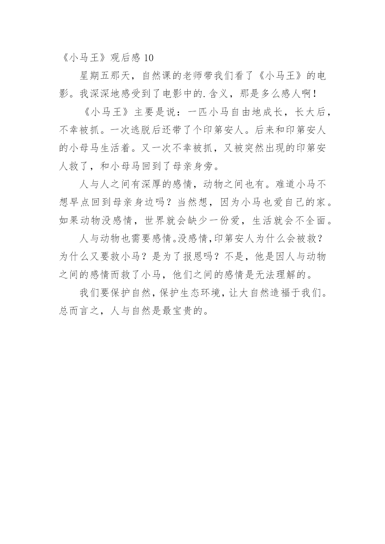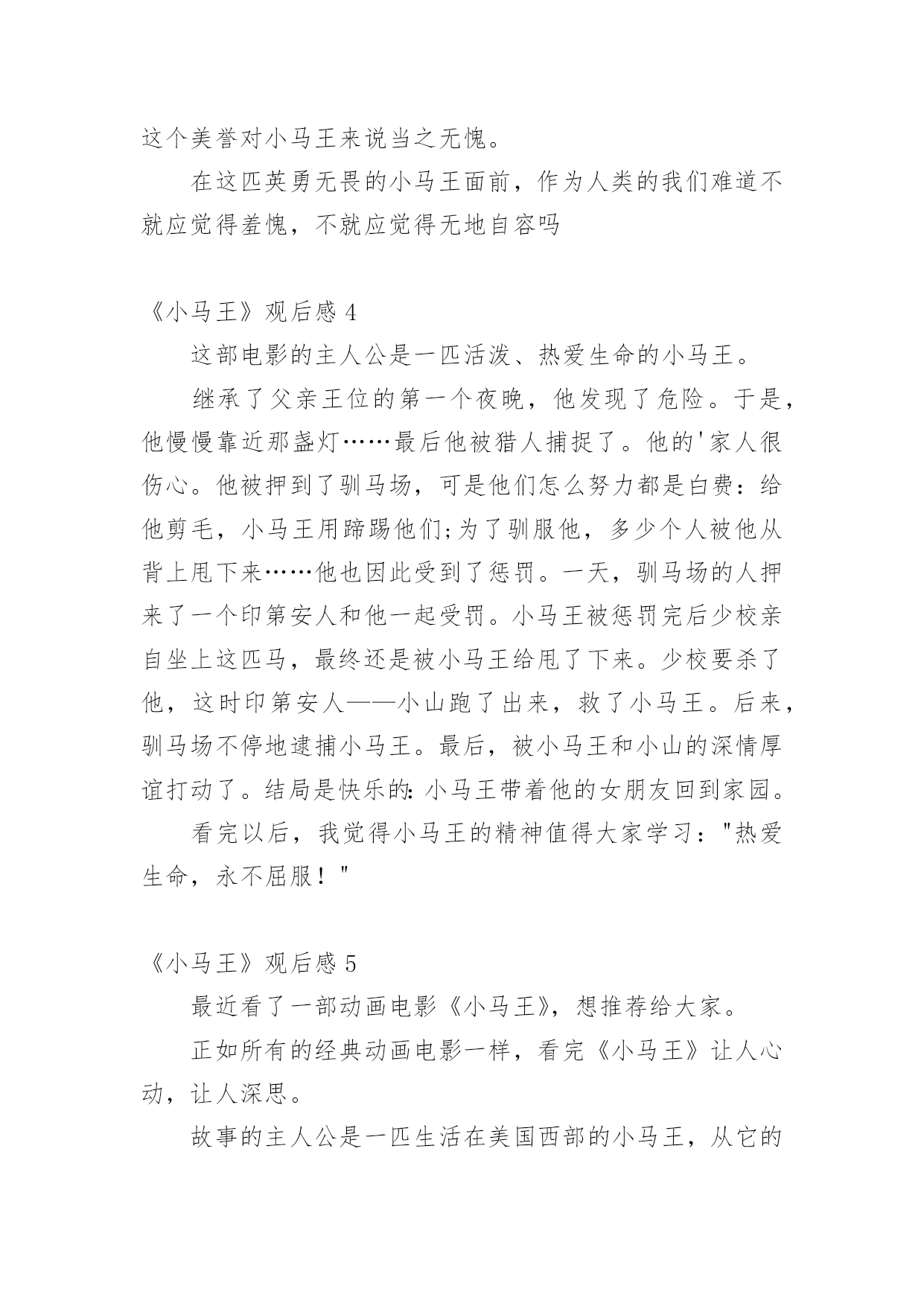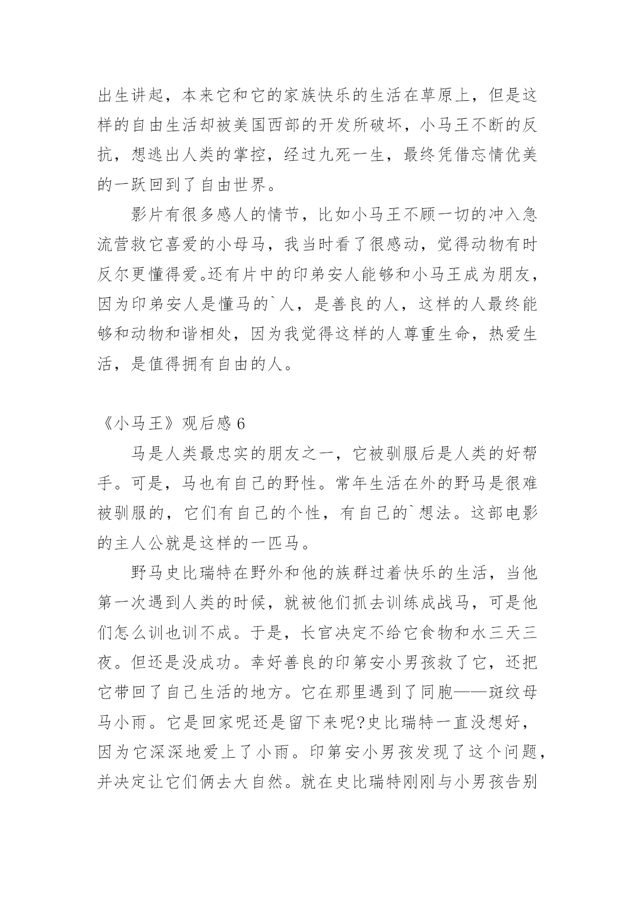 《小马王》观后感当观看完一部影视作品后,相信大家的收获肯定不少吧,这时候,最关键的观后感怎么能落下!那么你真的懂得怎么写观后感吗?下面是小编为大家整理的《小马王》观后感,仅供参考,大家一起来看看吧。《小马王》观后感1这部电影是几年前的电影叫”小马王”非常好看。故事在说一匹住在美国西部的野马,在人类文明侵入它的世界后,凭着高贵的尊严,和勇气克服各种挑战与障碍,勇敢地保卫它自己和族群的自由。小马王的个性狂野,在美国的西部边境奔驰。从未接触过人类的'小马王跟年轻的小伙子结下真挚友谊,并且遇到了漂亮的母马两人一见钟情,小伙子与小马王结伴充当了古代美国西部的无名英雄。这部电影我非常喜欢,因为小马王虽然是一匹马却跟人一样有自己的尊严和爱好自由的心,让我想一看再看。《小马王》观后感2《小马王》是一部伸张正义、追求自由的影片。故事的主人公是一匹年轻的俊马,肥硕健壮、英姿勃勃。影片讲的就是这匹马王追求自由,最后终获成功的故事。故事离奇曲折,感人肺腑。含着热泪看完这部影片后,我的心情犹如大海上的波浪,久久不能平静。小马王的境遇时时刻刻牵动着我的心。这是一个英雄的象征,当小马王遇到困难时,它毫不气馁,坚持不懈,勇敢地与敌人作斗争;这是一个生活的强者,当小马王面临失去亲人的`痛苦时,它没有崩溃。因为小马王知道,他要为自己的“子民”建起一座坚实的堡垒;这是一个善良可爱的小精灵,当小马王战胜敌人时,只是一笑而过,用真诚地笑容来面对龇牙咧嘴的敌人。“永不屈服的精灵”――这个美誉对小马王来说当之无愧。在这匹英勇无畏的小马王面前,作为人类的我们难道不应该觉得羞愧,不应该觉得无地自容吗?《小马王》观后感3《小马王》是一部伸张正义、追求自由的影片。故事的主人公是一匹年轻的俊马,肥硕健壮、英姿勃勃。影片讲的就是这匹马王追求自由,最后终获成功的故事。故事离奇曲折,感人肺腑。含着热泪看完这部影片后,我的情绪犹如大海上的波浪,久久不能平静。小马王的境遇时时刻刻牵动着我的心。这是一个英雄的象征,当小马王遇到困难时,它毫不气馁,坚持不懈,勇敢地与敌人作斗争;这是一个生活的强者,当小马王面临失去亲人的痛苦时,它没有崩溃。因为小马王明白,他要为自己的“子民”建起一座坚实的堡垒;这是一个善良可爱的小精灵,当小马王战胜敌人时,只是一笑而过,用真诚地笑容来应对龇牙咧嘴的`敌人。“永不屈服的精灵”——这个美誉对小马王来说当之无愧。在这匹英勇无畏的小马王面前,作为人类的我们难道不就应觉得羞愧,不就应觉得无地自容吗《小马王》观后感4这部电影的主人公是一匹活泼、热爱生命的小马王。继承了父亲王位的第一个夜晚,他发现了危险。于是,他慢慢靠近那盏灯……最后他被猎人捕捉了。他的'家人很伤心。他被押到了驯马场,可是他们怎么努力都是白费:给他剪毛,小马王用蹄踢他们;为了驯服他,多少个人被他从背上甩下来……他也因此受到了惩罚。一天,驯马场的人押来了一个印第安人和他一起受罚。小马王被惩罚完后少校亲自坐上这匹马,最终还是被小马王给甩了下来。少校要杀了他,这时印第安人——小山跑了出来,救了小马王。后来,驯马场不停地逮捕小马王。最后,被小马王和小山的深情厚谊打动了。结局是快乐的:小马王带着他的女朋友回到家园。看完以后,我觉得小马王的精神值得大家学习:"热爱生命,永不屈服!"《小马王》观后感5最近看了一部动画电影《小马王》,想推荐给大家。正如所有的经典动画电影一样,看完《小马王》让人心动,让人深思。故事的主人公是一匹生活在美国西部的小马王,从它的出生讲起,本来它和它的家族快乐的生活在草原上,但是这样的自由生活却被美国西部的开发所破坏,小马王不断的反抗,想逃出人类的掌控,经过九死一生,最终凭借忘情优美的一跃回到了自由世界。影片有很多感人的情节,比如小马王不顾一切的冲入急流营救它喜爱的小母马,我当时看了很感动,觉得动物有时反尔更懂得爱。还有片中的印弟安人能够和小马王成为朋友,因为印弟安人是懂马的`人,是善良的人,这样的人最终能够和动物和谐相处,因为我觉得这样的人尊重生命,热爱生活,是值得拥有自由的人。《小马王》观后感6马是人类最忠实的朋友之一,它被驯服后是人类的好帮手。可是,马也有自己的野性。常年生活在外的野马是很难被驯服的,它们有自己的个性,有自己的`想法。这部电影的主人公就是这样的一匹马。野马史比瑞特在野外和他的族群过着快乐的生活,当他第一次遇到人类的时候,就被他们抓去训练成战马,可是他们怎么训也训不成。于是,长官决定不给它食物和水三天三夜。但还是没成功。幸好善良的印第安小男孩救了它,还把它带回了自己生活的地方。它在那里遇到了同胞——斑纹母马小雨。它是回家呢还是留下来呢?史比瑞特一直没想好,因为它深深地爱上了小雨。印第安小男孩发现了这个问题,并决定让它们俩去大自然。就在史比瑞特刚刚与小男孩告别的时候,那里就遭到了