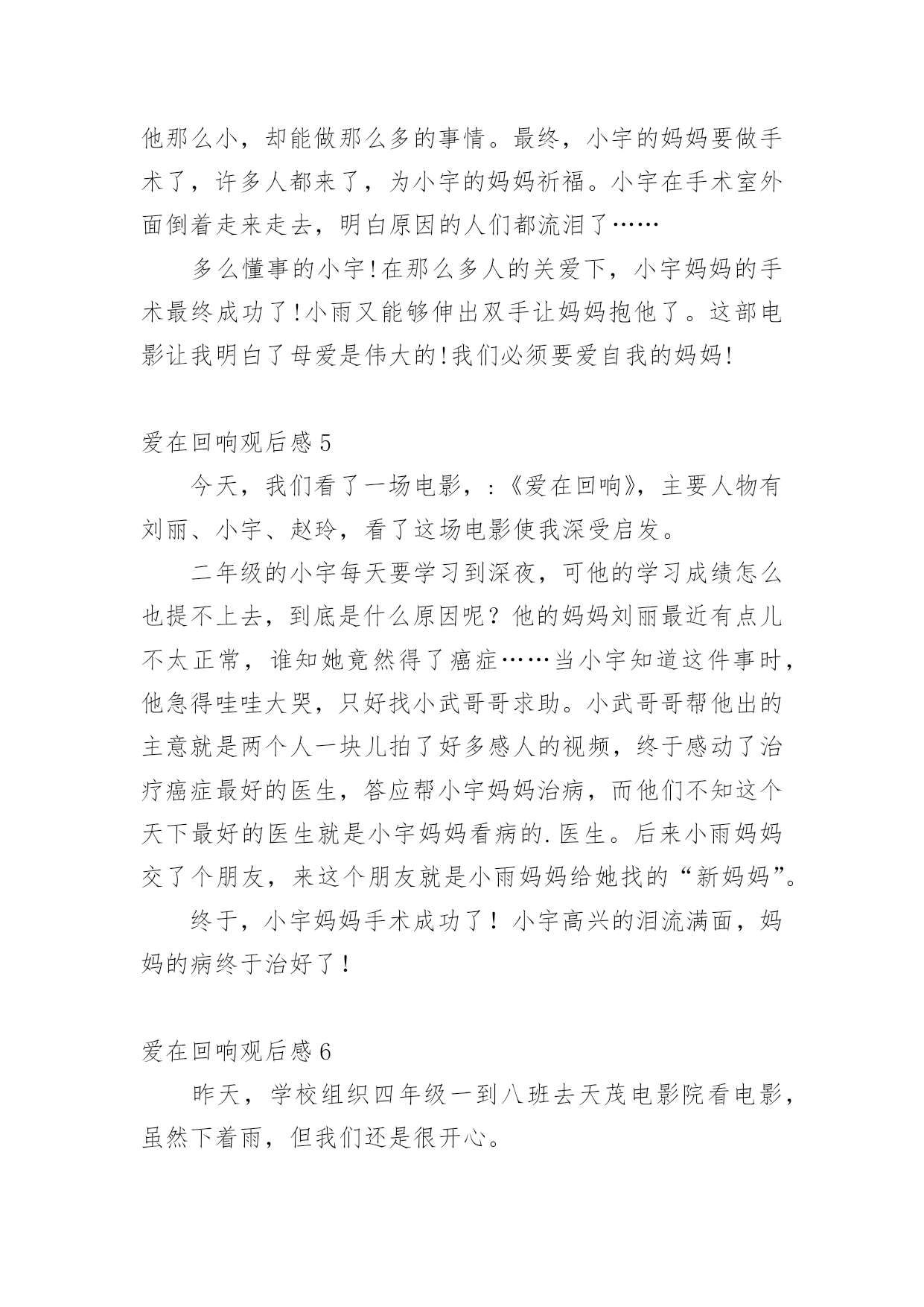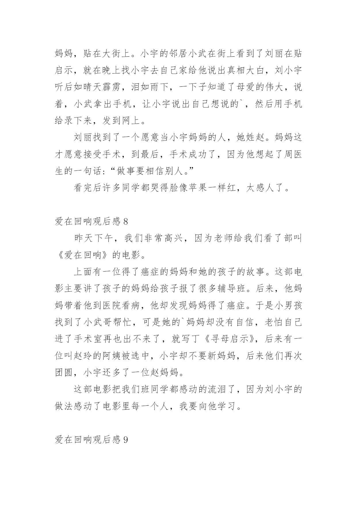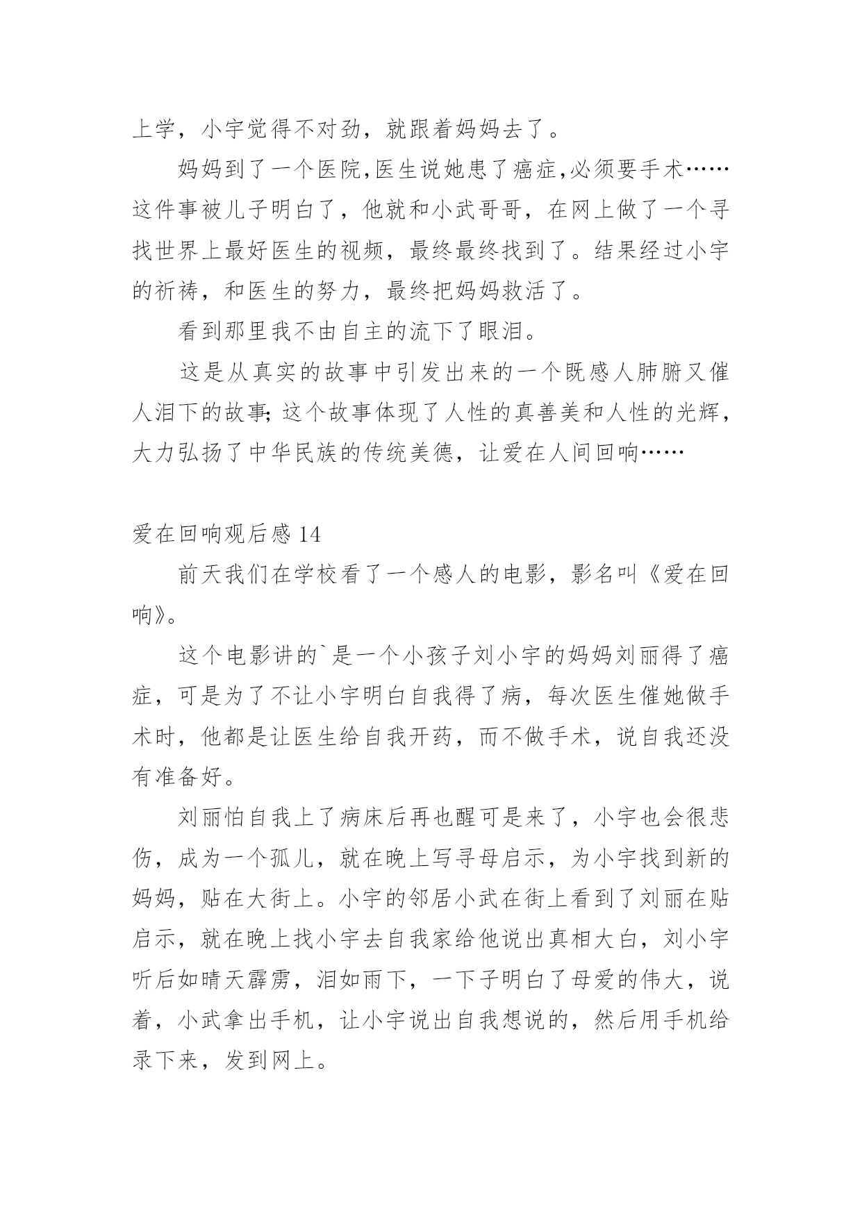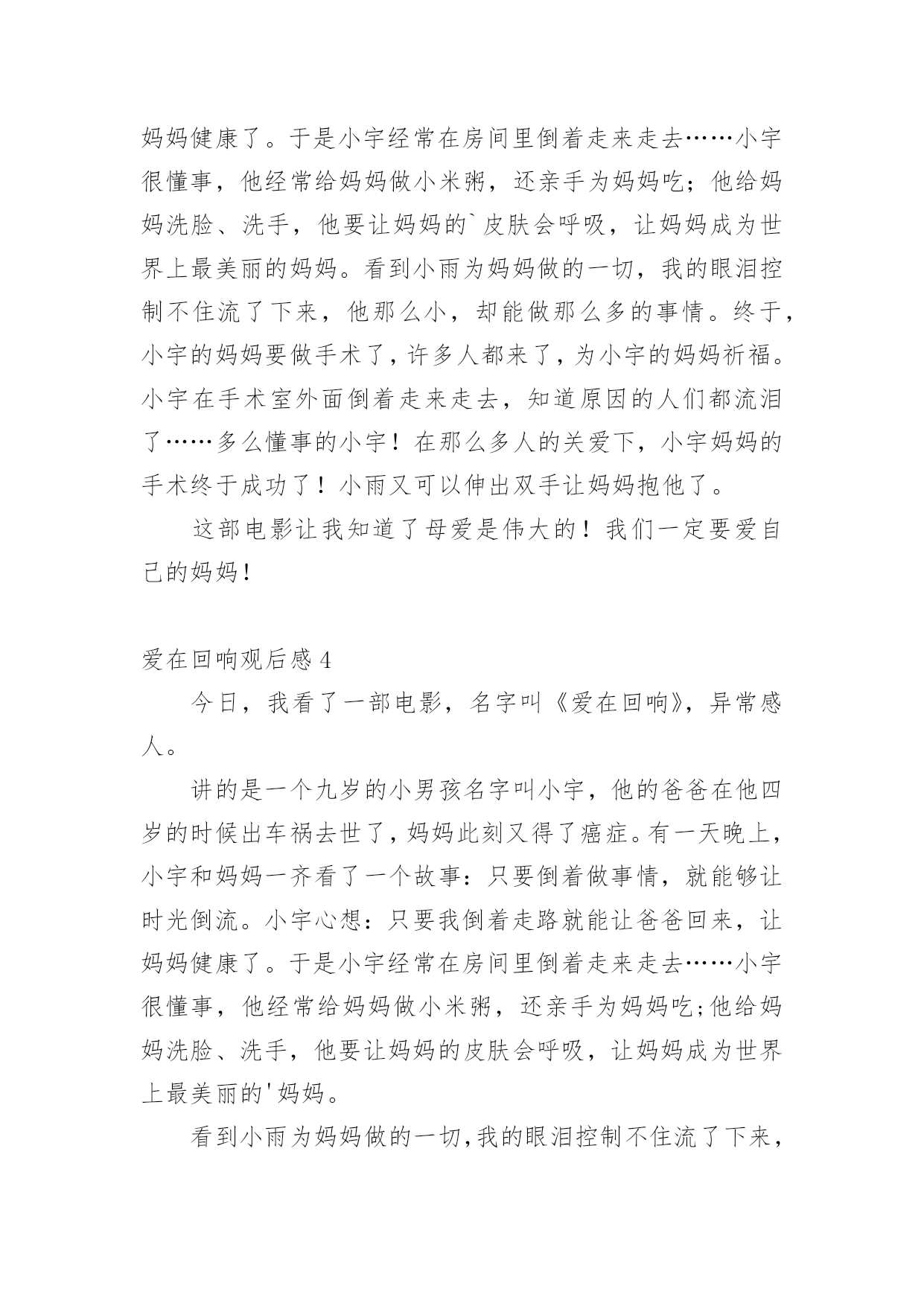 爱在回响观后感认真品味一部作品后,这次观看让你有什么体会呢?是时候静下心来好好写写观后感了。但是观后感有什么要求呢?以下是小编帮大家整理的爱在回响观后感,欢迎阅读,希望大家能够喜欢。爱在回响观后感1今天下午,我们观看了《爱在回响》这部影片,影片中的一个“寻母启事”的镜头,引起了我心灵的震撼,使我感受到了母爱的无私与伟大。一段“寻医视频”让我感受到了爱的力量与神奇,我是在感动与期盼中看完这部电影的。是啊,妈妈为爱而不顾病情而忙绿奔波,坚强的活着,儿子为爱而变得懂事坚强。影片中的每一个镜头,都给我留下了深刻的印象。与小宇相比,我是多么的不懂事,想想自己的.妈妈,她也一直和电影里的妈妈一样爱着我,妈妈整天工作之余还要为我做饭、洗衣服、关心我的学习,陪我锻炼身体,我哭妈妈伤心,我笑妈妈高兴,妈妈一定也是希望我能健康成长。可自己从来就不懂得去体谅妈妈的爱,有时烦妈妈管我太多了,冲妈妈发脾气,有时还故意跟妈妈做对,让妈妈生气。这都是不对的!今后,我要努力学习,听妈妈的话,做一个不任性,懂事听话的好孩子!爱在回响观后感2今天,我看了一部电影,名字叫《爱在回响》,特别感人。讲的是一个九岁的小男孩名字叫小宇,他的爸爸在他四岁的时候出车祸去世了,妈妈现在又得了癌症。有一天晚上,小宇和妈妈一起看了一个故事:只要倒着做事情,就可以让时光倒流。小宇心想:只要我倒着走路就能让爸爸回来,让妈妈健康了。于是小宇经常在房间里倒着走来走去……小宇非常懂事,他经常给妈妈做小米粥,还亲手为妈妈吃;他给妈妈洗脸、洗手,他要让妈妈的皮肤会呼吸,让妈妈成为世界上最美丽的妈妈。看到小雨为妈妈做的.一切,我的眼泪控制不住流了下来,他那么小,却能做那么多的事情。终于,小宇的妈妈要做手术了,许多人都来了,为小宇的妈妈祈福。小宇在手术室外面倒着走来走去,知道原因的人们都流泪了……多么懂事的小宇!在那么多人的关爱下,小宇妈妈的手术终于成功了!小雨又可以伸出双手让妈妈抱他了。这部电影让我知道了母爱是伟大的!我们一定要爱自己的妈妈!爱在回响观后感3今天,我看了一部电影,名字叫《爱在回响》,特别感人。讲的是一个九岁的小男孩名字叫小宇,他的爸爸在他五岁的时候出车祸去世了,妈妈现在又得了癌症。有一天晚上,小宇和妈妈一起看了一个故事:只要倒着做事情,就可以让时光倒流。小宇心想:只要我倒着走路就能让爸爸回来,让妈妈健康了。于是小宇经常在房间里倒着走来走去……小宇很懂事,他经常给妈妈做小米粥,还亲手为妈妈吃;他给妈妈洗脸、洗手,他要让妈妈的`皮肤会呼吸,让妈妈成为世界上最美丽的妈妈。看到小雨为妈妈做的一切,我的眼泪控制不住流了下来,他那么小,却能做那么多的事情。终于,小宇的妈妈要做手术了,许多人都来了,为小宇的妈妈祈福。小宇在手术室外面倒着走来走去,知道原因的人们都流泪了……多么懂事的小宇!在那么多人的关爱下,小宇妈妈的手术终于成功了!小雨又可以伸出双手让妈妈抱他了。这部电影让我知道了母爱是伟大的!我们一定要爱自己的妈妈!爱在回响观后感4今日,我看了一部电影,名字叫《爱在回响》,异常感人。讲的是一个九岁的小男孩名字叫小宇,他的爸爸在他四岁的时候出车祸去世了,妈妈此刻又得了癌症。有一天晚上,小宇和妈妈一齐看了一个故事:只要倒着做事情,就能够让时光倒流。小宇心想:只要我倒着走路就能让爸爸回来,让妈妈健康了。于是小宇经常在房间里倒着走来走去……小宇很懂事,他经常给妈妈做小米粥,还亲手为妈妈吃;他给妈妈洗脸、洗手,他要让妈妈的皮肤会呼吸,让妈妈成为世界上最美丽的'妈妈。看到小雨为妈妈做的一切,我的眼泪控制不住流了下来,他那么小,却能做那么多的事情。最终,小宇的妈妈要做手术了,许多人都来了,为小宇的妈妈祈福。小宇在手术室外面倒着走来走去,明白原因的人们都流泪了……多么懂事的小宇!在那么多人的关爱下,小宇妈妈的手术最终成功了!小雨又能够伸出双手让妈妈抱他了。这部电影让我明白了母爱是伟大的!我们必须要爱自我的妈妈!爱在回响观后感5今天,我们看了一场电影,:《爱在回响》,主要人物有刘丽、小宇、赵玲,看了这场电影使我深受启发。二年级的小宇每天要学习到深夜,可他的学习成绩怎么也提不上去,到底是什么原因呢?他的妈妈刘丽最近有点儿不太正常,谁知她竟然得了癌症……当小宇知道这件事时,他急得哇哇大哭,只好找小武哥哥求助。小武哥哥帮他出的主意就是两个人一块儿拍了好多感人的视频,终于感动了治疗癌症最好的医生,答应帮小宇妈妈治病,而他们不知这个天下最好的医生就是小宇妈妈看病的.医生。后来小雨妈妈交了个朋友,来这个朋友就是小雨妈妈给她找的“新妈妈”。终于,小宇妈妈手术成功了!小宇高兴的泪流满面,妈妈的病终于治好了!爱在回响观后感6昨天,学校组织四年级一到八班去天茂电影院看电影,虽然下着雨,但我们还是很开心。到了电影院,我们找位置坐