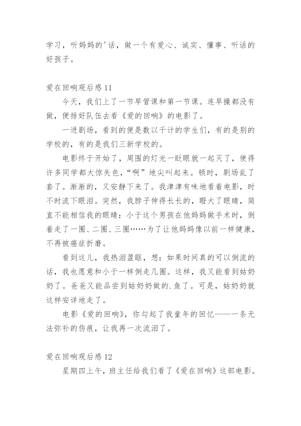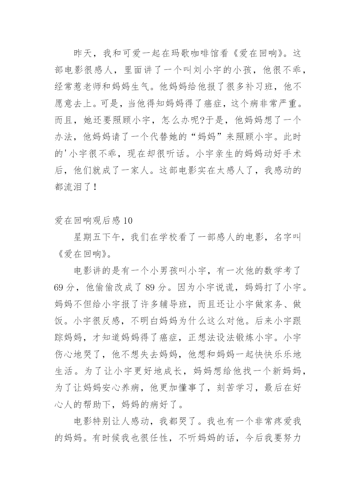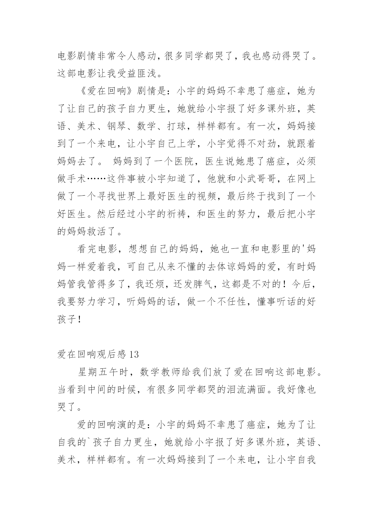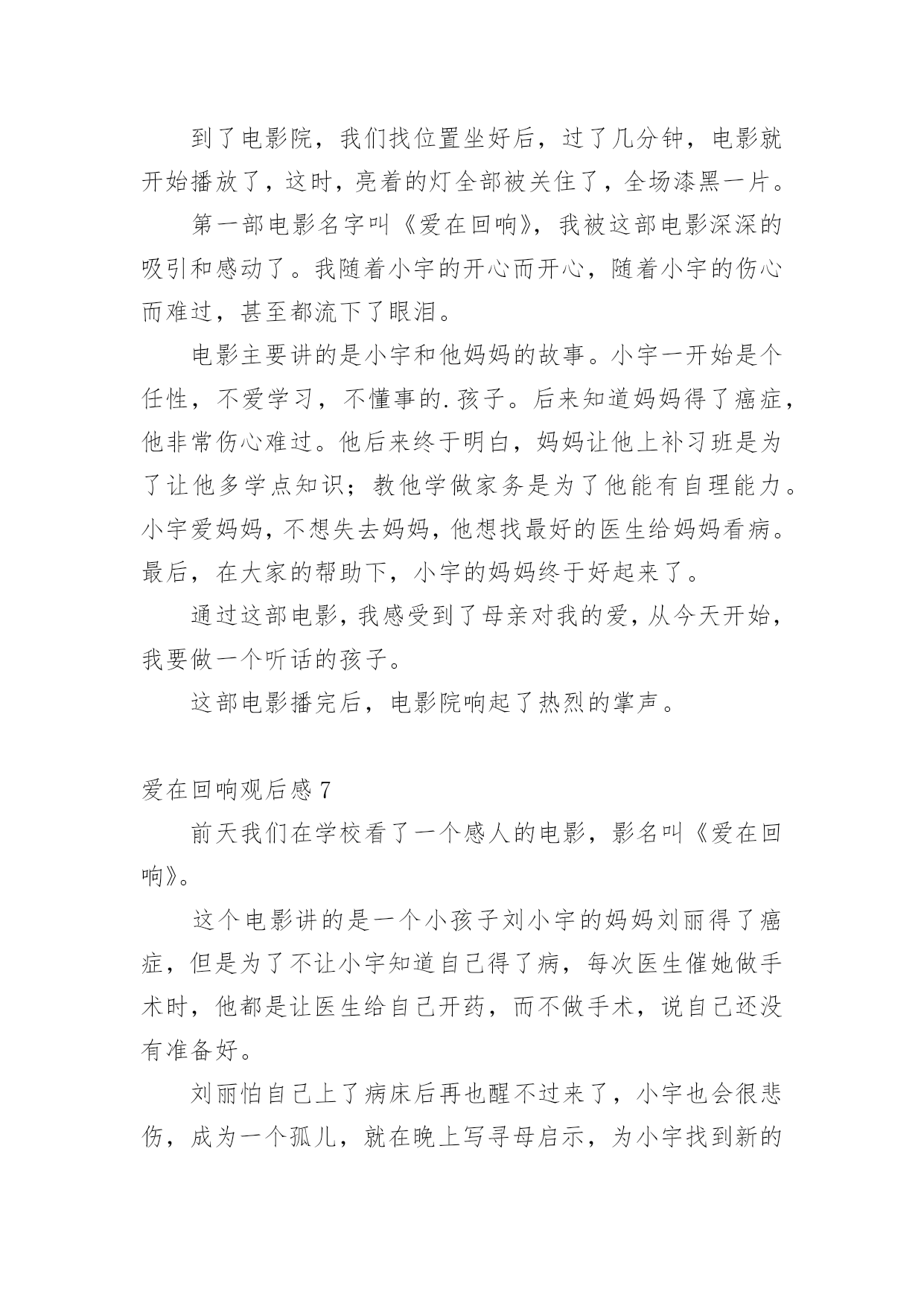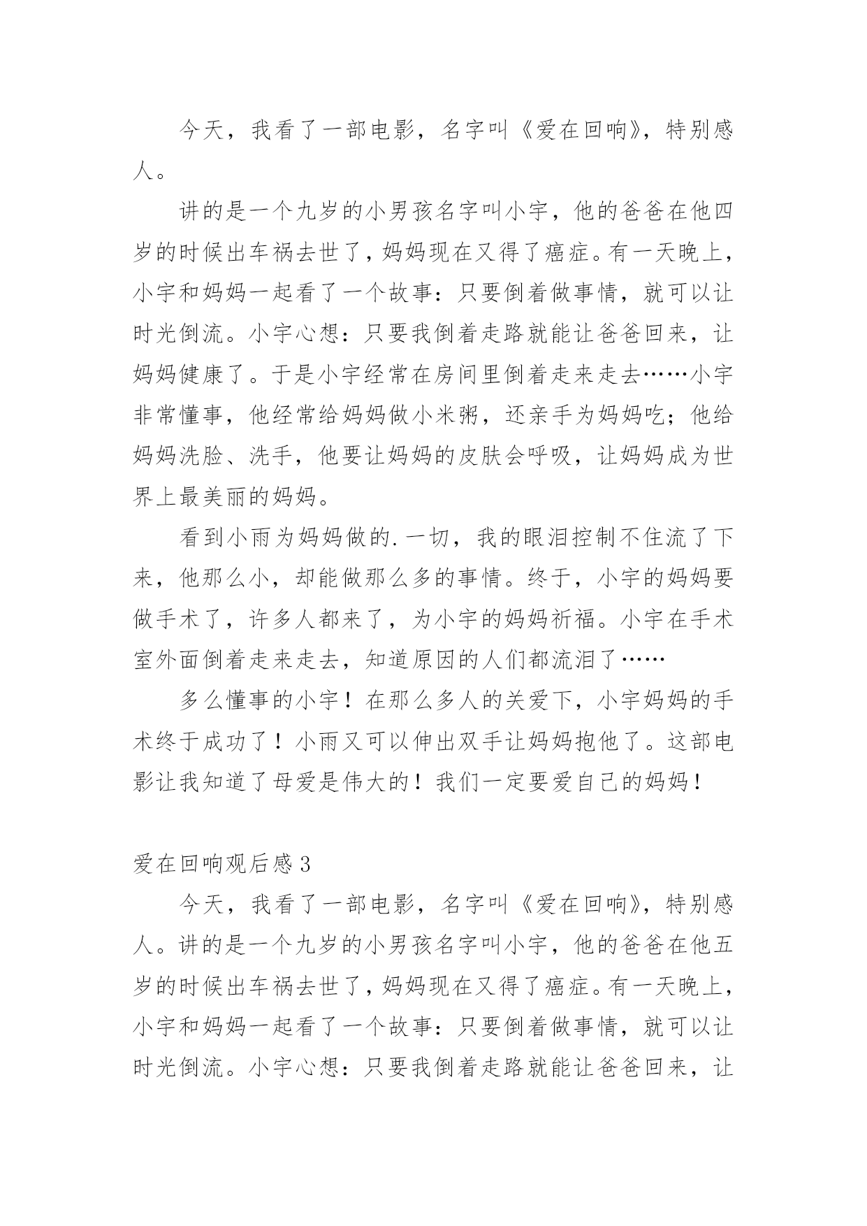爱在回响观后感认真品味一部作品后,这次观看让你有什么体会呢?是时候静下心来好好写写观后感了。但是观后感有什么要求呢?以下是小编帮大家整理的爱在回响观后感,欢迎阅读,希望大家能够喜欢。爱在回响观后感1今天下午,我们观看了《爱在回响》这部影片,影片中的一个“寻母启事”的镜头,引起了我心灵的震撼,使我感受到了母爱的无私与伟大。一段“寻医视频”让我感受到了爱的力量与神奇,我是在感动与期盼中看完这部电影的。是啊,妈妈为爱而不顾病情而忙绿奔波,坚强的活着,儿子为爱而变得懂事坚强。影片中的每一个镜头,都给我留下了深刻的印象。与小宇相比,我是多么的不懂事,想想自己的.妈妈,她也一直和电影里的妈妈一样爱着我,妈妈整天工作之余还要为我做饭、洗衣服、关心我的学习,陪我锻炼身体,我哭妈妈伤心,我笑妈妈高兴,妈妈一定也是希望我能健康成长。可自己从来就不懂得去体谅妈妈的爱,有时烦妈妈管我太多了,冲妈妈发脾气,有时还故意跟妈妈做对,让妈妈生气。这都是不对的!今后,我要努力学习,听妈妈的话,做一个不任性,懂事听话的好孩子!爱在回响观后感2今天,我看了一部电影,名字叫《爱在回响》,特别感人。讲的是一个九岁的小男孩名字叫小宇,他的爸爸在他四岁的时候出车祸去世了,妈妈现在又得了癌症。有一天晚上,小宇和妈妈一起看了一个故事:只要倒着做事情,就可以让时光倒流。小宇心想:只要我倒着走路就能让爸爸回来,让妈妈健康了。于是小宇经常在房间里倒着走来走去……小宇非常懂事,他经常给妈妈做小米粥,还亲手为妈妈吃;他给妈妈洗脸、洗手,他要让妈妈的皮肤会呼吸,让妈妈成为世界上最美丽的妈妈。看到小雨为妈妈做的.一切,我的眼泪控制不住流了下来,他那么小,却能做那么多的事情。终于,小宇的妈妈要做手术了,许多人都来了,为小宇的妈妈祈福。小宇在手术室外面倒着走来走去,知道原因的人们都流泪了……多么懂事的小宇!在那么多人的关爱下,小宇妈妈的手术终于成功了!小雨又可以伸出双手让妈妈抱他了。这部电影让我知道了母爱是伟大的!我们一定要爱自己的妈妈!爱在回响观后感3今天,我看了一部电影,名字叫《爱在回响》,特别感人。讲的是一个九岁的小男孩名字叫小宇,他的爸爸在他五岁的时候出车祸去世了,妈妈现在又得了癌症。有一天晚上,小宇和妈妈一起看了一个故事:只要倒着做事情,就可以让时光倒流。小宇心想:只要我倒着走路就能让爸爸回来,让妈妈健康了。于是小宇经常在房间里倒着走来走去……小宇很懂事,他经常给妈妈做小米粥,还亲手为妈妈吃;他给妈妈洗脸、洗手,他要让妈妈的`皮肤会呼吸,让妈妈成为世界上最美丽的妈妈。看到小雨为妈妈做的一切,我的眼泪控制不住流了下来,他那么小,却能做那么多的事情。终于,小宇的妈妈要做手术了,许多人都来了,为小宇的妈妈祈福。小宇在手术室外面倒着走来走去,知道原因的人们都流泪了……多么懂事的小宇!在那么多人的关爱下,小宇妈妈的手术终于成功了!小雨又可以伸出双手让妈妈抱他了。这部电影让我知道了母爱是伟大的!我们一定要爱自己的妈妈!爱在回响观后感4今日,我看了一部电影,名字叫《爱在回响》,异常感人。讲的是一个九岁的小男孩名字叫小宇,他的爸爸在他四岁的时候出车祸去世了,妈妈此刻又得了癌症。有一天晚上,小宇和妈妈一齐看了一个故事:只要倒着做事情,就能够让时光倒流。小宇心想:只要我倒着走路就能让爸爸回来,让妈妈健康了。于是小宇经常在房间里倒着走来走去……小宇很懂事,他经常给妈妈做小米粥,还亲手为妈妈吃;他给妈妈洗脸、洗手,他要让妈妈的皮肤会呼吸,让妈妈成为世界上最美丽的'妈妈。看到小雨为妈妈做的一切,我的眼泪控制不住流了下来,他那么小,却能做那么多的事情。最终,小宇的妈妈要做手术了,许多人都来了,为小宇的妈妈祈福。小宇在手术室外面倒着走来走去,明白原因的人们都流泪了……多么懂事的小宇!在那么多人的关爱下,小宇妈妈的手术最终成功了!小雨又能够伸出双手让妈妈抱他了。这部电影让我明白了母爱是伟大的!我们必须要爱自我的妈妈!爱在回响观后感5今天,我们看了一场电影,:《爱在回响》,主要人物有刘丽、小宇、赵玲,看了这场电影使我深受启发。二年级的小宇每天要学习到深夜,可他的学习成绩怎么也提不上去,到底是什么原因呢?他的妈妈刘丽最近有点儿不太正常,谁知她竟然得了癌症……当小宇知道这件事时,他急得哇哇大哭,只好找小武哥哥求助。小武哥哥帮他出的主意就是两个人一块儿拍了好多感人的视频,终于感动了治疗癌症最好的医生,答应帮小宇妈妈治病,而他们不知这个天下最好的医生就是小宇妈妈看病的.医生。后来小雨妈妈交了个朋友,来这个朋友就是小雨妈妈给她找的“新妈妈”。终于,小宇妈妈手术成功了!小宇高兴的泪流满面,妈妈的病终于治好了!爱在回响观后感6昨天,学校组织四年级一到八班去天茂电影院看电影,虽然下着雨,但我们还是很开心。到了电影院,我们找位置坐