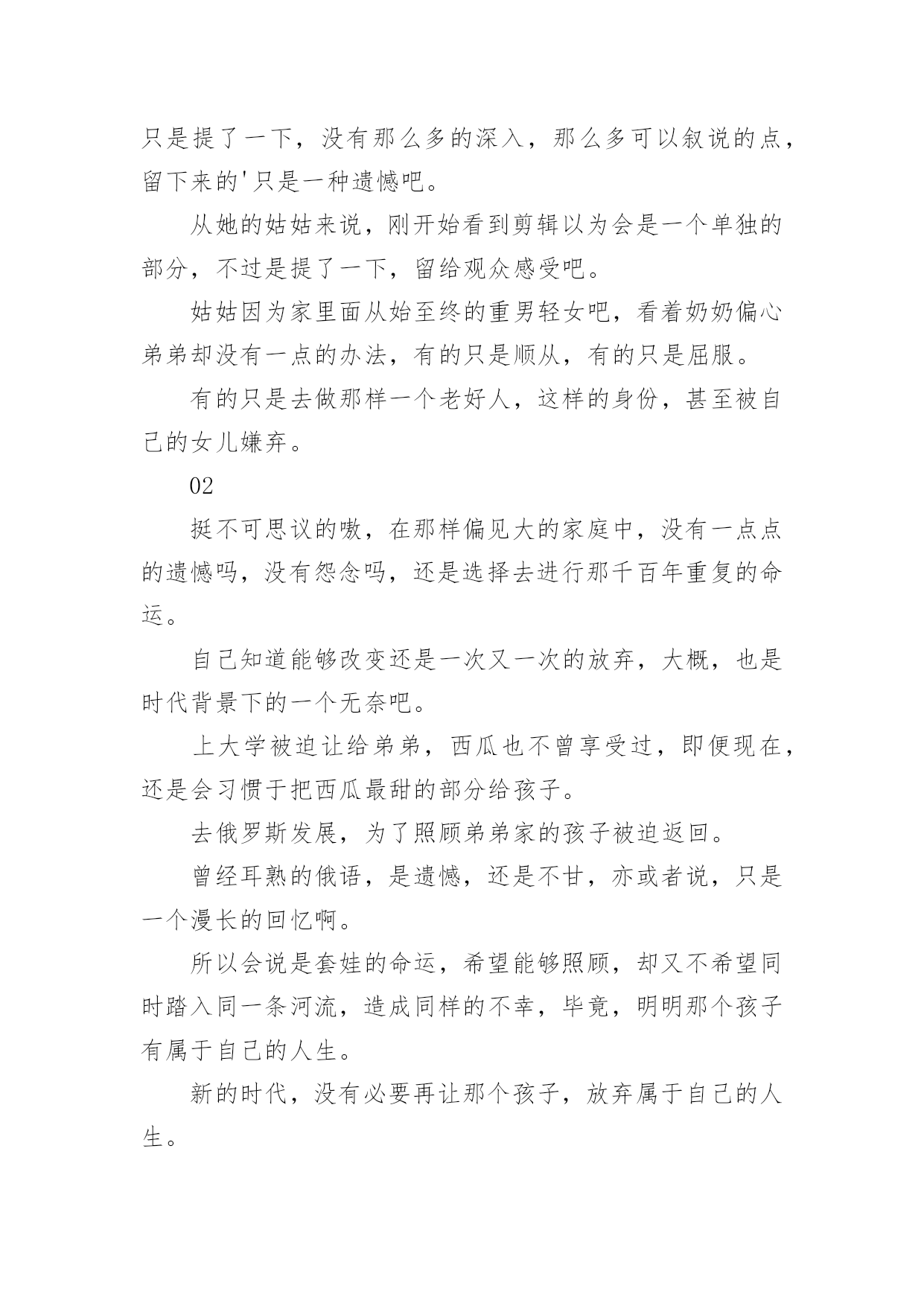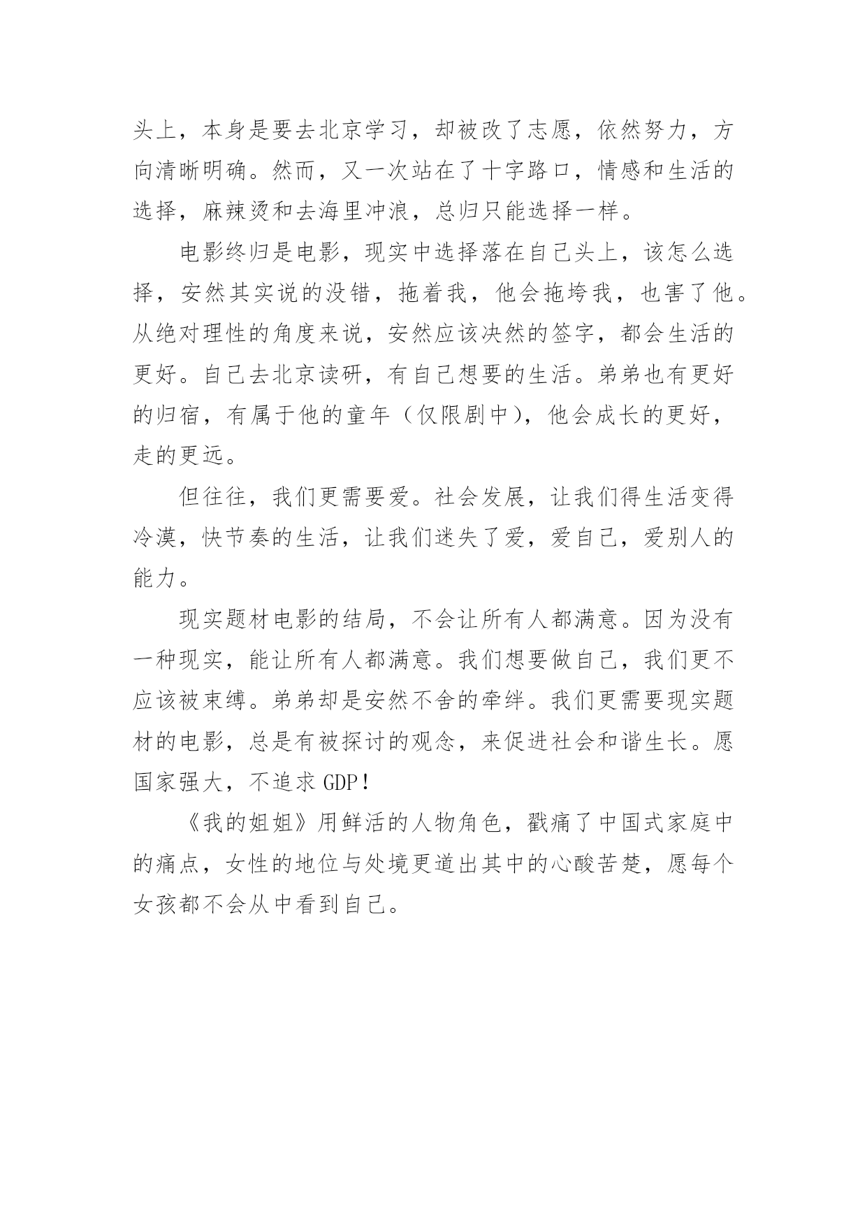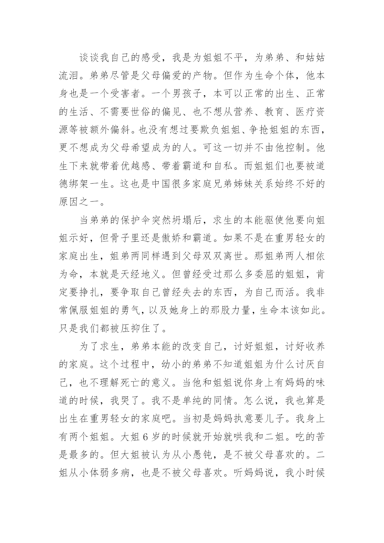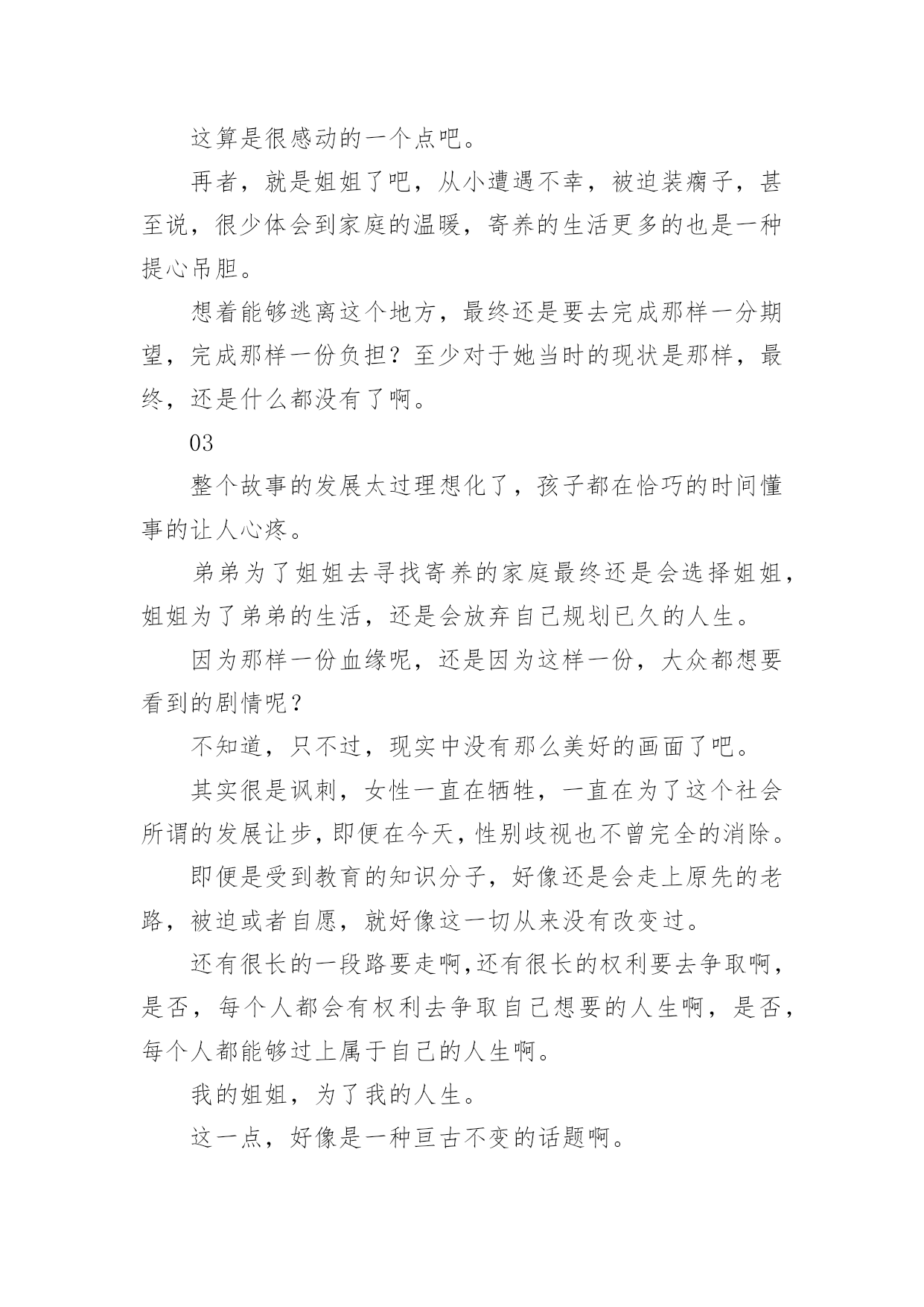 《我的姐姐》观后感《我的姐姐》观后感认真看完一部作品以后,相信大家的收获肯定不少吧,这时候最关键的观后感不能忘了。现在你是否对观后感一筹莫展呢?下面是小编为大家整理的《我的姐姐》观后感,仅供参考,欢迎大家阅读。《我的姐姐》观后感1抽空去看了《我的姐姐》,我不是影评,不会对电影的拍摄技巧、故事情节、人物形象以及背后所揭示的社会伦理做分析。毕竟每个人的生命中都有过挣扎,选择不了自己的出身、又不能决定自己的性别,还无法对抗时代的洪流。有人选择坦然接受现实,然后走下去,毕竟这个又宏大又幽微的命题更像是大海和浪花,有坚定也有迟疑。观影的人有人为姐姐哭、有人为弟弟哭、有人为姑妈哭。我不知道应该为谁要多些哭些,毕竟这是反应重男轻女的影片。如果此刻我为弟弟和姑妈哭显然有些不合适。女主人公在追求自我和人生梦想的途中遭遇幼弟,父母为了要儿子,让女儿装残疾。考上大学又修改女儿的高考志愿,让女儿从医生变成了护士,这样离家近,可以早点工作赚钱。命运对女儿不公,但无论怎样挣扎,最后还是没有脱离血缘关系。谈谈我自己的感受,我是为姐姐不平,为弟弟、和姑姑流泪。弟弟尽管是父母偏爱的产物。但作为生命个体,他本身也是一个受害者。一个男孩子,本可以正常的出生、正常的生活、不需要世俗的偏见、也不想从营养、教育、医疗资源等被额外偏斜。也没有想过要欺负姐姐、争抢姐姐的东西,更不想成为父母希望成为的人。可这一切并不由他控制。他生下来就带着优越感、带着霸道和自私。而姐姐们也要被道德绑架一生。这也是中国很多家庭兄弟姊妹关系始终不好的原因之一。当弟弟的保护伞突然坍塌后,求生的本能驱使他要向姐姐示好,但骨子里还是傲娇和霸道。如果不是在重男轻女的家庭出生,姐弟两同样遇到父母双双离世。那姐弟两人相依为命,本就是天经地义。但曾经受过那么多委屈的姐姐,肯定要挣扎,要争取自己曾经失去的东西,为自己而活。我非常佩服姐姐的勇气,以及她身上的那股力量,生命本该如此。只是我们都被压抑住了。为了求生,弟弟本能的改变自己,讨好姐姐,讨好收养的家庭。这个过程中,幼小的弟弟不知道姐姐为什么讨厌自己,也不理解死亡的意义。当他和姐姐说你身上有妈妈的味道的时候,我哭了。我不是单纯的同情。怎么说,我也算是出生在重男轻女的家庭吧。当初是妈妈执意要儿子。我身上有两个姐姐。大姐6岁的时候就开始就哄我和二姐。吃的苦是最多的。但大姐被认为从小愚钝,是不被父母喜欢的。二姐从小体弱多病,也是不被父母喜欢。听妈妈说,我小时候欺负过大姐和二姐还有收养的三妹。争抢过她们的零食、剥夺过她们该有的爱。随着年龄的增长,我们姐弟有过隔阂、误解。知道大姐对父母的`埋怨。也知道大姐为了我失去了很多。但毕竟还是血缘关系。我们还是一步一步挣扎着走了过来。对家人我能力所能及的做些事,心怀感恩。对父母也给予足够的理解。在那个物质极度贫乏的年代,我们没有资格去评判他们的对错。如果换成是你,也未必就能做的更好。但我真心反对重男轻女,让生命活出该有的样子。好的书籍和影视作品都有疗愈作用。没有绝对的对和错,生命这个又宏大又幽微的命题更像是大海和浪花,有坚定也有迟疑。努力去走吧。《我的姐姐》观后感201一天两场的电影,这个算是一场,怎么说,有点不太容易去形容出来,在看部分剪辑的部分期待有更加精彩的表现最终的结果只能说是一种完成一种拼凑,其实不算是特别满意的电影。电影会感觉到有点可惜,主要内容围绕姐姐和弟弟吧,一对不熟的姐弟,因为父母双亡被迫抚养,刚开始是一种累赘,最终是一种相互依靠吧。只是感觉,电影其实想要给我们表达的部分有很多,但最终说出来的部分其实很少。感觉很多部分都可以单独的拿出来去叙述,最多的感觉只是提了一下,没有那么多的深入,那么多可以叙说的点,留下来的'只是一种遗憾吧。从她的姑姑来说,刚开始看到剪辑以为会是一个单独的部分,不过是提了一下,留给观众感受吧。姑姑因为家里面从始至终的重男轻女吧,看着奶奶偏心弟弟却没有一点的办法,有的只是顺从,有的只是屈服。有的只是去做那样一个老好人,这样的身份,甚至被自己的女儿嫌弃。02挺不可思议的嗷,在那样偏见大的家庭中,没有一点点的遗憾吗,没有怨念吗,还是选择去进行那千百年重复的命运。自己知道能够改变还是一次又一次的放弃,大概,也是时代背景下的一个无奈吧。上大学被迫让给弟弟,西瓜也不曾享受过,即便现在,还是会习惯于把西瓜最甜的部分给孩子。去俄罗斯发展,为了照顾弟弟家的孩子被迫返回。曾经耳熟的俄语,是遗憾,还是不甘,亦或者说,只是一个漫长的回忆啊。所以会说是套娃的命运,希望能够照顾,却又不希望同时踏入同一条河流,造成同样的不幸,毕竟,明明那个孩子有属于自己的人生。新的时代,没有必要再让那个孩子,放弃属于自己的人生。这算是很感动的一个点吧。再者,就是姐姐了吧,从小遭遇不幸,被迫装瘸子,甚至说,很少体会到家庭的温暖,寄养的