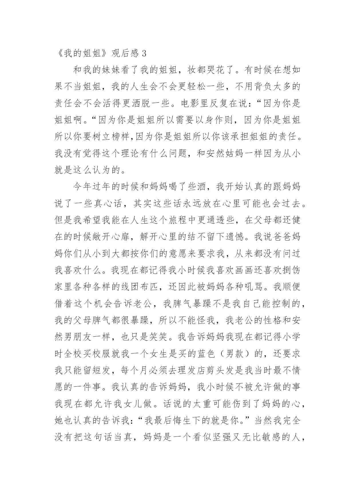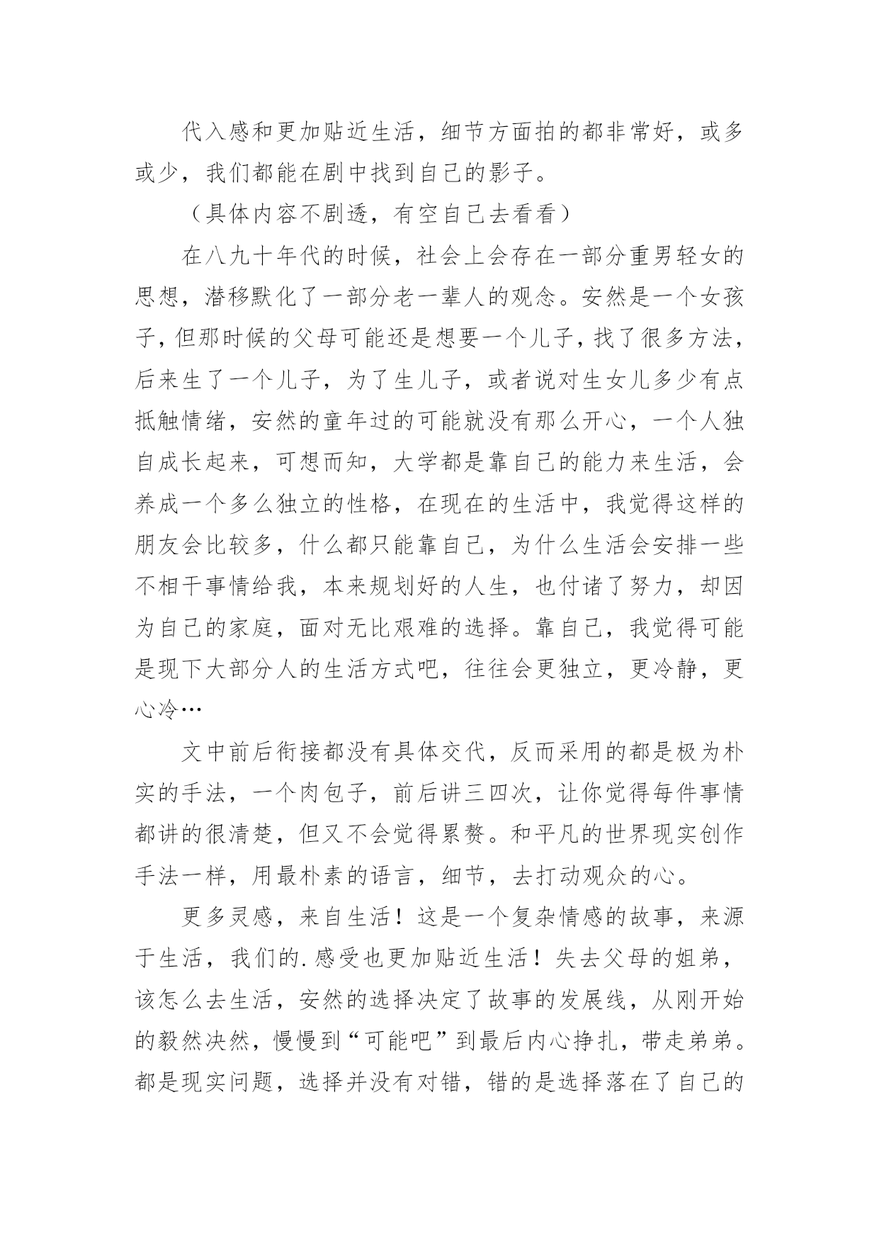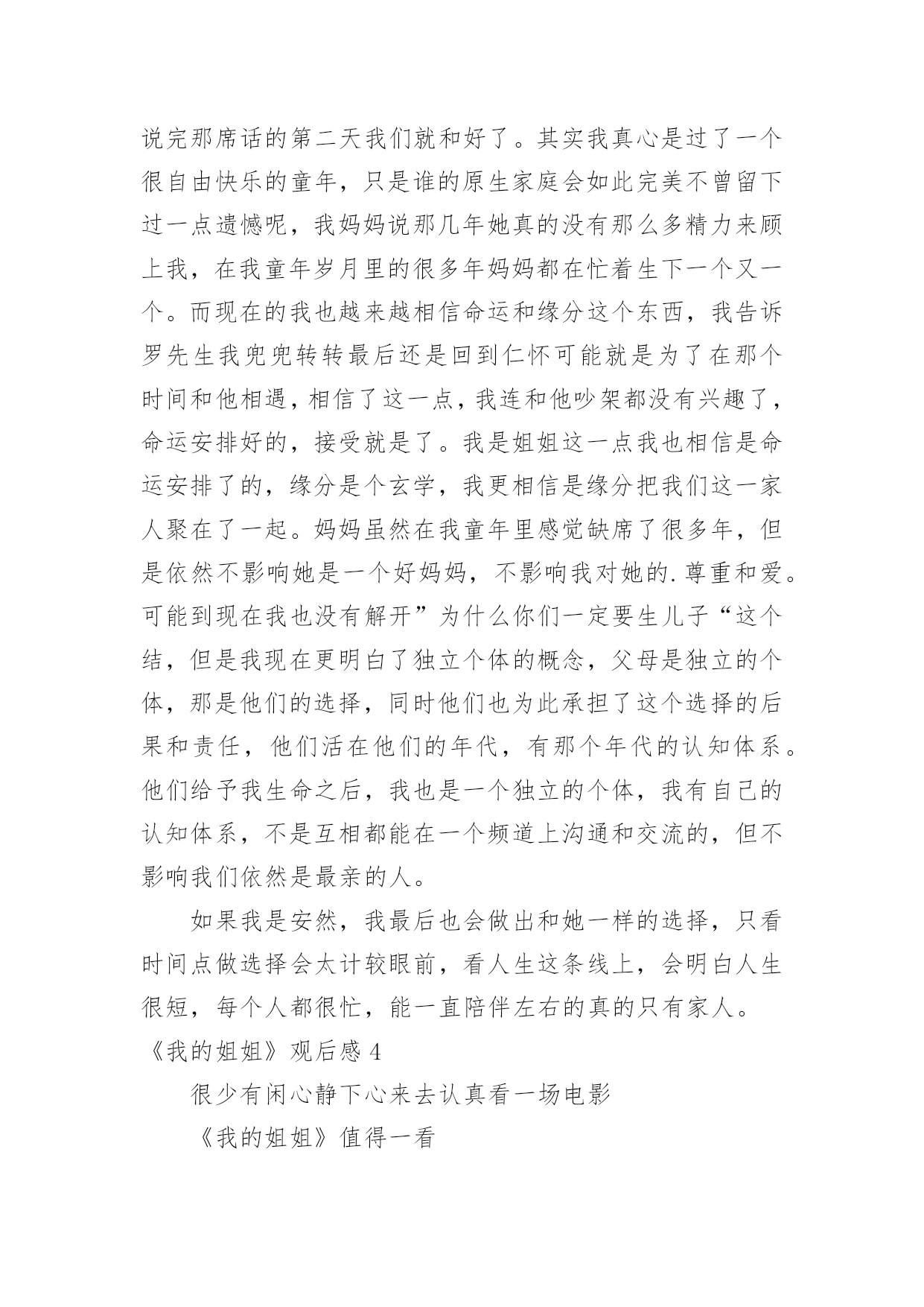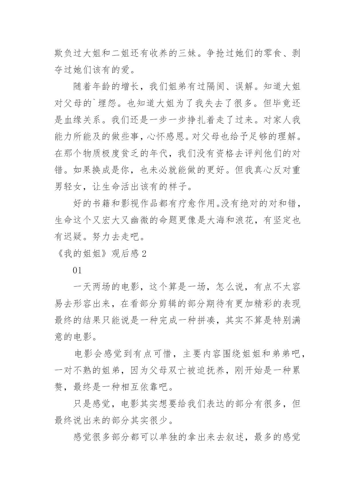 《我的姐姐》观后感《我的姐姐》观后感认真看完一部作品以后,相信大家的收获肯定不少吧,这时候最关键的观后感不能忘了。现在你是否对观后感一筹莫展呢?下面是小编为大家整理的《我的姐姐》观后感,仅供参考,欢迎大家阅读。《我的姐姐》观后感1抽空去看了《我的姐姐》,我不是影评,不会对电影的拍摄技巧、故事情节、人物形象以及背后所揭示的社会伦理做分析。毕竟每个人的生命中都有过挣扎,选择不了自己的出身、又不能决定自己的性别,还无法对抗时代的洪流。有人选择坦然接受现实,然后走下去,毕竟这个又宏大又幽微的命题更像是大海和浪花,有坚定也有迟疑。观影的人有人为姐姐哭、有人为弟弟哭、有人为姑妈哭。我不知道应该为谁要多些哭些,毕竟这是反应重男轻女的影片。如果此刻我为弟弟和姑妈哭显然有些不合适。女主人公在追求自我和人生梦想的途中遭遇幼弟,父母为了要儿子,让女儿装残疾。考上大学又修改女儿的高考志愿,让女儿从医生变成了护士,这样离家近,可以早点工作赚钱。命运对女儿不公,但无论怎样挣扎,最后还是没有脱离血缘关系。谈谈我自己的感受,我是为姐姐不平,为弟弟、和姑姑流泪。弟弟尽管是父母偏爱的产物。但作为生命个体,他本身也是一个受害者。一个男孩子,本可以正常的出生、正常的生活、不需要世俗的偏见、也不想从营养、教育、医疗资源等被额外偏斜。也没有想过要欺负姐姐、争抢姐姐的东西,更不想成为父母希望成为的人。可这一切并不由他控制。他生下来就带着优越感、带着霸道和自私。而姐姐们也要被道德绑架一生。这也是中国很多家庭兄弟姊妹关系始终不好的原因之一。当弟弟的保护伞突然坍塌后,求生的本能驱使他要向姐姐示好,但骨子里还是傲娇和霸道。如果不是在重男轻女的家庭出生,姐弟两同样遇到父母双双离世。那姐弟两人相依为命,本就是天经地义。但曾经受过那么多委屈的姐姐,肯定要挣扎,要争取自己曾经失去的东西,为自己而活。我非常佩服姐姐的勇气,以及她身上的那股力量,生命本该如此。只是我们都被压抑住了。为了求生,弟弟本能的改变自己,讨好姐姐,讨好收养的家庭。这个过程中,幼小的弟弟不知道姐姐为什么讨厌自己,也不理解死亡的意义。当他和姐姐说你身上有妈妈的味道的时候,我哭了。我不是单纯的同情。怎么说,我也算是出生在重男轻女的家庭吧。当初是妈妈执意要儿子。我身上有两个姐姐。大姐6岁的时候就开始就哄我和二姐。吃的苦是最多的。但大姐被认为从小愚钝,是不被父母喜欢的。二姐从小体弱多病,也是不被父母喜欢。听妈妈说,我小时候欺负过大姐和二姐还有收养的三妹。争抢过她们的零食、剥夺过她们该有的爱。随着年龄的增长,我们姐弟有过隔阂、误解。知道大姐对父母的`埋怨。也知道大姐为了我失去了很多。但毕竟还是血缘关系。我们还是一步一步挣扎着走了过来。对家人我能力所能及的做些事,心怀感恩。对父母也给予足够的理解。在那个物质极度贫乏的年代,我们没有资格去评判他们的对错。如果换成是你,也未必就能做的更好。但我真心反对重男轻女,让生命活出该有的样子。好的书籍和影视作品都有疗愈作用。没有绝对的对和错,生命这个又宏大又幽微的命题更像是大海和浪花,有坚定也有迟疑。努力去走吧。《我的姐姐》观后感201一天两场的电影,这个算是一场,怎么说,有点不太容易去形容出来,在看部分剪辑的部分期待有更加精彩的表现最终的结果只能说是一种完成一种拼凑,其实不算是特别满意的电影。电影会感觉到有点可惜,主要内容围绕姐姐和弟弟吧,一对不熟的姐弟,因为父母双亡被迫抚养,刚开始是一种累赘,最终是一种相互依靠吧。只是感觉,电影其实想要给我们表达的部分有很多,但最终说出来的部分其实很少。感觉很多部分都可以单独的拿出来去叙述,最多的感觉只是提了一下,没有那么多的深入,那么多可以叙说的点,留下来的'只是一种遗憾吧。从她的姑姑来说,刚开始看到剪辑以为会是一个单独的部分,不过是提了一下,留给观众感受吧。姑姑因为家里面从始至终的重男轻女吧,看着奶奶偏心弟弟却没有一点的办法,有的只是顺从,有的只是屈服。有的只是去做那样一个老好人,这样的身份,甚至被自己的女儿嫌弃。02挺不可思议的嗷,在那样偏见大的家庭中,没有一点点的遗憾吗,没有怨念吗,还是选择去进行那千百年重复的命运。自己知道能够改变还是一次又一次的放弃,大概,也是时代背景下的一个无奈吧。上大学被迫让给弟弟,西瓜也不曾享受过,即便现在,还是会习惯于把西瓜最甜的部分给孩子。去俄罗斯发展,为了照顾弟弟家的孩子被迫返回。曾经耳熟的俄语,是遗憾,还是不甘,亦或者说,只是一个漫长的回忆啊。所以会说是套娃的命运,希望能够照顾,却又不希望同时踏入同一条河流,造成同样的不幸,毕竟,明明那个孩子有属于自己的人生。新的时代,没有必要再让那个孩子,放弃属于自己的人生。这算是很感动的一个点吧。再者,就是姐姐了吧,从小遭遇不幸,被迫装瘸子,甚至说,很少体会到家庭的温暖,寄养的