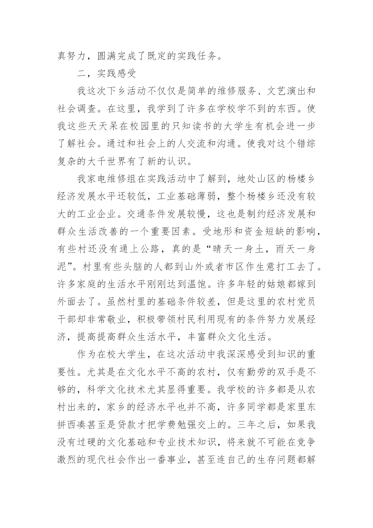 机电专业寒假社会实践报告机电专业寒假社会实践报告在日常生活和工作中,报告对我们来说并不陌生,通常情况下,报告的内容含量大、篇幅较长。你还在对写报告感到一筹莫展吗?下面是小编精心整理的机电专业寒假社会实践报告,欢迎大家分享。按照院xx系的统一部署和要求,我的xx学院寒假社会实践活动于20xx年xx月xx日开始,主要开展家电维修等活动。现将这次社会实践的相关情况报告如下:一,实践内容和过程。xx月xx号上午,我来到了杨楼乡,我的第一站是杨楼乡的中心——杨楼村。在这里,我受到了村委会干部和乡亲们的热情欢迎。熟悉了环境以后,我很快以村委会为根据地展开了我的维修活动。因为我是义务为乡亲们服务,所以受到大家的热烈欢迎。没多久,乡亲们就纷纷拿来了电视机、电扇、电饭锅、洗衣机、影碟机等家用电器。对于送来的每个电器,同学们都全力以赴,使出自己的浑身解数,真正做到了令群众满意。在杨楼村的维修活动总共持续了三天,基本上满足了乡亲们的需求。我的实践活动的第二站是石台村,她是有着20xx年历史的村庄,因此能够在这里为乡亲们服务,我内心充满了喜悦和激动,感到无尚的光荣。在石台村服务期间,我更加认真努力,圆满完成了既定的实践任务。二,实践感受我这次下乡活动不仅仅是简单的维修服务、文艺演出和社会调查。在这里,我学到了许多在学校学不到的东西。使我这些天天呆在校园里的只知读书的大学生有机会进一步了解社会。通过和社会上的人交流和沟通。使我对这个错综复杂的大千世界有了新的认识。我家电维修组在实践活动中了解到,地处山区的杨楼乡经济发展水平还较低,工业基础薄弱,整个杨楼乡还没有较大的工业企业。交通条件发展较慢,这也是制约经济发展和群众生活改善的一个重要因素。受地形和资金短缺的影响,有些村还没有通上公路,真的是“晴天一身土,雨天一身泥”。村里有些头脑的人都到山外或者市区作生意打工去了。许多家庭的生活水平刚刚达到温饱。许多年轻的姑娘都嫁到外面去了。虽然村里的基础条件较差,但是这里的农村党员干部却非常敬业,积极带领村民利用现有的条件努力发展经济,提高提高群众生活水平,丰富群众文化生活。作为在校大学生,在这次活动中我深深感受到知识的重要性。尤其是在文化水平不高的农村,仅有勤劳的双手是不够的,科学文化技术尤其显得重要。我学校的许多都是从农村出来的,家乡的经济水平也并不高,许多同学都是家里东拼西凑甚至是贷款才把学费勉强交上的。三年之后,如果我没有过硬的文化基础和专业技术知识,将来就不可能在竞争激烈的现代社会作出一番事业,甚至连自己的生存问题都解决不了。但是许多同学却整日在校园里无所视事,稀里糊涂,浑浑噩噩的浪费青春。想到这里,我不禁为这些同学担心,将来走向社会时,他们该怎么办?难道还要靠父母养活一辈子不成?在今后的大学生活中,我不仅自己要加倍努力,好好学习,不断的丰富和完善自己,而且要提醒身边的同学,珍惜在学校的宝贵学习机会,人生苦短,时光易逝,少年不努力,老大徒伤悲,别等到毕业时两手空空却无以回报父母时才知道后悔,因为人生不能重来。虽然我的基础差,但是只要下定决心,刻苦拼搏,终会取得令人满意的成绩。社会实践是一种动力。看到在土地上耕种的农民,在工地上挥汗的工人,在边防上守卫的战士,我明白了书桌的分量,一种强烈的责任感油然而生,是人民哺育了我,培养了我,给了我知识和一切。作为一名大学生,在祖国需要的时候,我会无条件地把所学的知识和一切奉献给祖国和人民。社会实践是体味人生的“百味筒。”要想体味一下生活的酸甜苦辣咸,那就请你自己参加一次实践服务吧,我保证你一定会不枉此行,个中滋味只有亲身参与才能体会的到。社会实践是验证实力的“试金石”。走出校门融入社会的大舞台,我才真正体验到自身知识的欠缺,能力的有限。任何理论知识只有与实践密切结合,才能真正发挥它的价值。行不行,实践中看!“纸上得来终觉浅,投身实践觅真知”。我欣喜地看到,经过社会实践的磨练,同学们变得更加成熟、更加自信,校园里到处洋溢着蓬勃向上的良好氛围。我有理由相信,当代青年大学生有实力承担的起未来建设国家的重任,追求进步,刻苦求知,勤于实践,全面成才必将成为广大青年学生的共同心声和行动!