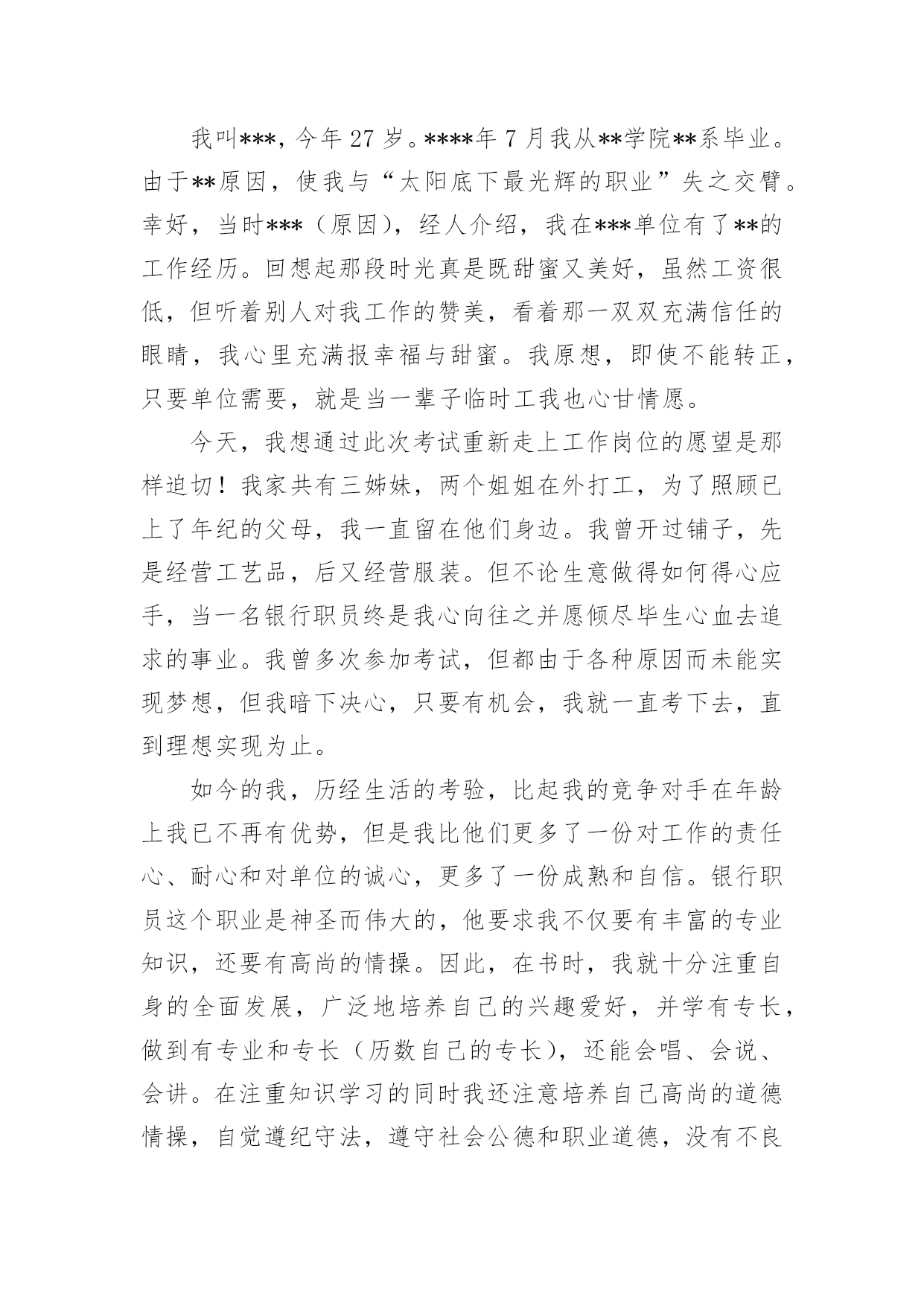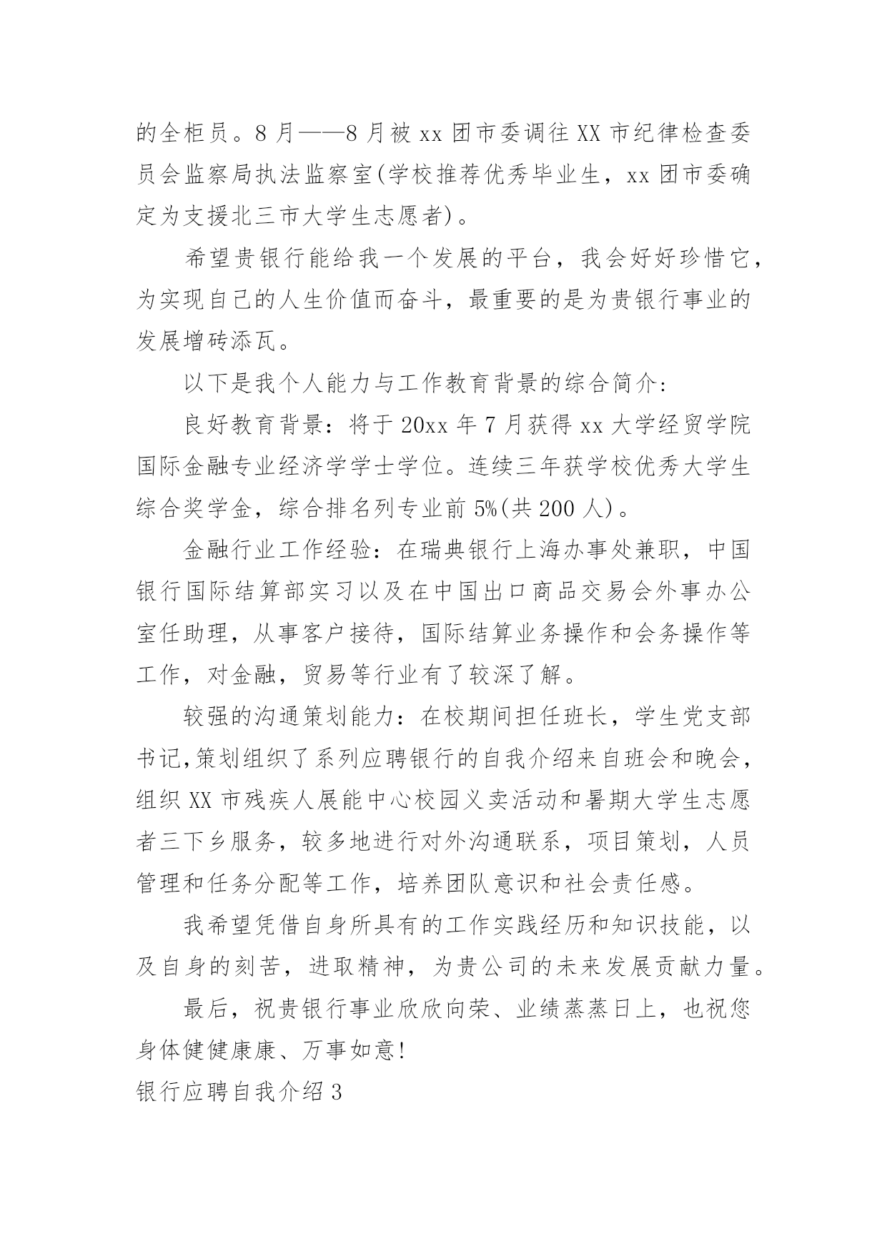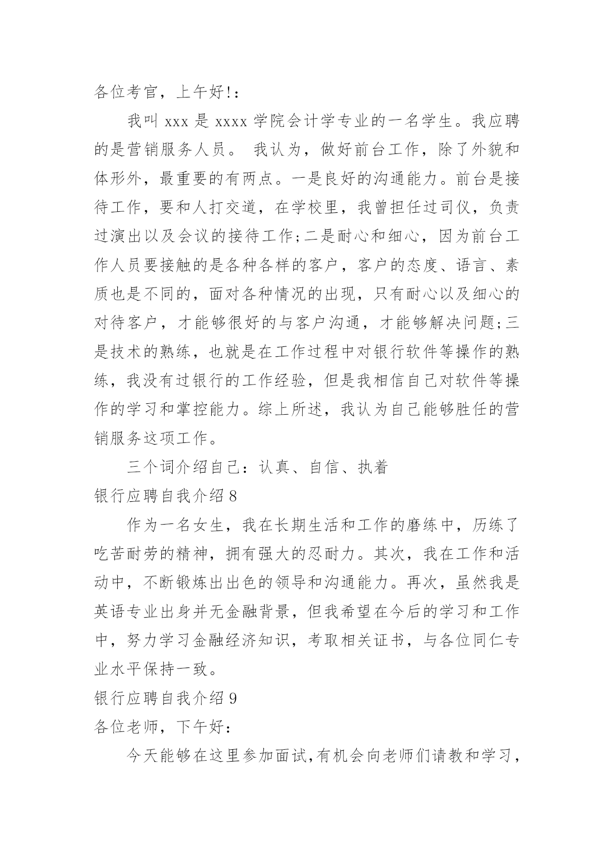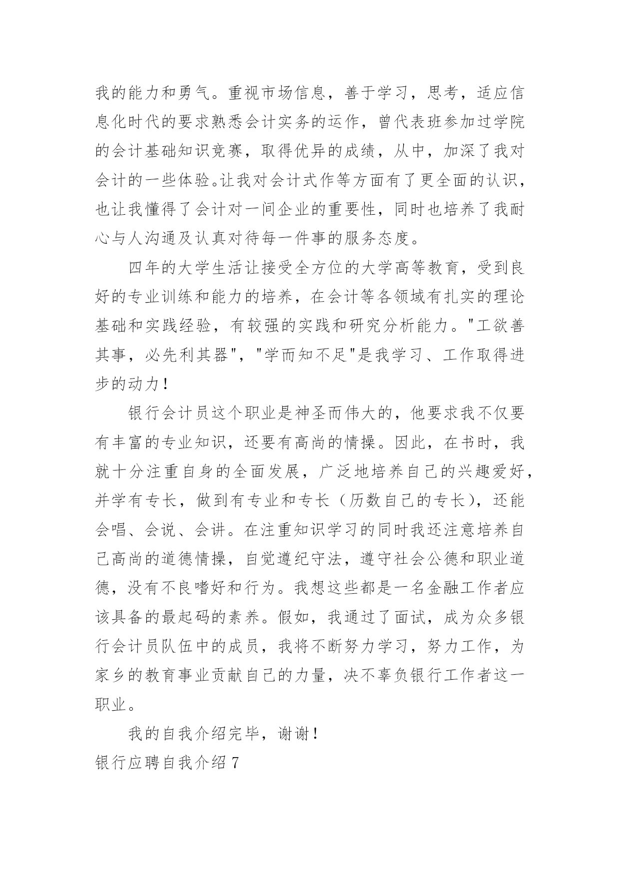 银行应聘自我介绍银行应聘自我介绍当我们在一个陌生场合中,常常需要我们进行自我介绍,用自我介绍往往可以向他人介绍自己。相信许多人会觉得自我介绍很难写吧,下面是小编为大家整理的银行应聘自我介绍,仅供参考,希望能够帮助到大家。银行应聘自我介绍1通过考试,今天,我以本岗位笔试第x的成绩进入了面试。对我来说,这次工作机会显得尤为珍贵。我叫xxx,今年27岁。xxxx年7月我从xx学院xx系毕业。由于xx原因,使我与“太阳底下最光辉的职业”失之交臂。幸好,当时xxx(原因),经人介绍,我在xxx单位有了xx的工作经历。回想起那段时光真是既甜蜜又美好,虽然工资很低,但听着别人对我工作的赞美,看着那一双双充满信任的眼睛,我心里充满报幸福与甜蜜。我原想,即使不能转正,只要单位需要,就是当一辈子临时工我也心甘情愿。今天,我想通过此次考试重新走上工作岗位的愿望是那样迫切!我家共有三姊妹,两个姐姐在外打工,为了照顾已上了年纪的父母,我一直留在他们身边。我曾开过铺子,先是经营工艺品,后又经营服装。但不论生意做得如何得心应手,当一名银行职员终是我心向往之并愿倾尽毕生心血去追求的事业。我曾多次参加考试,但都由于各种原因而未能实现梦想,但我暗下决心,只要有机会,我就一直考下去,直到理想实现为止。银行应聘自我介绍2尊敬的领导:您好!首先感谢您在百忙之中抽出宝贵的时间来阅读这封自荐信。我叫,怀着对贵银行的尊重与向往,我真挚地写了这封自荐信,向您展示一个完全真实的我。大学以来,我一直刻苦学习,勤奋钻研。经过老师的精心培养和个人努力,我系统地掌握了法律学科的专业知识,获得了全国大学生英语知识竞赛一等奖、国家助学金以(大一新生自我介绍)及学院励志奖学金。在专科毕业的同时也顺利地拿到了辽宁大学自考本科文凭。应聘银行的自我介绍应聘银行的自我介绍。理论联系实践是很重要的。在校期间我积极参加社团活动,寒暑假参加了xx团市委组织的扶贫家教活动并获得了家长们的好评,接受了xx日报社的采访与报道。大二时,凭借着自身对金融方面知识的爱好与学习,经过学校老师的推荐,我从上海浦东发展银行xx分行的兼职招聘中脱颖而出,进行了为期整整一年的兼职工作。兼职结束后我又顺利地通过了广东发展银行xx分行的招聘考试(点钞5分钟18把,计算器5分钟6道题),顺利地成为了渤海支行营业部的全柜员。8月——8月被xx团市委调往XX市纪律检查委员会监察局执法监察室(学校推荐优秀毕业生,xx团市委确定为支援北三市大学生志愿者)。希望贵银行能给我一个发展的平台,我会好好珍惜它,为实现自己的人生价值而奋斗,最重要的是为贵银行事业的发展增砖添瓦。以下是我个人能力与工作教育背景的综合简介:良好教育背景:将于20xx年7月获得xx大学经贸学院国际金融专业经济学学士学位。连续三年获学校优秀大学生综合奖学金,综合排名列专业前5%(共200人)。金融行业工作经验:在瑞典银行上海办事处兼职,中国银行国际结算部实习以及在中国出口商品交易会外事办公室任助理,从事客户接待,国际结算业务操作和会务操作等工作,对金融,贸易等行业有了较深了解。较强的沟通策划能力:在校期间担任班长,学生党支部书记,策划组织了系列应聘银行的自我介绍来自班会和晚会,组织XX市残疾人展能中心校园义卖活动和暑期大学生志愿者三下乡服务,较多地进行对外沟通联系,项目策划,人员管理和任务分配等工作,培养团队意识和社会责任感。我希望凭借自身所具有的工作实践经历和知识技能,以及自身的刻苦,进取精神,为贵公司的未来发展贡献力量。最后,祝贵银行事业欣欣向荣、业绩蒸蒸日上,也祝您身体健健康康、万事如意!银行应聘自我介绍3我叫***,今年27岁。****年7月我从**学院**系毕业。由于**原因,使我与“太阳底下最光辉的职业”失之交臂。幸好,当时***(原因),经人介绍,我在***单位有了**的工作经历。回想起那段时光真是既甜蜜又美好,虽然工资很低,但听着别人对我工作的赞美,看着那一双双充满信任的眼睛,我心里充满报幸福与甜蜜。我原想,即使不能转正,只要单位需要,就是当一辈子临时工我也心甘情愿。今天,我想通过此次考试重新走上工作岗位的愿望是那样迫切!我家共有三姊妹,两个姐姐在外打工,为了照顾已上了年纪的父母,我一直留在他们身边。我曾开过铺子,先是经营工艺品,后又经营服装。但不论生意做得如何得心应手,当一名银行职员终是我心向往之并愿倾尽毕生心血去追求的事业。我曾多次参加考试,但都由于各种原因而未能实现梦想,但我暗下决心,只要有机会,我就一直考下去,直到理想实现为止。如今的我,历经生活的考验,比起我的竞争对手在年龄上我已不再有优势,但是我比他们更多了一份对工作的责任心、耐心和对单位的诚心,更多了一份成熟和自信。银行职员这个职业是神圣而伟大的,他要求我不仅要有丰富的专业知识,还要有高尚的情